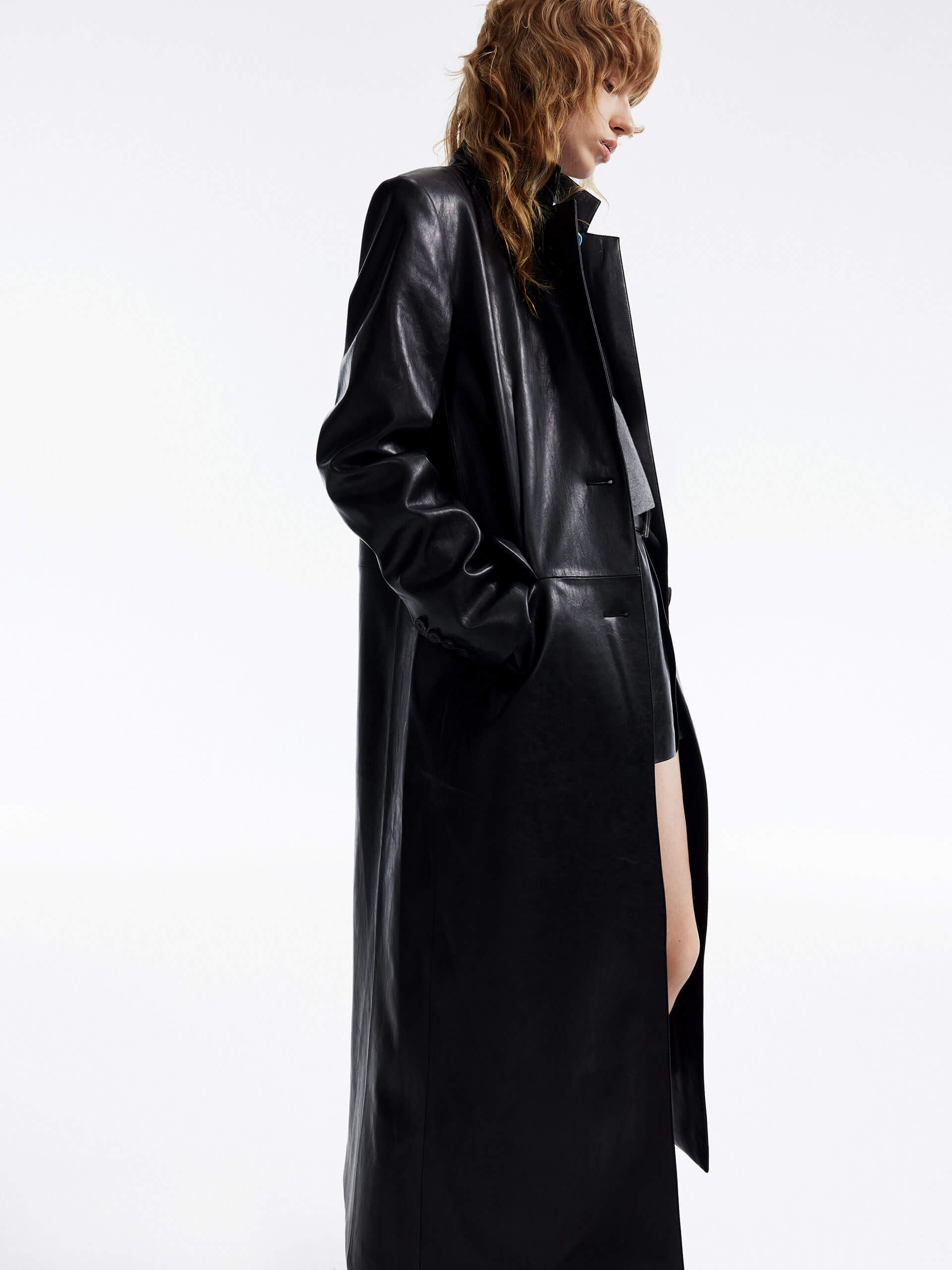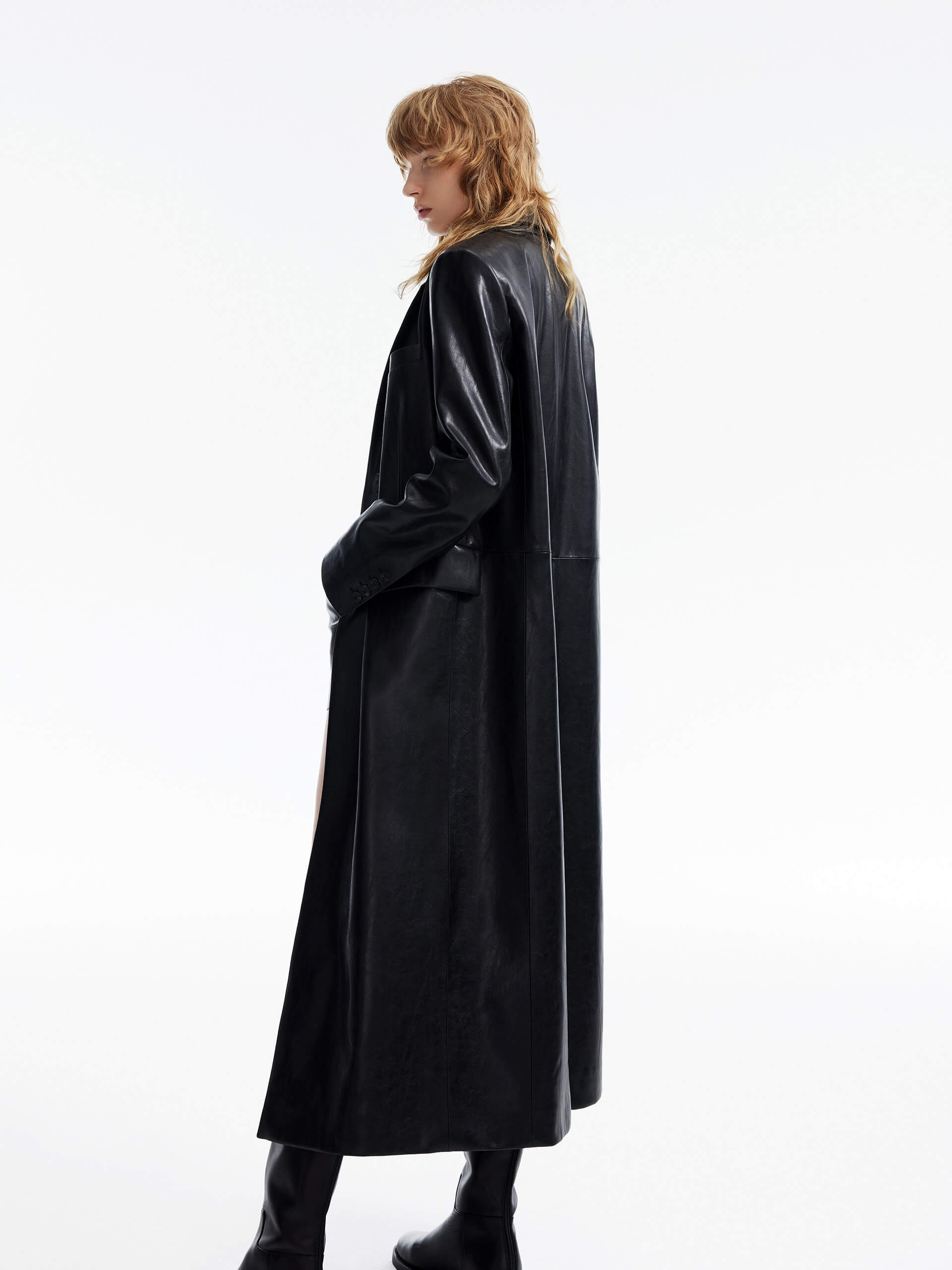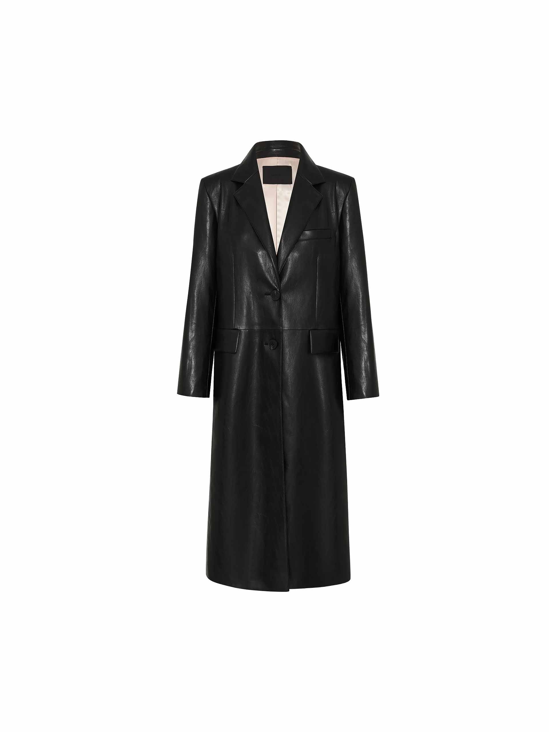 Indulge in luxury with our overcoat. Crafted from comfortable and glossy faux leather, this coat features a straight and structured silhouette with padded shoulders and a single-button closure. With its chic and sophisticated design, it's the epitome of style and elegance.