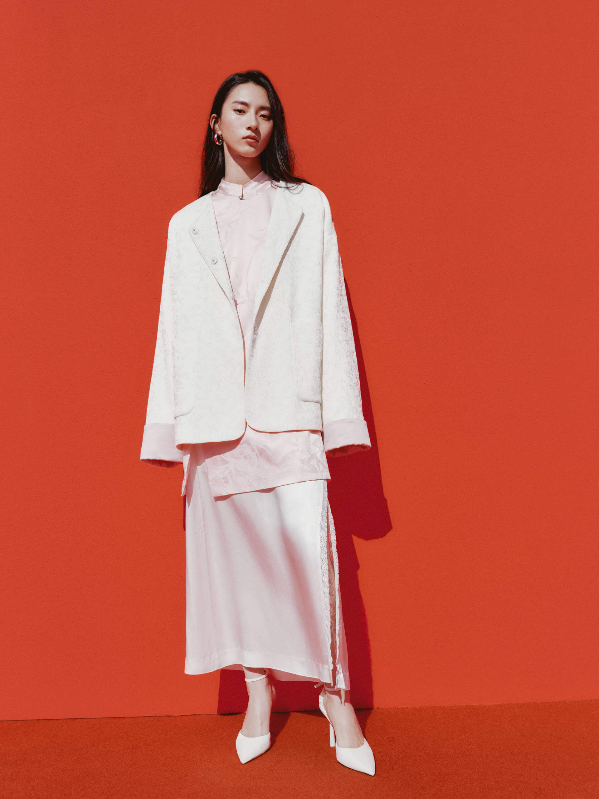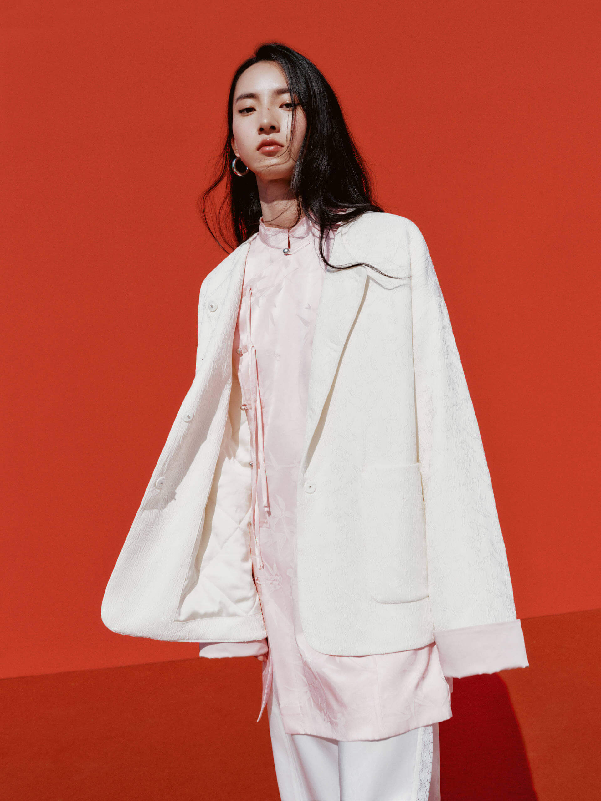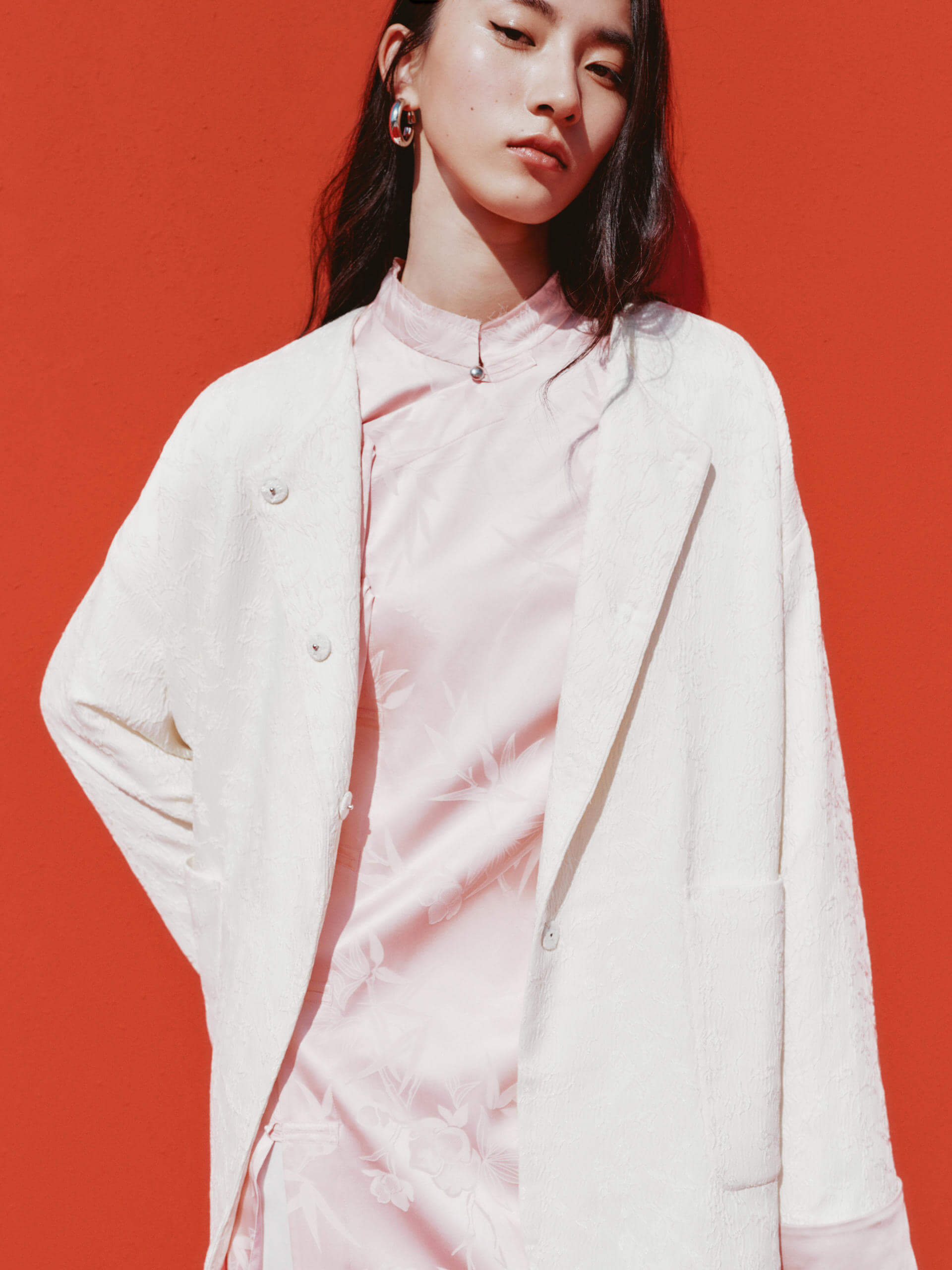 Get ready to elevate your style game with our coat. Its loose fit and jacquard textured design provides comfort and flair. The front pockets and pink folded cuffs complement our Chinese-inspired dress for a fashionable and unique look.