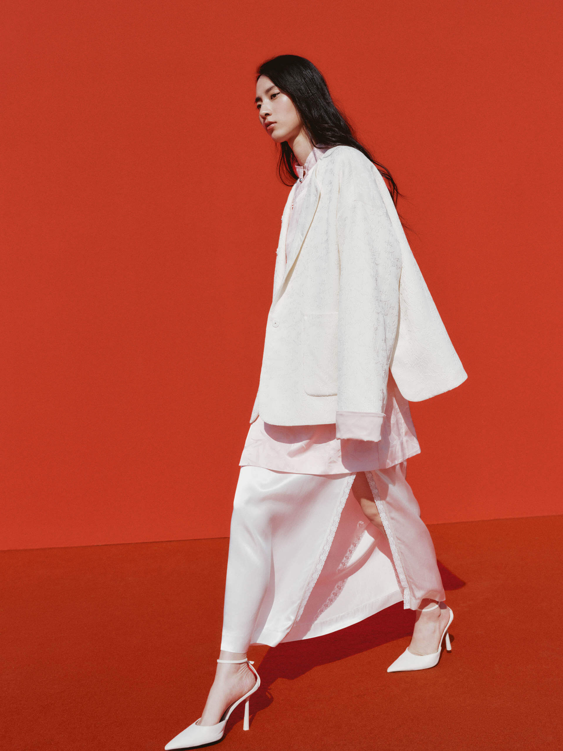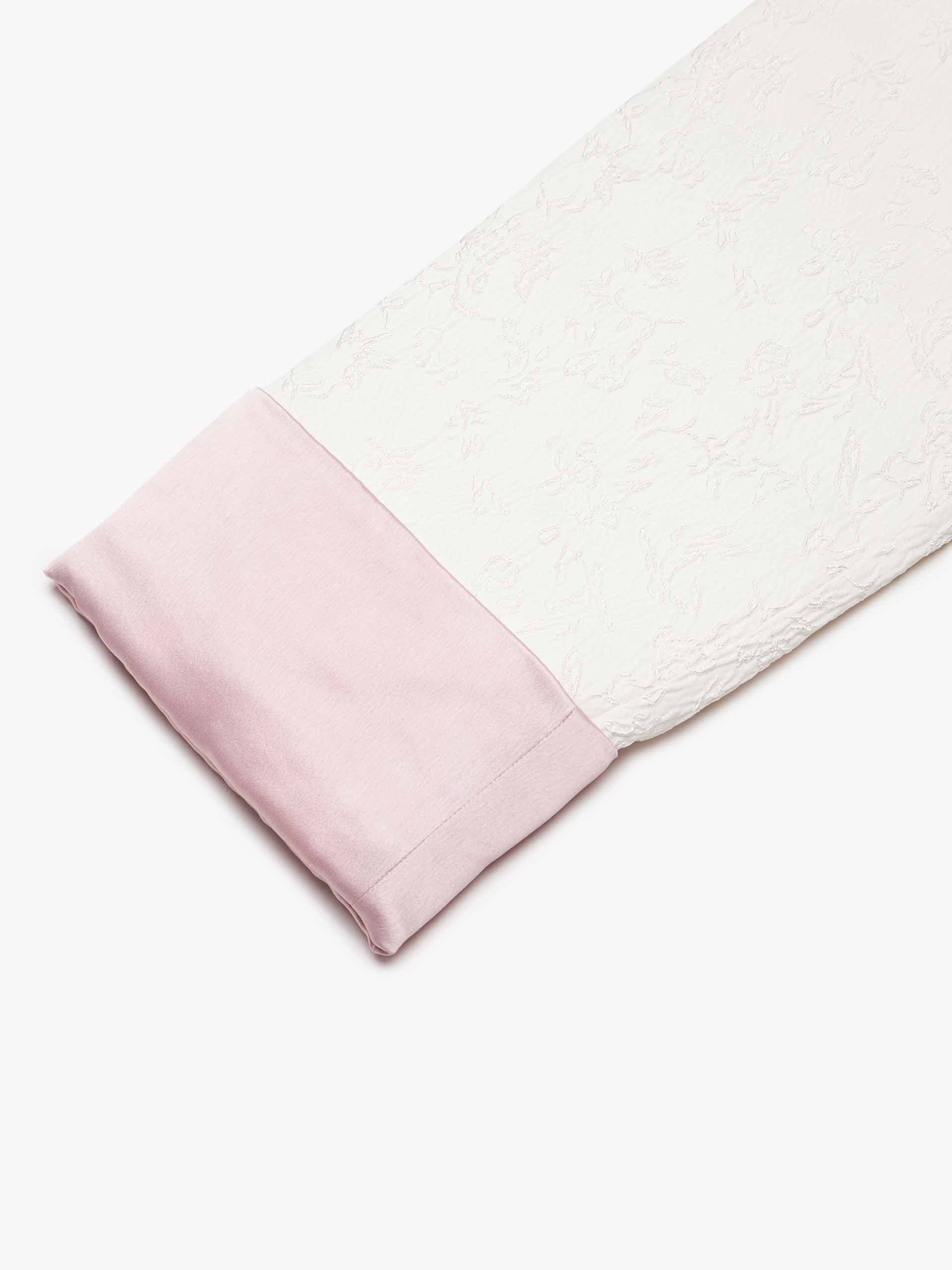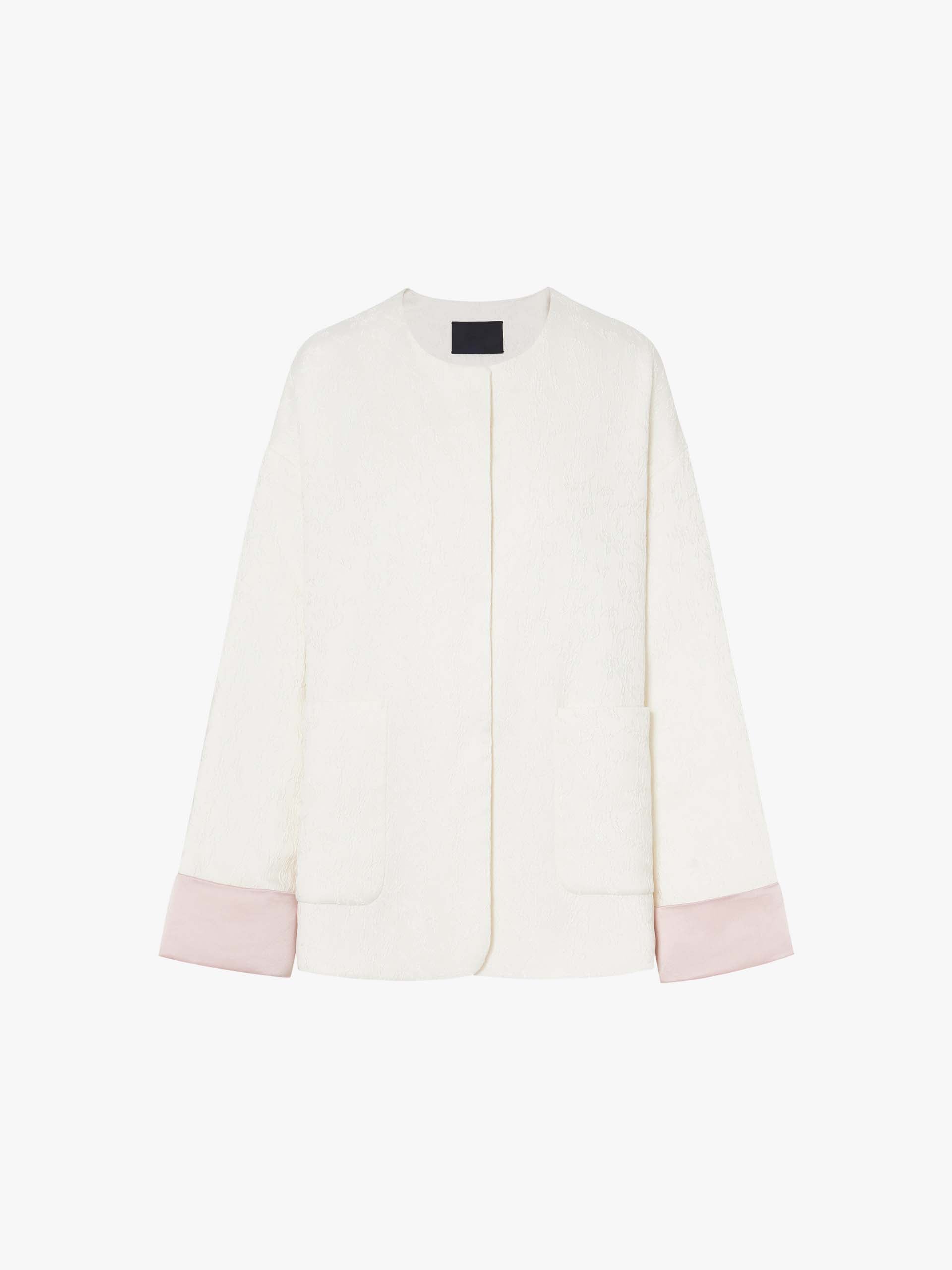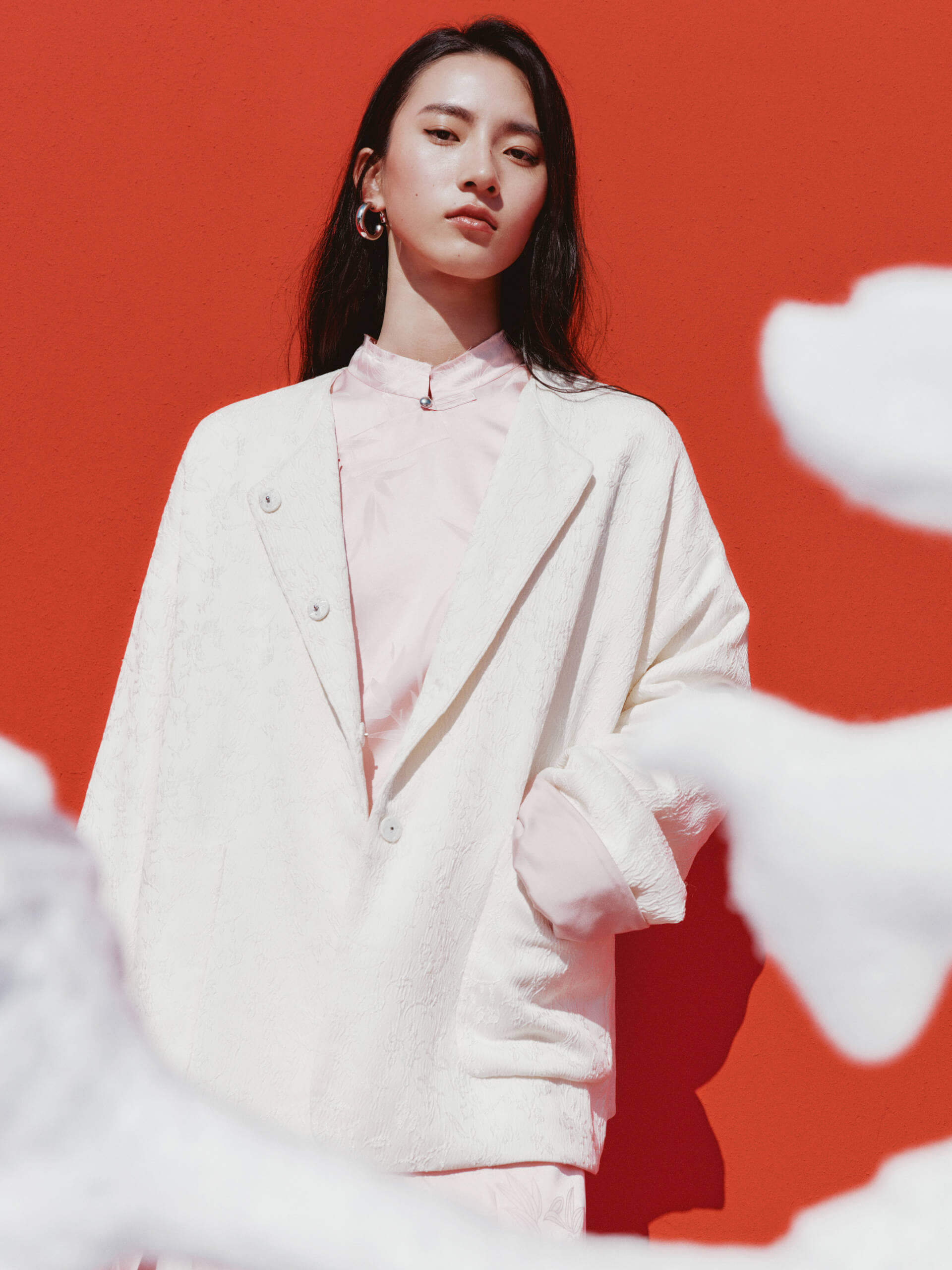 Get ready to elevate your style game with our coat. Its loose fit and jacquard textured design provides comfort and flair. The front pockets and pink folded cuffs complement our Chinese-inspired dress for a fashionable and unique look.