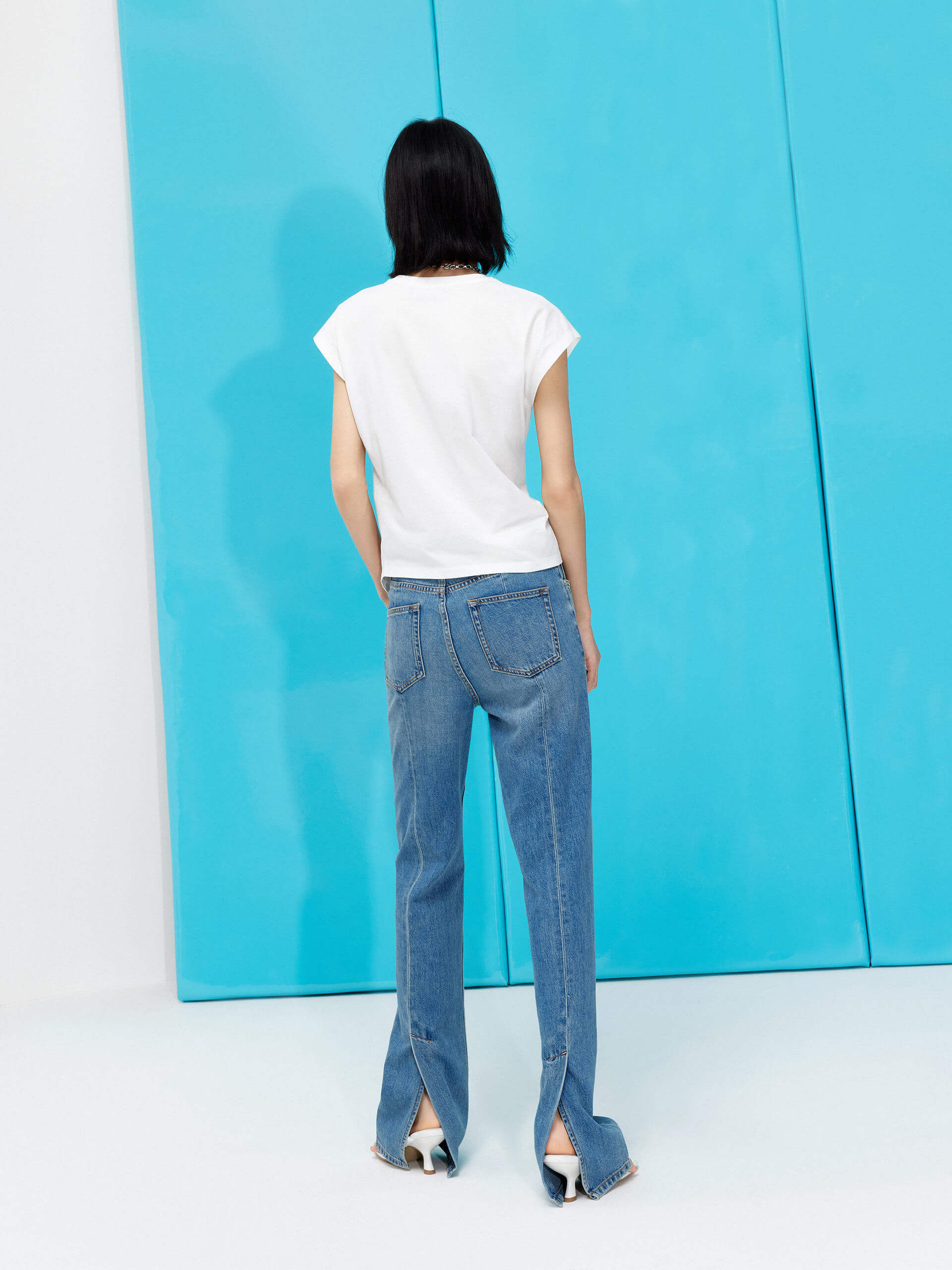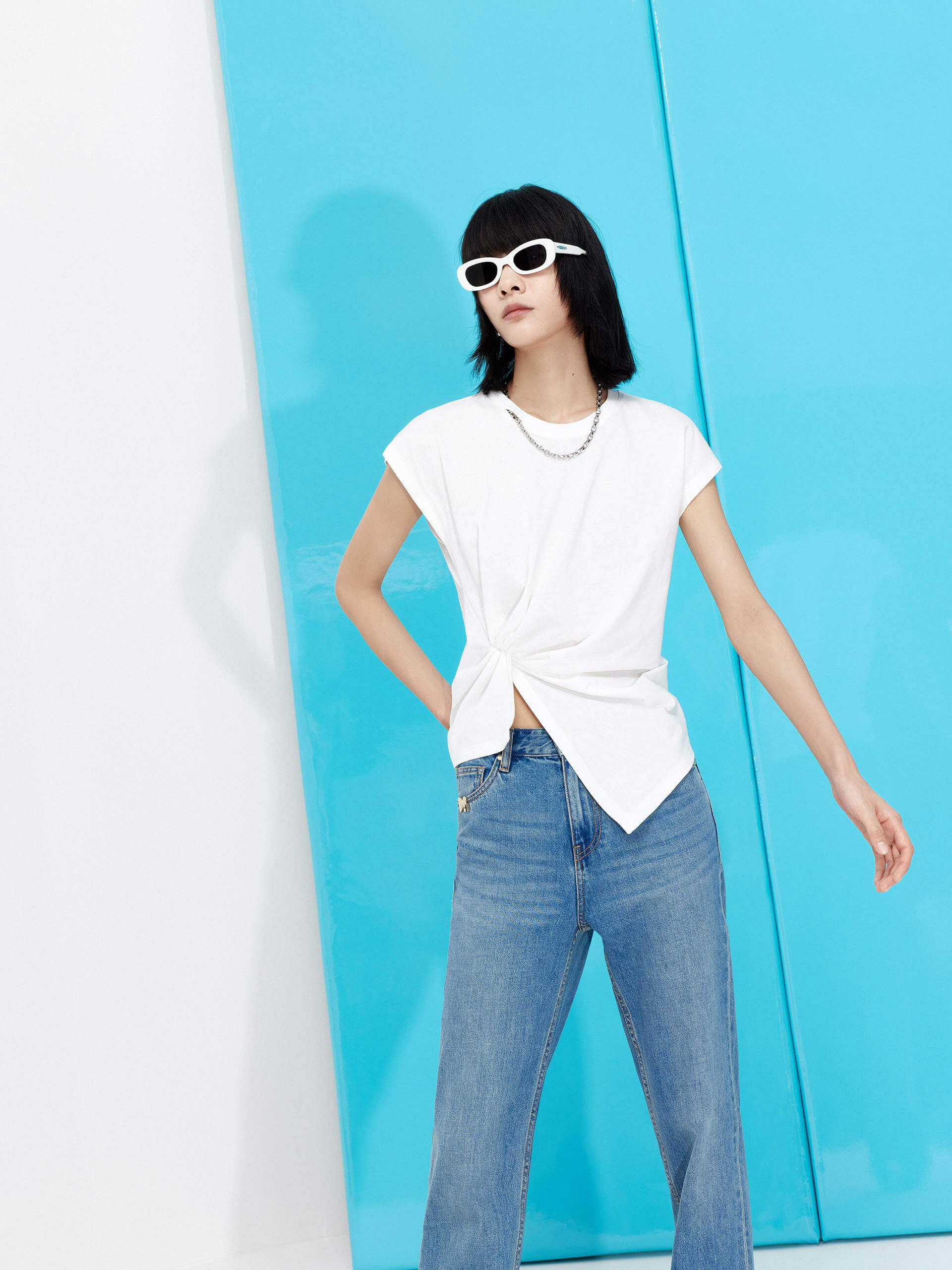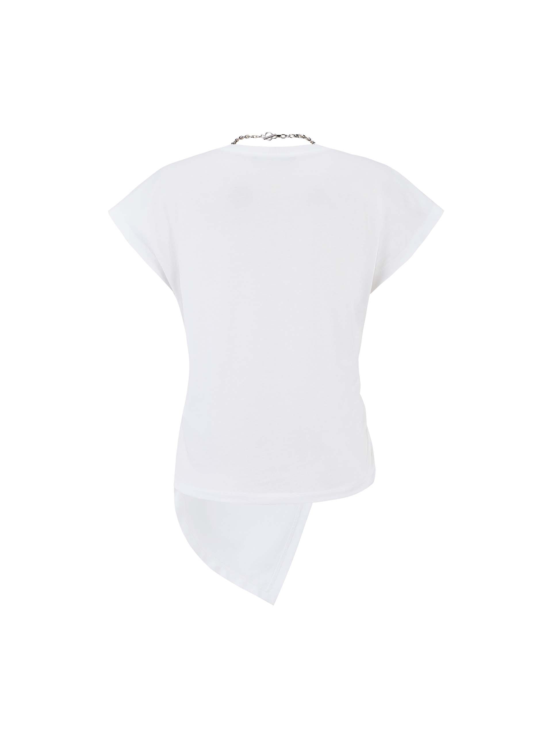Stay cool and comfortable in this stylish T-shirt. Made from lightweight cotton, it features an edgy round collar with metal chain details and asymmetrical hemlines on the front. Show off your unique style with this chic and versatile t-shirt.