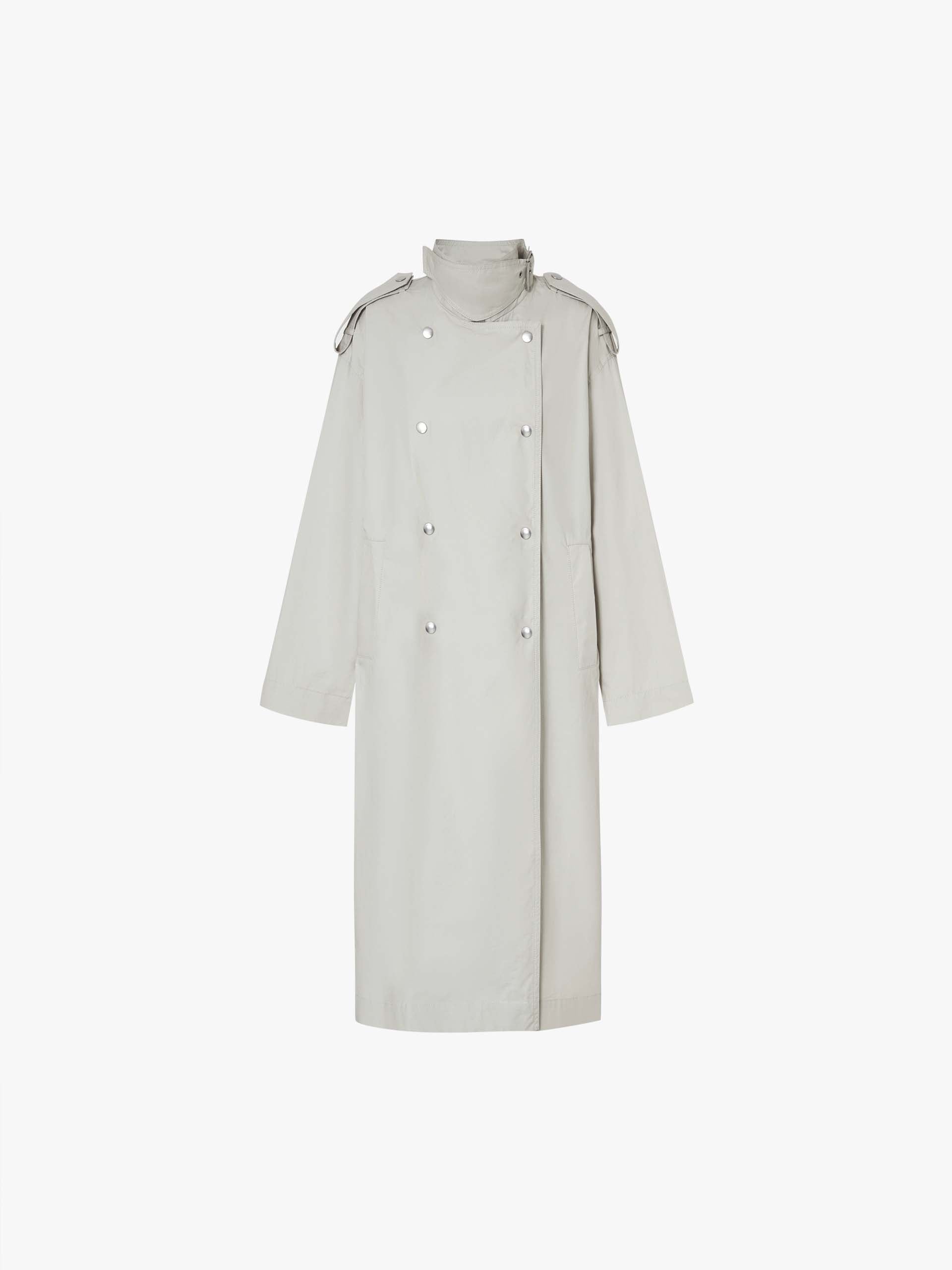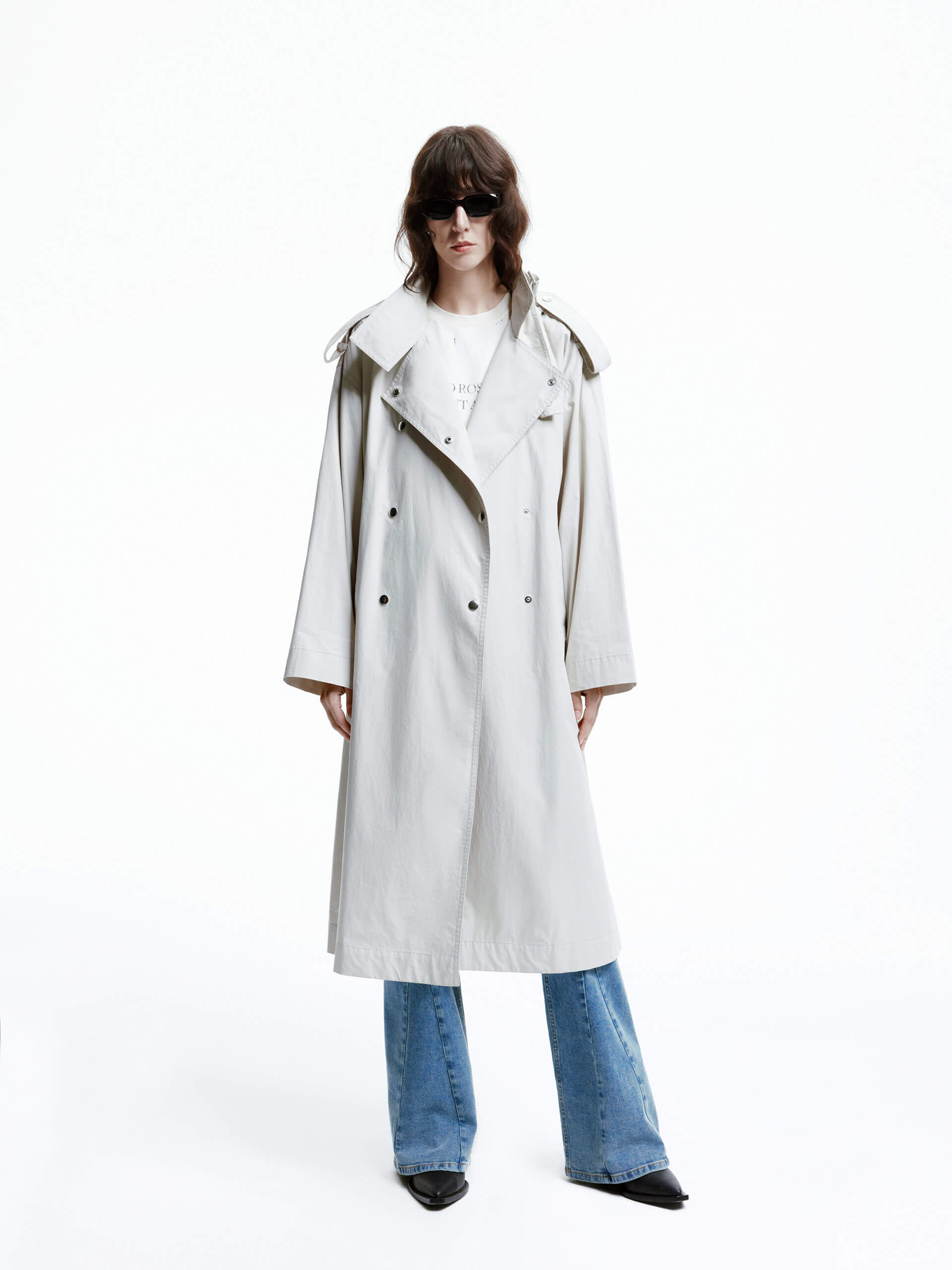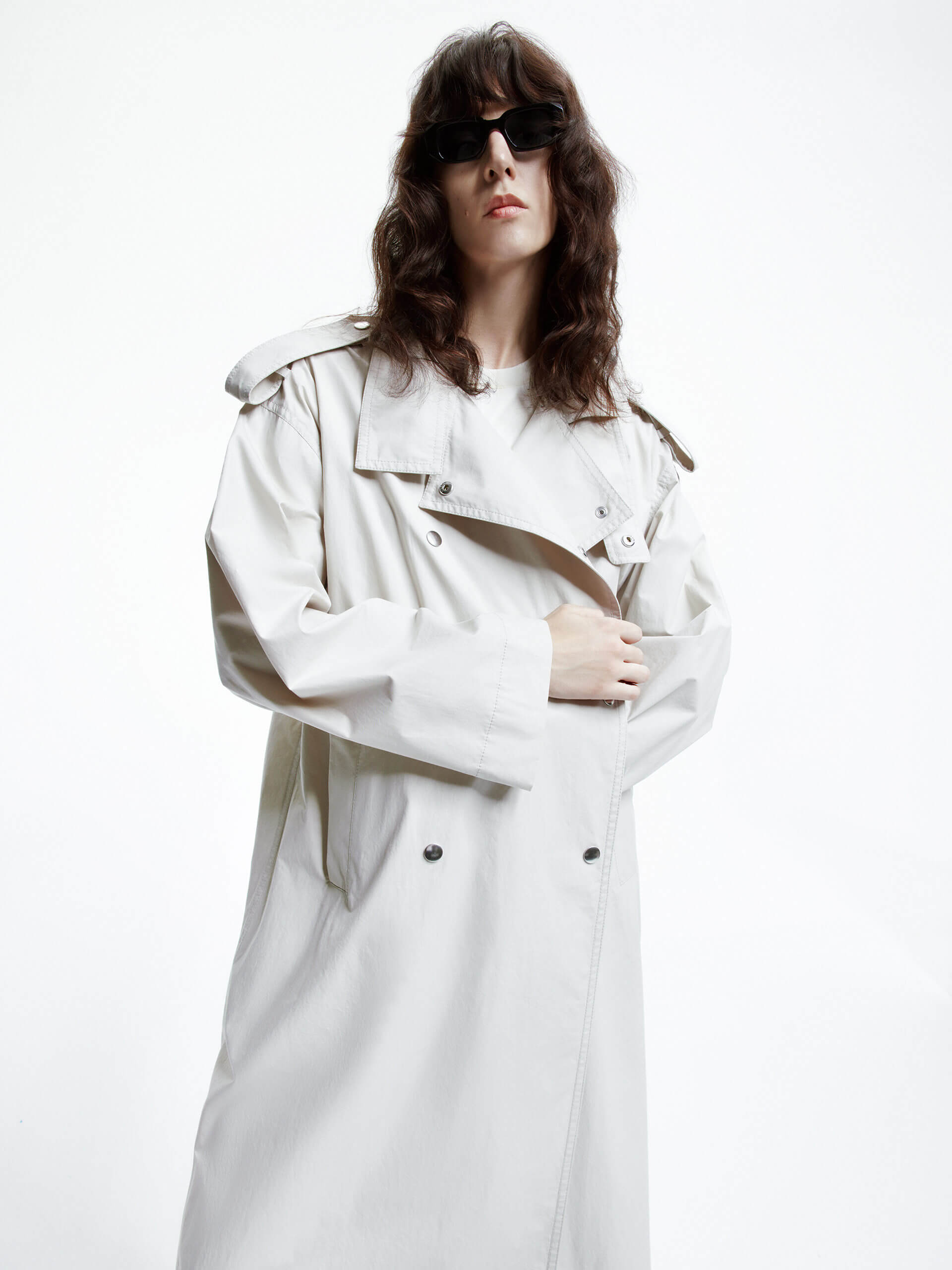 A must-have piece trench coat for your spring wardrobe. Crafted from lightweight and soft cotton material. Boasting an oversized and long-line silhouette, it's designed with a double-breasted snap button closure and long epaulets that accentuate the elegant line of the shoulders.