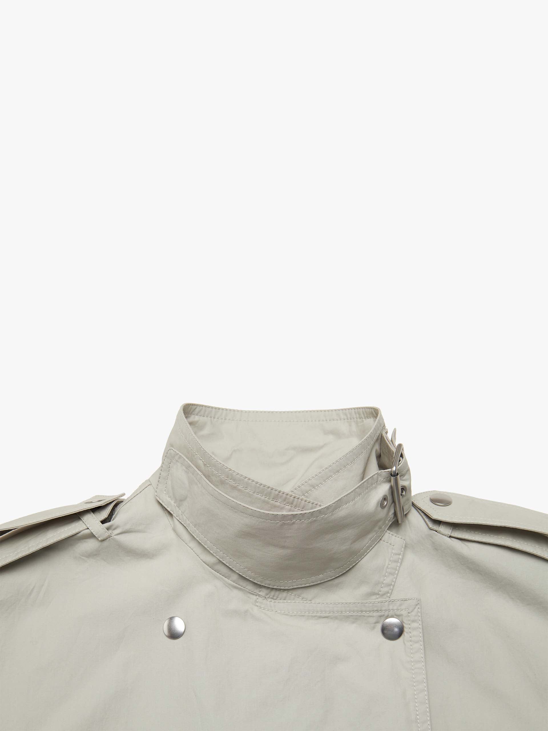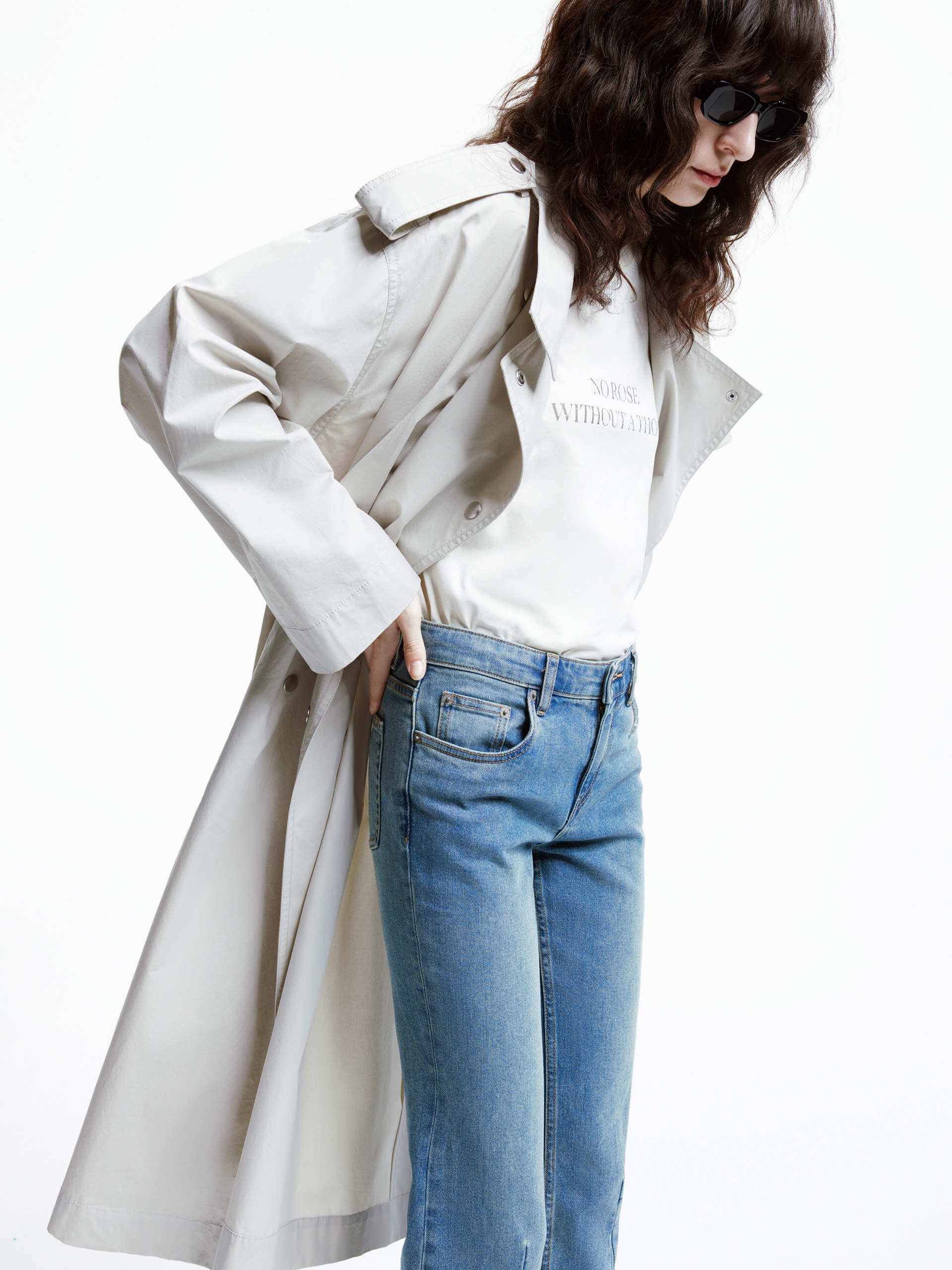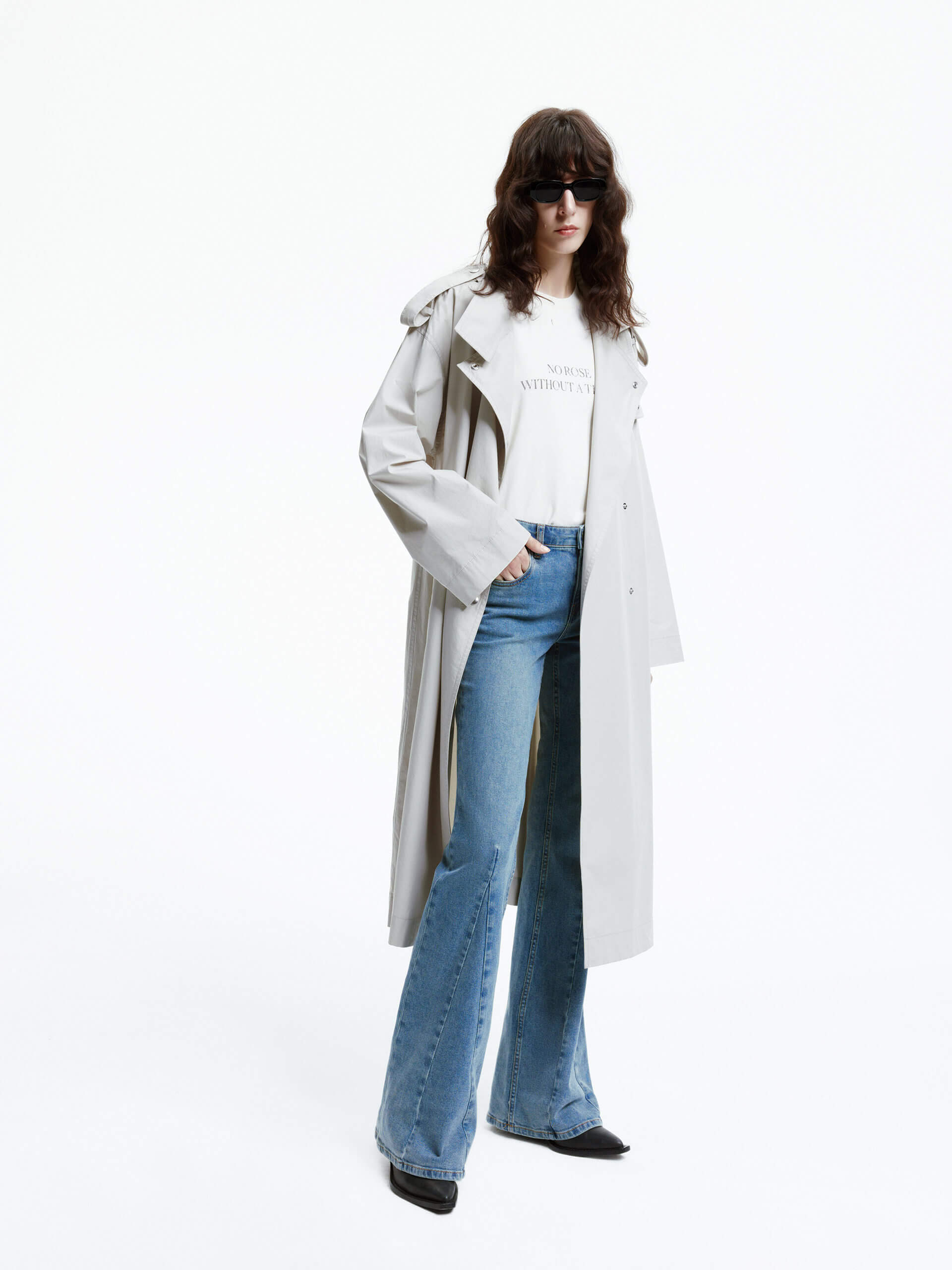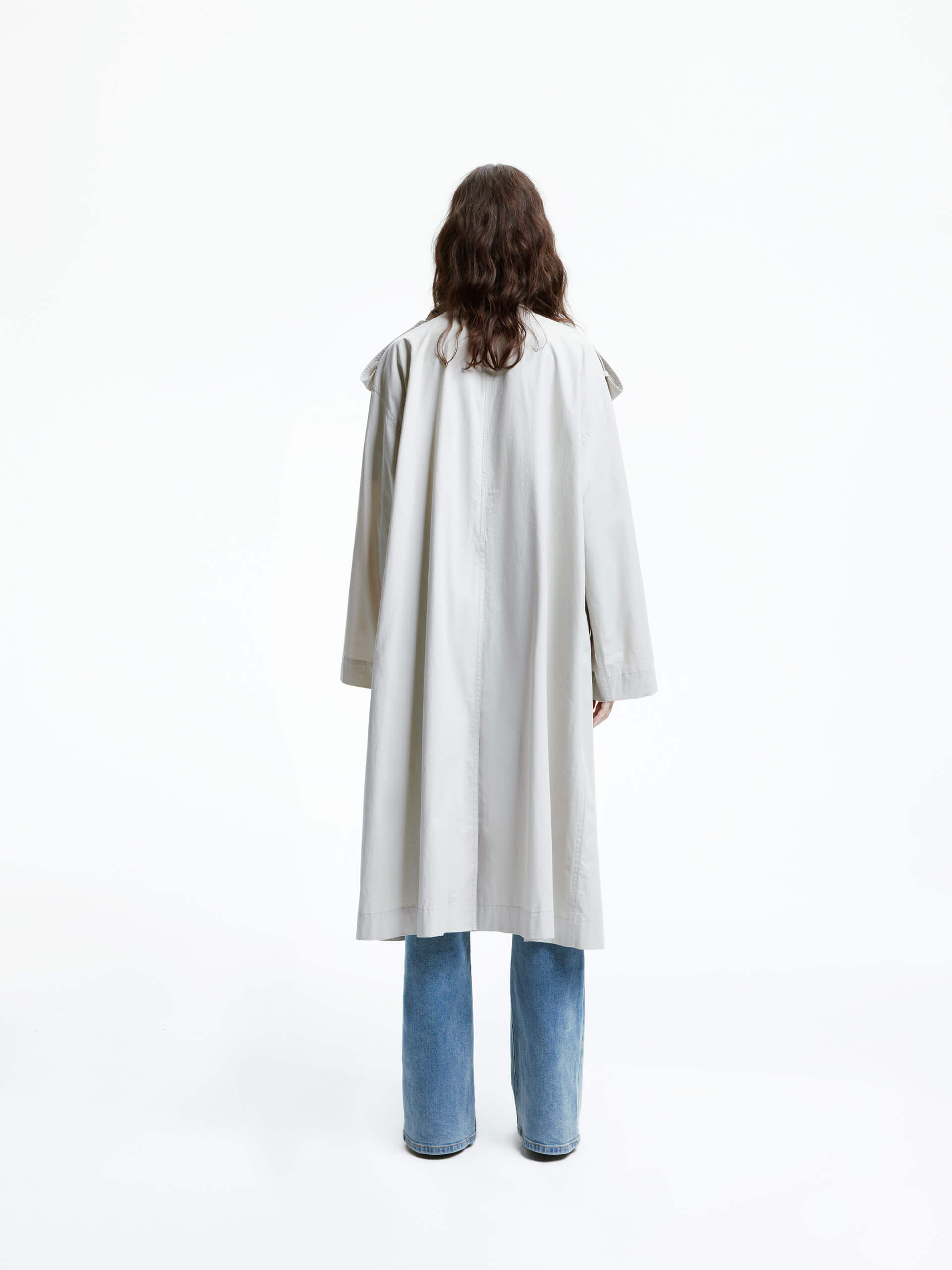 A must-have piece trench coat for your spring wardrobe. Crafted from lightweight and soft cotton material. Boasting an oversized and long-line silhouette, it's designed with a double-breasted snap button closure and long epaulets that accentuate the elegant line of the shoulders.