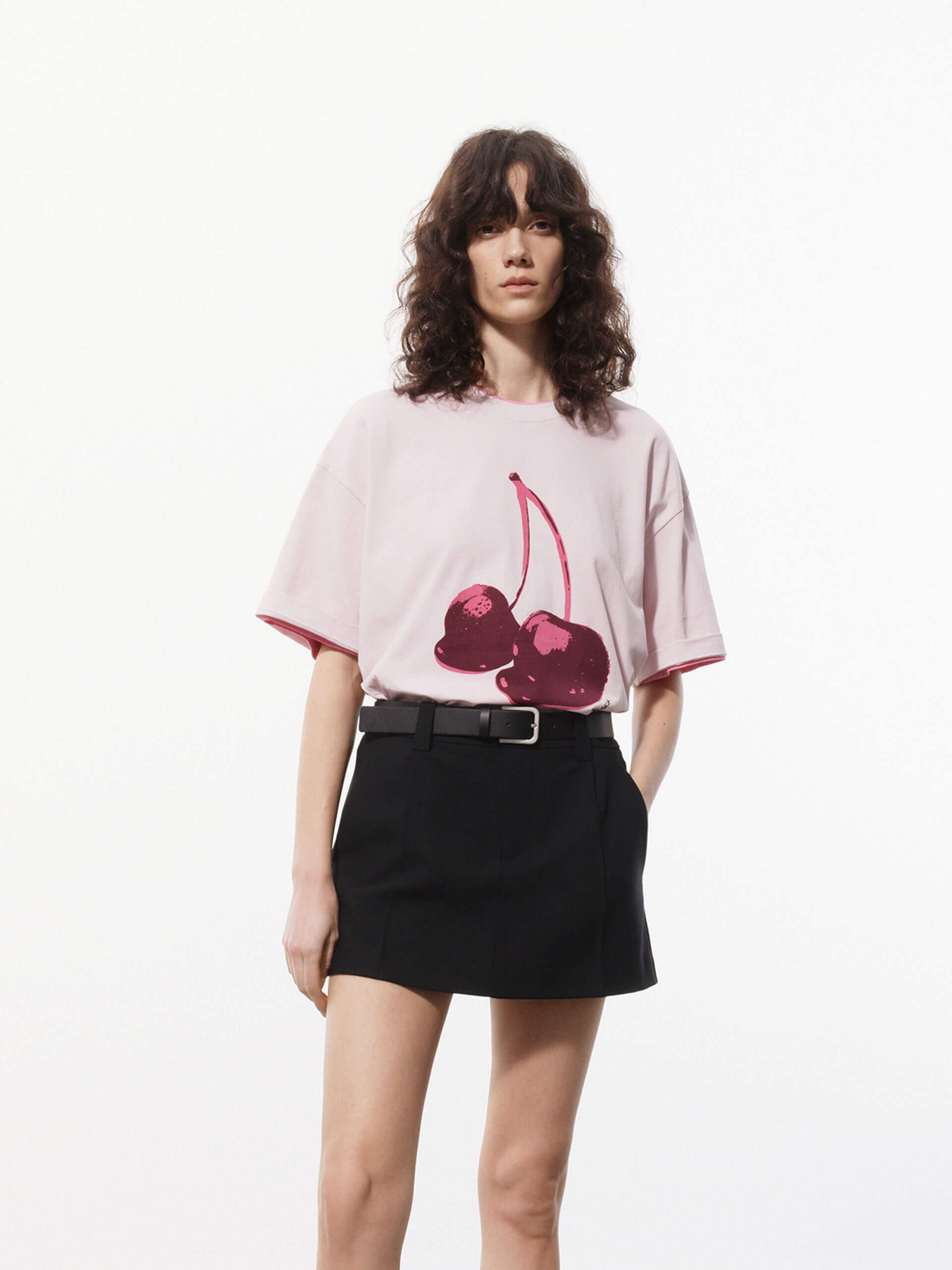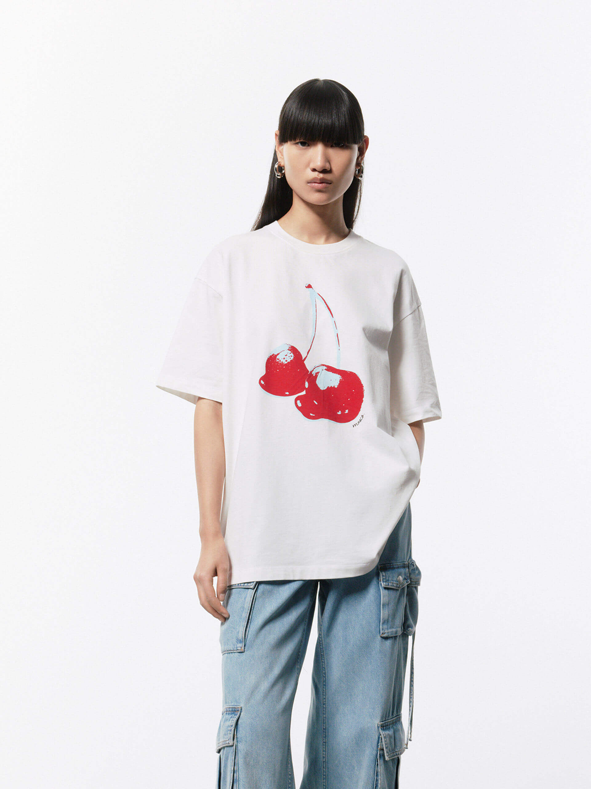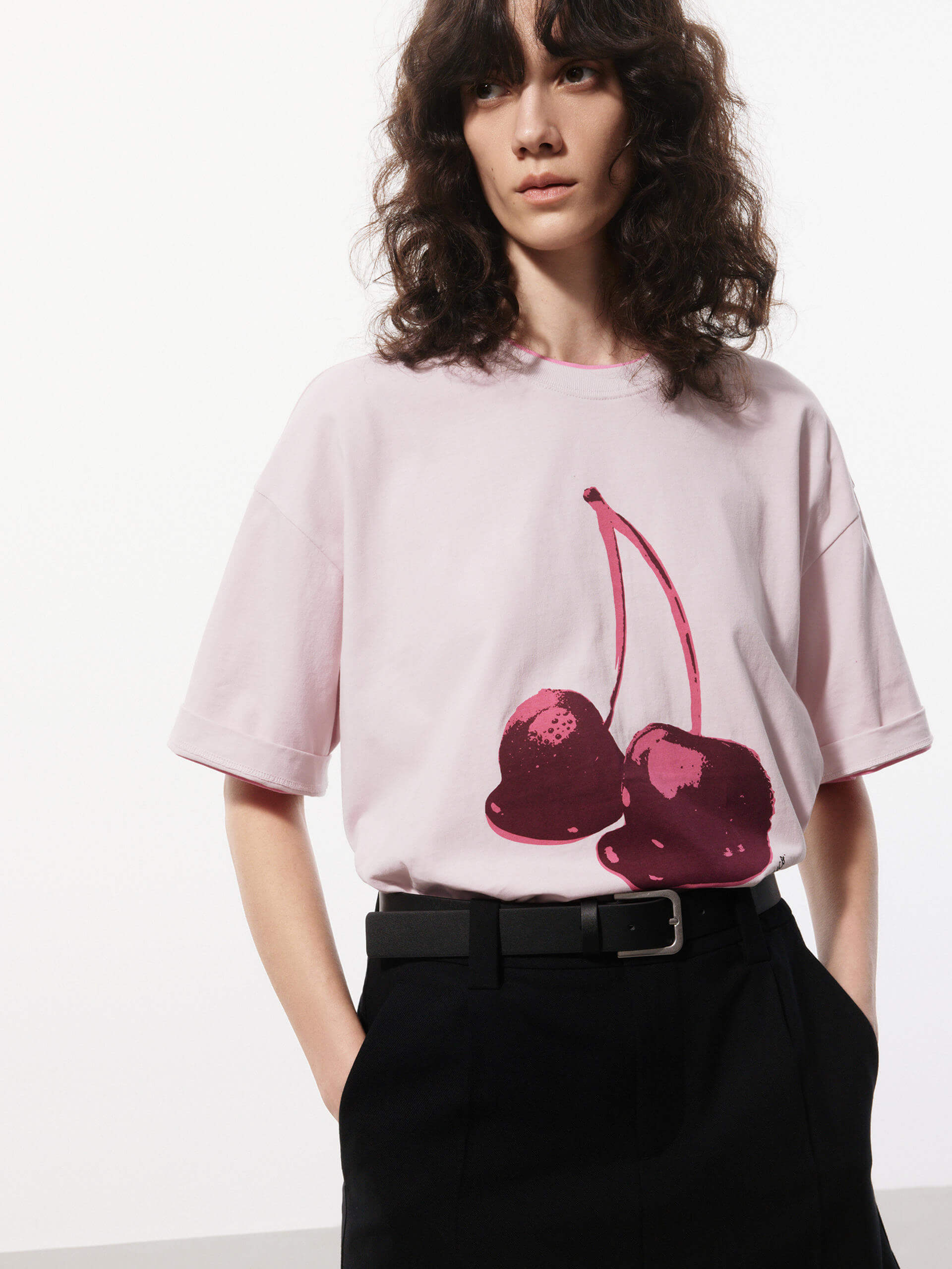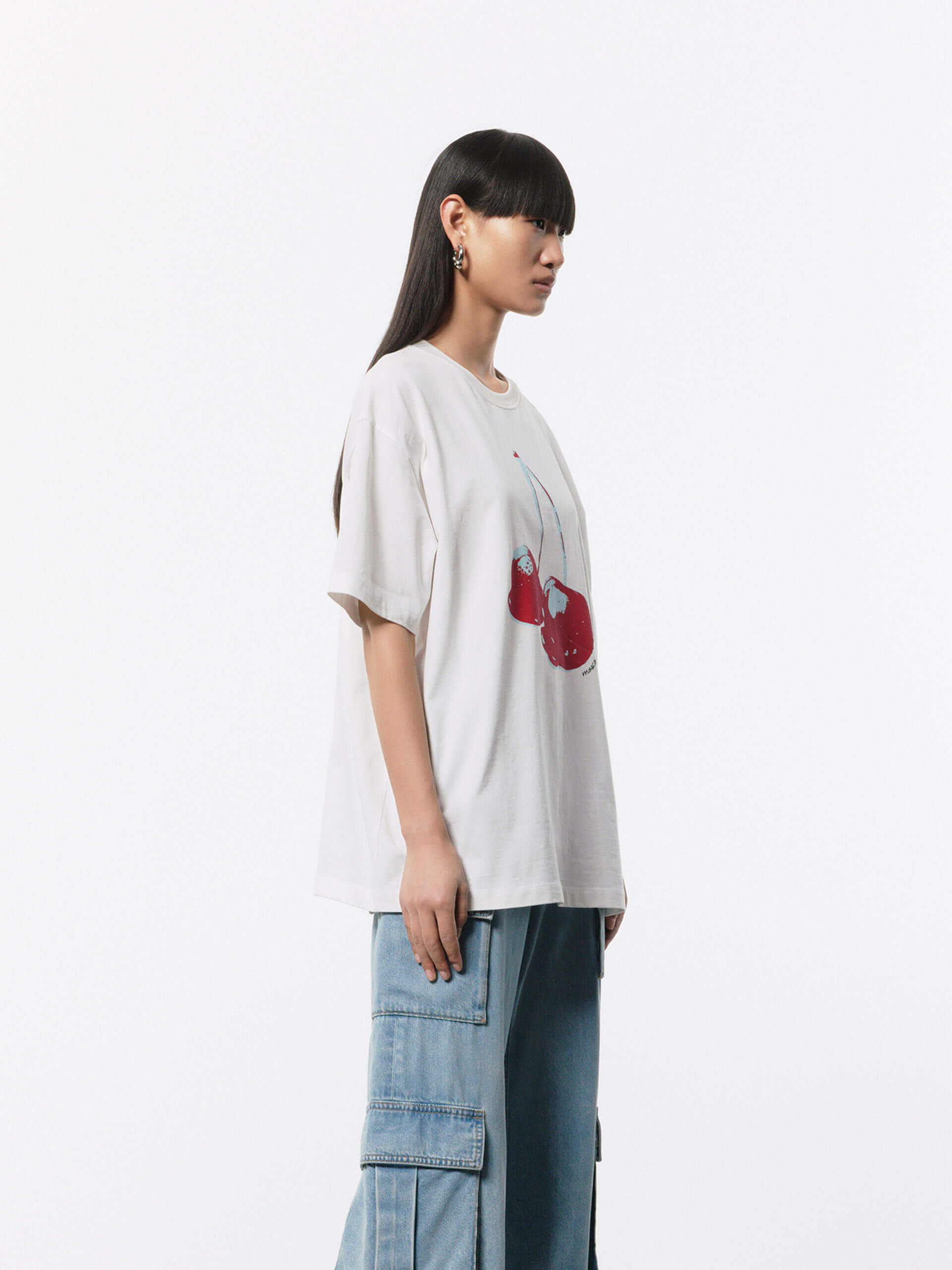 This t-shirt is made from soft and comfortable cotton fabric for a cozy feel. It features a slightly oversized fit with a drop-shoulder design for a relaxed and casual look. The front of the shirt is adorned with a cherry print design for a playful and fun touch. This t-shirt is perfect for wearing on a lazy weekend or pair with jeans for a casual outing.