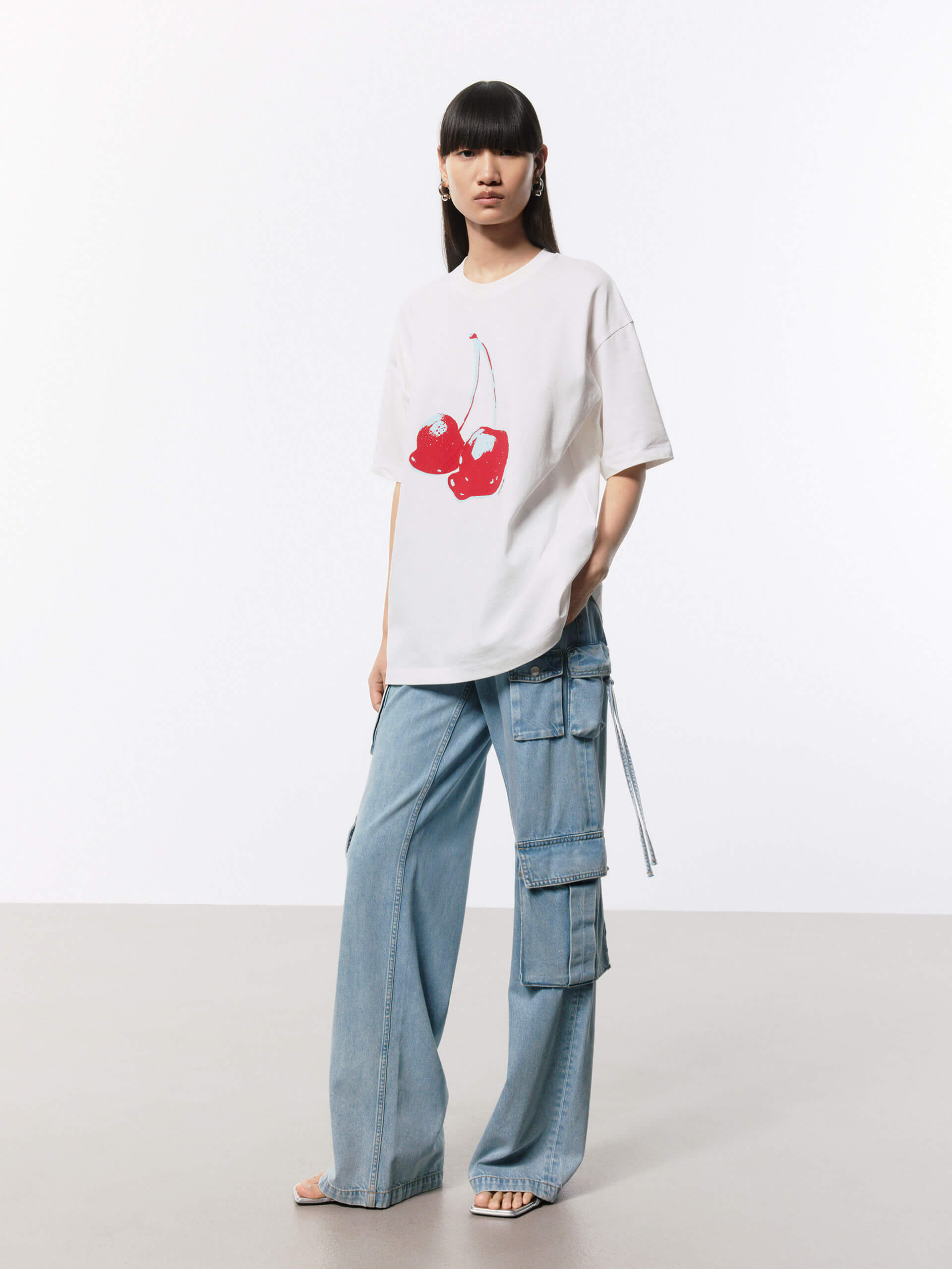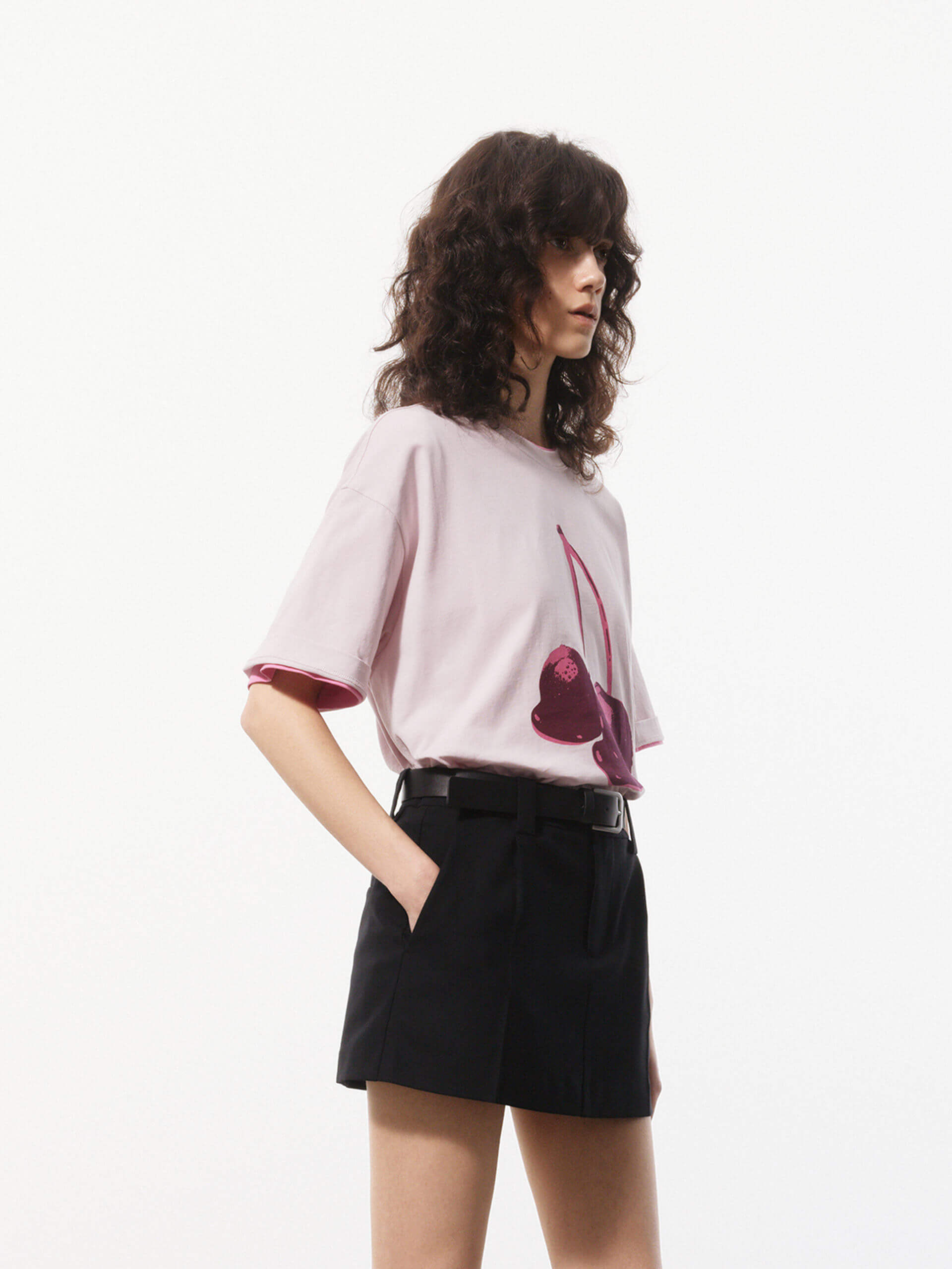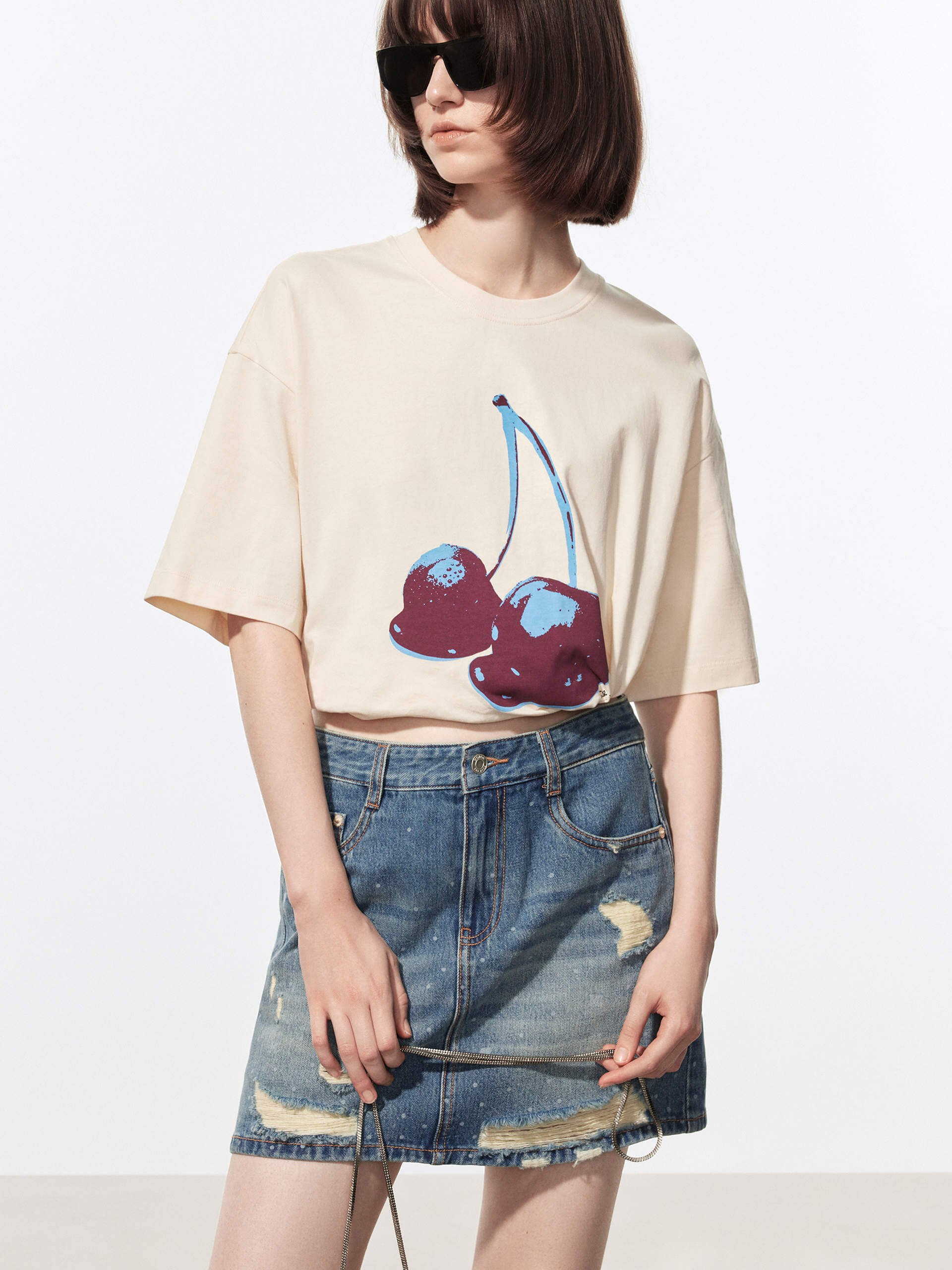 This t-shirt is made from soft and comfortable cotton fabric for a cozy feel. It features a slightly oversized fit with a drop-shoulder design for a relaxed and casual look. The front of the shirt is adorned with a cherry print design for a playful and fun touch. This t-shirt is perfect for wearing on a lazy weekend or pair with jeans for a casual outing.