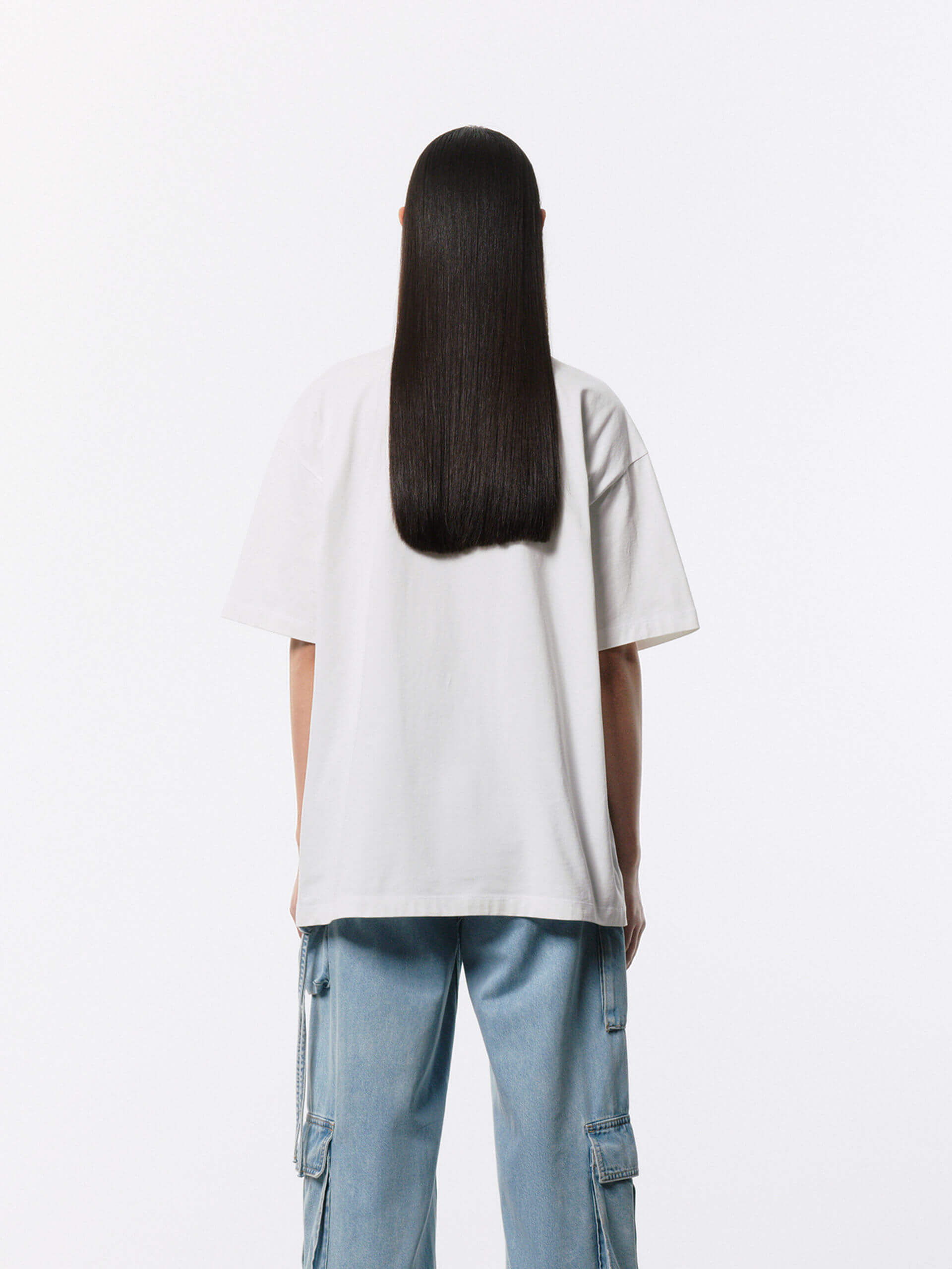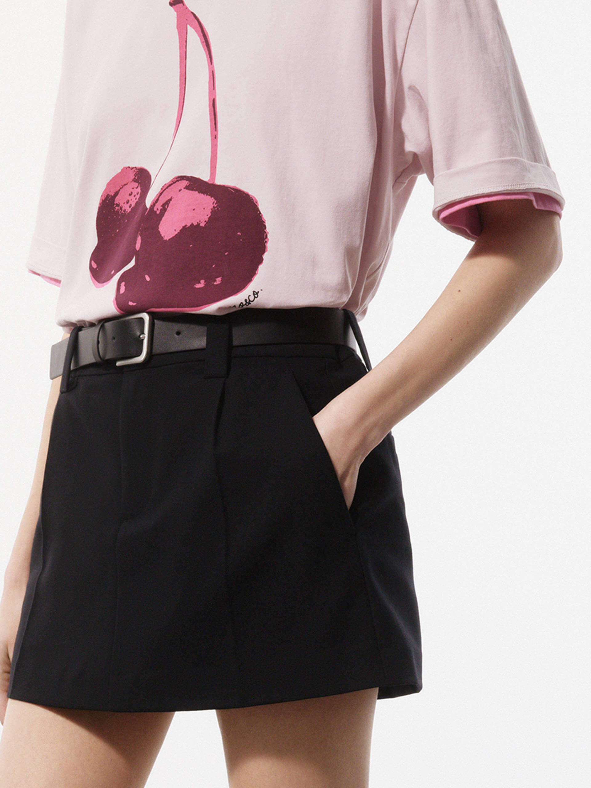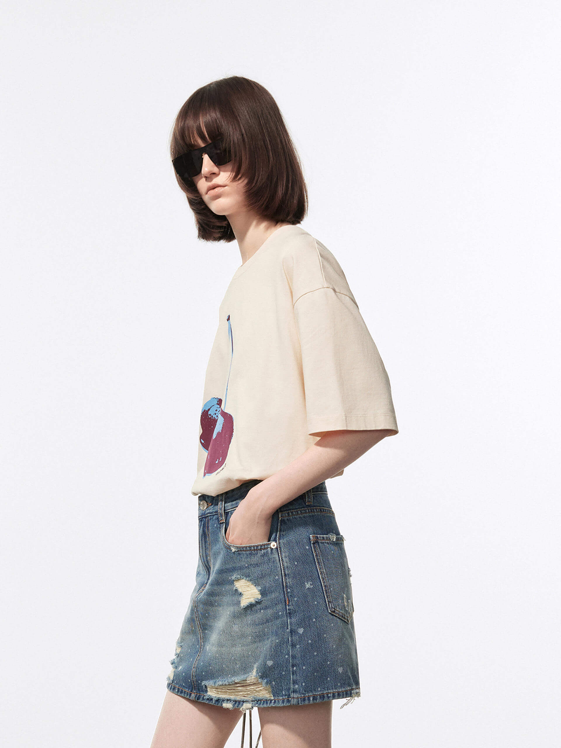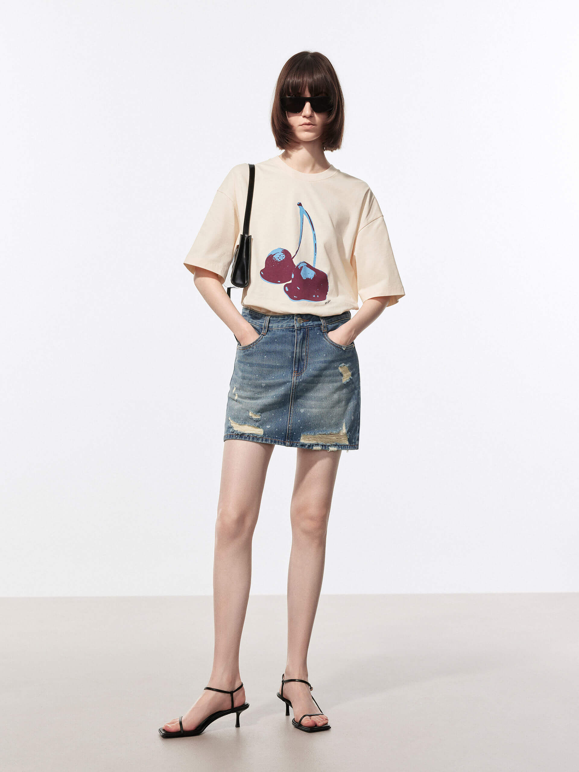 This t-shirt is made from soft and comfortable cotton fabric for a cozy feel. It features a slightly oversized fit with a drop-shoulder design for a relaxed and casual look. The front of the shirt is adorned with a cherry print design for a playful and fun touch. This t-shirt is perfect for wearing on a lazy weekend or pair with jeans for a casual outing.