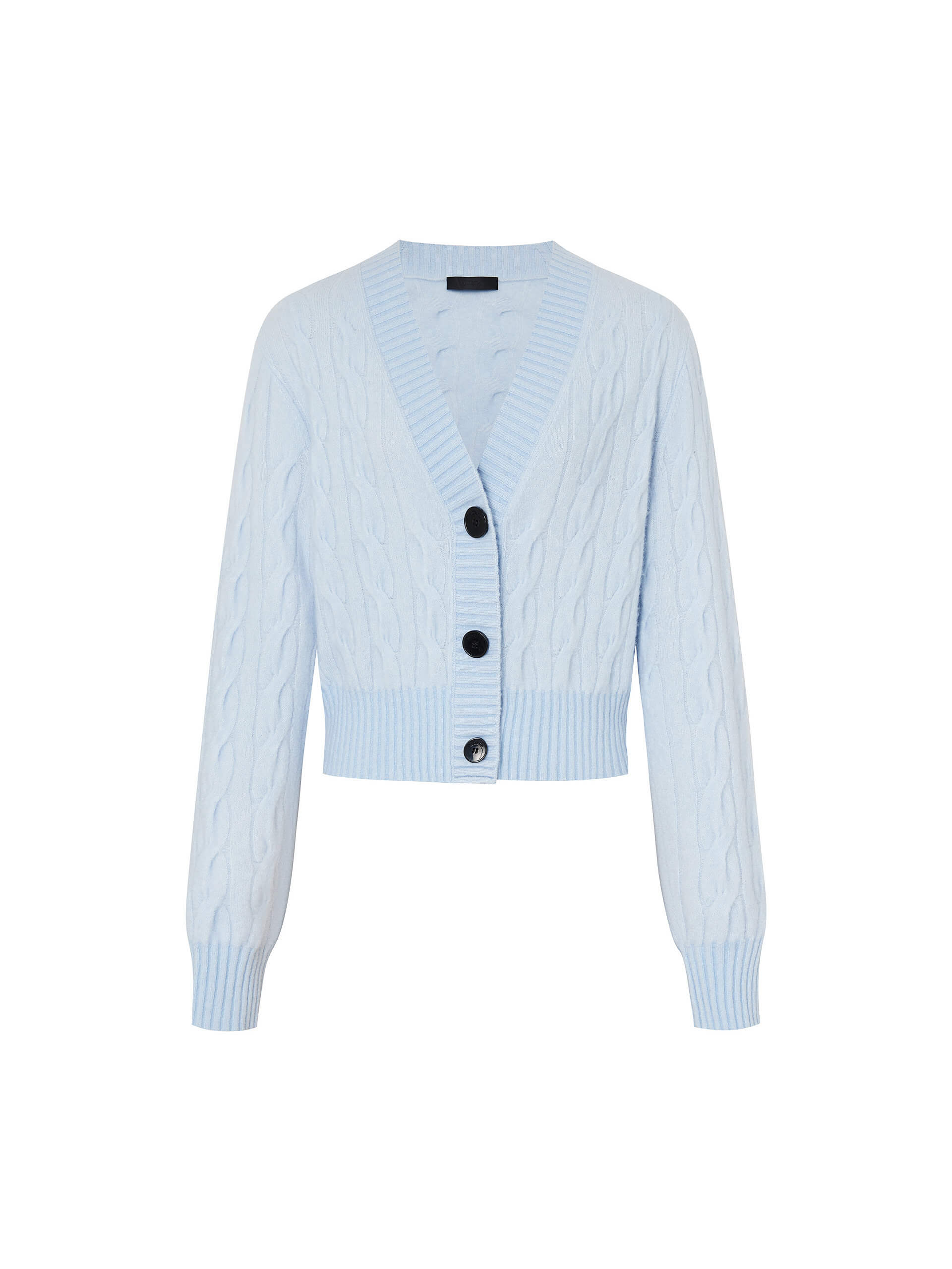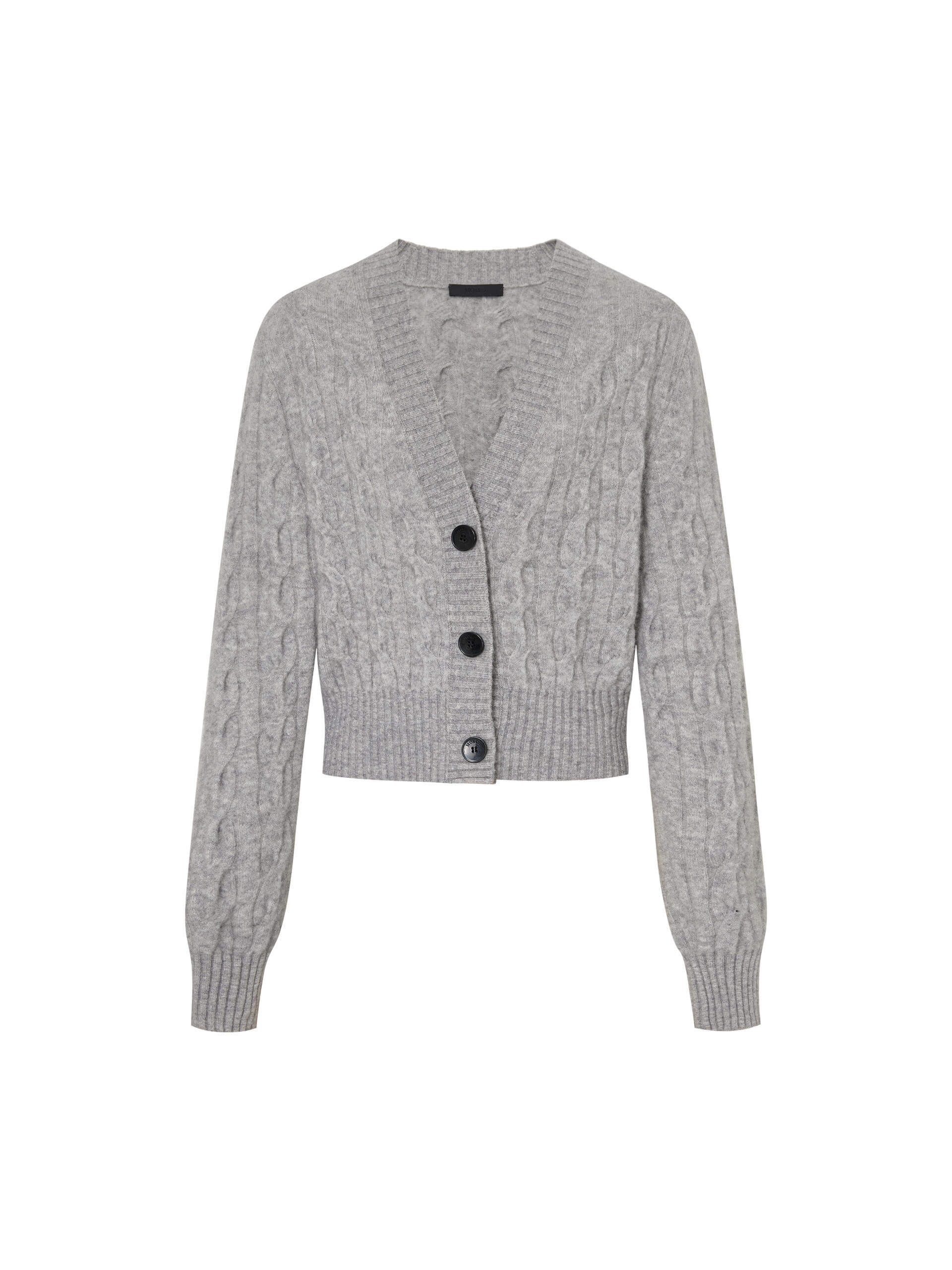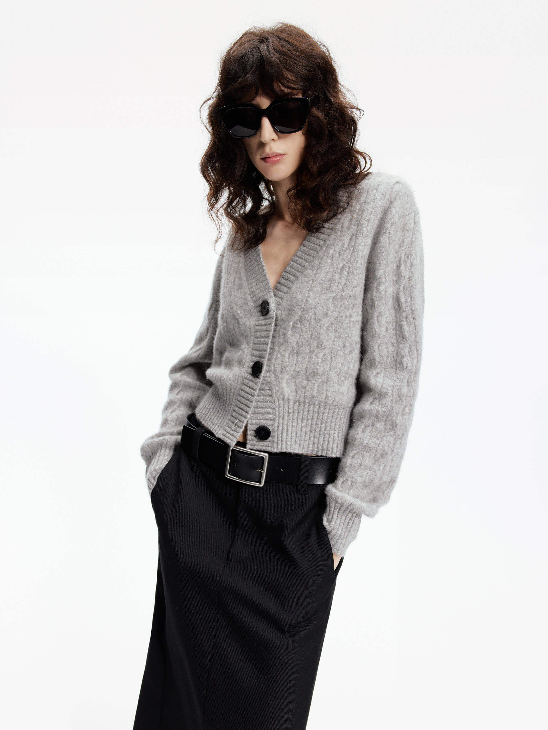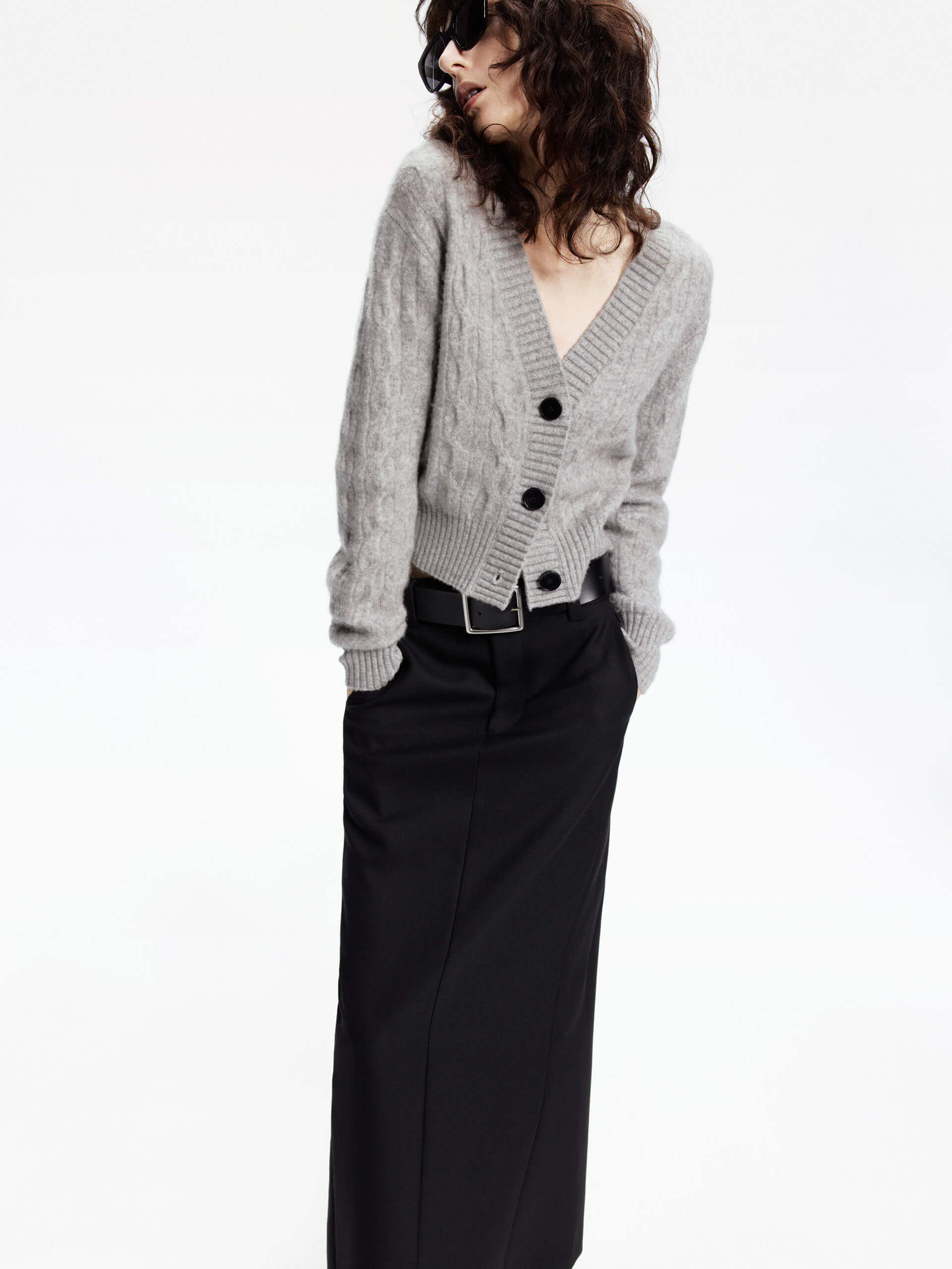 This cardigan is made with a blend of wool and cashmere, this cozy cardigan features a unique cable knit texture and a shorter, modern cut. Pair it with a high-waisted skirt or pants for a chic look. Stay warm and fashionable all season long!