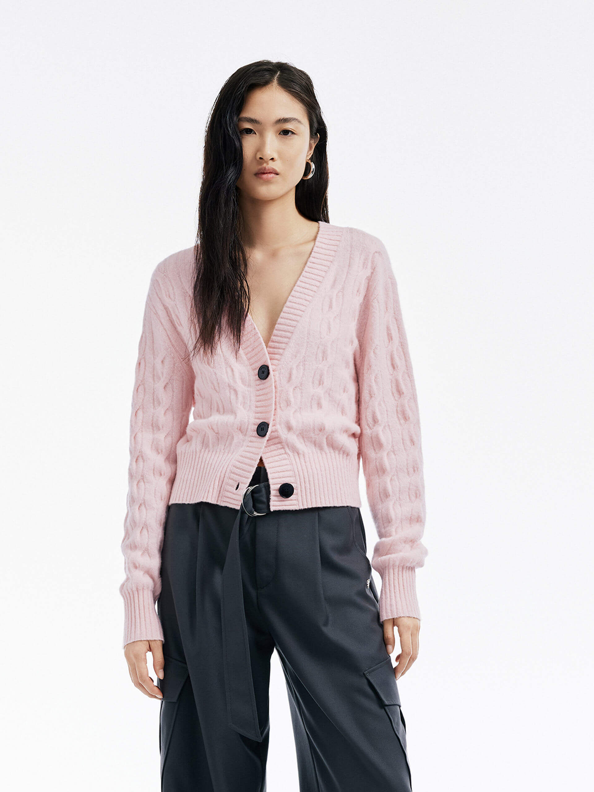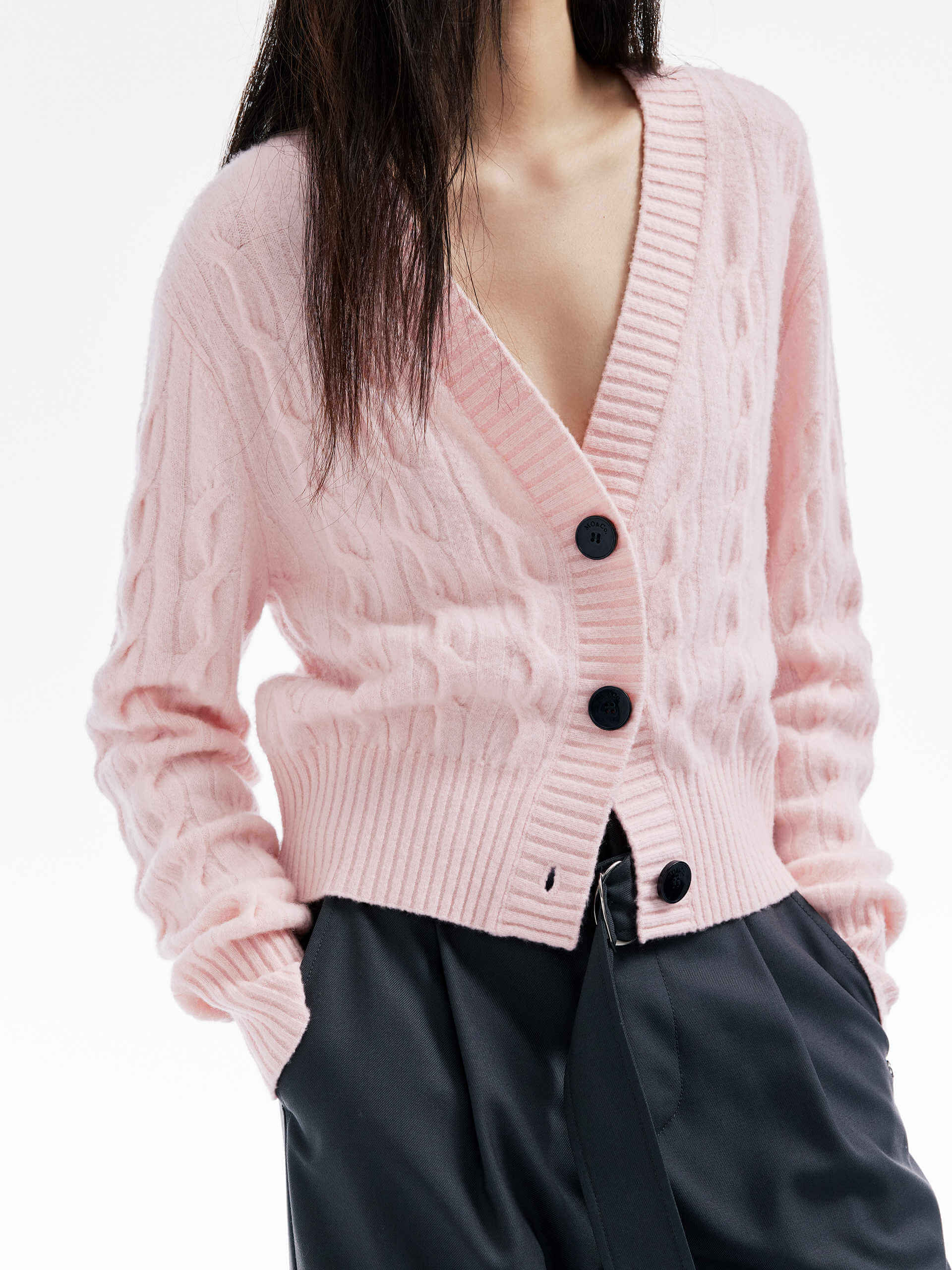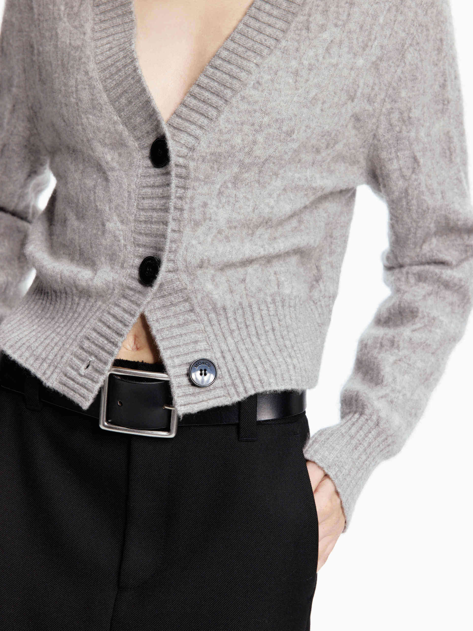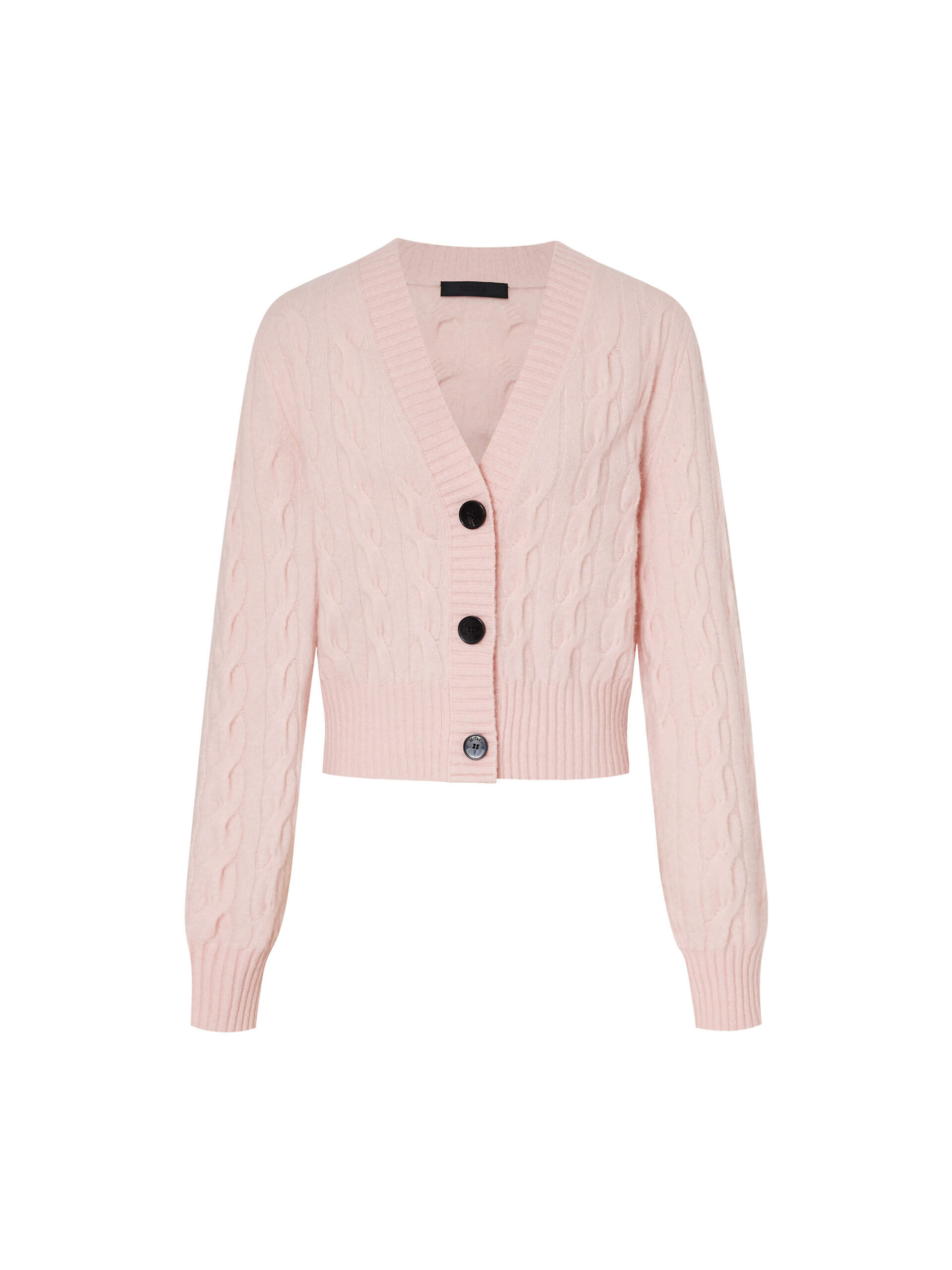 This cardigan is made with a blend of wool and cashmere, this cozy cardigan features a unique cable knit texture and a shorter, modern cut. Pair it with a high-waisted skirt or pants for a chic look. Stay warm and fashionable all season long!