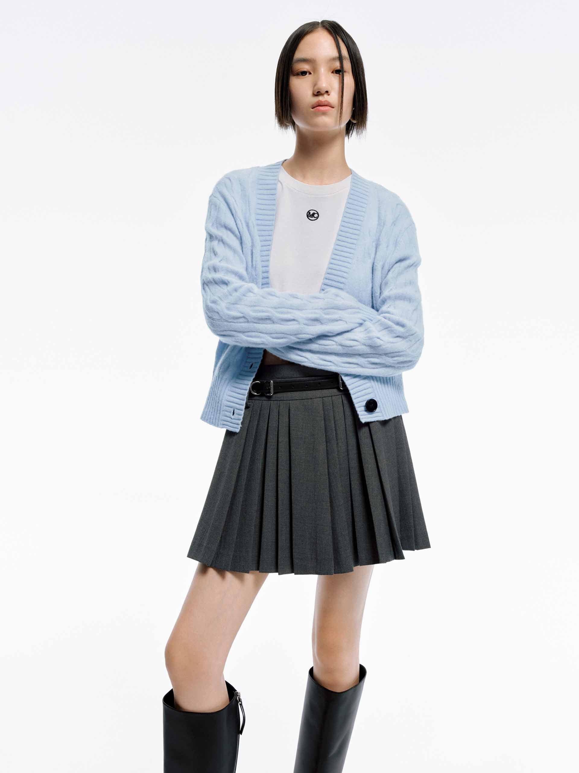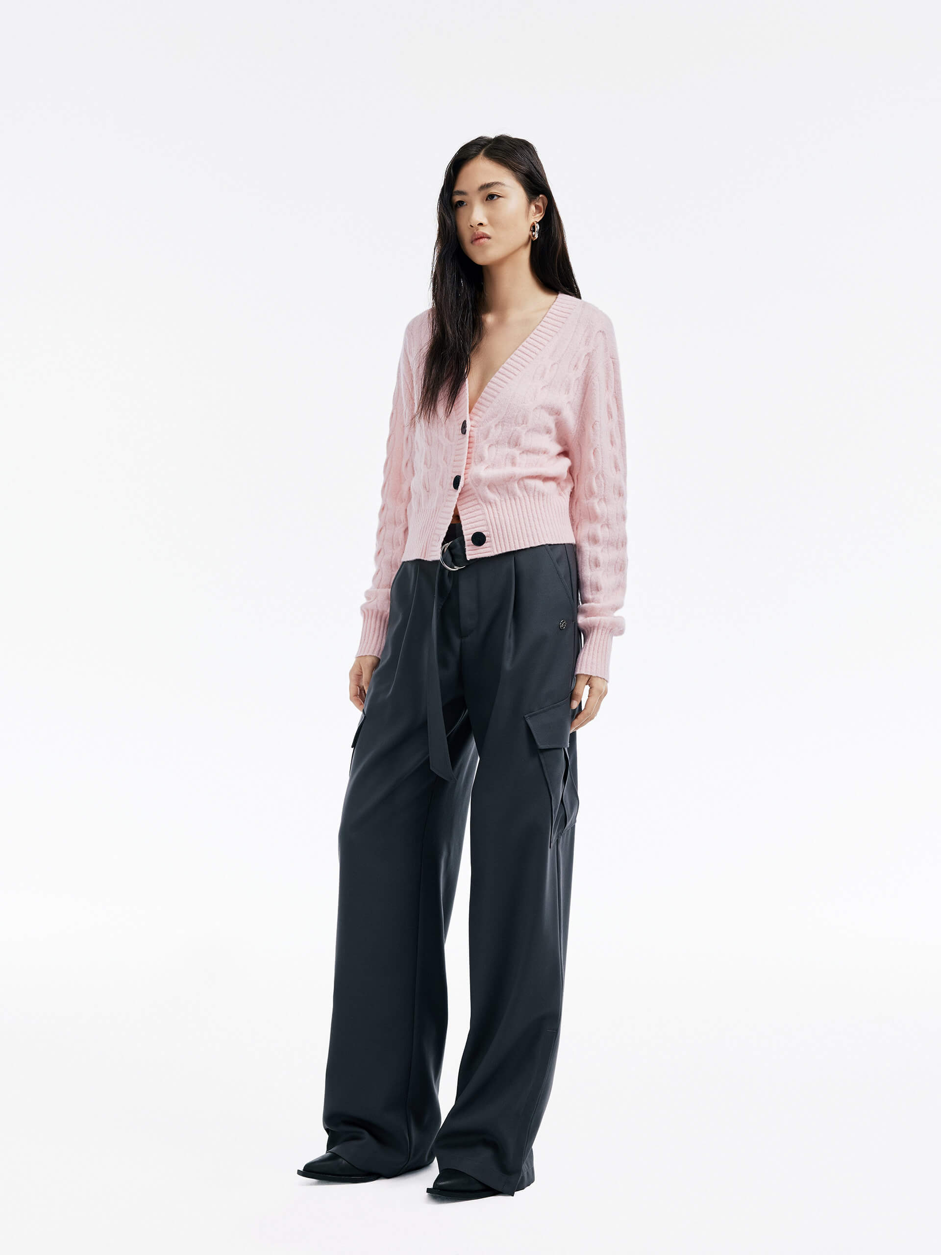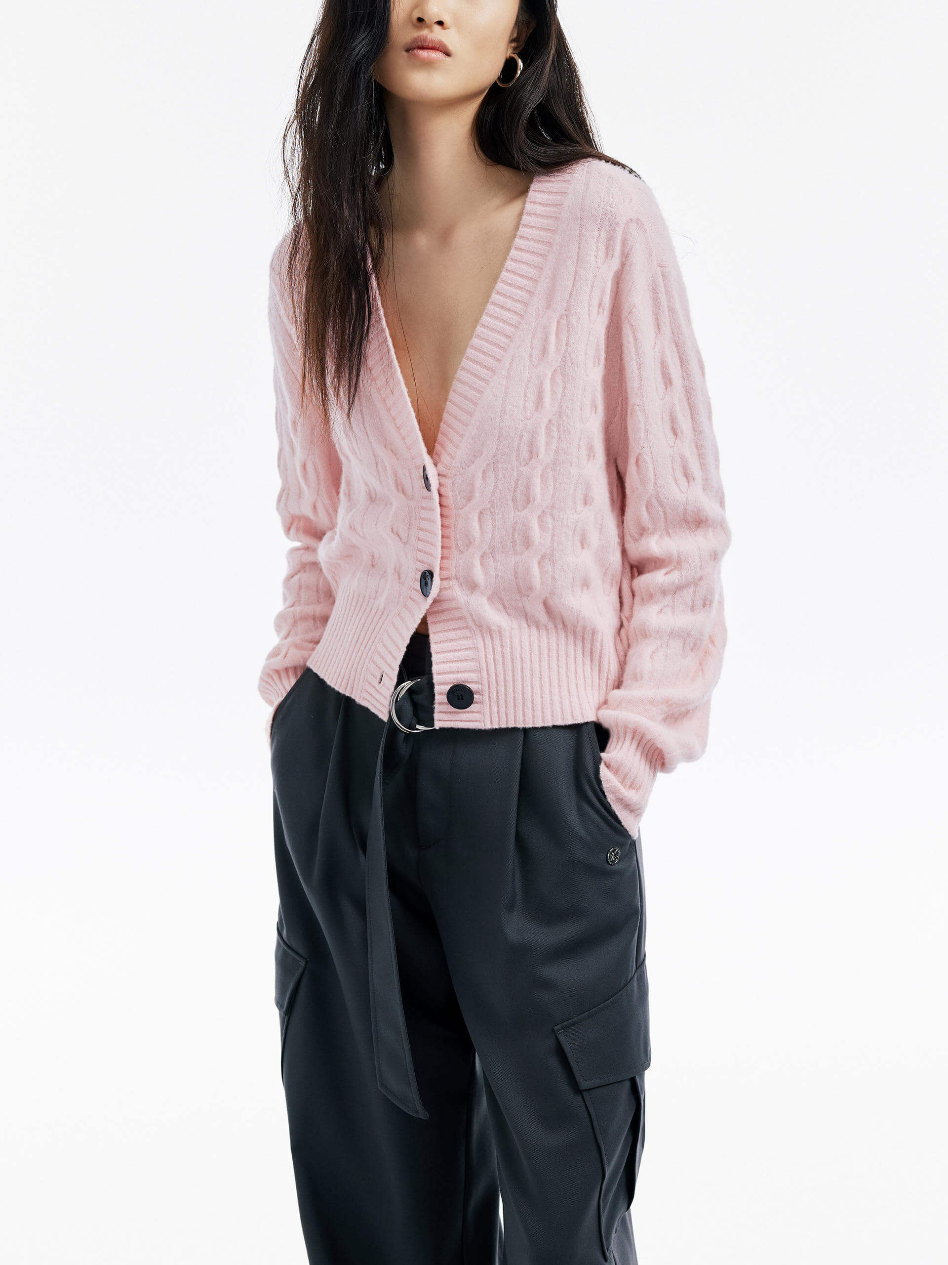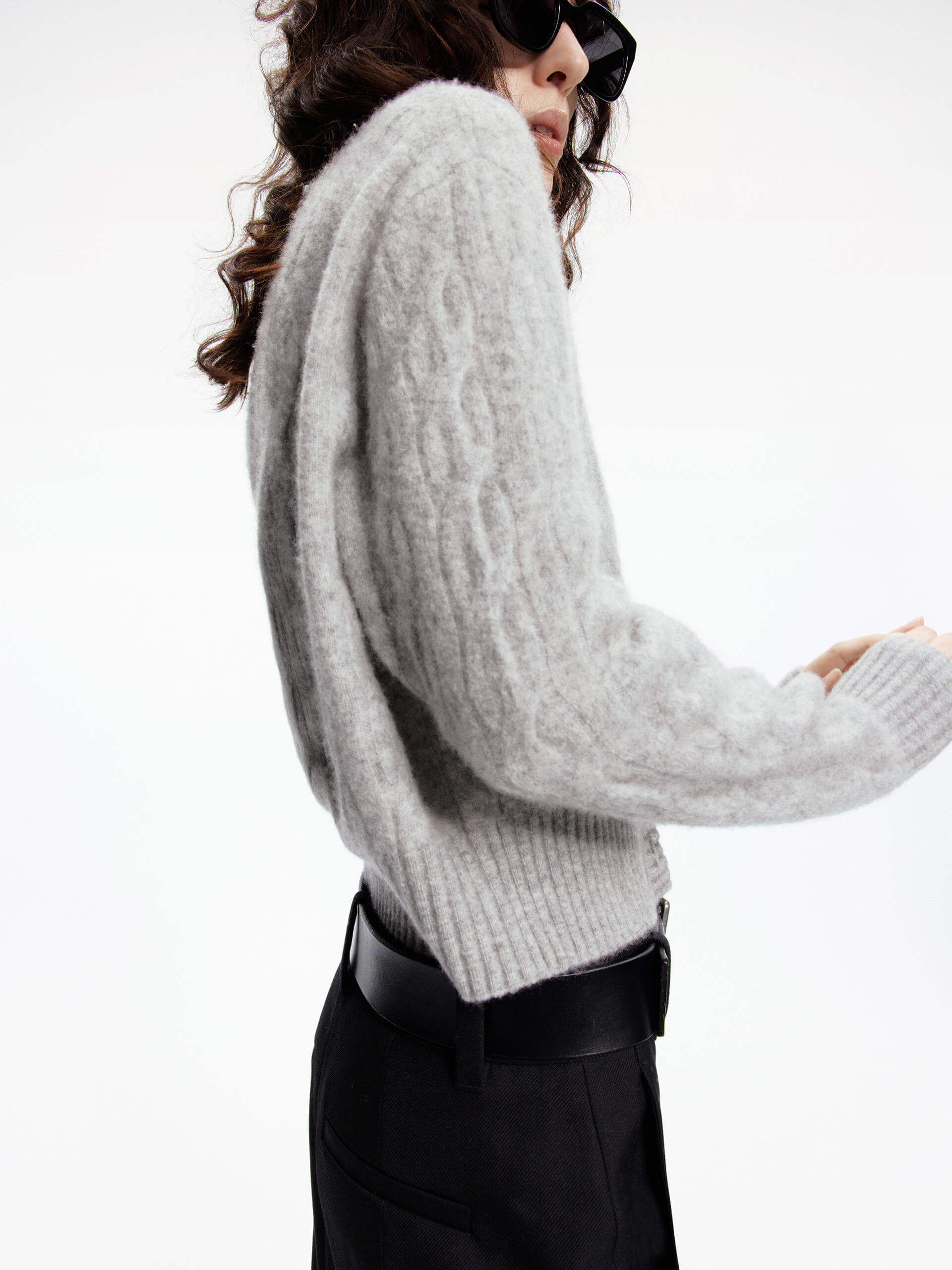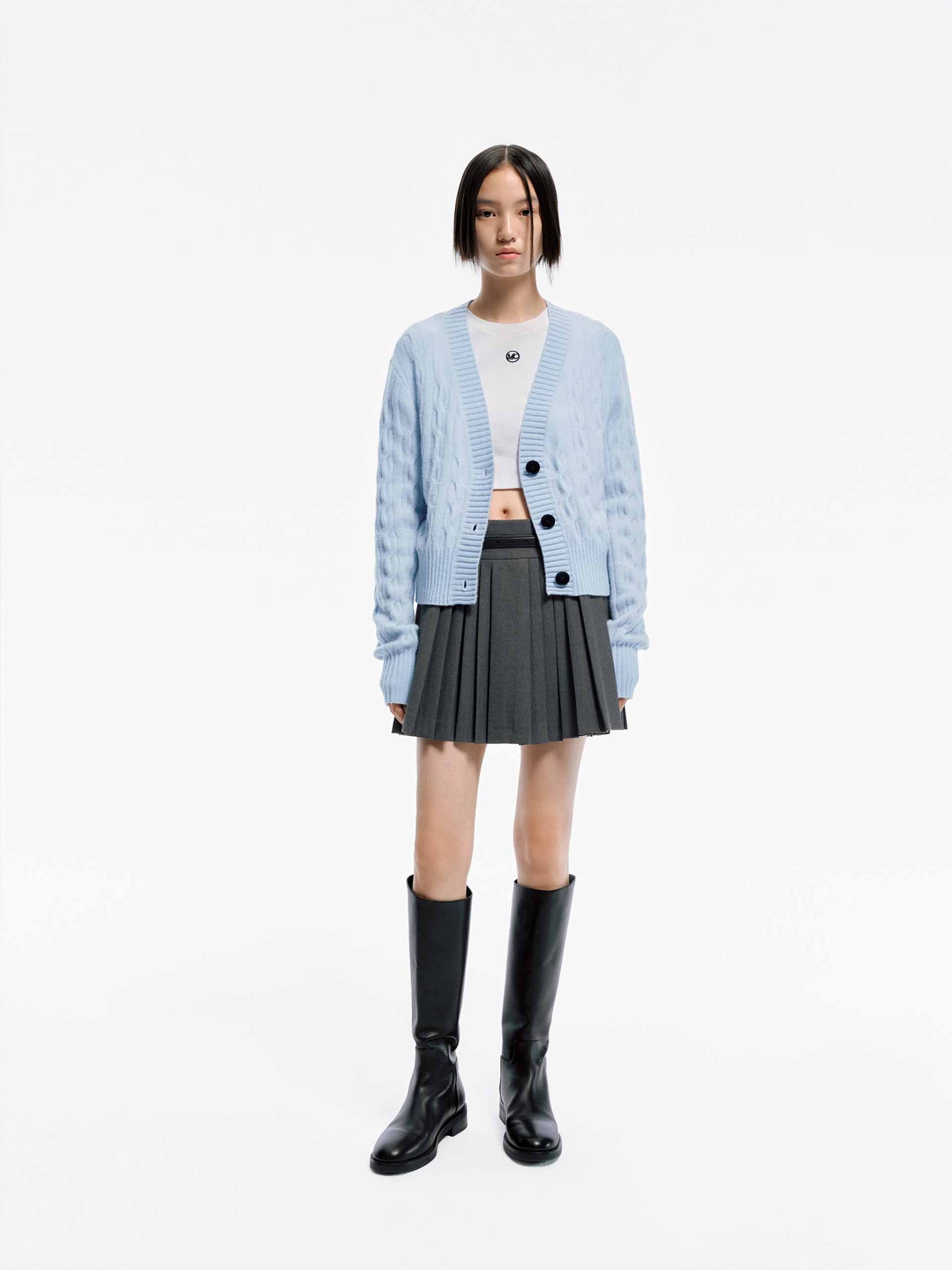 This cardigan is made with a blend of wool and cashmere, this cozy cardigan features a unique cable knit texture and a shorter, modern cut. Pair it with a high-waisted skirt or pants for a chic look. Stay warm and fashionable all season long!