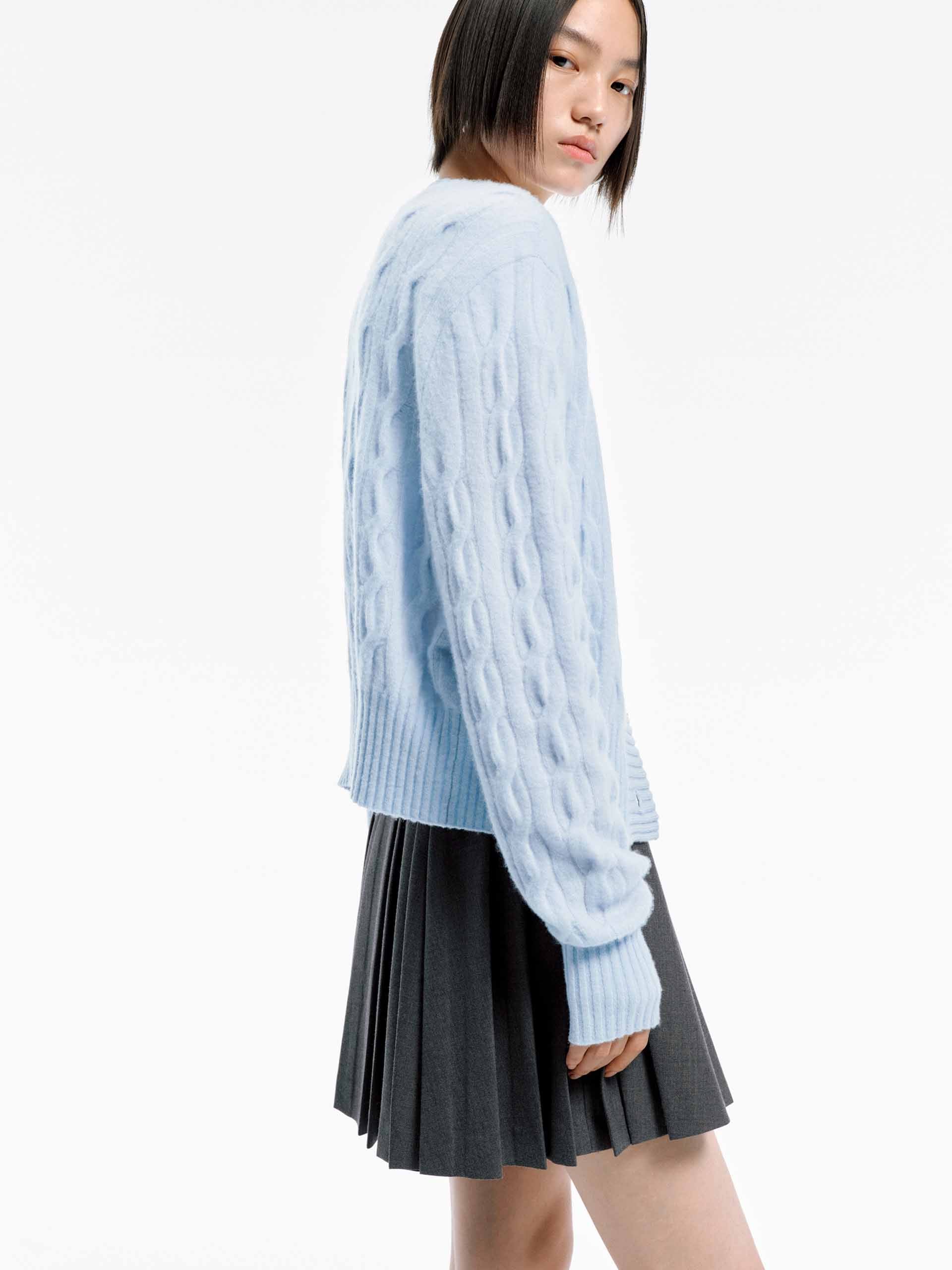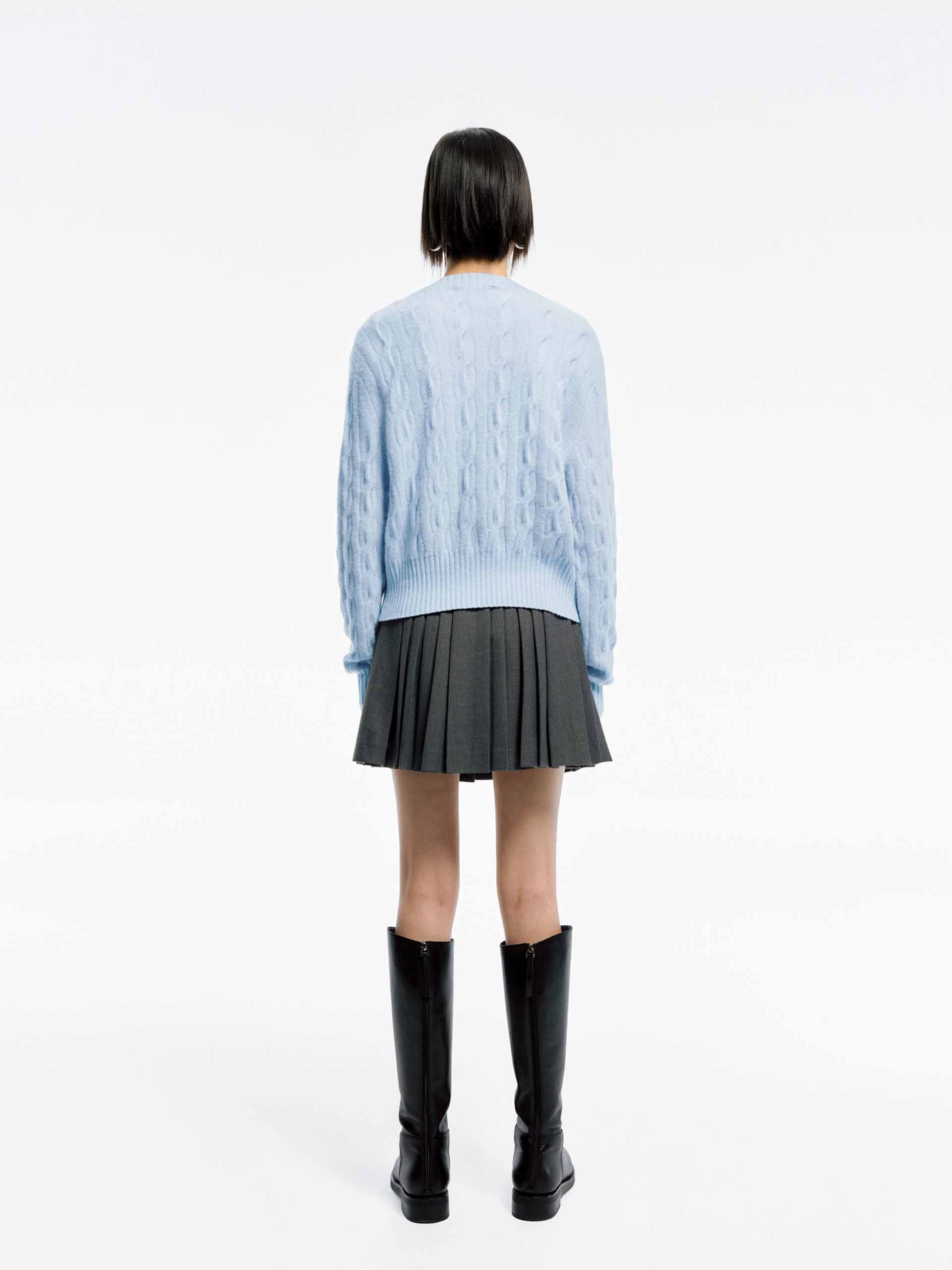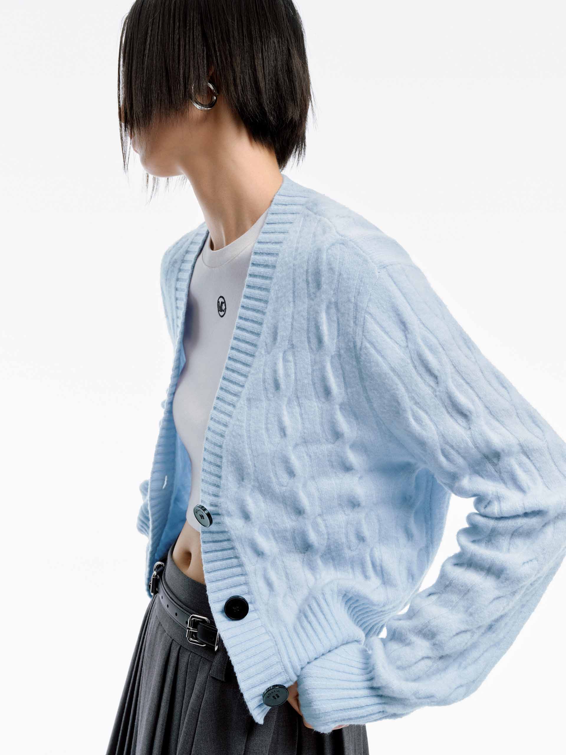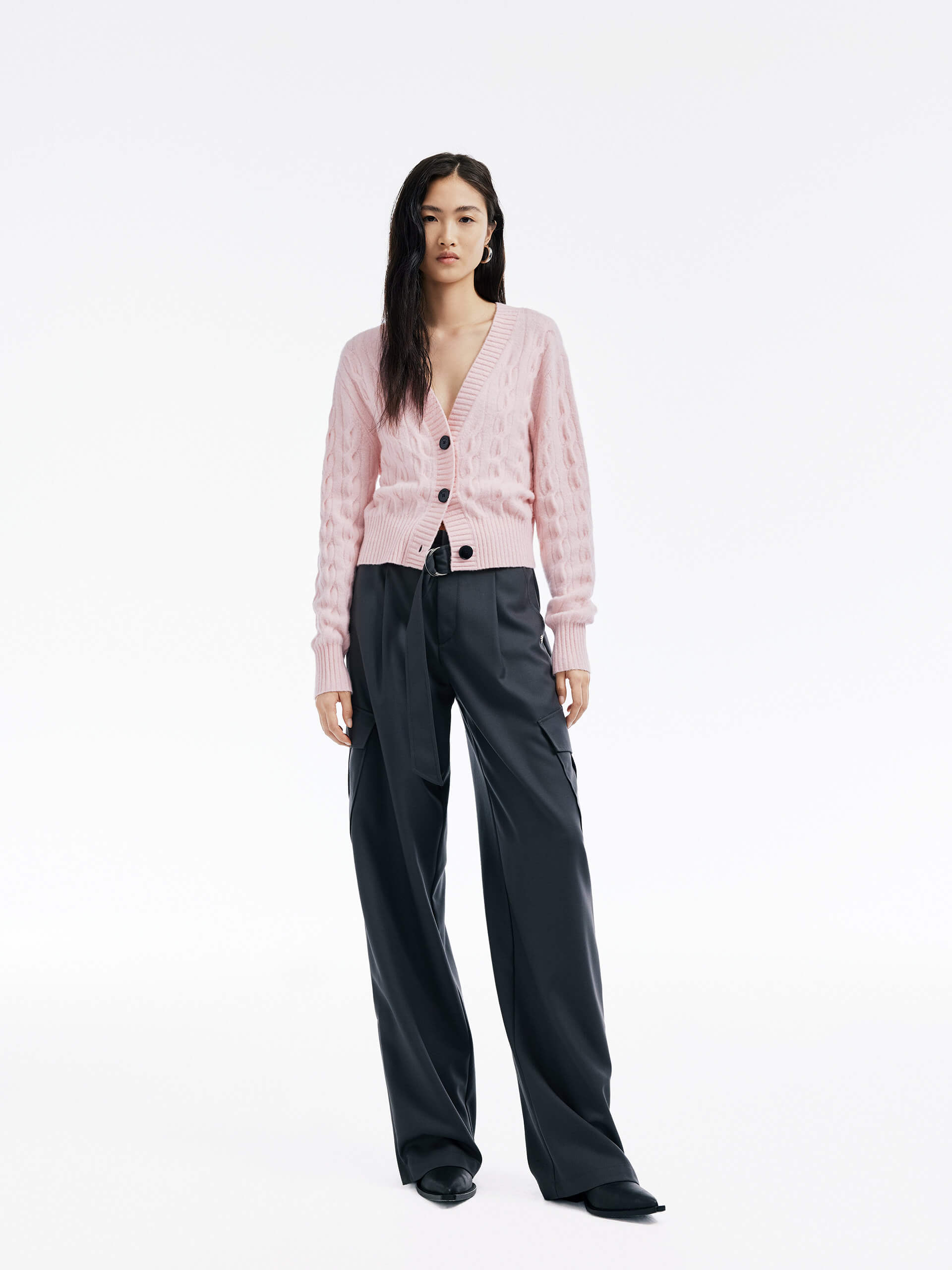 This cardigan is made with a blend of wool and cashmere, this cozy cardigan features a unique cable knit texture and a shorter, modern cut. Pair it with a high-waisted skirt or pants for a chic look. Stay warm and fashionable all season long!
