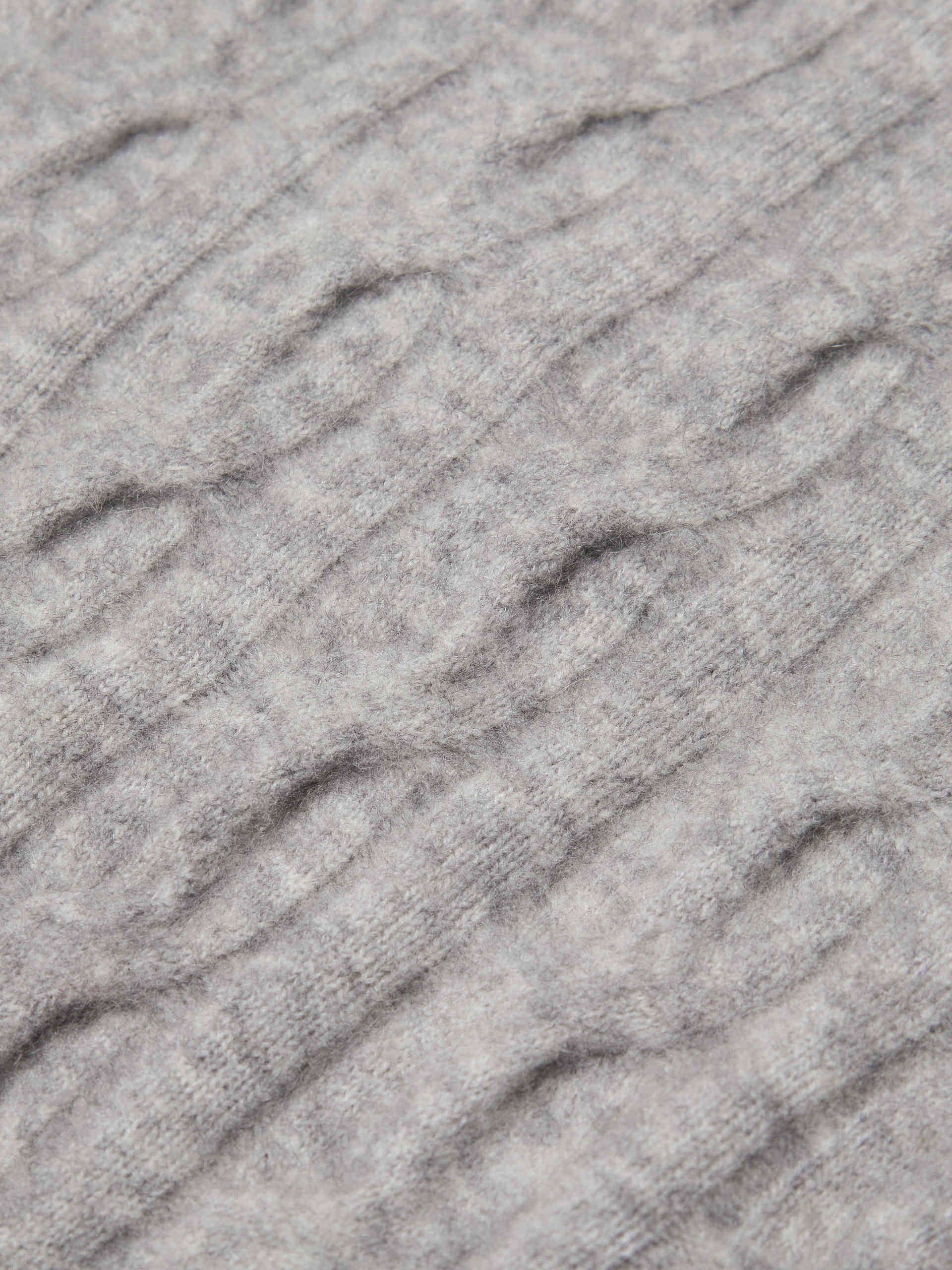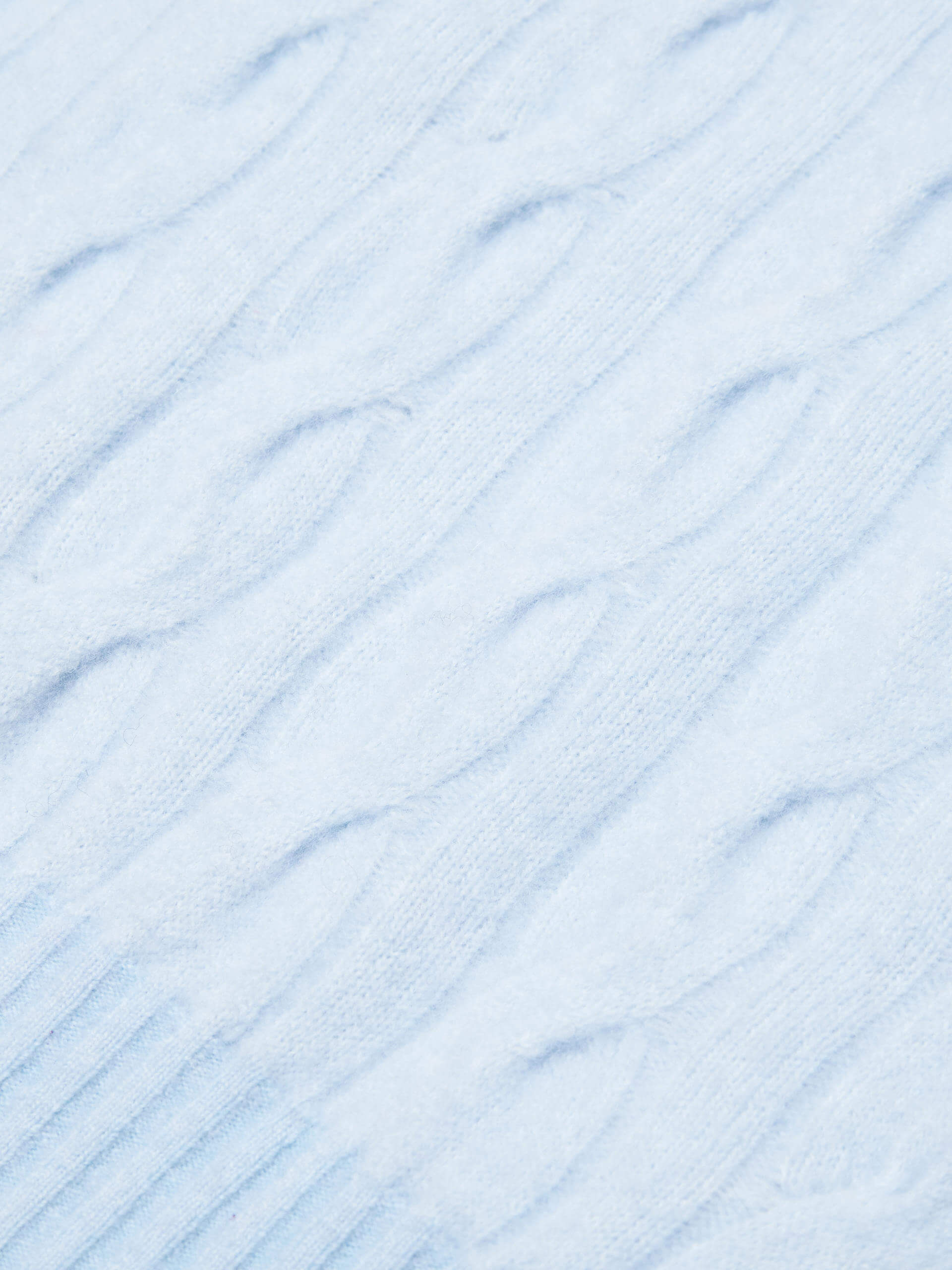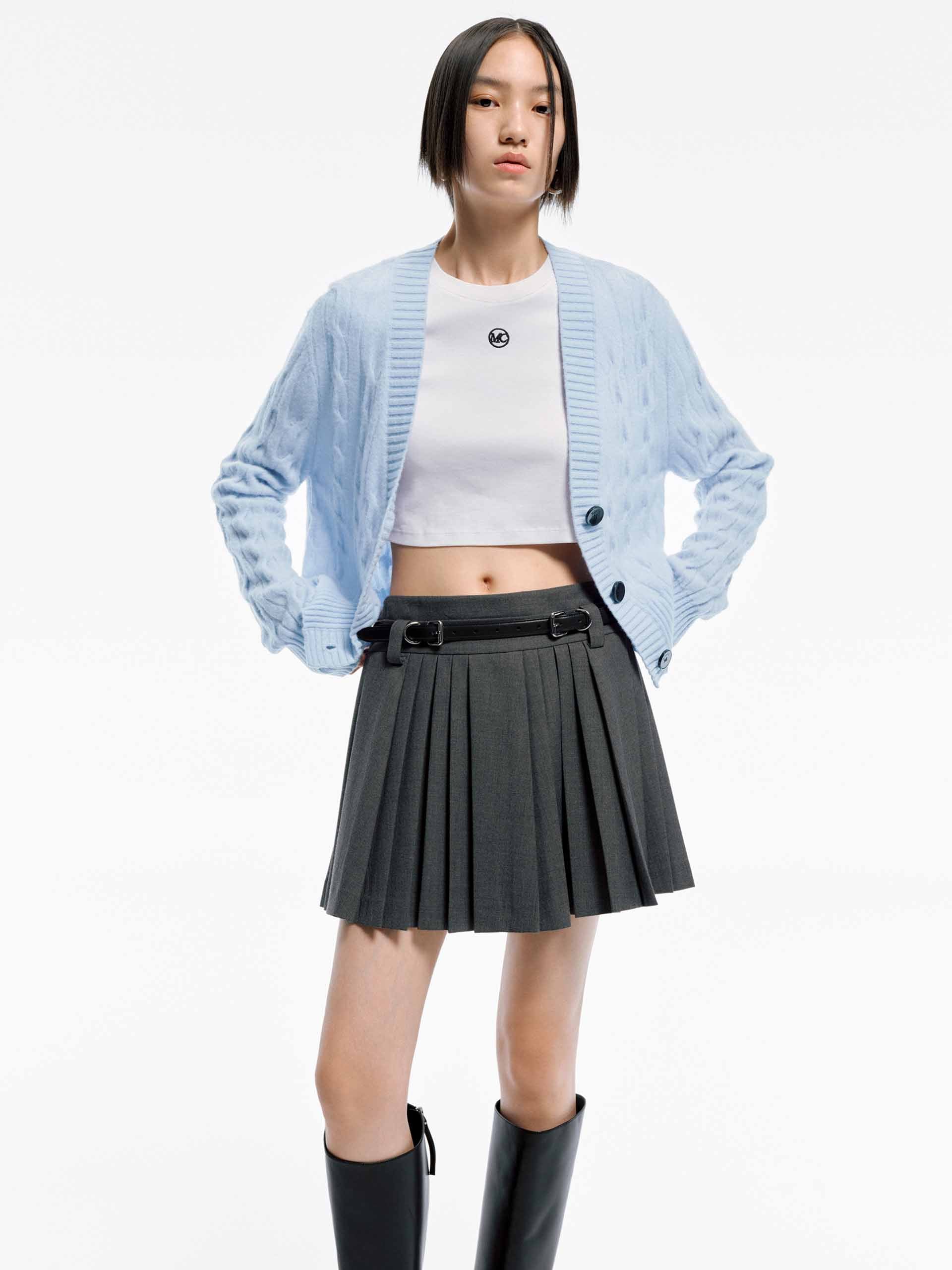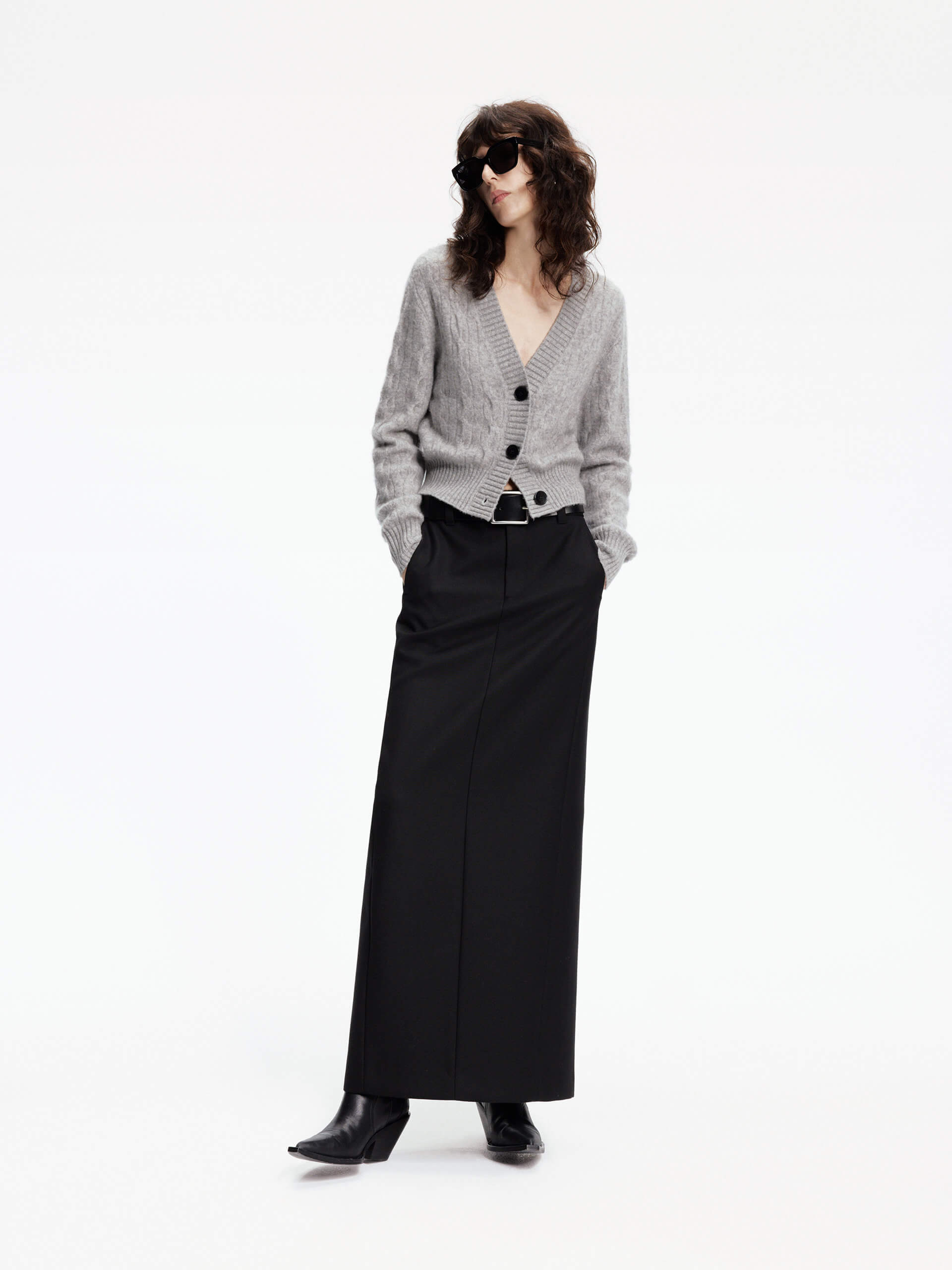 This cardigan is made with a blend of wool and cashmere, this cozy cardigan features a unique cable knit texture and a shorter, modern cut. Pair it with a high-waisted skirt or pants for a chic look. Stay warm and fashionable all season long!