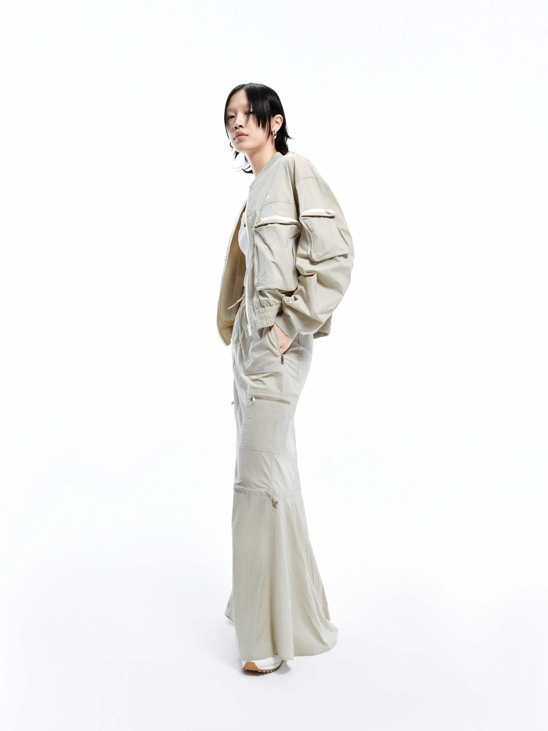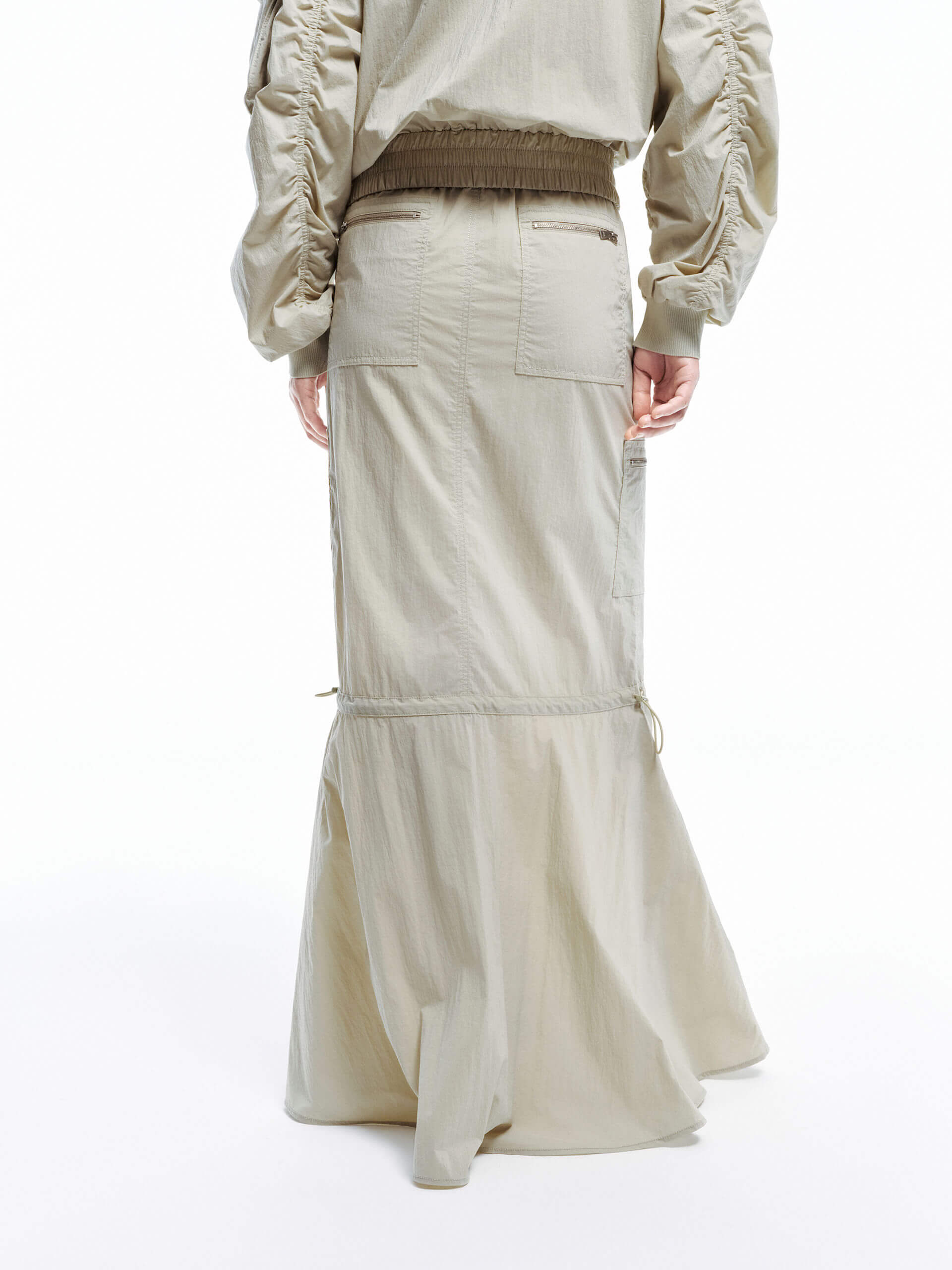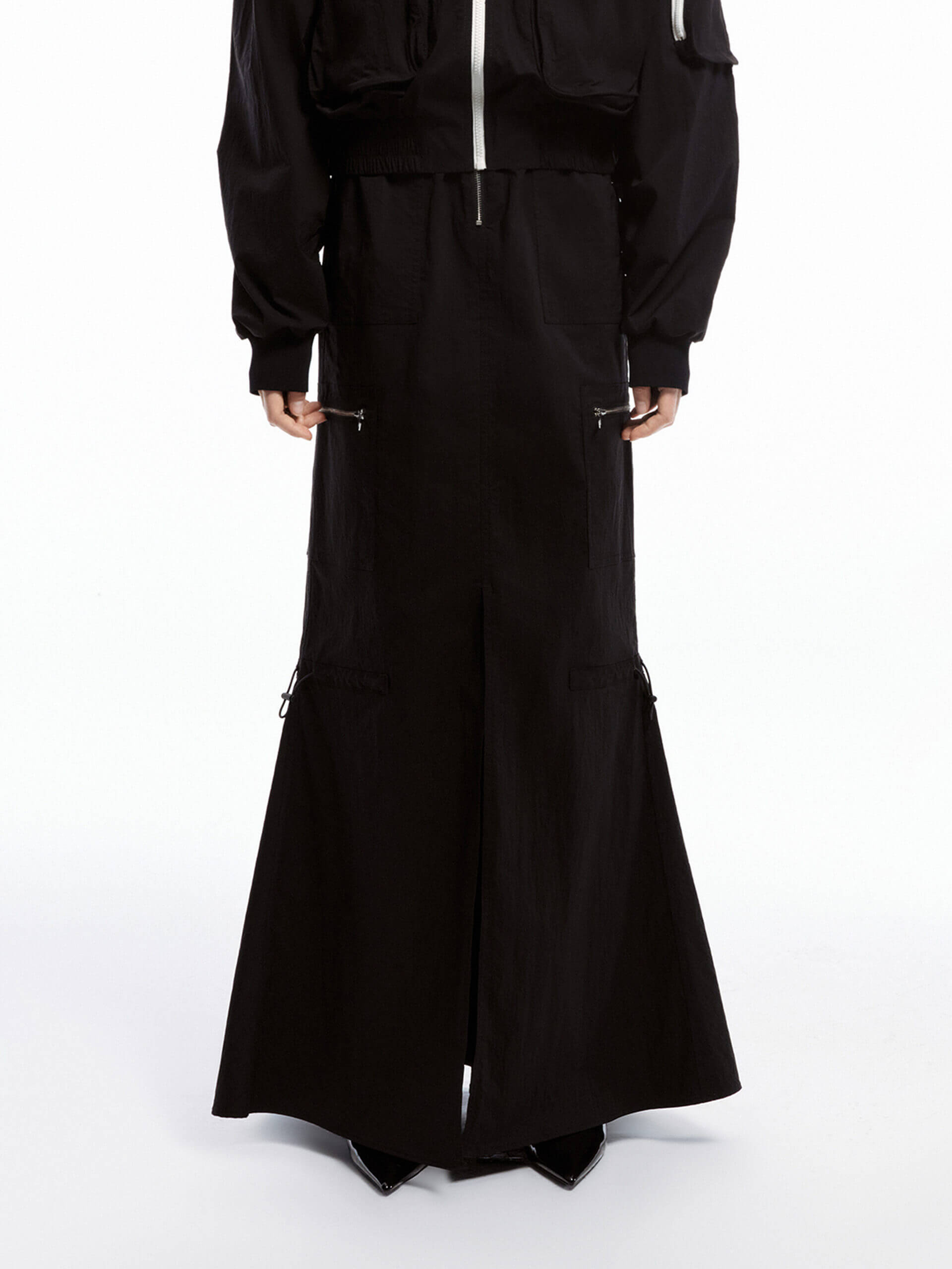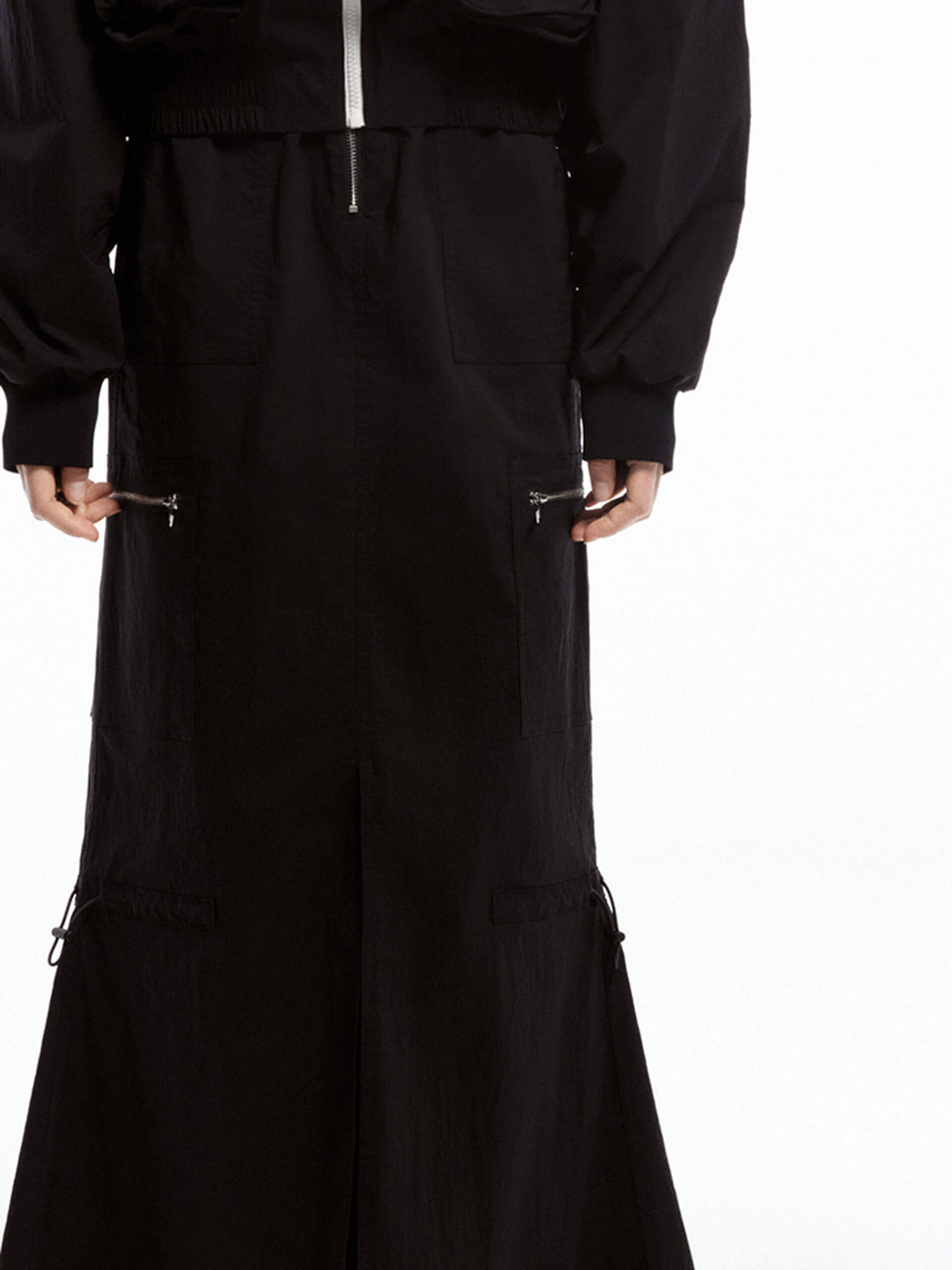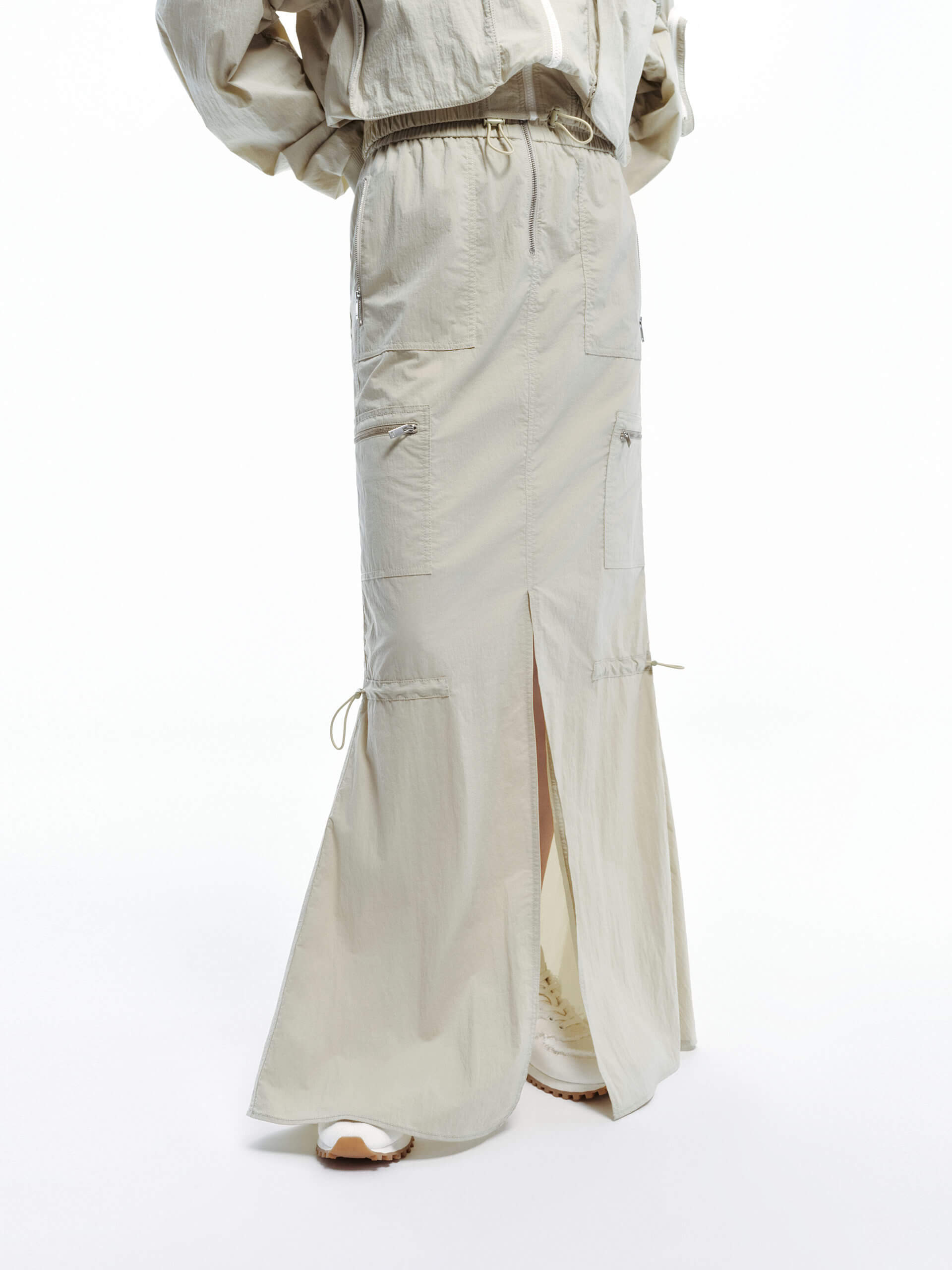 This skirt is crafted from a comfortable and lightweight fabric. Features multiple pockets and a long silhouette with a front slit and a fishtail hem. Pair it with the matching jacket for a relaxed yet stylish look. Please note that the gray one is different from regular gray, and may appear light green under different lighting conditions.