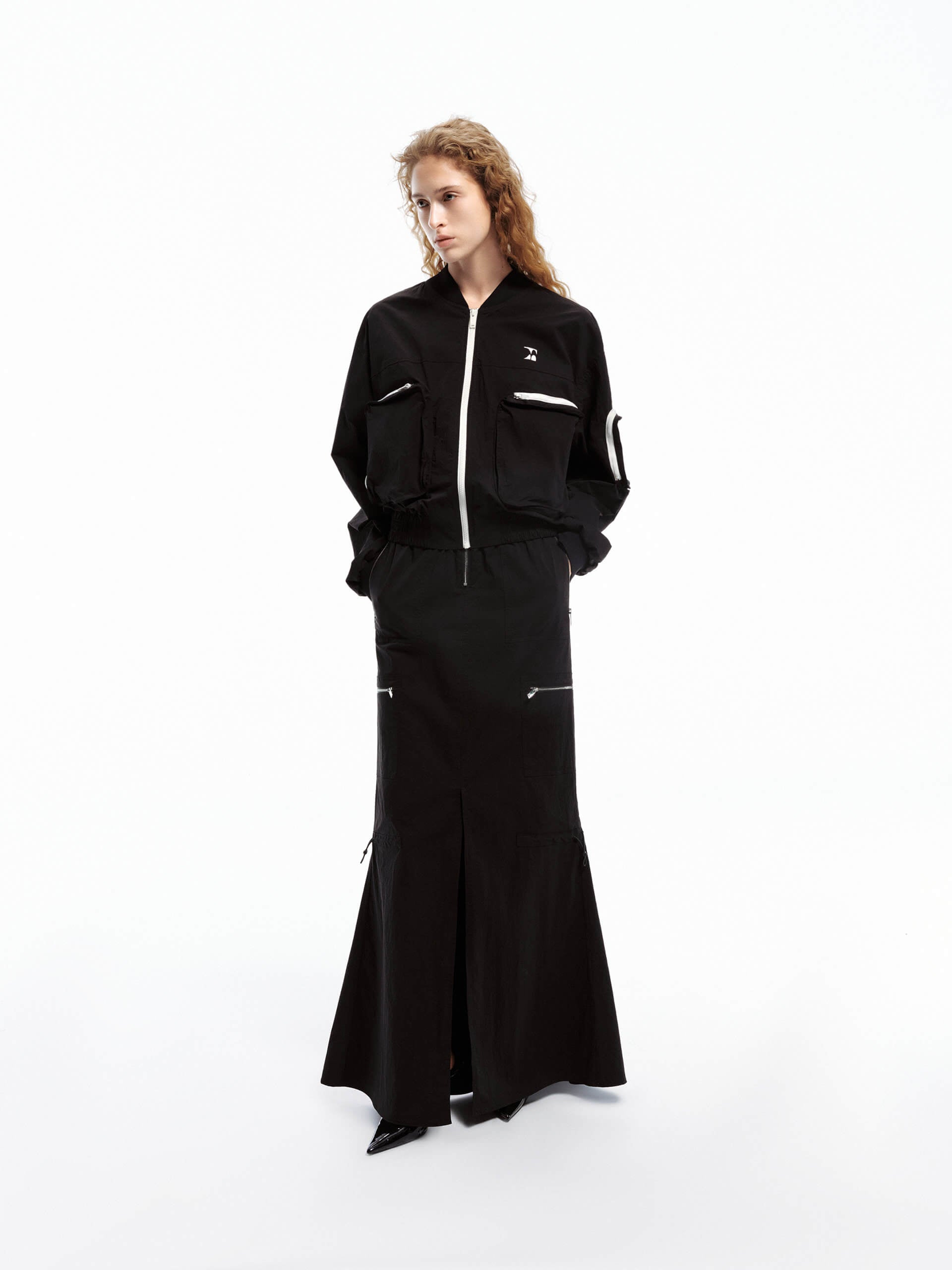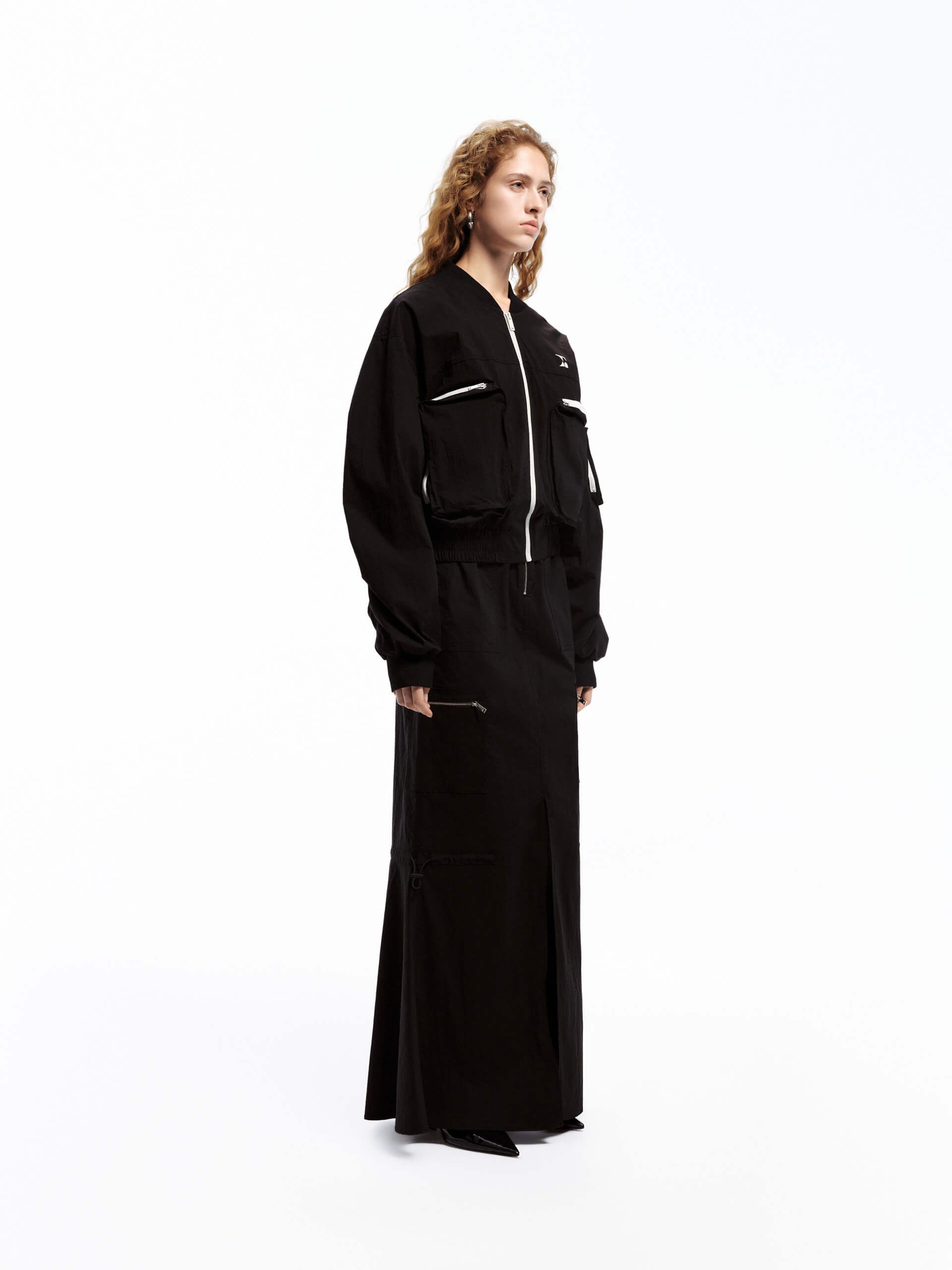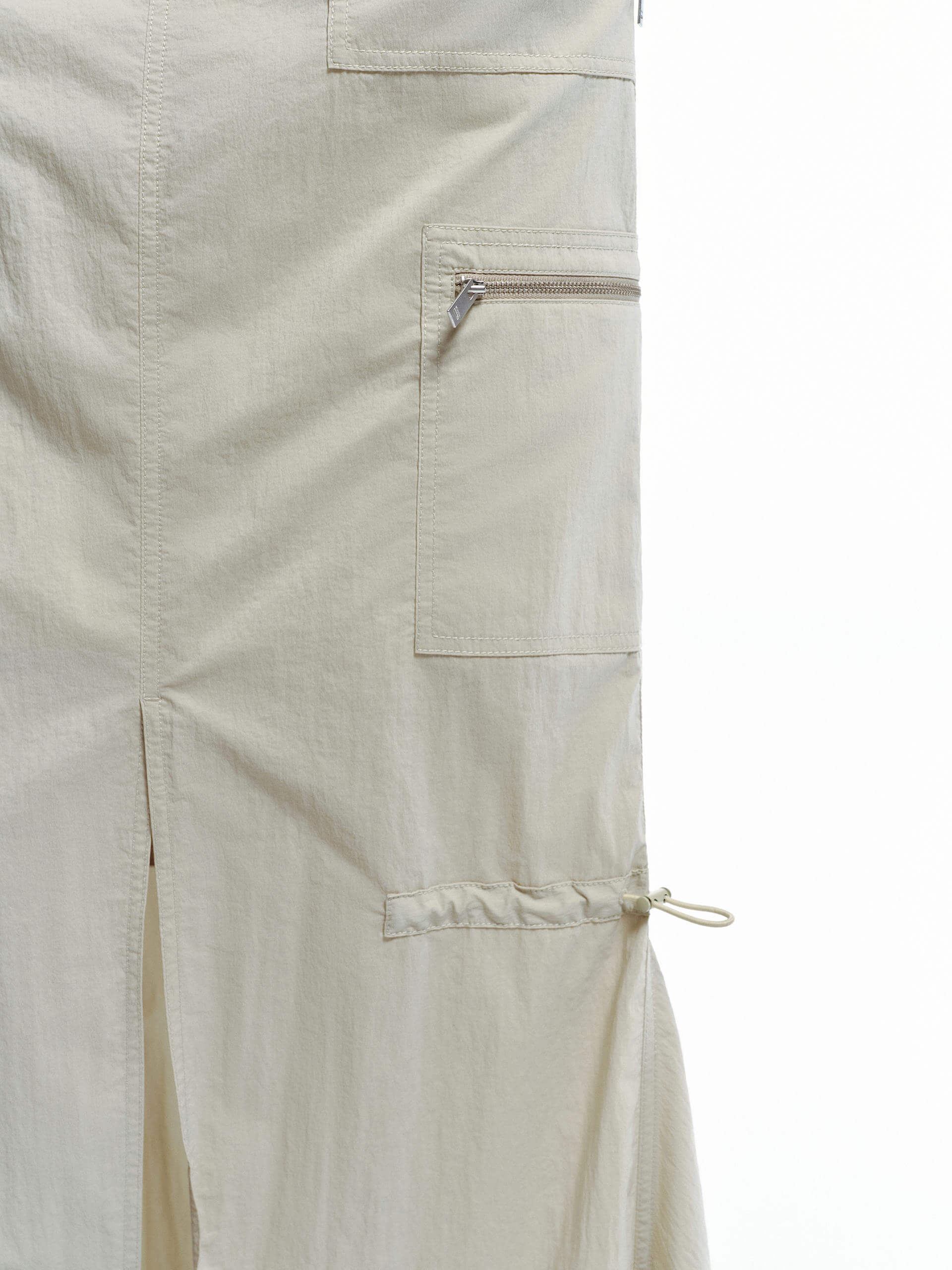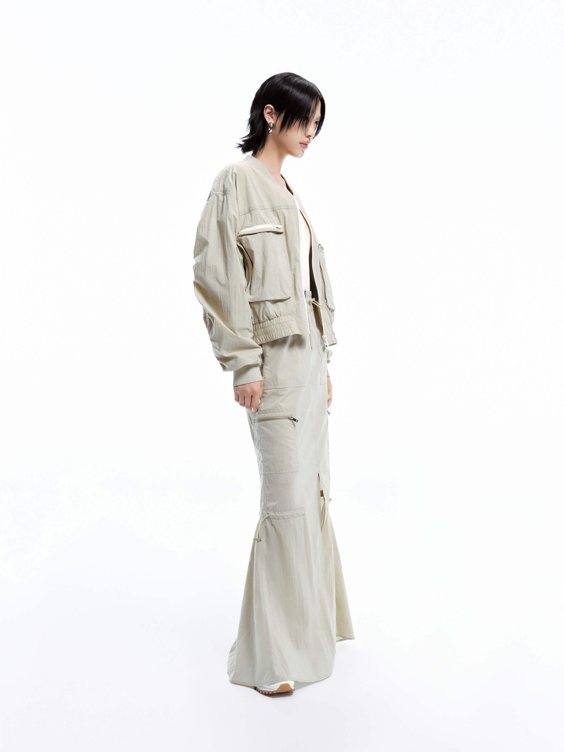 This skirt is crafted from a comfortable and lightweight fabric. Features multiple pockets and a long silhouette with a front slit and a fishtail hem. Pair it with the matching jacket for a relaxed yet stylish look. Please note that the gray one is different from regular gray, and may appear light green under different lighting conditions.