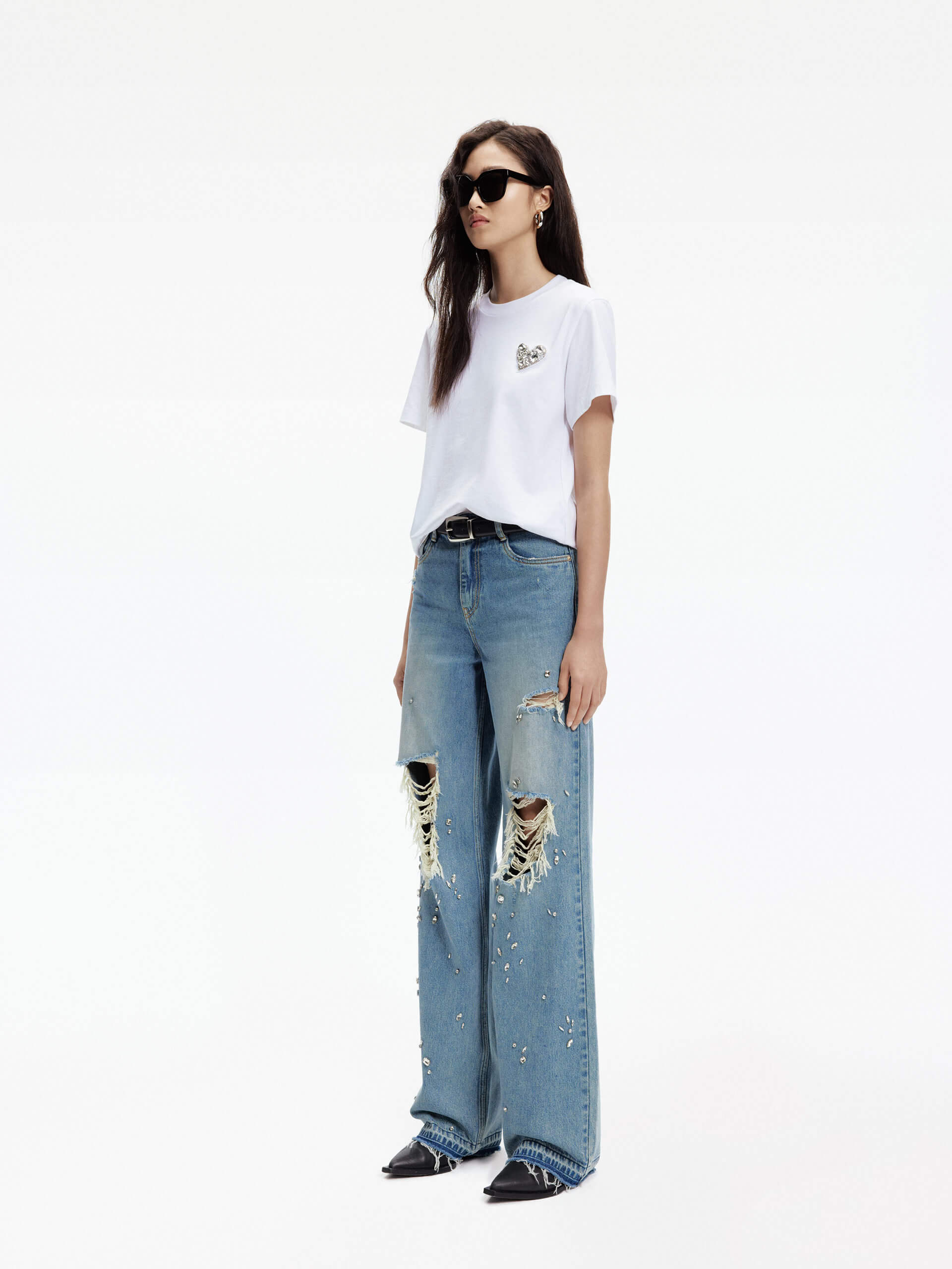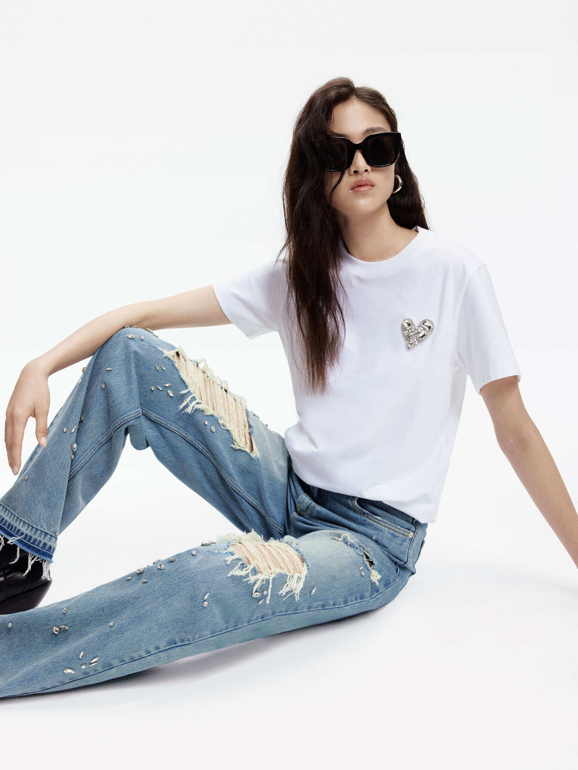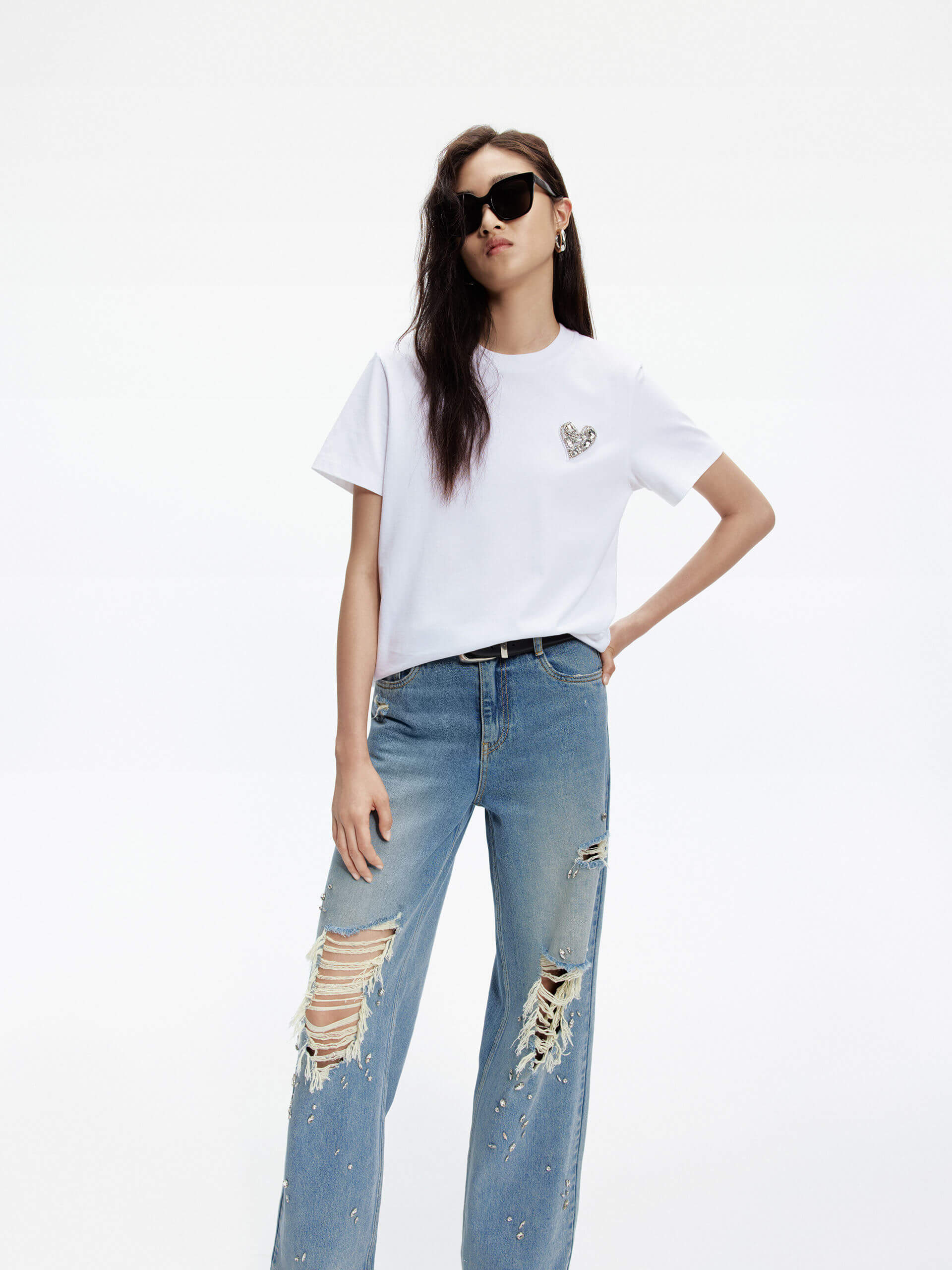 Crafted from pure cotton, experience ultimate comfort. It features a stunning heart-shaped rhinestone design that adds a touch of glamour. Its classic cut makes it versatile and easy to pair with any outfit.