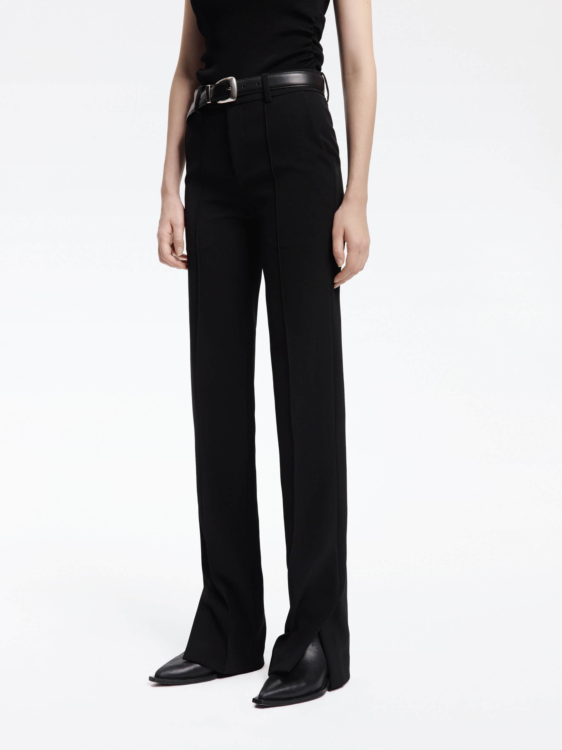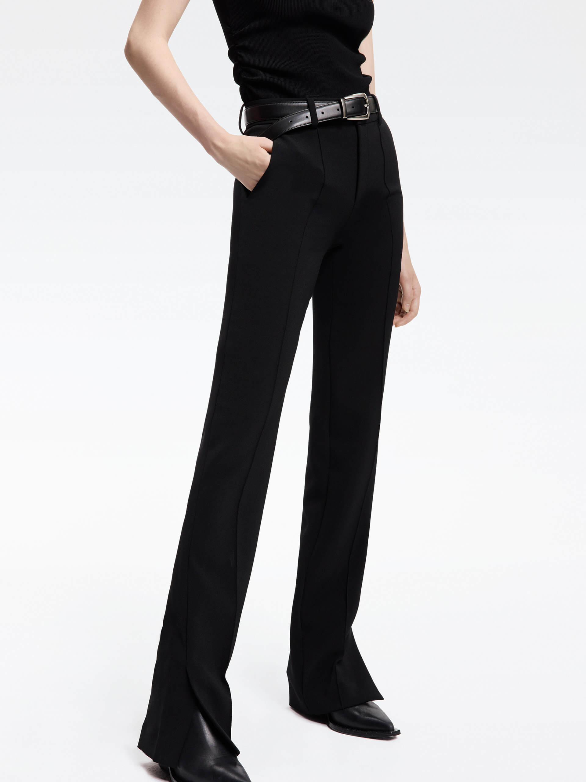 These pants are calling for a slouchy business day. Crafted from well-made fabric, they are shaped with a streamlined straight silhouette with a fully smooth and comfy texture. The hem slits add a touch of sophistication. Perfect for the effortless professional look.