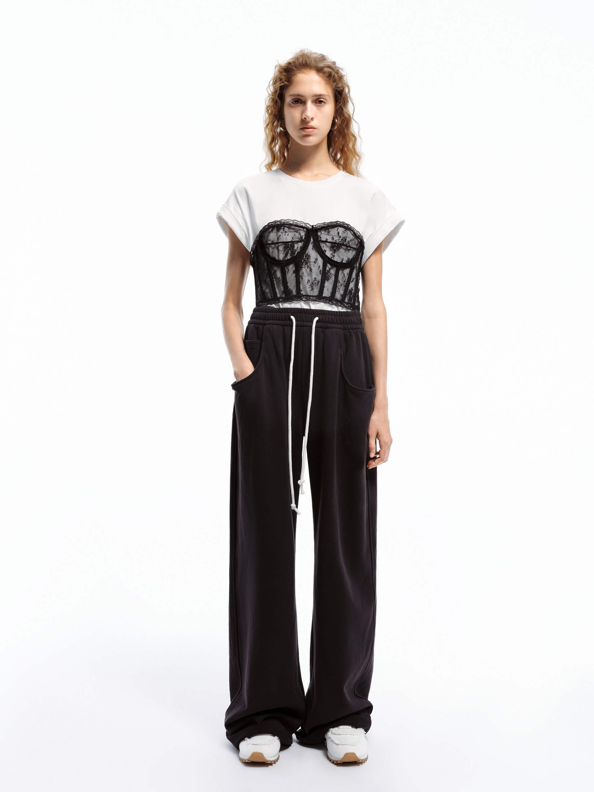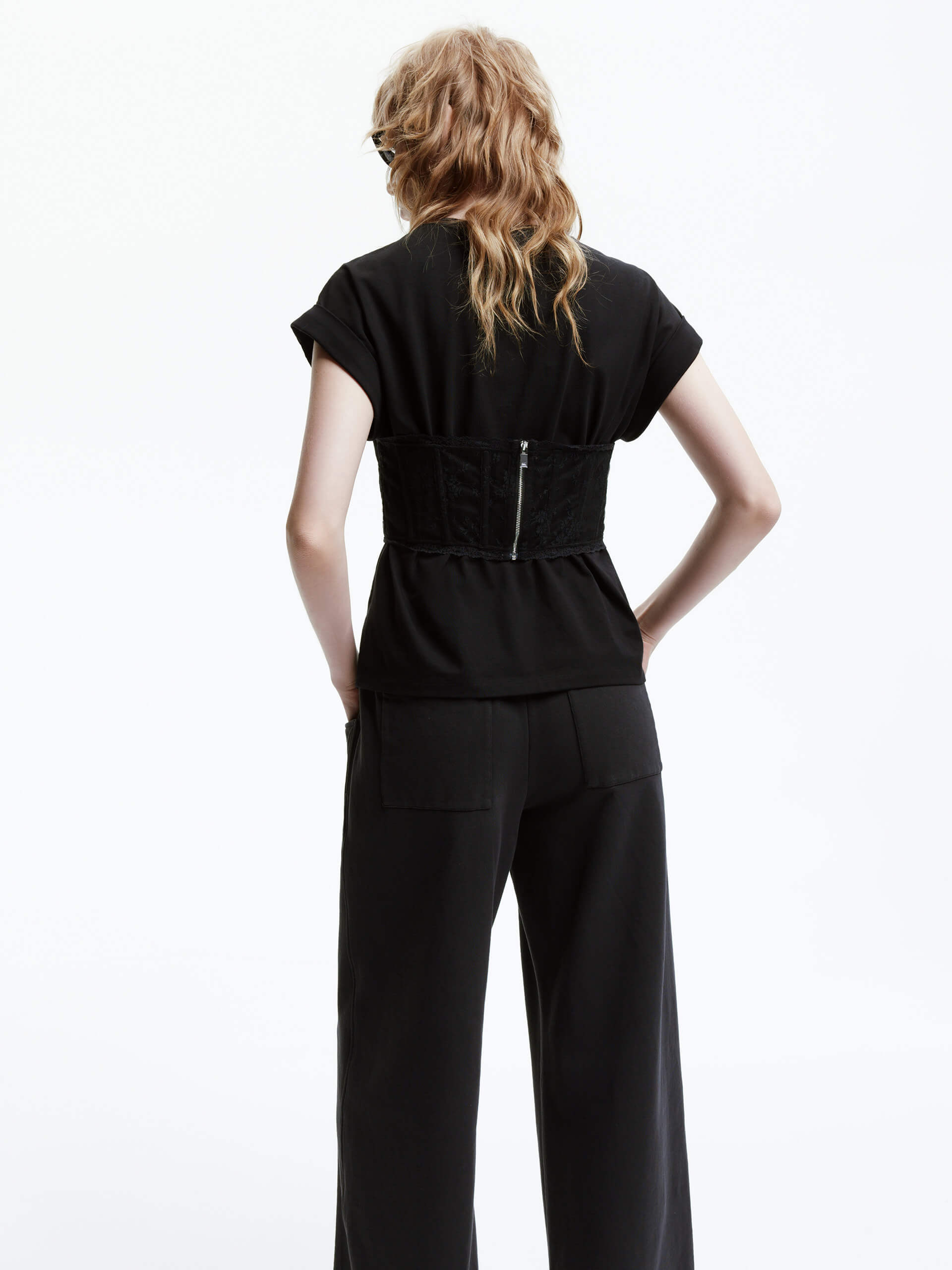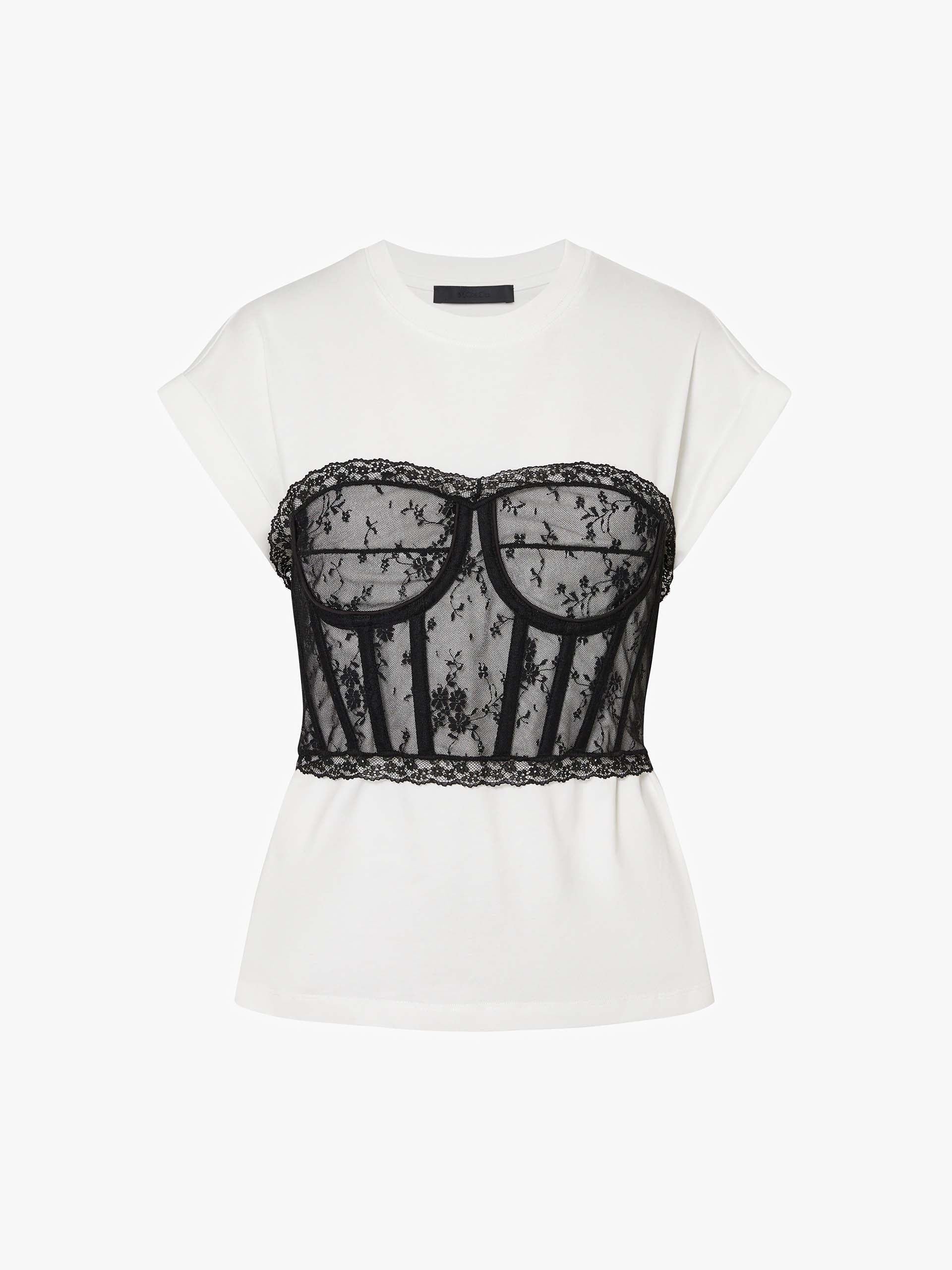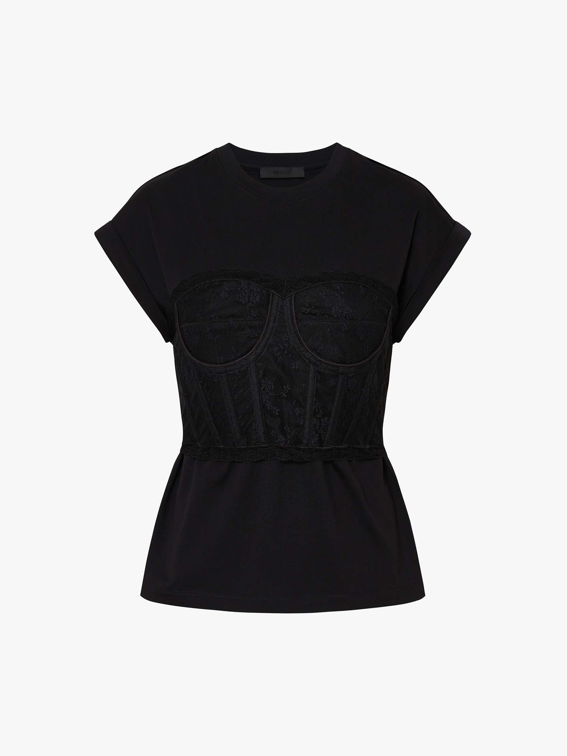 Quality T-shirts have been a cornerstone of the MO&Co collection since day one. A simple essential, this tee is made from cotton with a soft jersey quality and comes in a classic white and black hue that'll slot seamlessly into your wardrobe. It has a fitting cut and a removable black lace bra for a statement look.