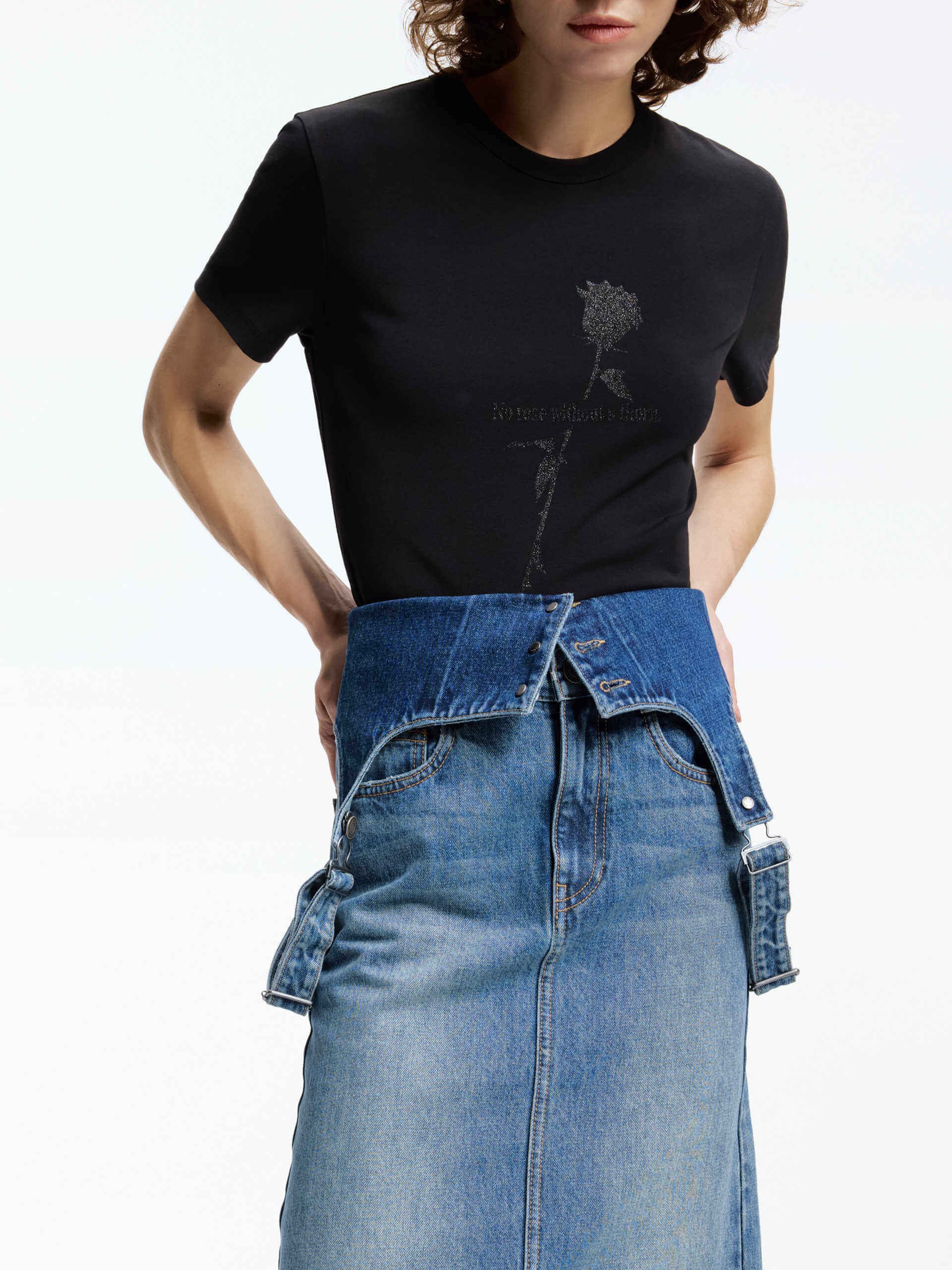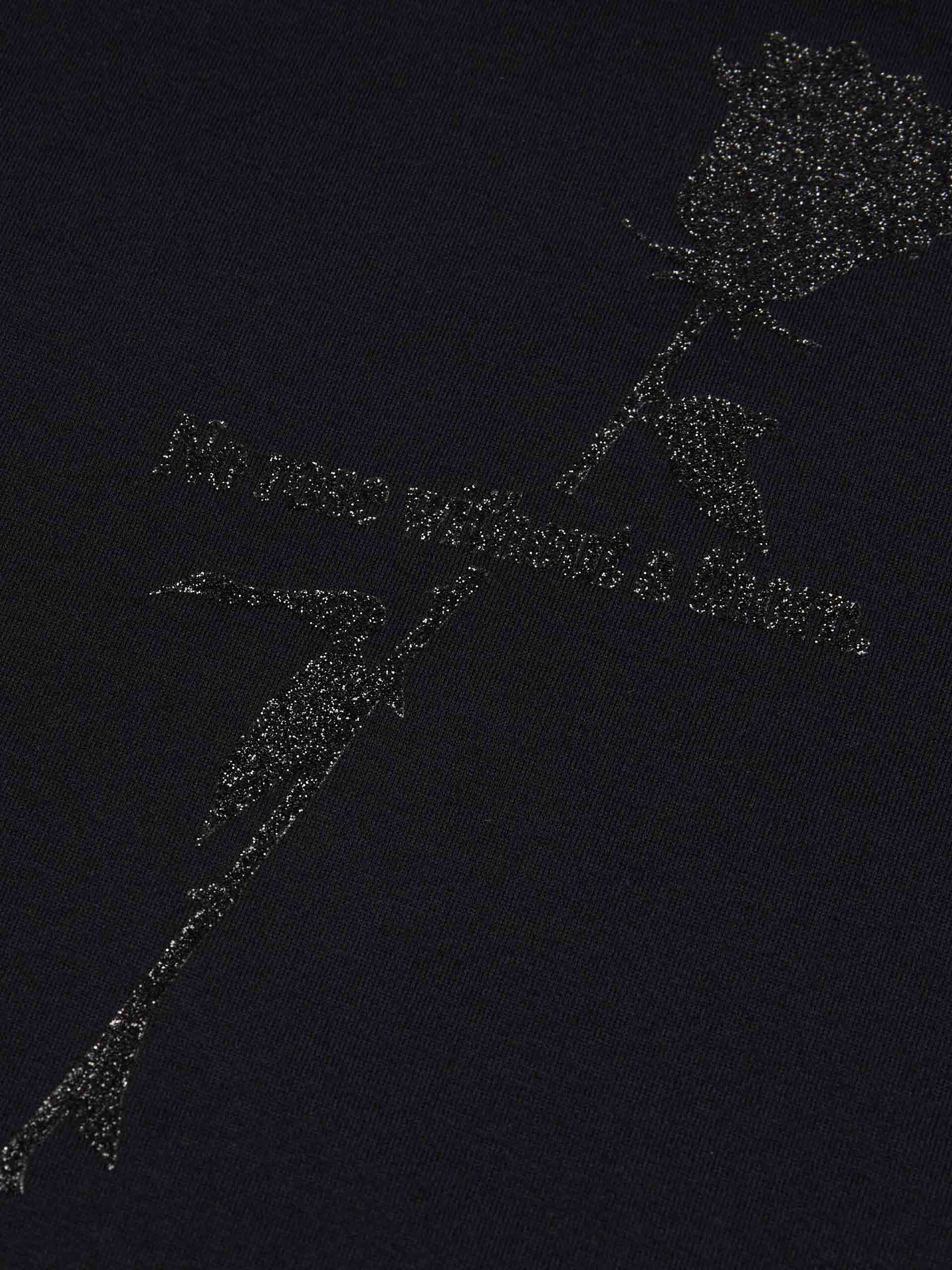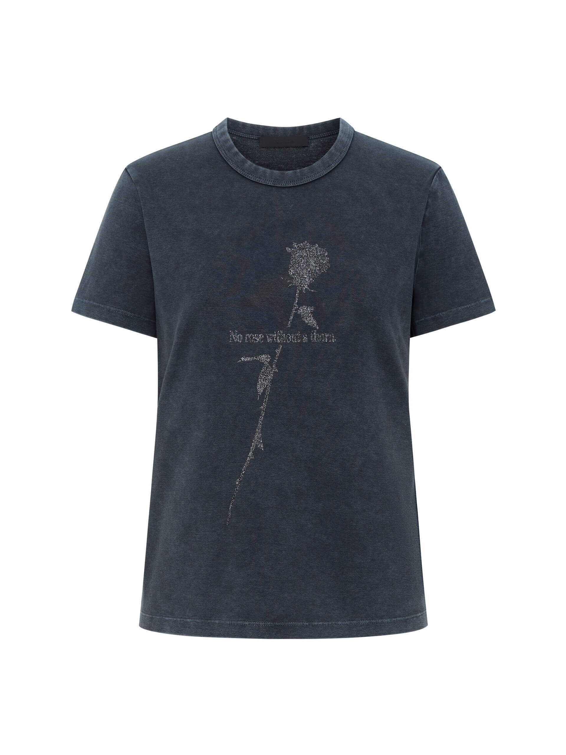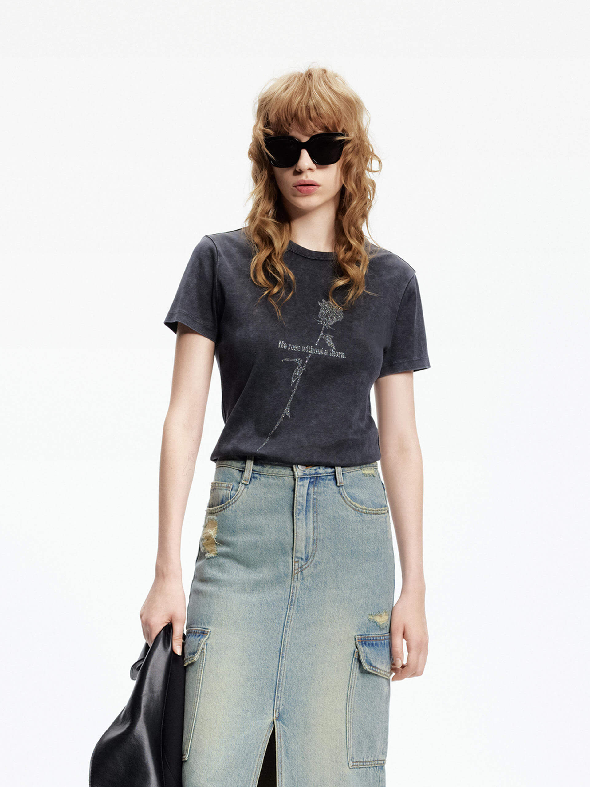 This staple tee is crafted from premium cotton jersey and shaped for a neat fit that has slight definition. The front rose and letter print with glitter details, gray hue with vintage frosted design. Pair it with a denim skirt or casual pants to create a fashionable look with a simple T-shirt.