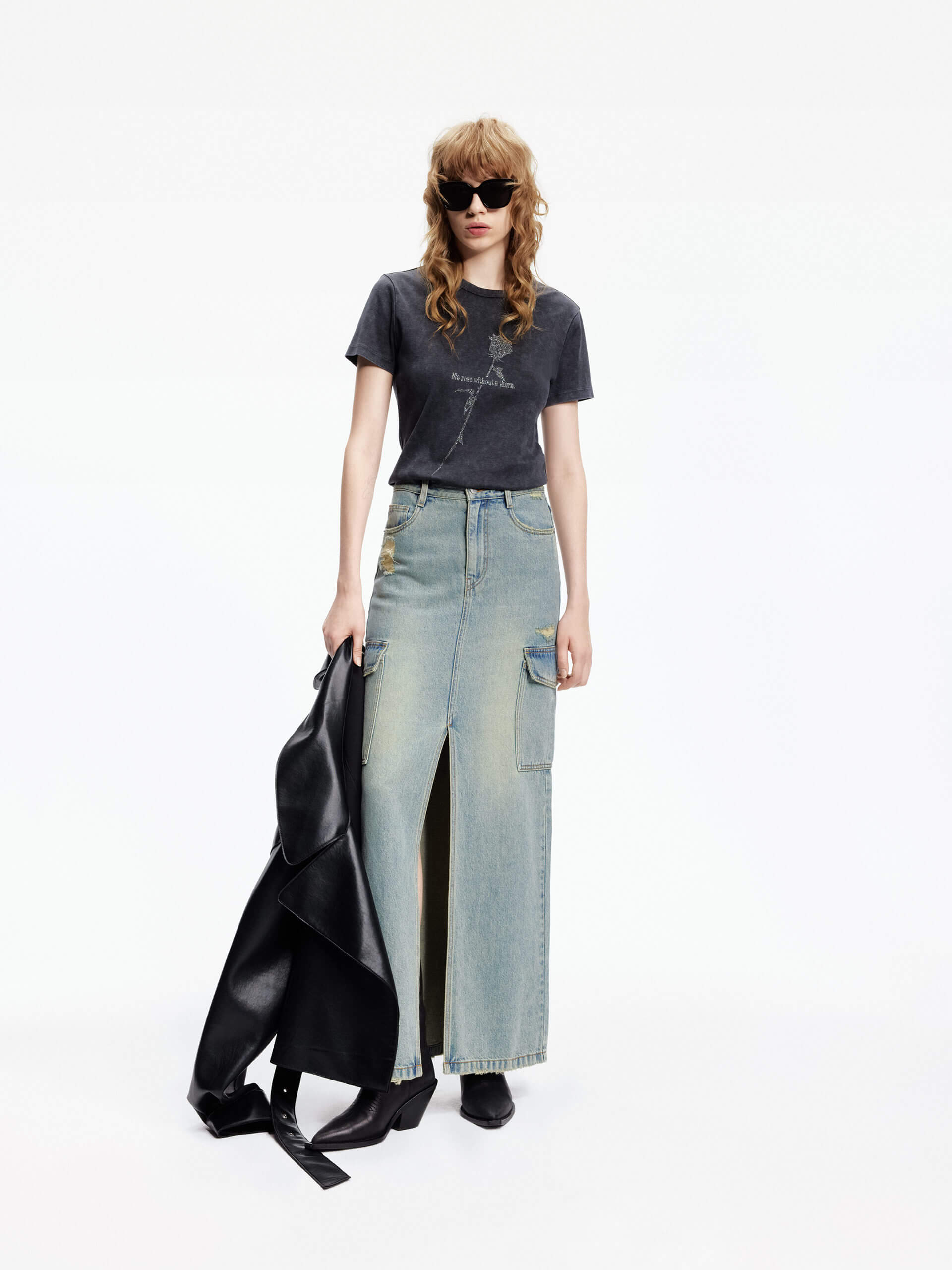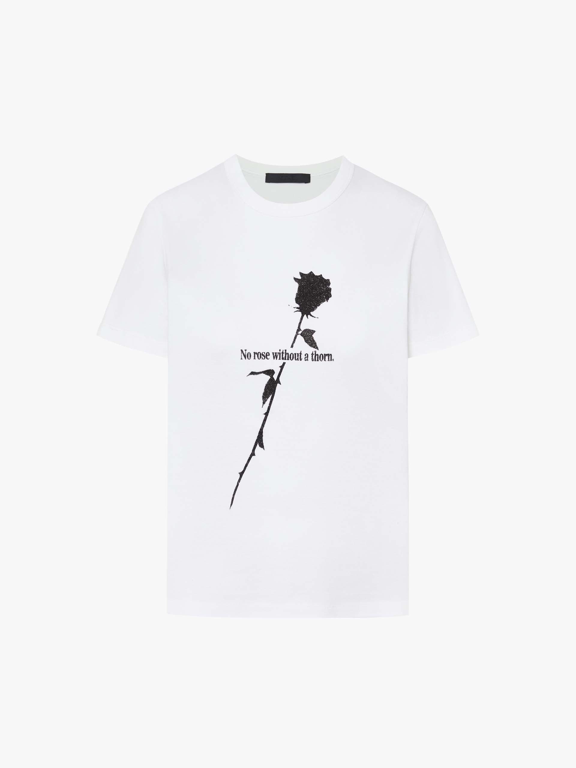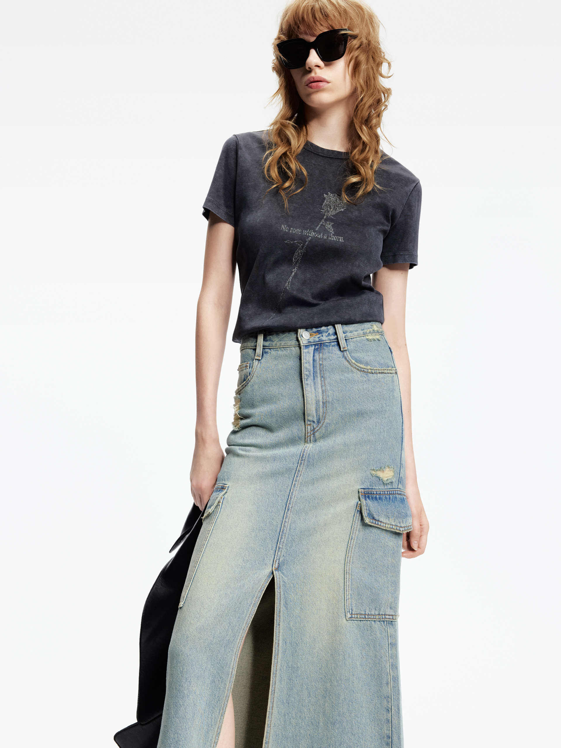 This staple tee is crafted from premium cotton jersey and shaped for a neat fit that has slight definition. The front rose and letter print with glitter details, gray hue with vintage frosted design. Pair it with a denim skirt or casual pants to create a fashionable look with a simple T-shirt.