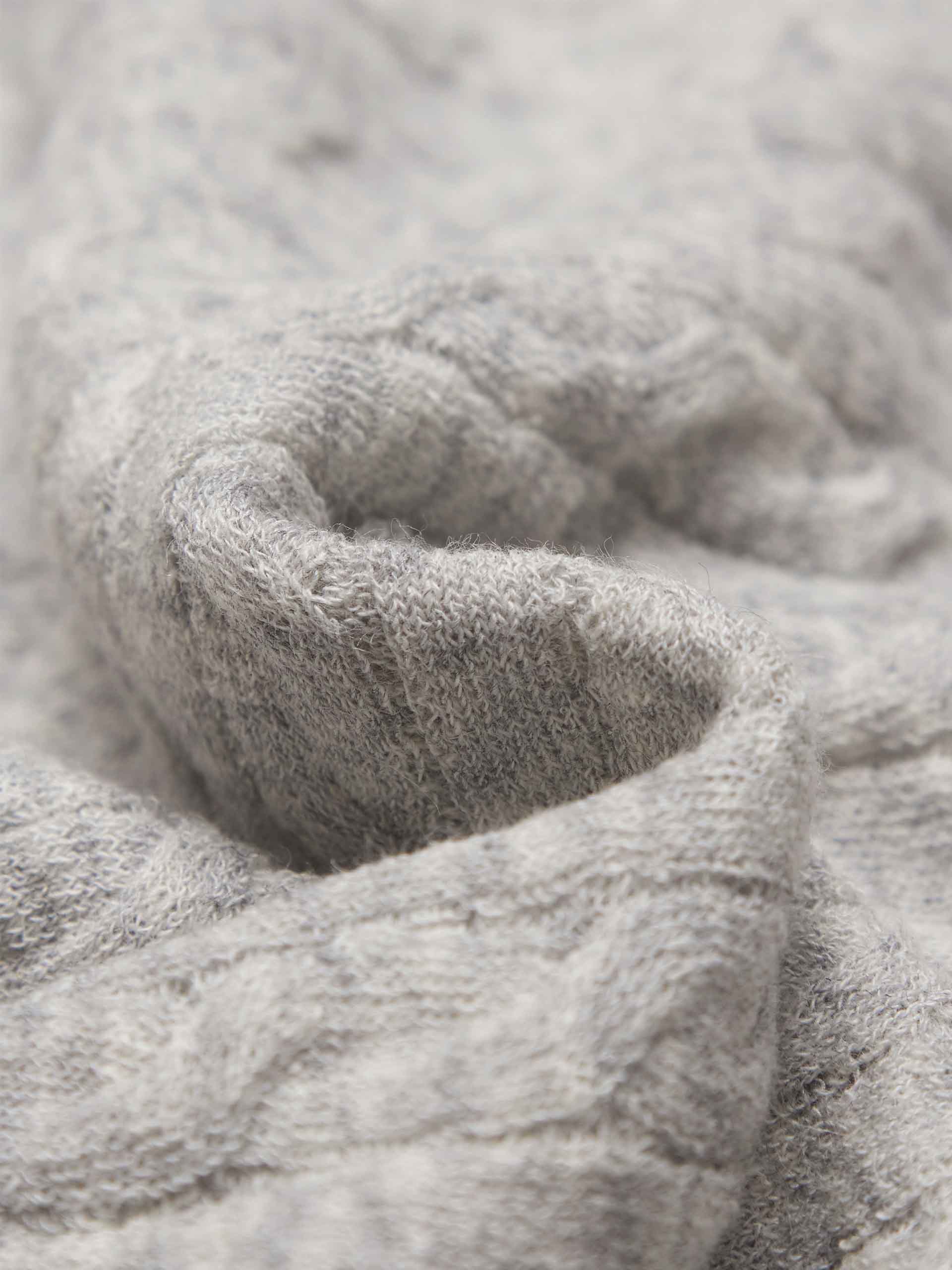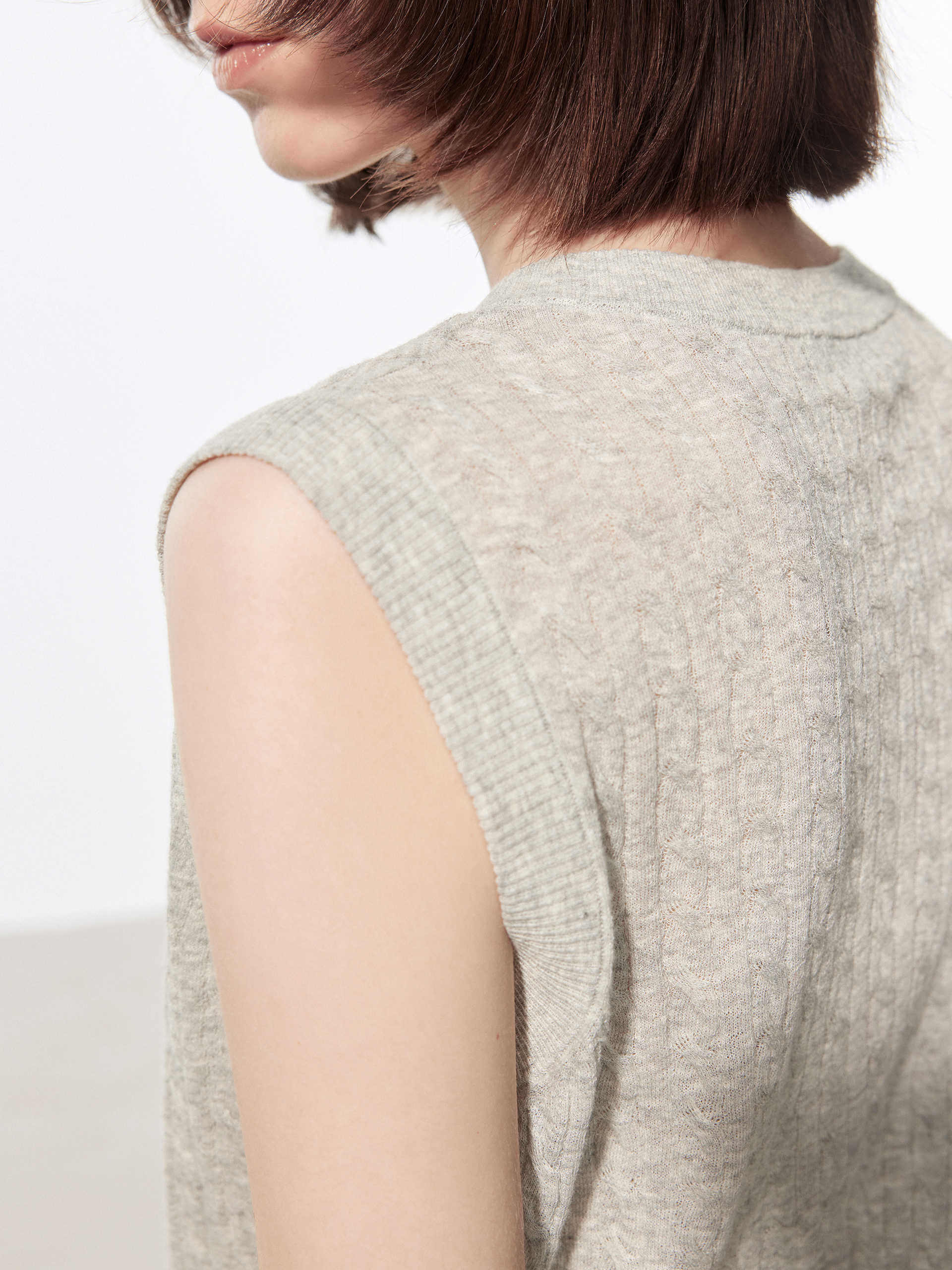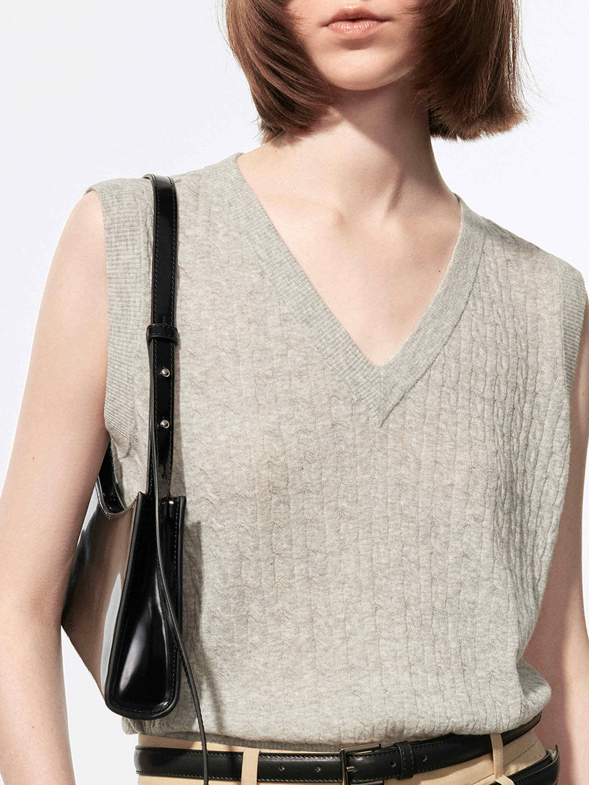 - V-neckline, cable knit textured