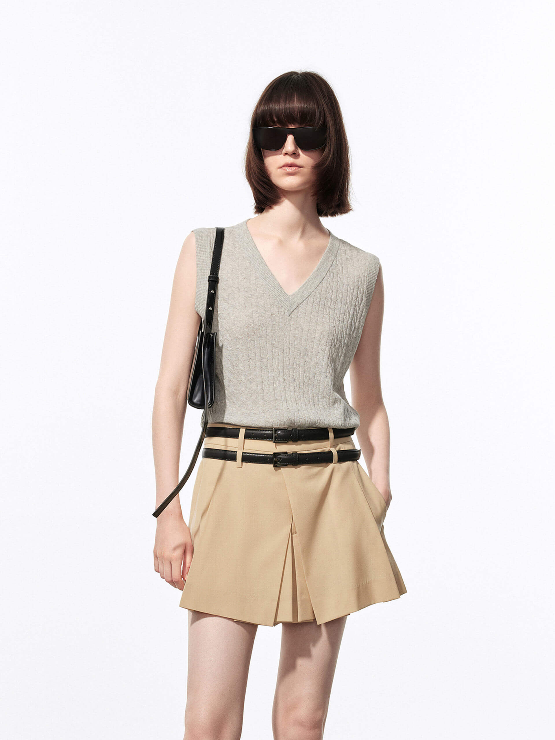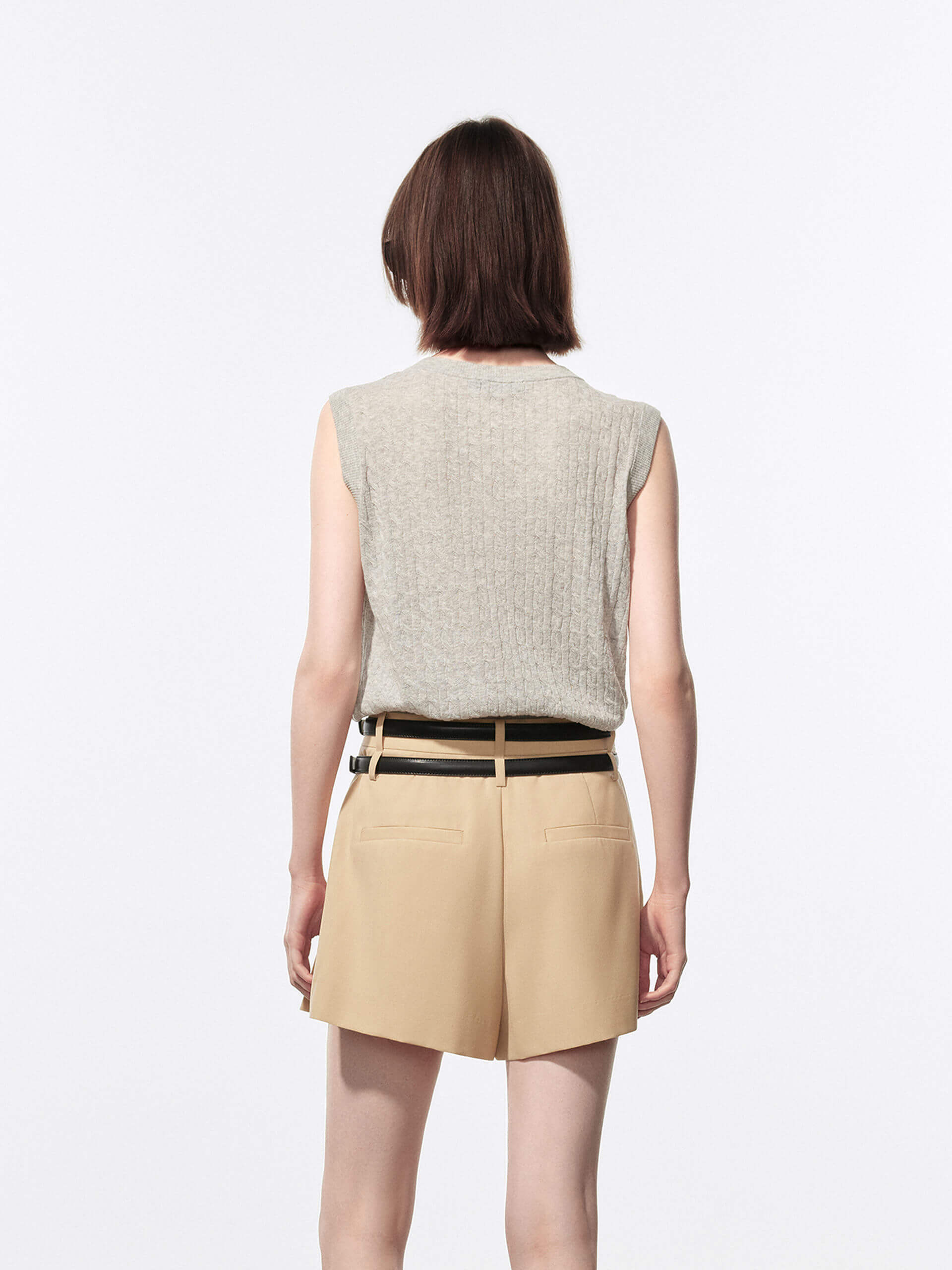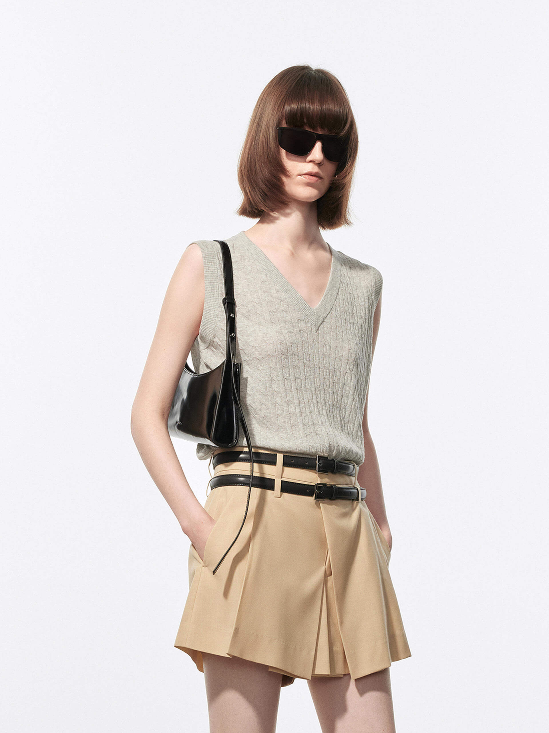 Introducing our knitted vest, the perfect addition to your wardrobe for a preppy and sophisticated look. Made from a breathable cotton and linen blend, it's perfect for transitioning from summer to fall. The v-neckline adds a touch of elegance and sophistication, while the cable knit texture offers a cozy and casual feel. Pair it with our pleated skirt for a preppy look.