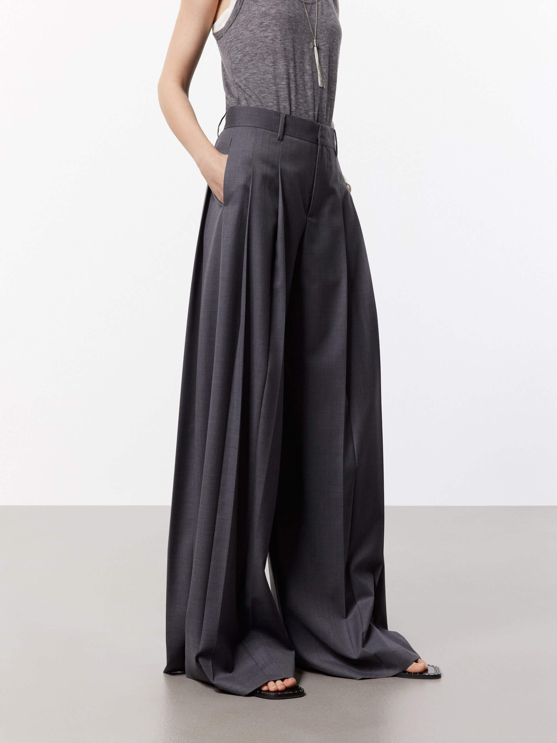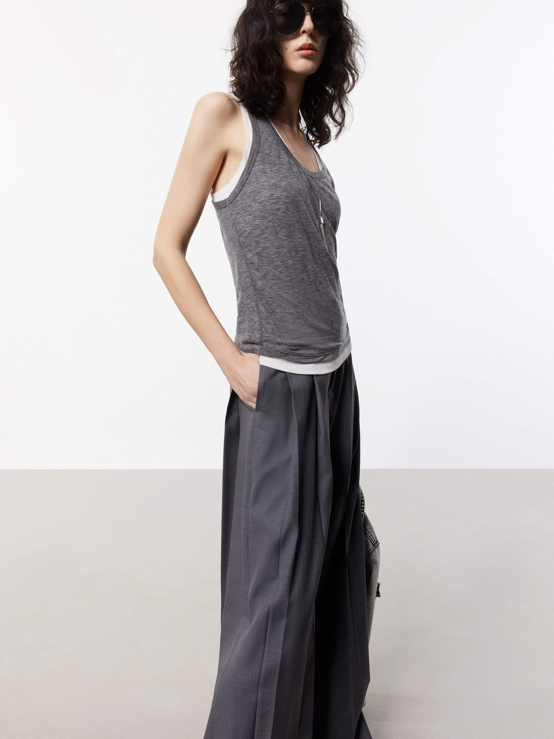 These modern pants are crafted from a soft wool blend fabric for extra breathability and warmth, tailored with side roomy pleats and sharp creases, offering a sense of sophistication and slouch to the traditional straight-leg silhouette. Pair with our tank for a chic or casual look.