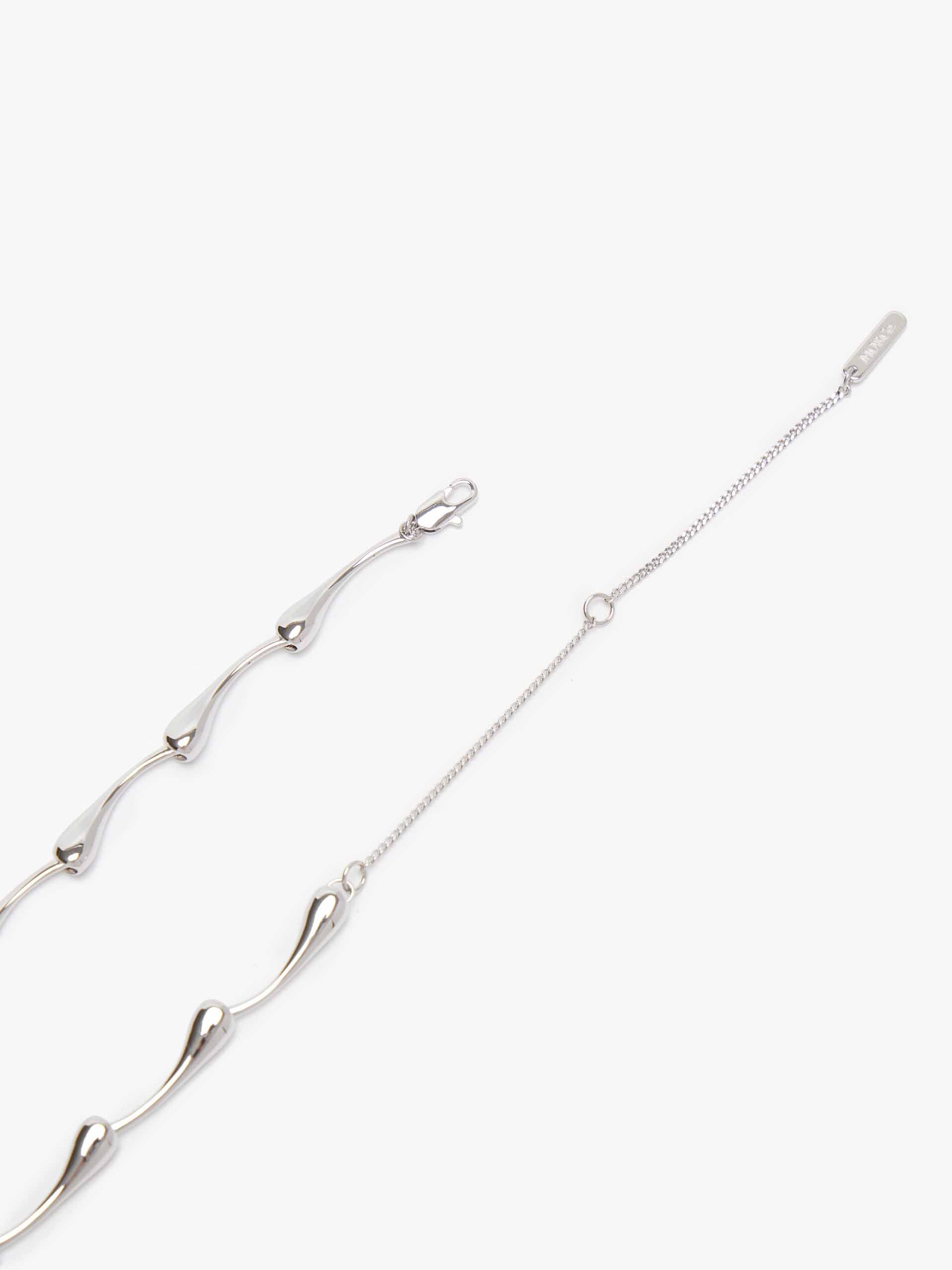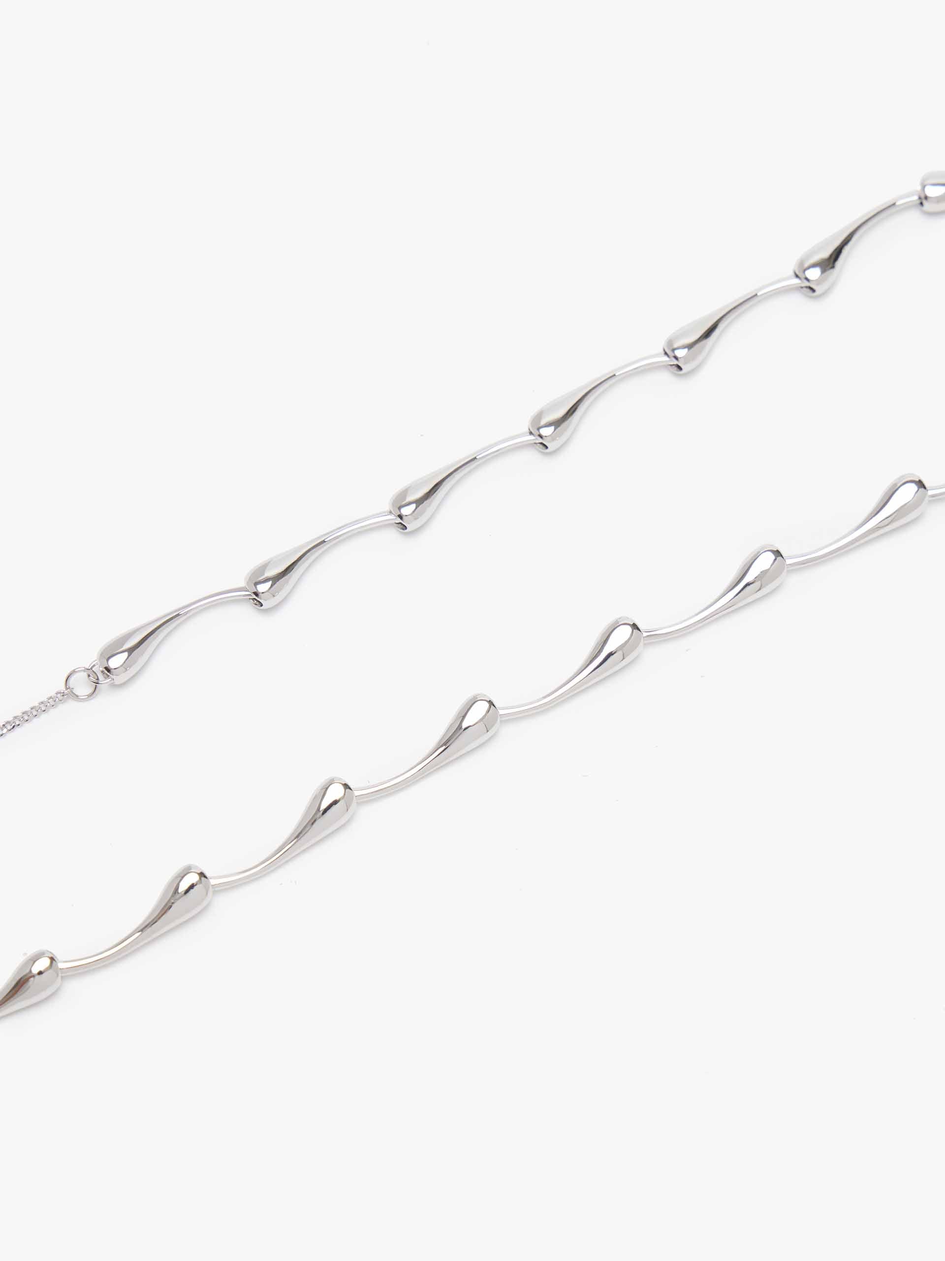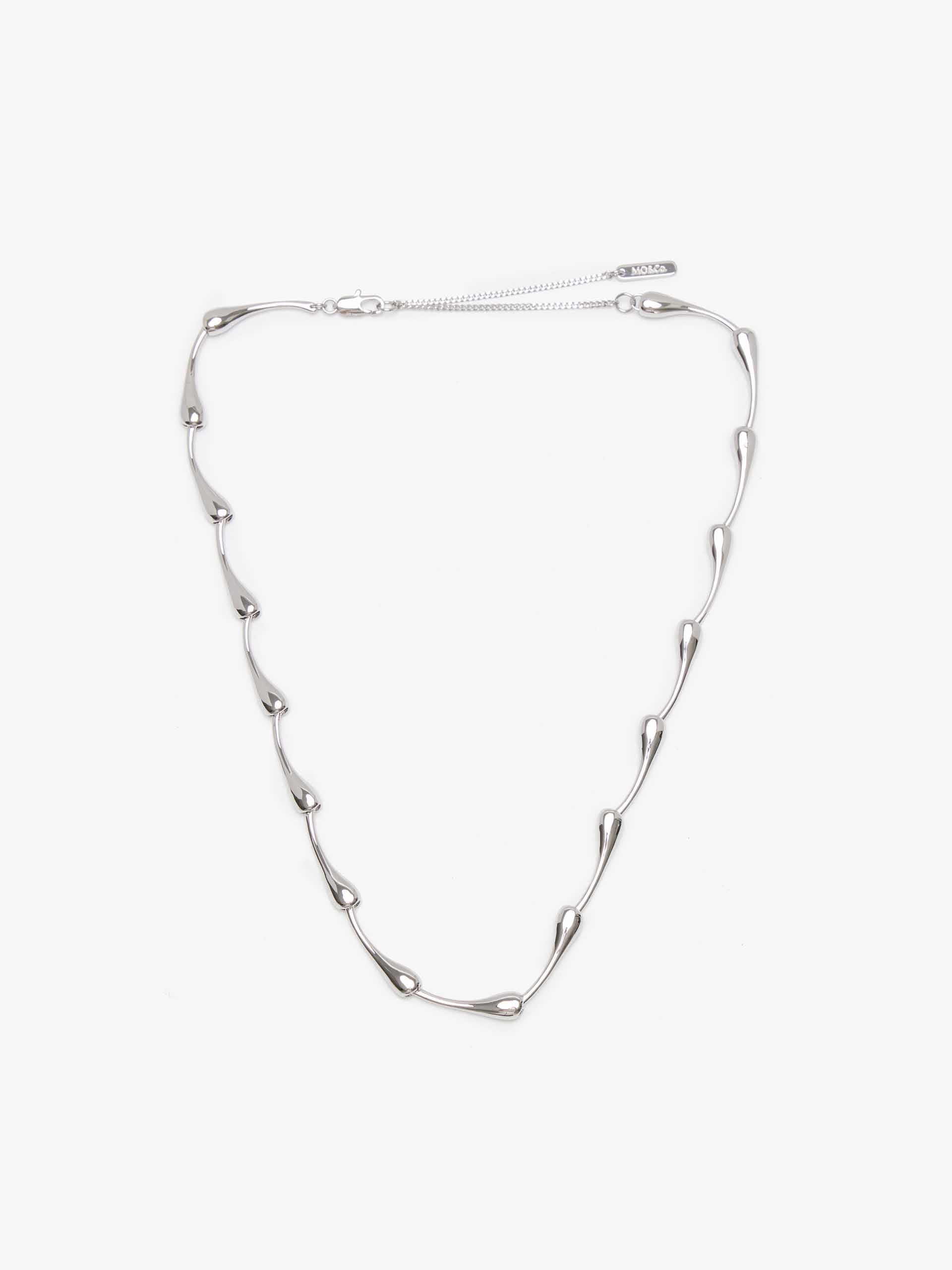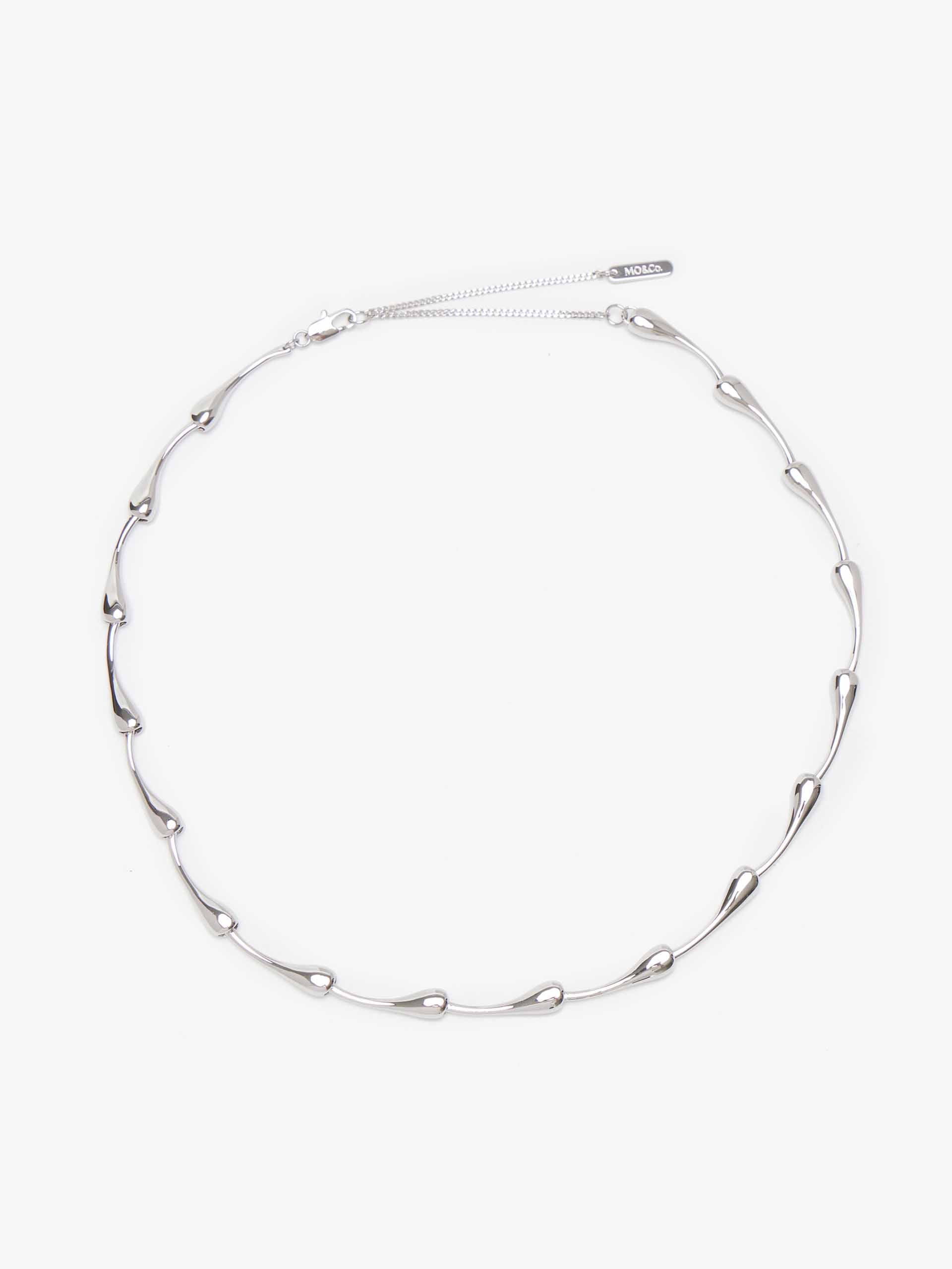 Crafted in radiant silver, this necklace features an elegant "Bamboo" link chain, where each segment mimics the graceful, tapered silhouette of bamboo stalks. Suspended from it is a singular, fluid teardrop pendant, its smooth contours catching the light with every movement. The combination of textured chain and polished drop creates a beautiful balance of detail and simplicity.