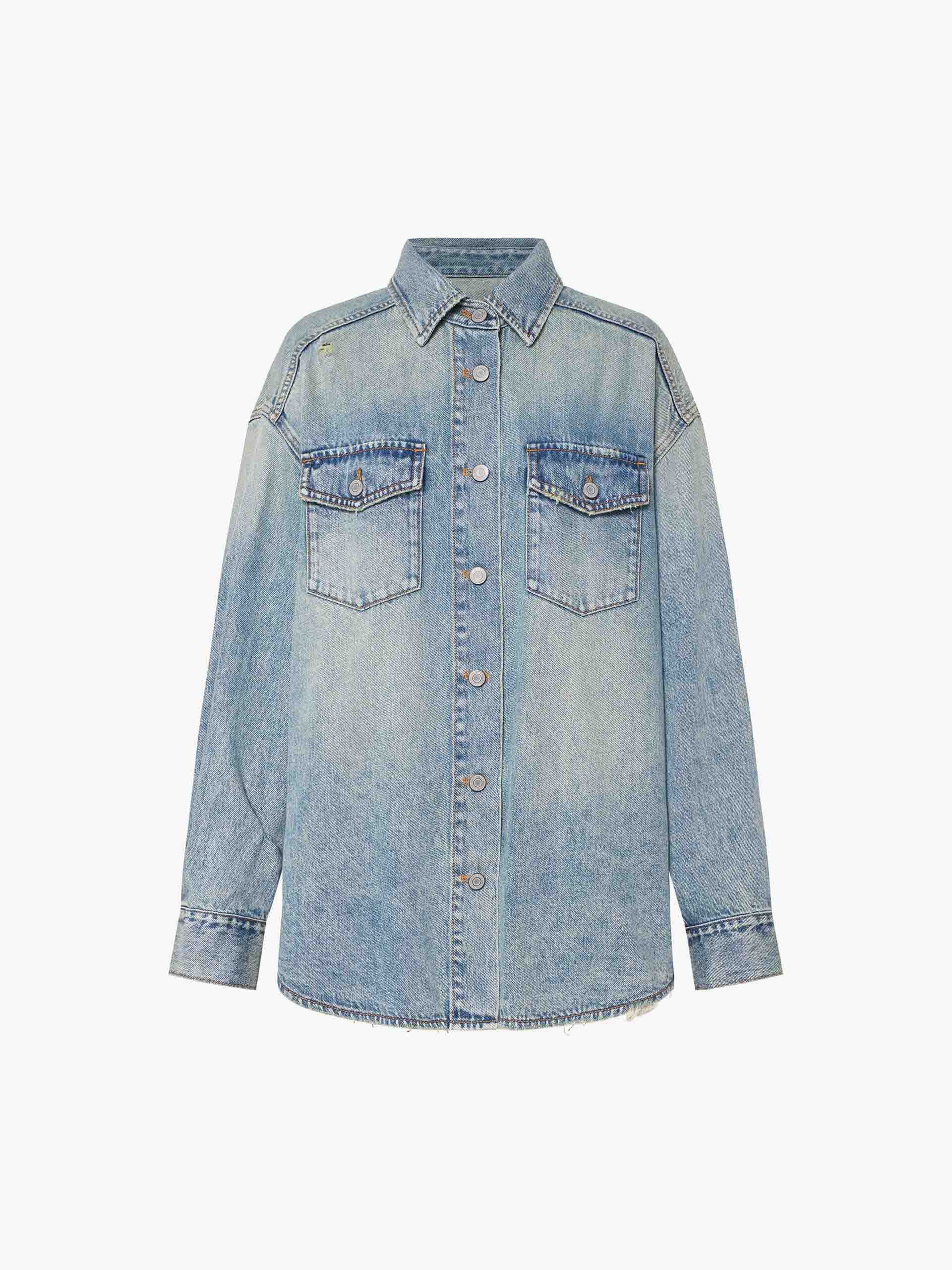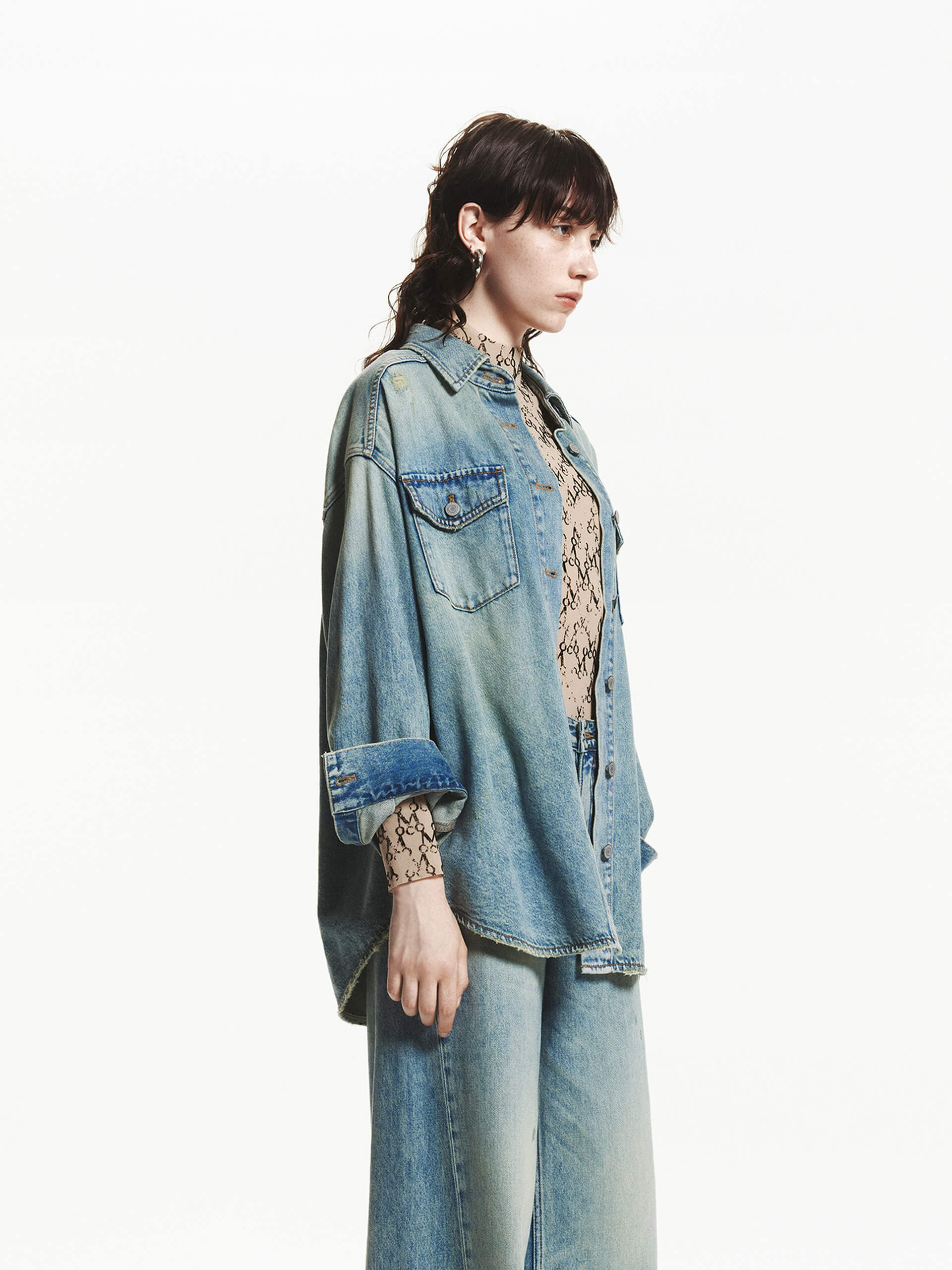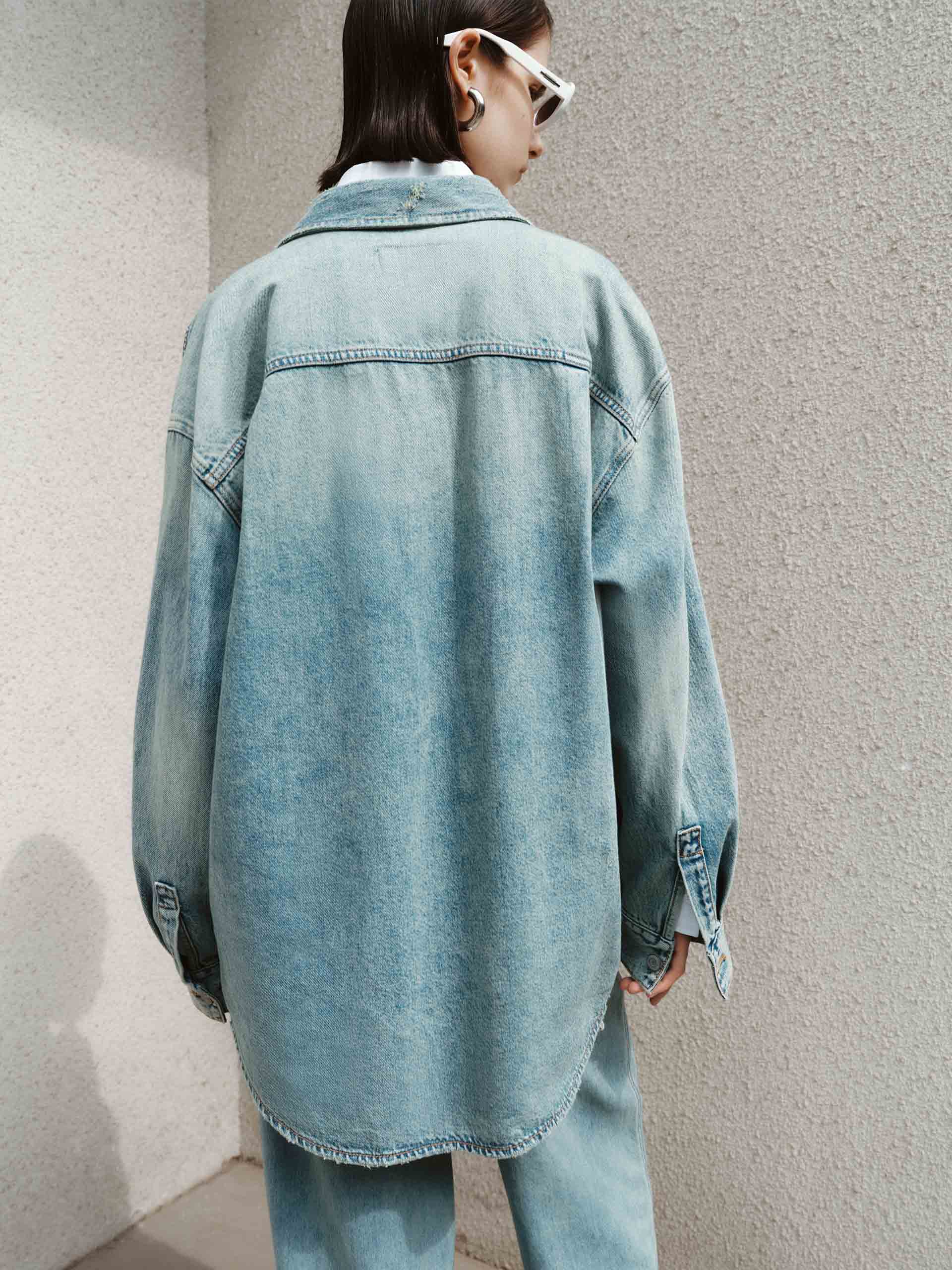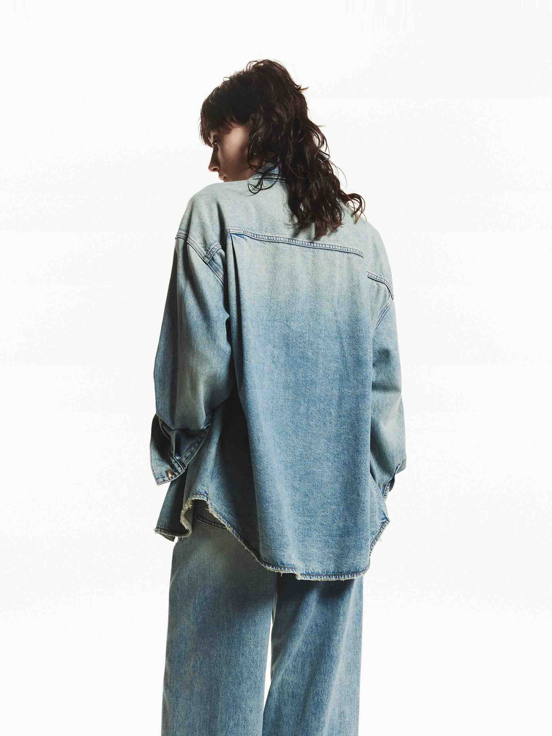 This denim shirt is crafted from organic cotton denim that's washed in a lightly faded blue hue. It's cut in an oversized shape and designed with chest flap pockets and button closures. Wear it with coordinating wide-leg jeans.
