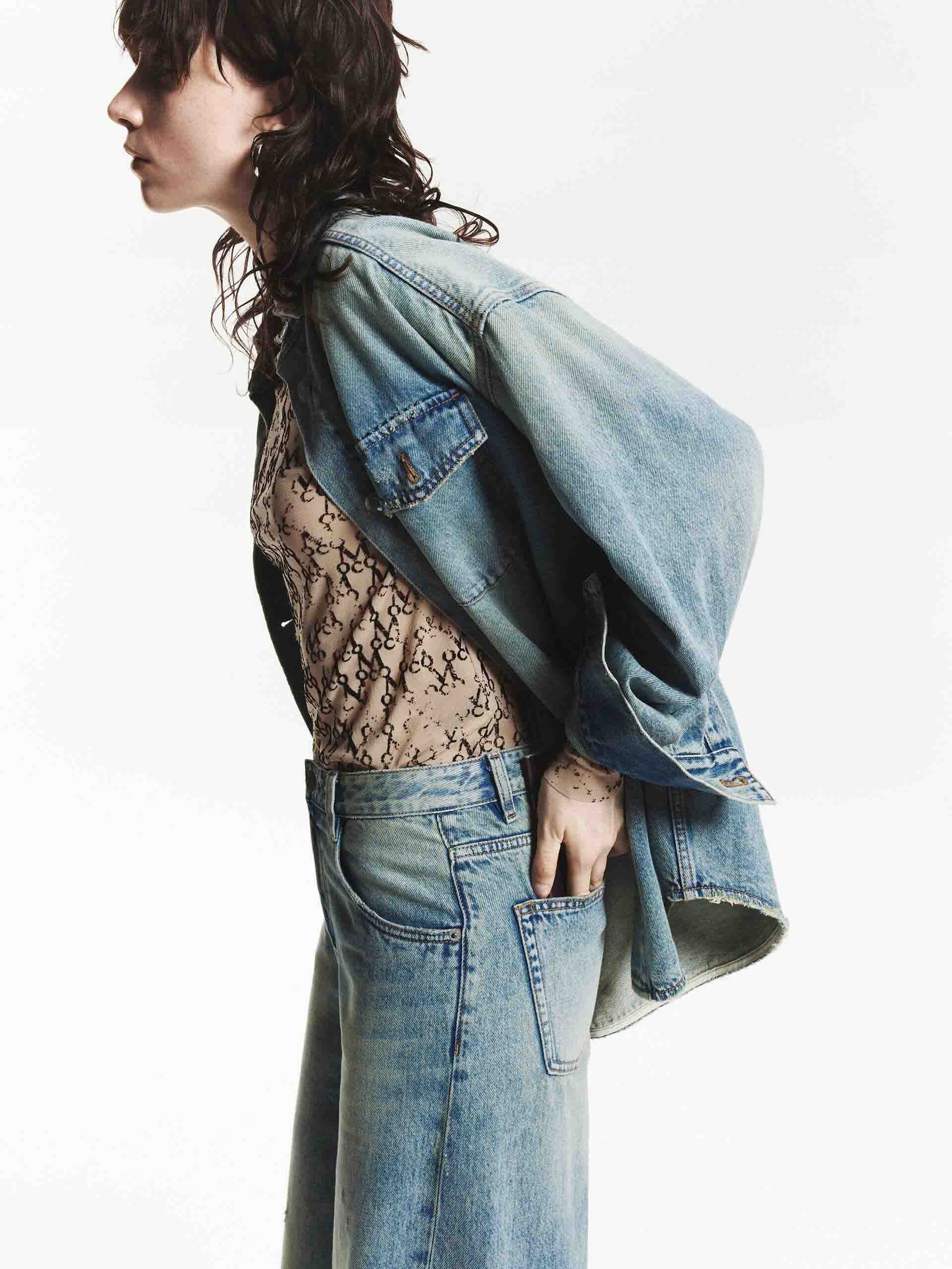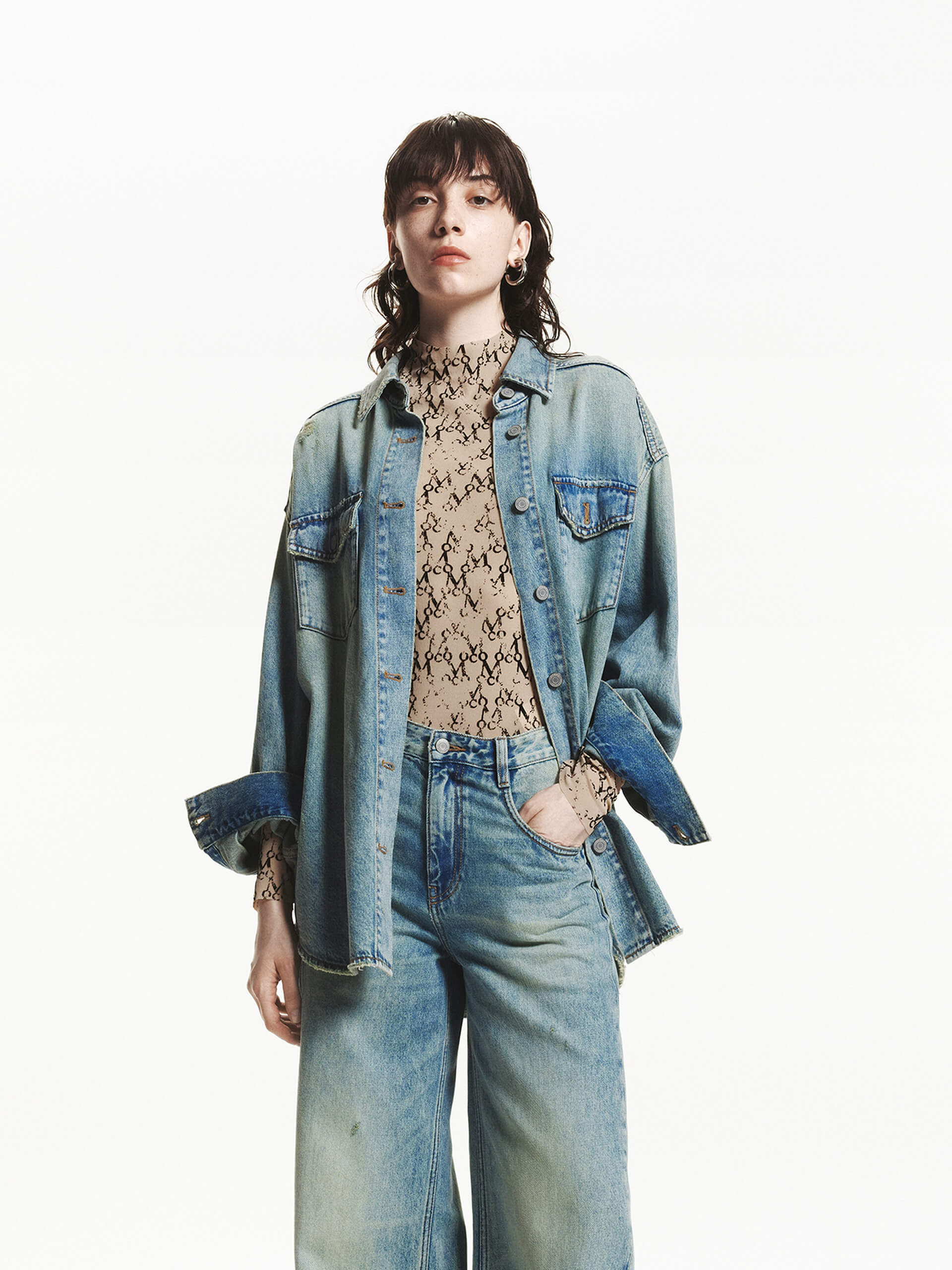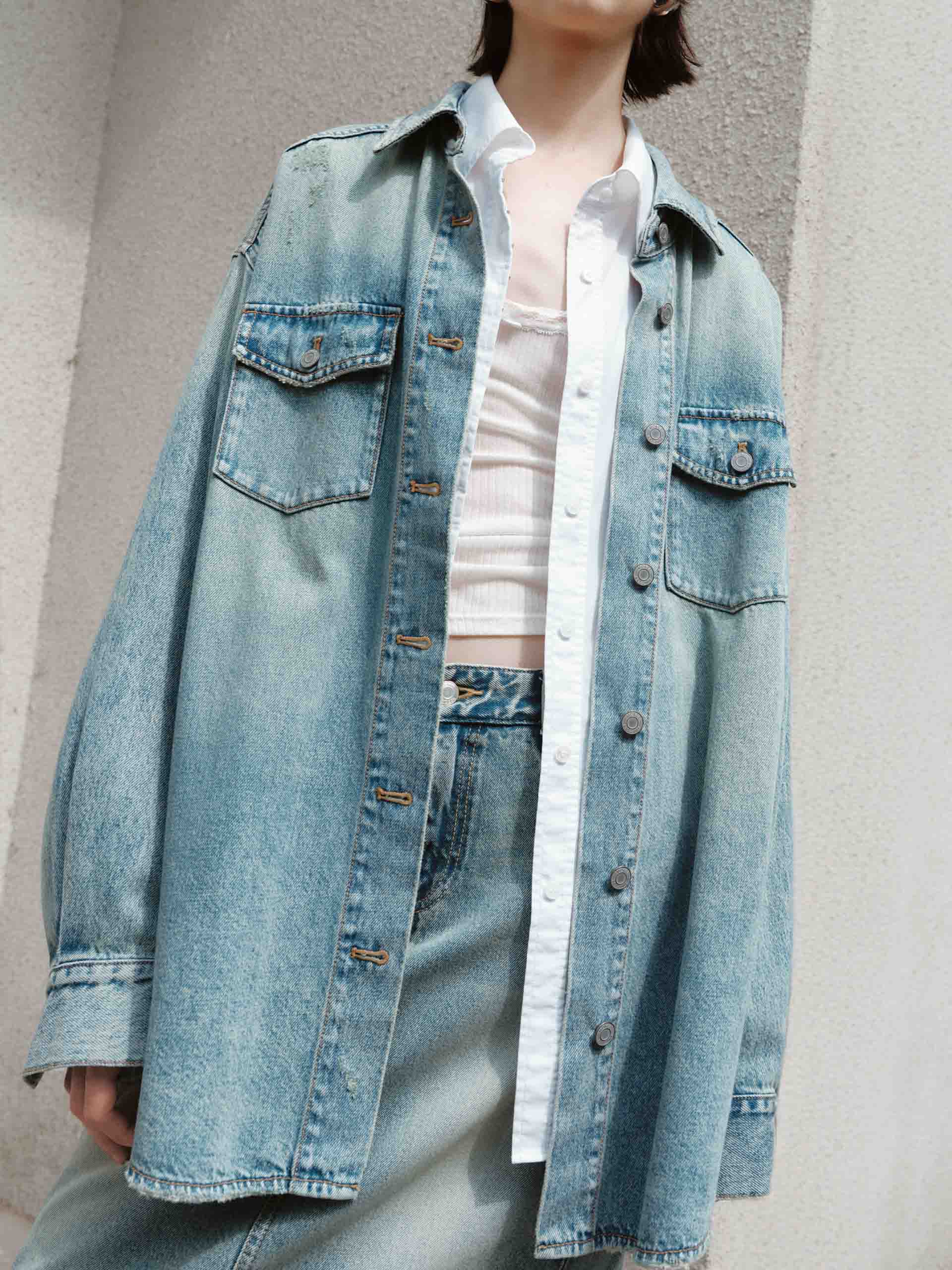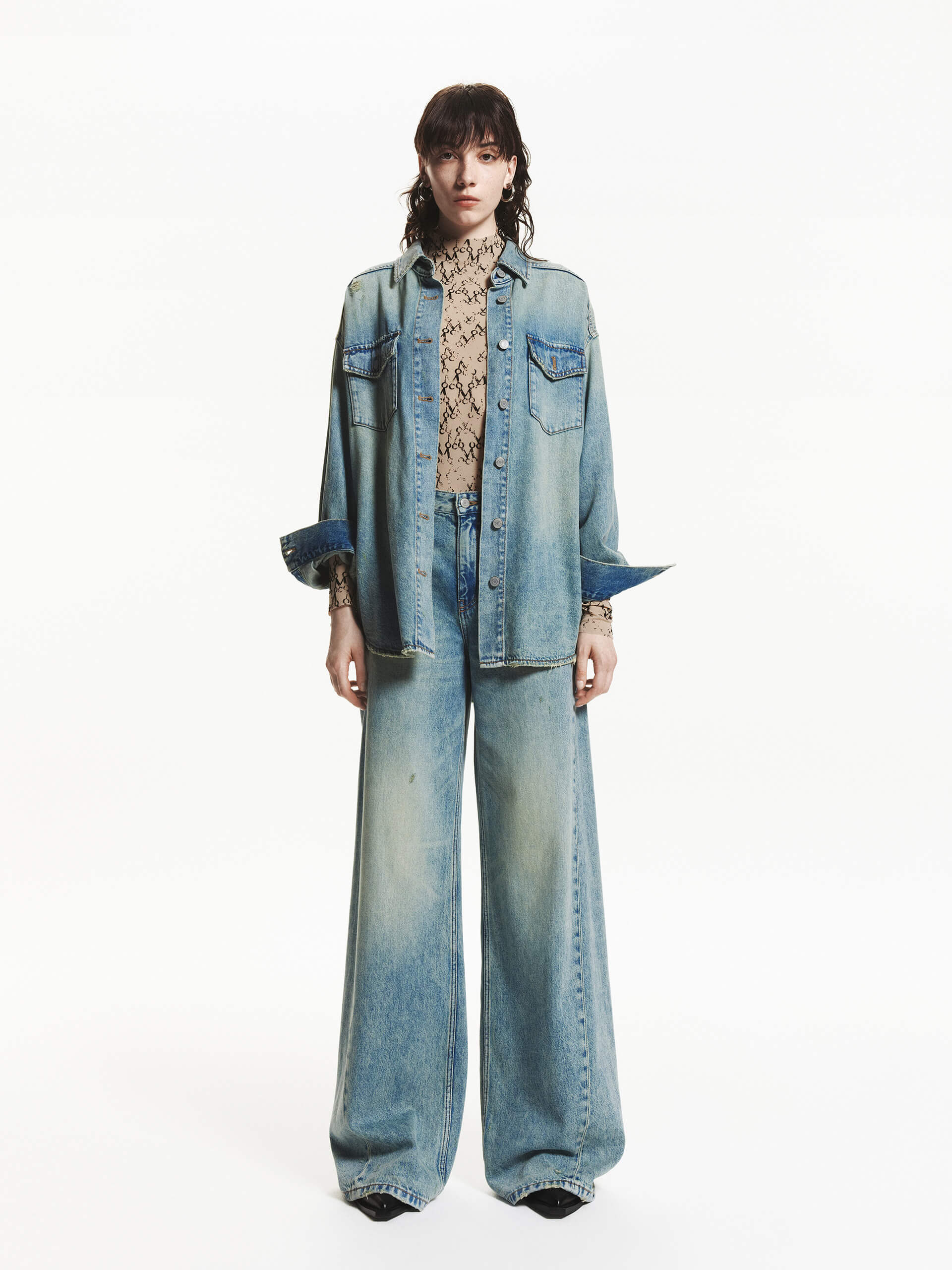 This denim shirt is crafted from organic cotton denim that's washed in a lightly faded blue hue. It's cut in an oversized shape and designed with chest flap pockets and button closures. Wear it with coordinating wide-leg jeans.
