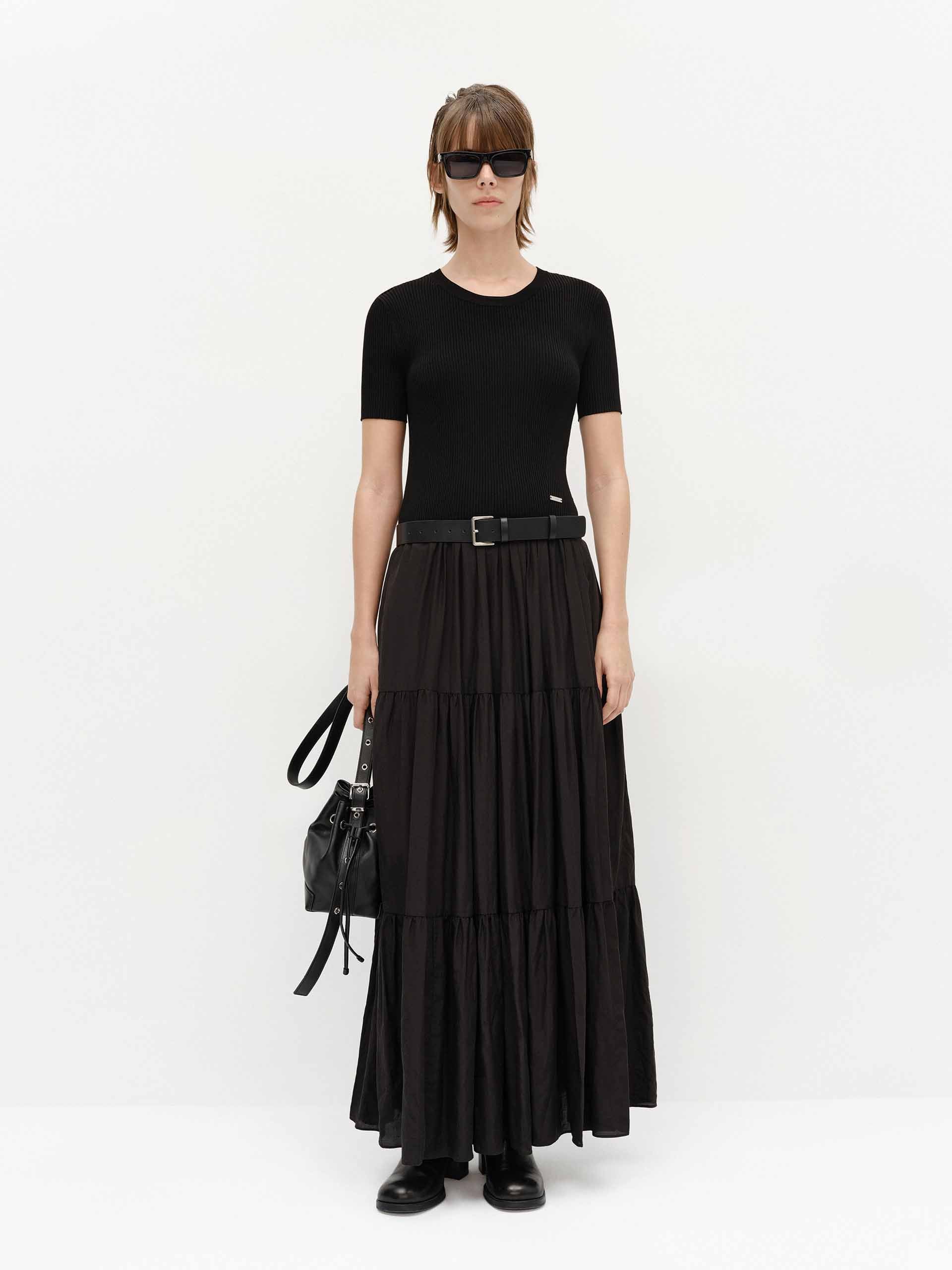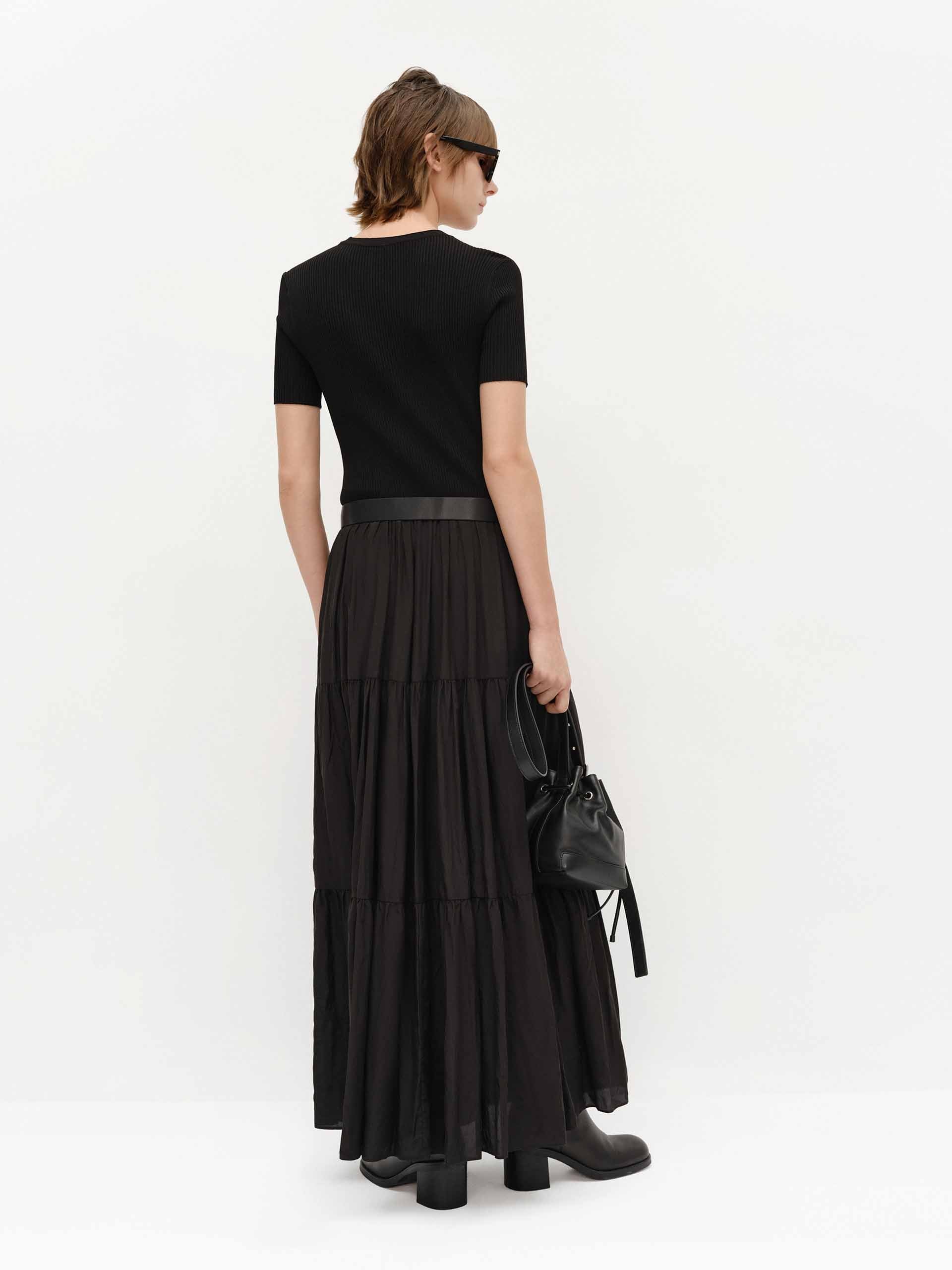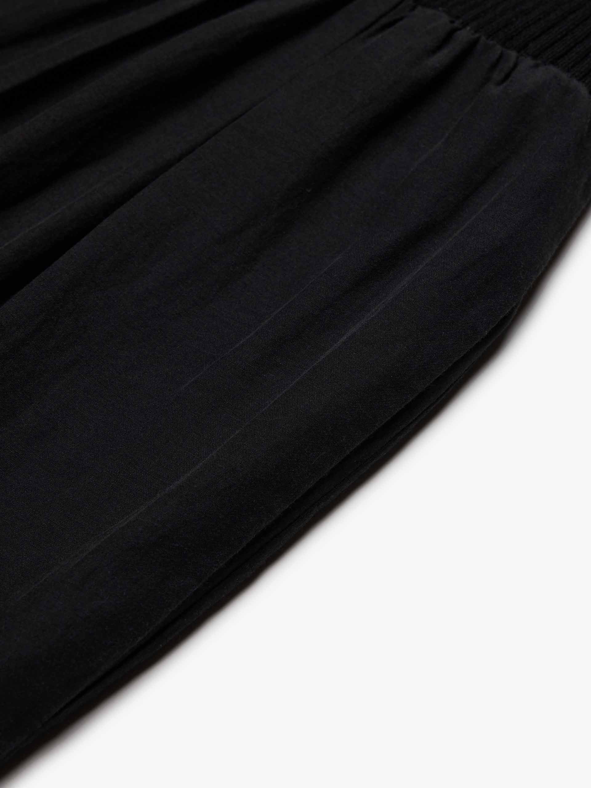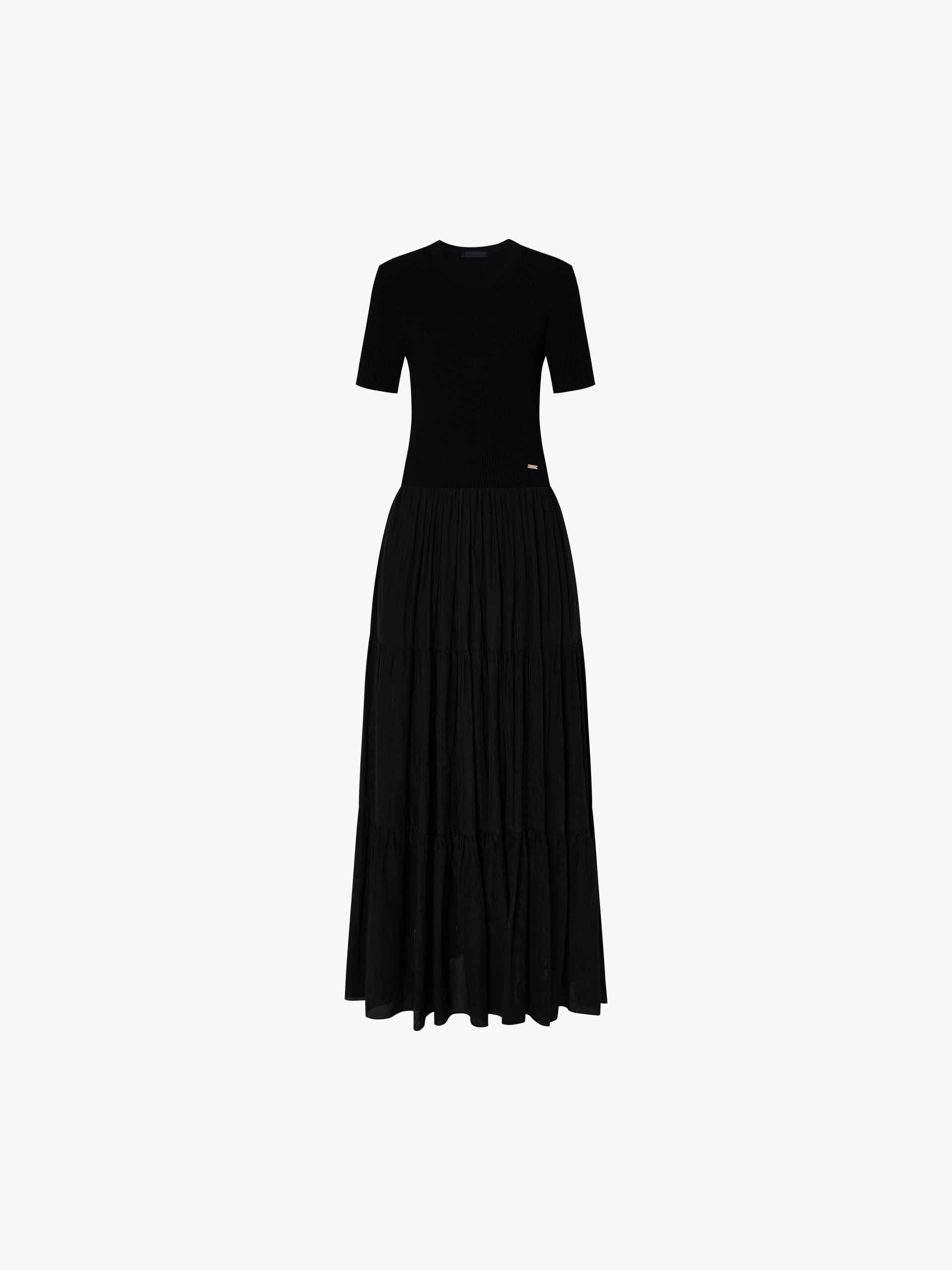 Crafted with refined black panel fabrics, this maxi length dress boasts a pleated skirt and a sleek silhouette. It's designed with a rounded neck and short sleeves.