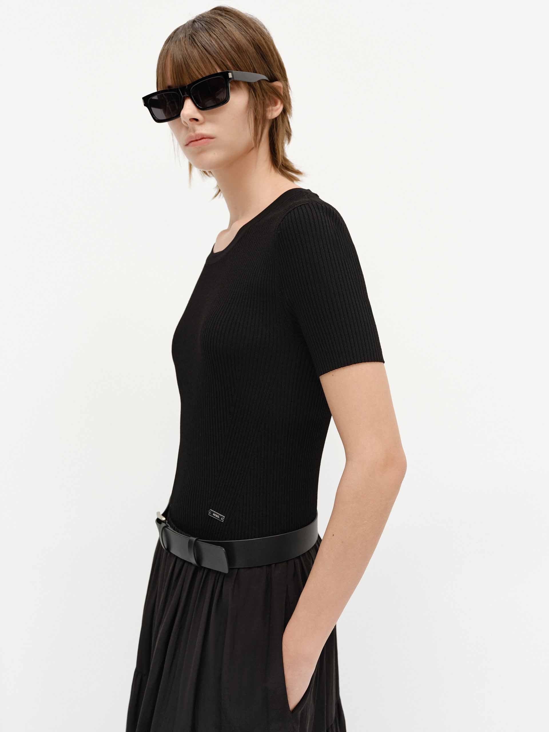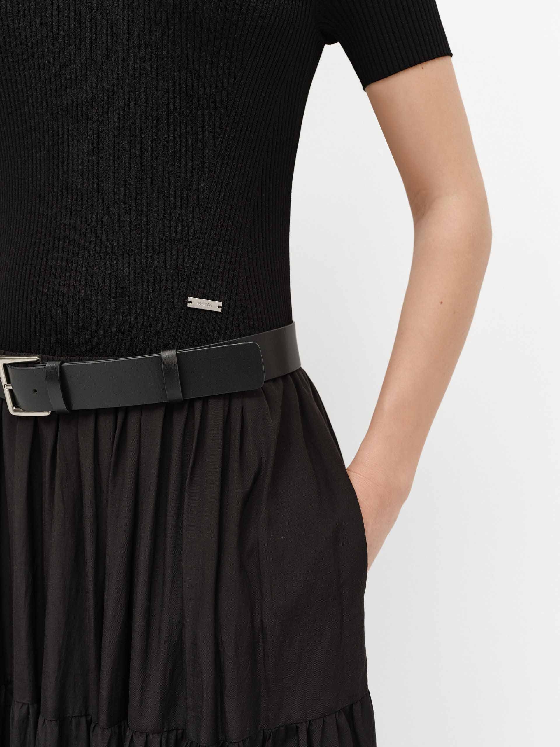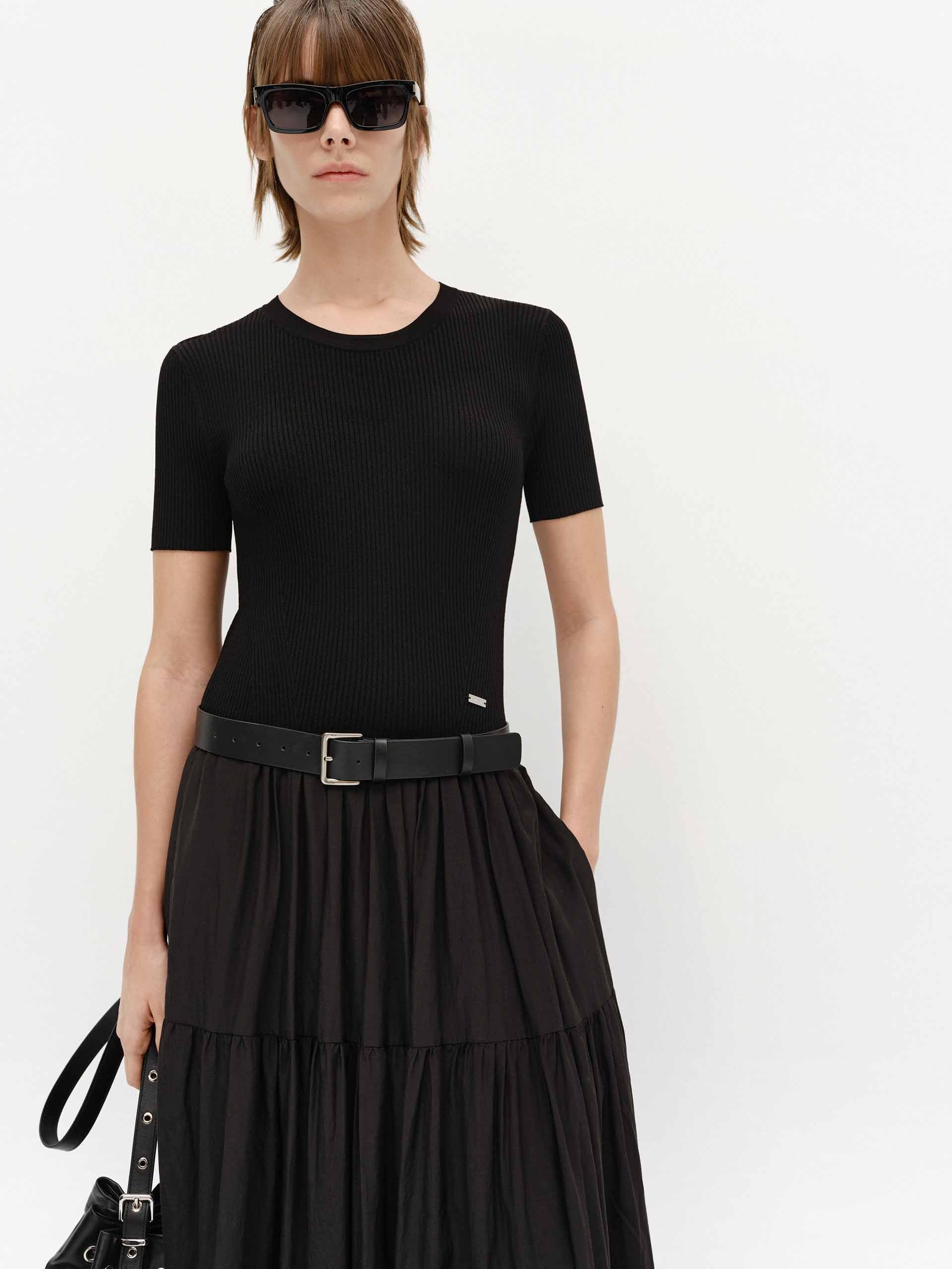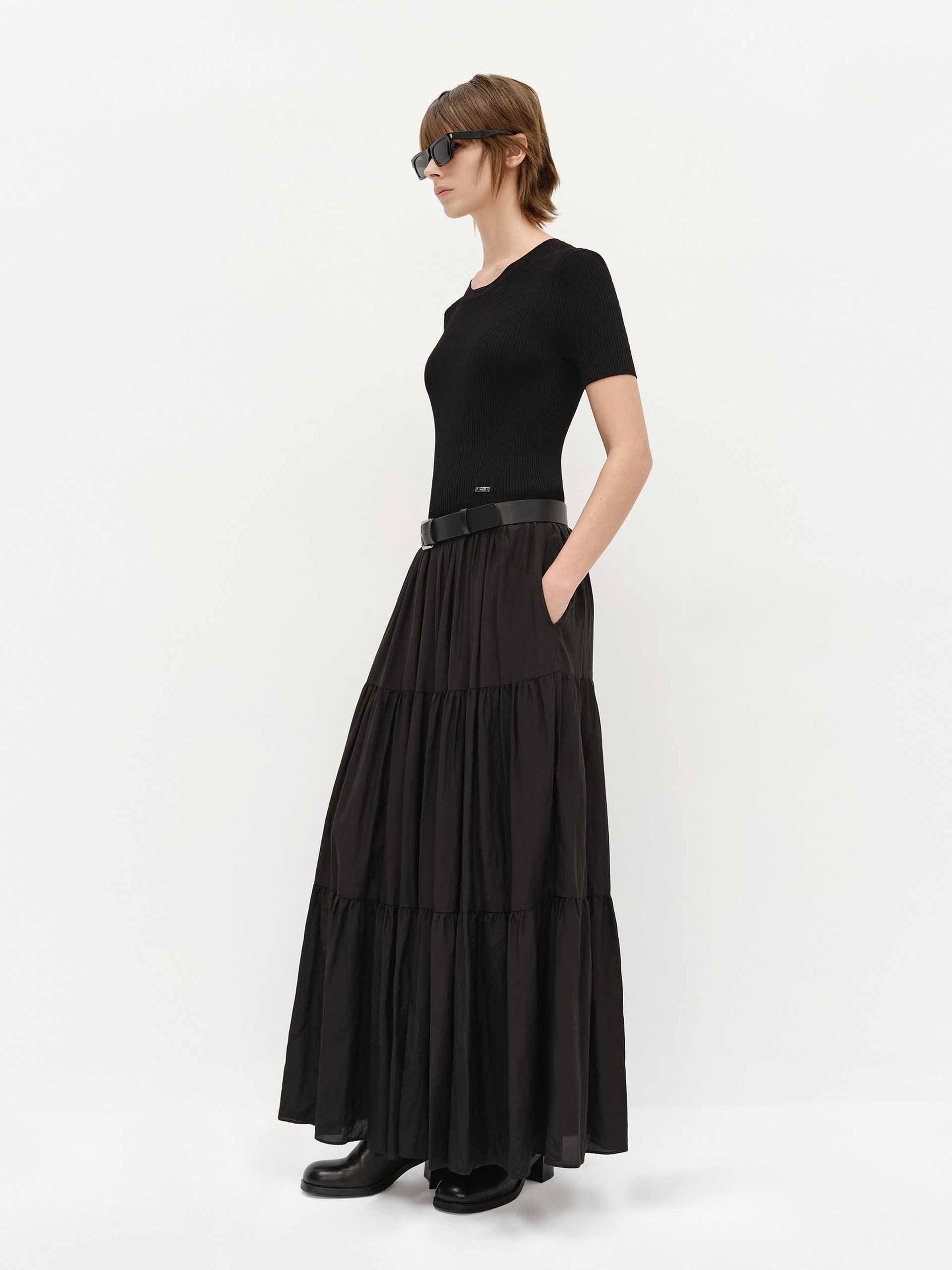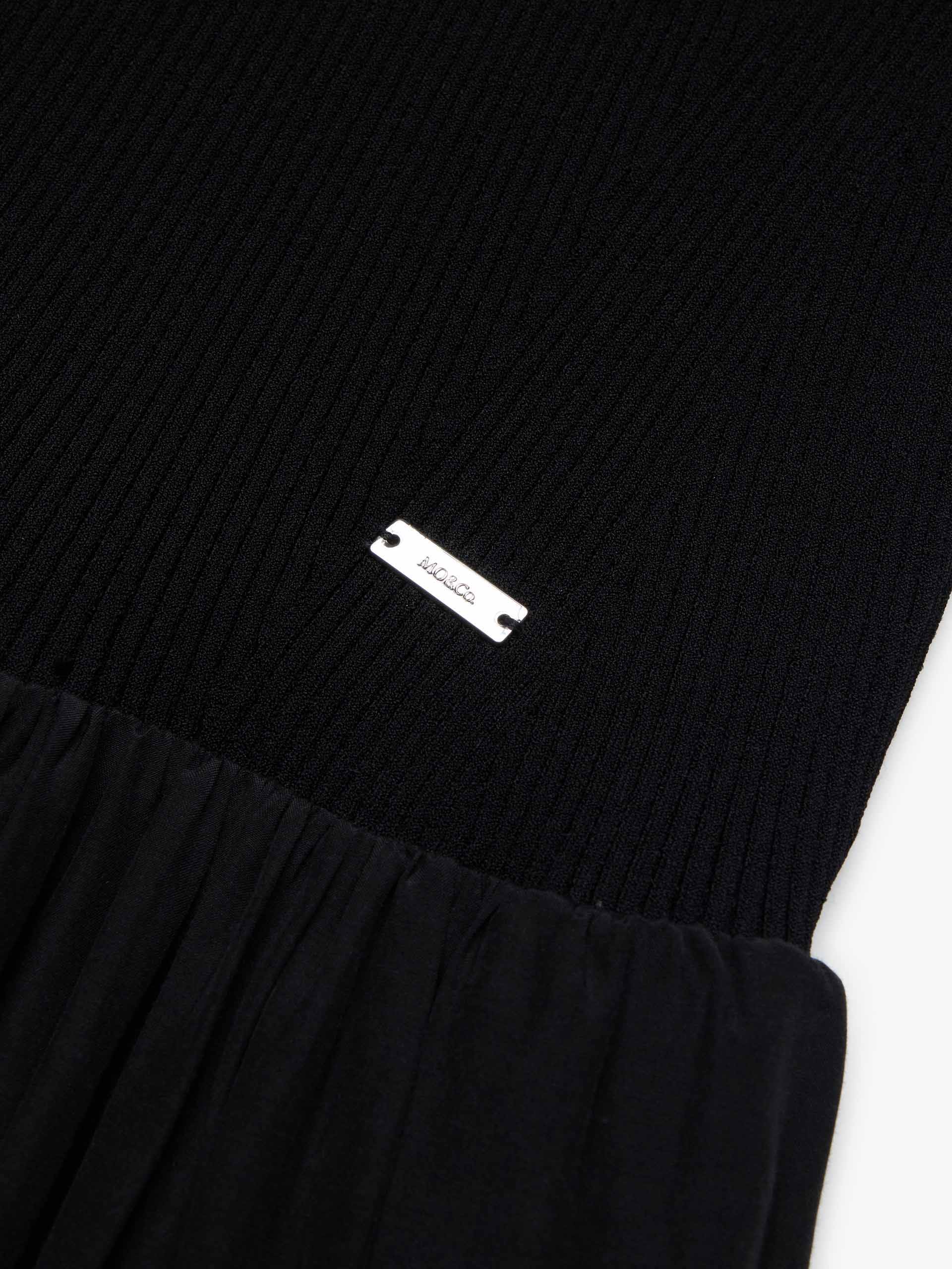 Crafted with refined black panel fabrics, this maxi length dress boasts a pleated skirt and a sleek silhouette. It's designed with a rounded neck and short sleeves.