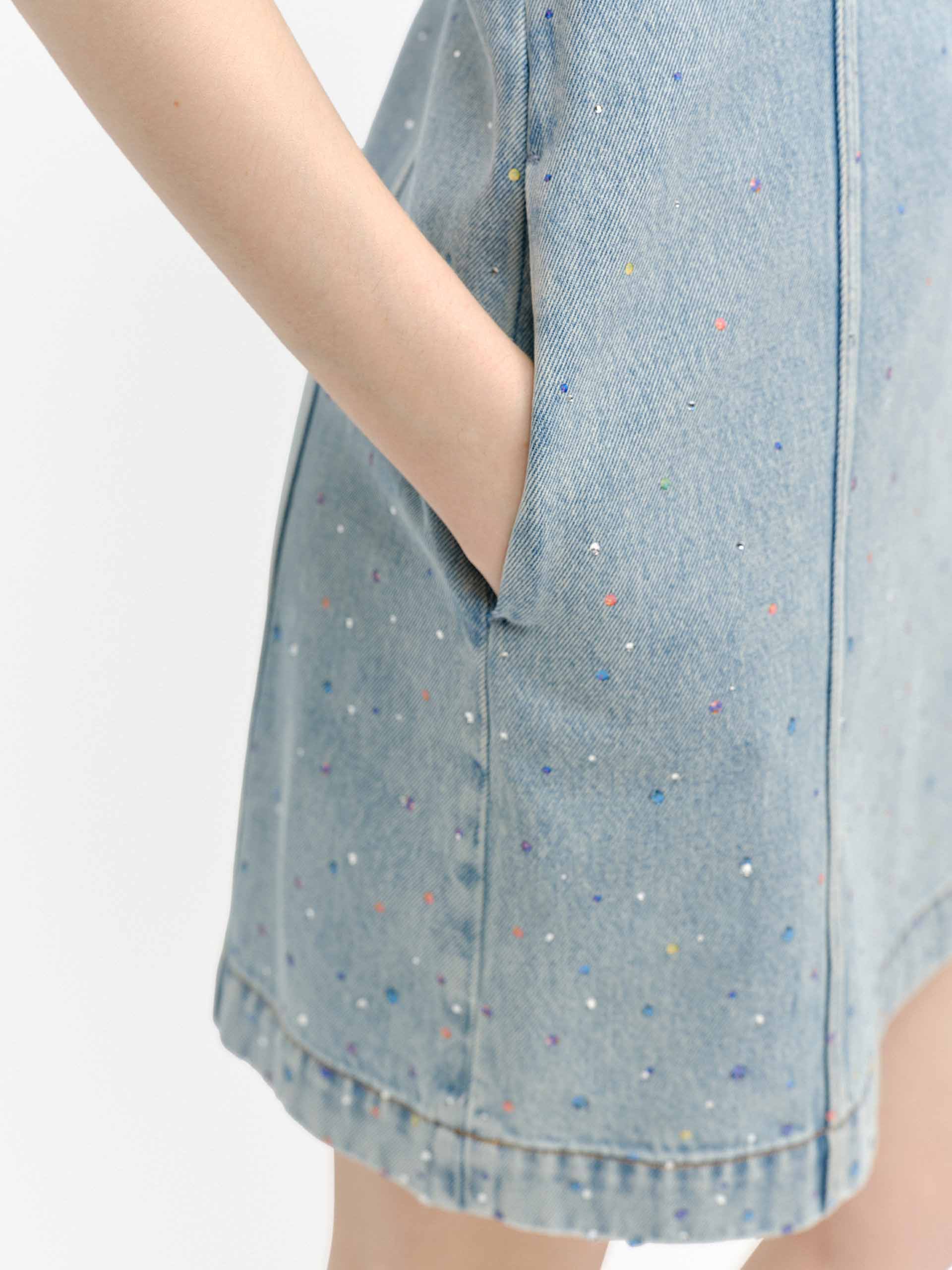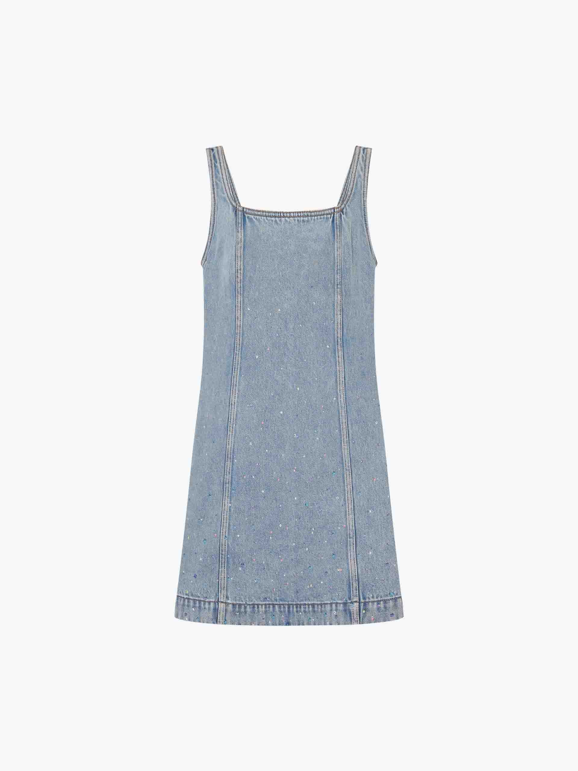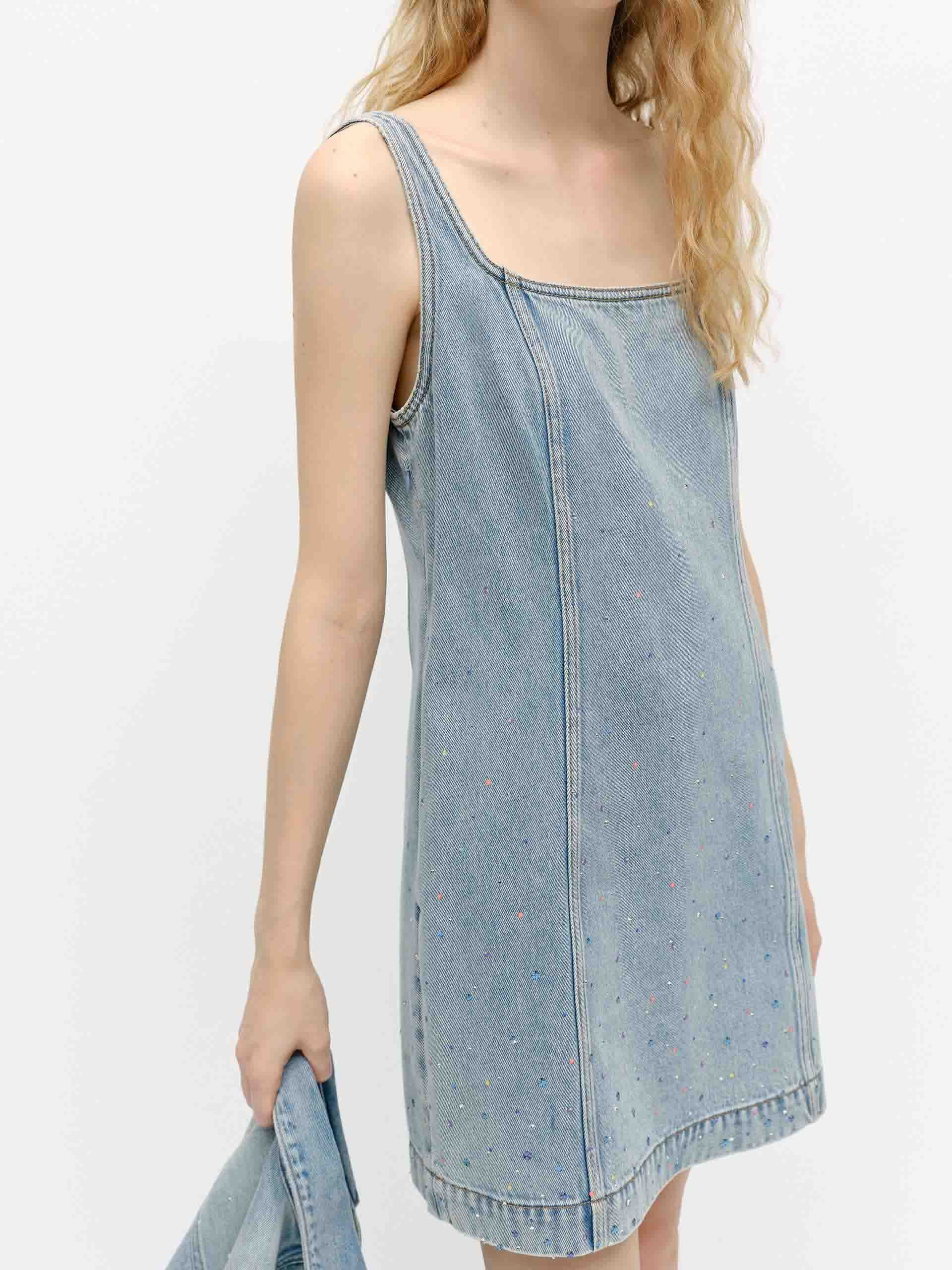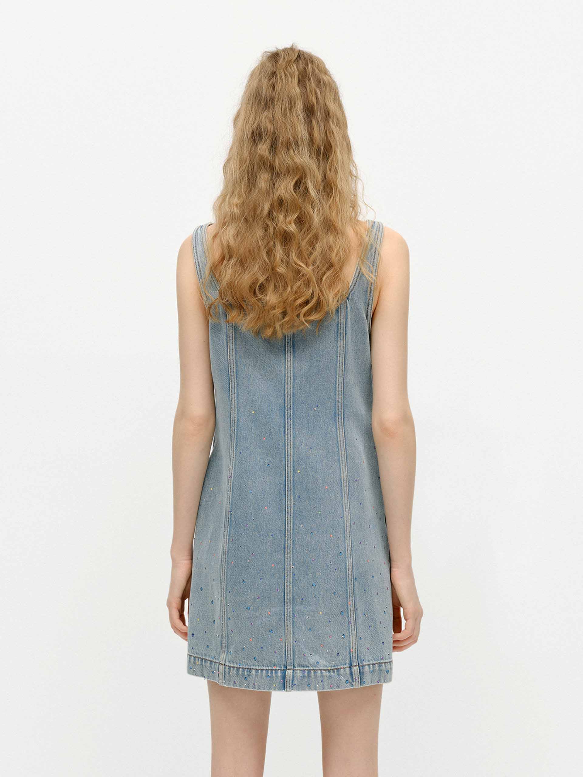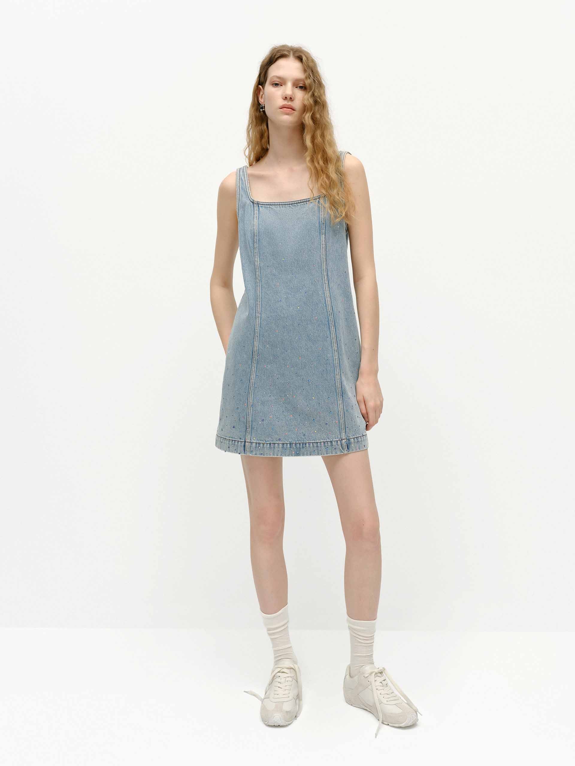 This dress is made from denim, the lightly faded blue wash gives it a unique and stylish look. The mini tank dress silhouette is complemented by a squared neckline and side pocket, making for a flattering shape.