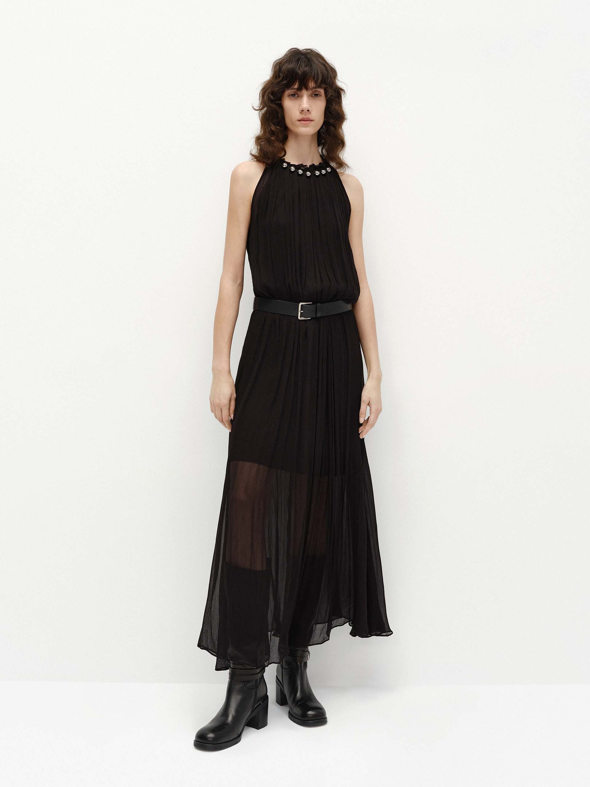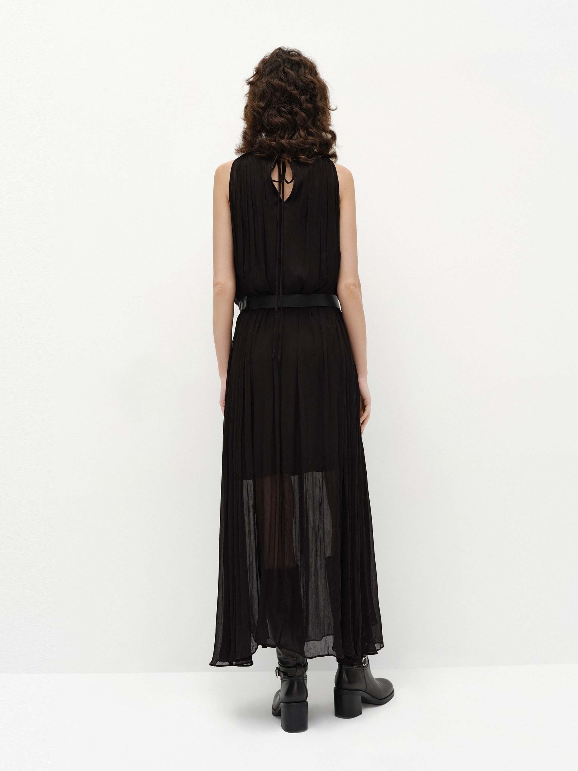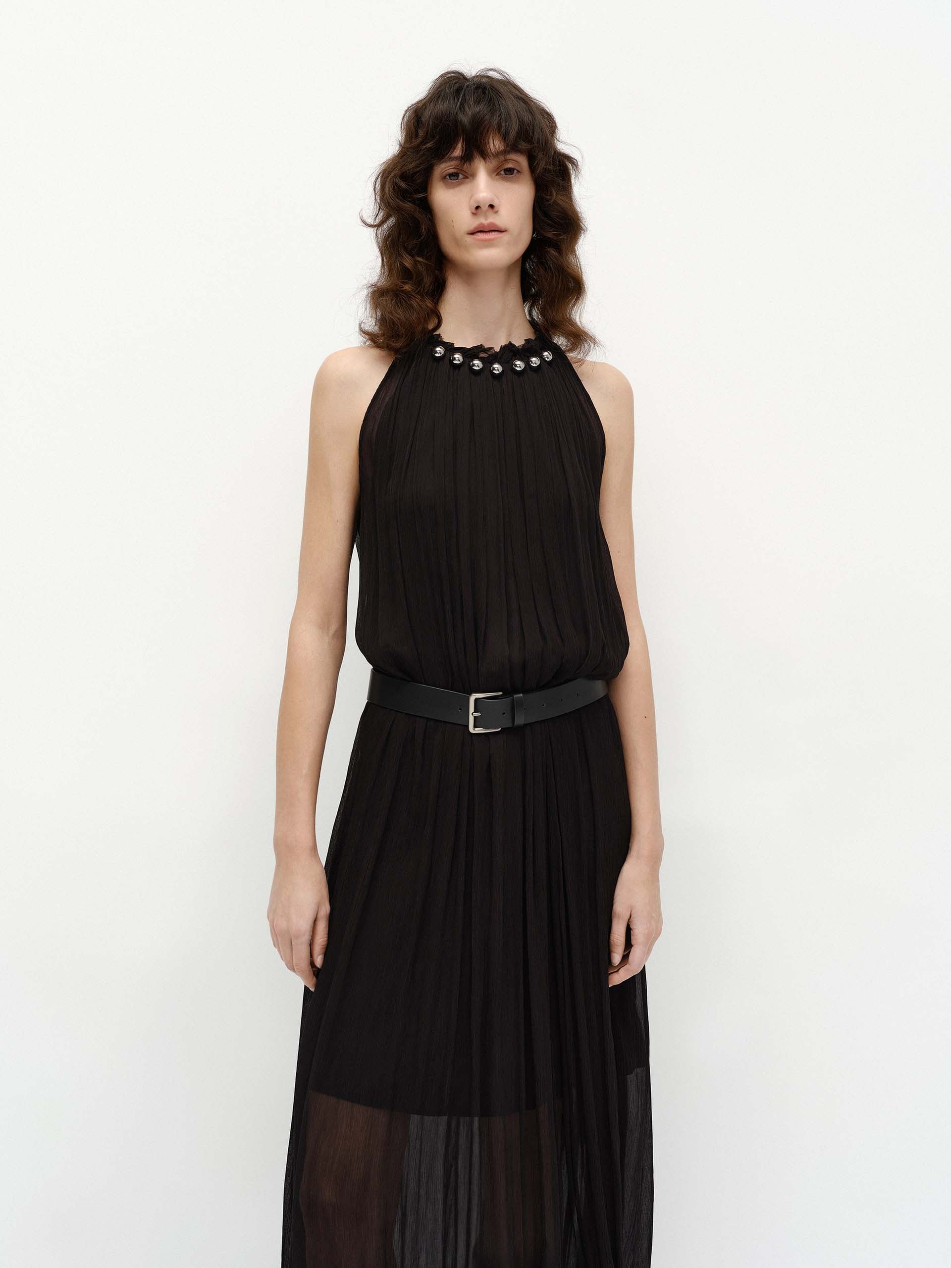 This dress is crafted from comfy and lightweight chiffon fabric, offering a flowy and elegant drape. It features a longline silhouette with a sleeveless design and a self-tie-back detail for a customizable fit. The neckline is gathered and adorned with delicate bead embellishments, adding a touch of sophistication and charm to the overall look.