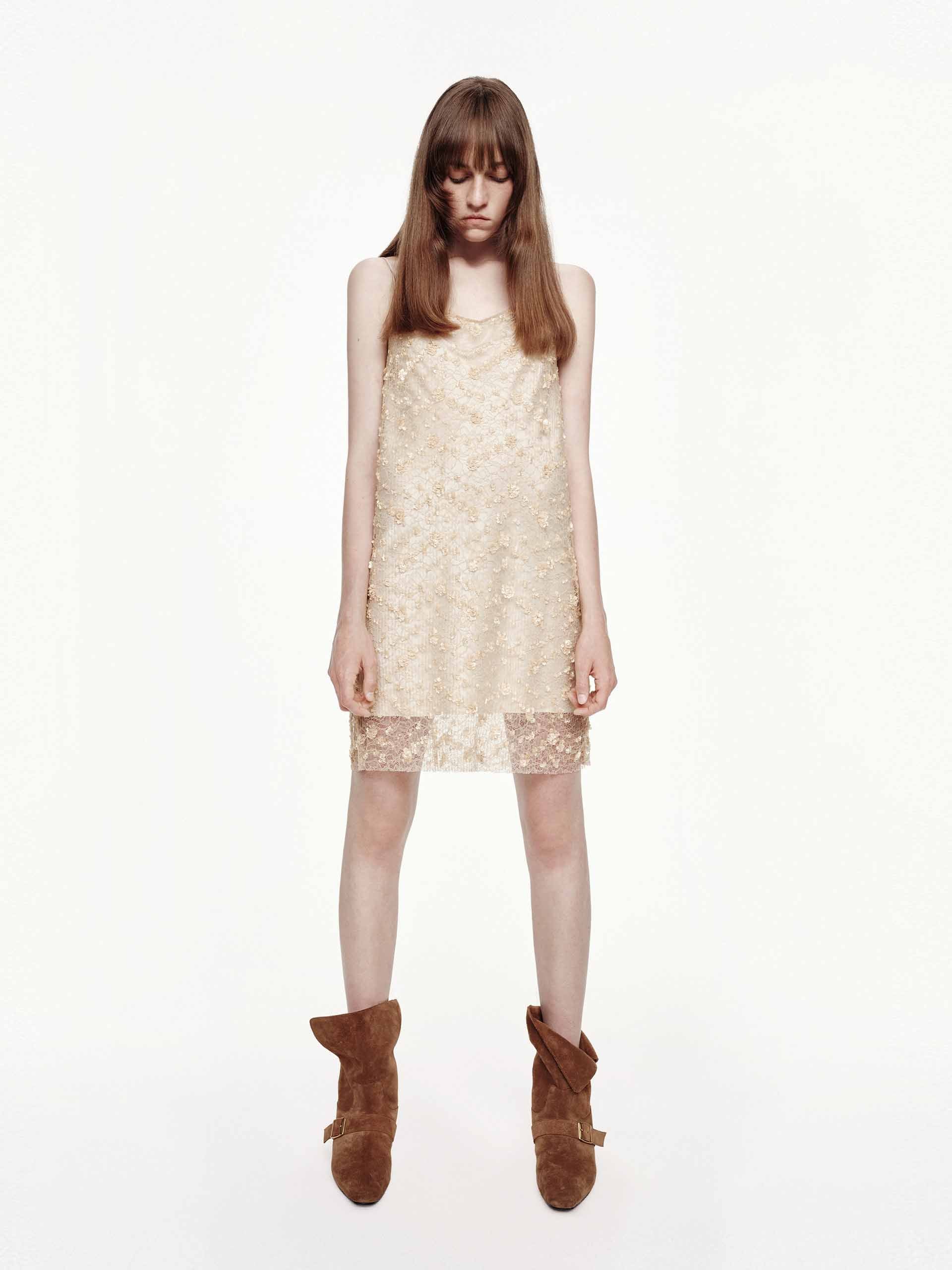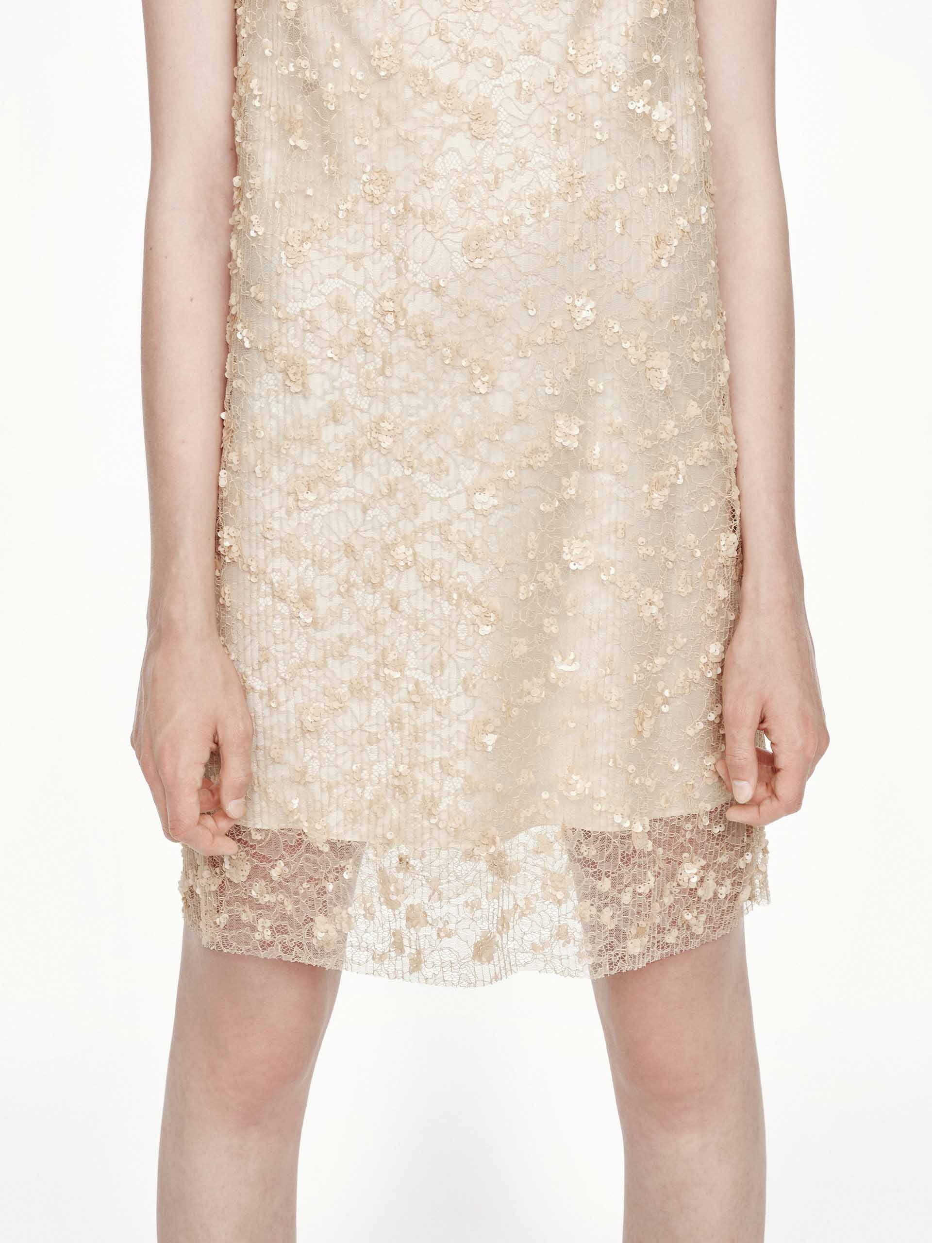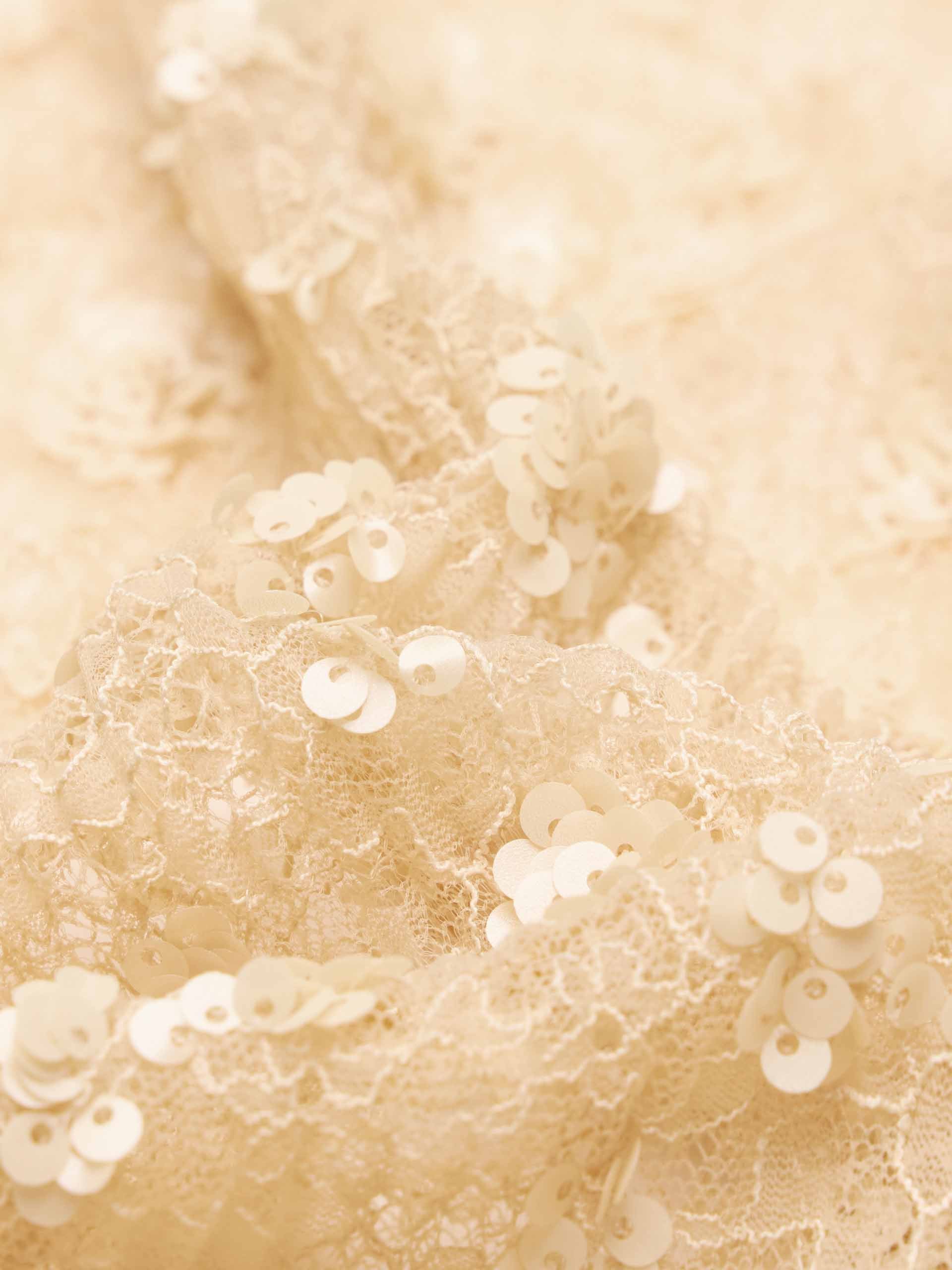 - Lace-paneled design and sequin finish