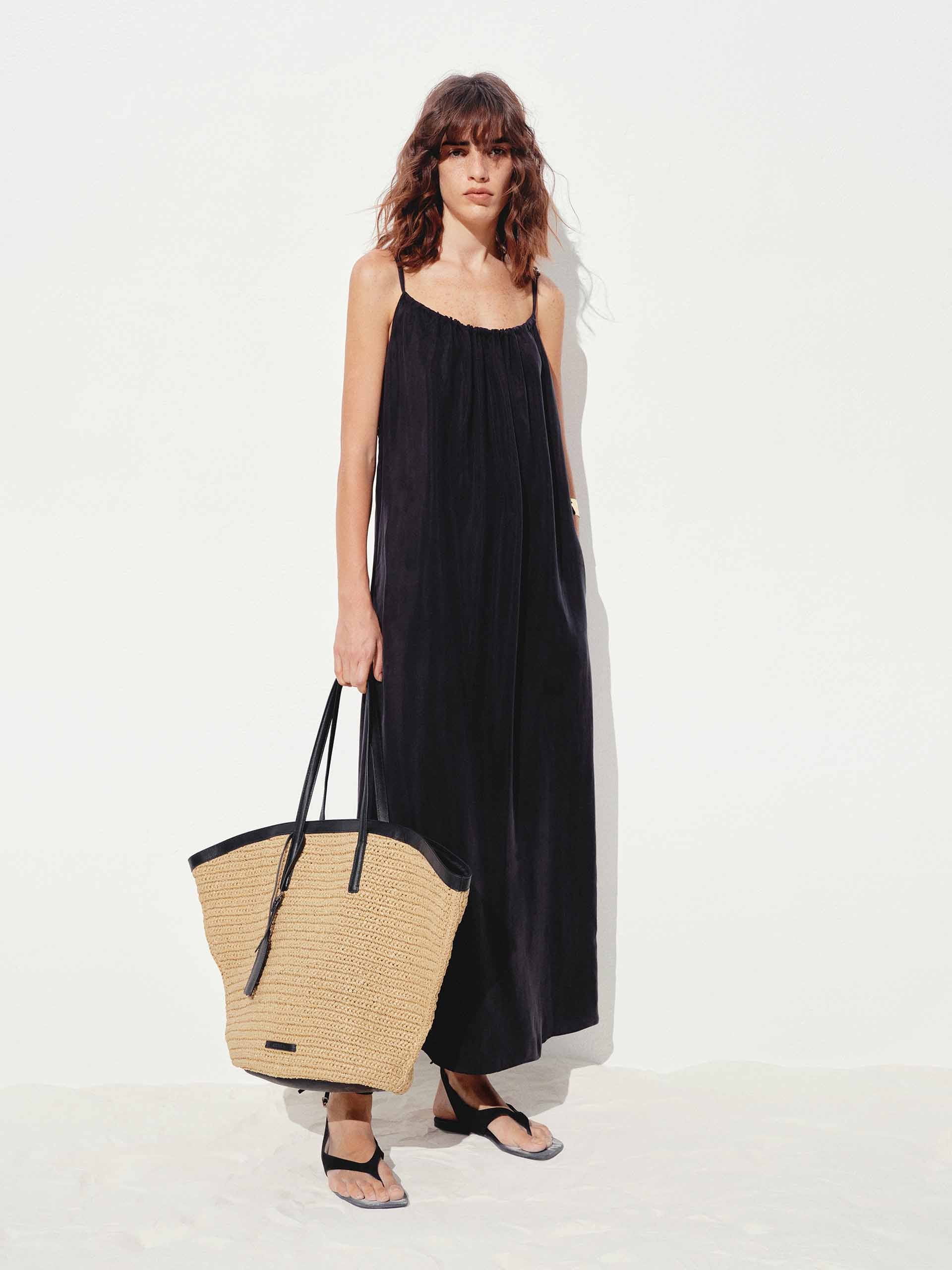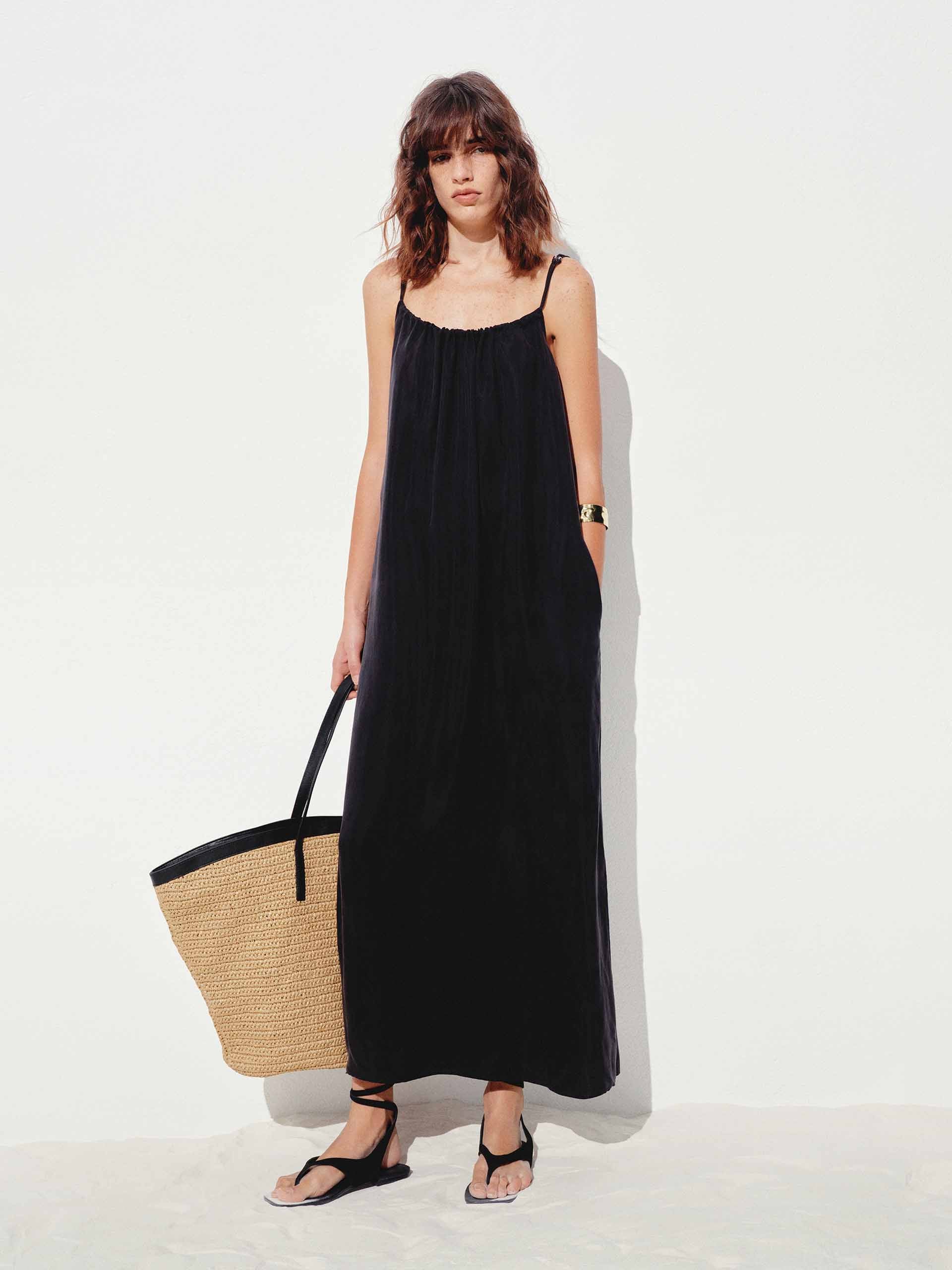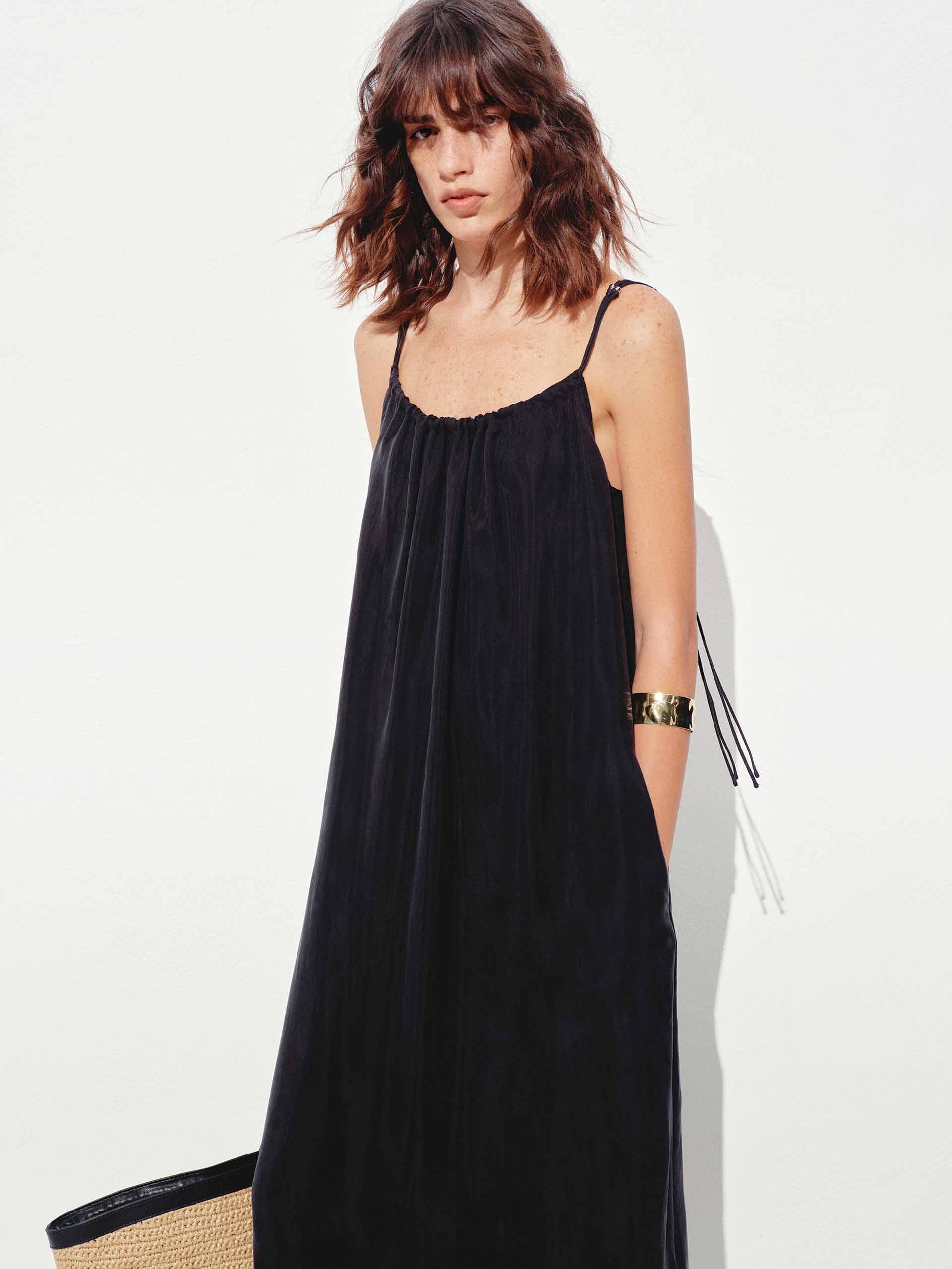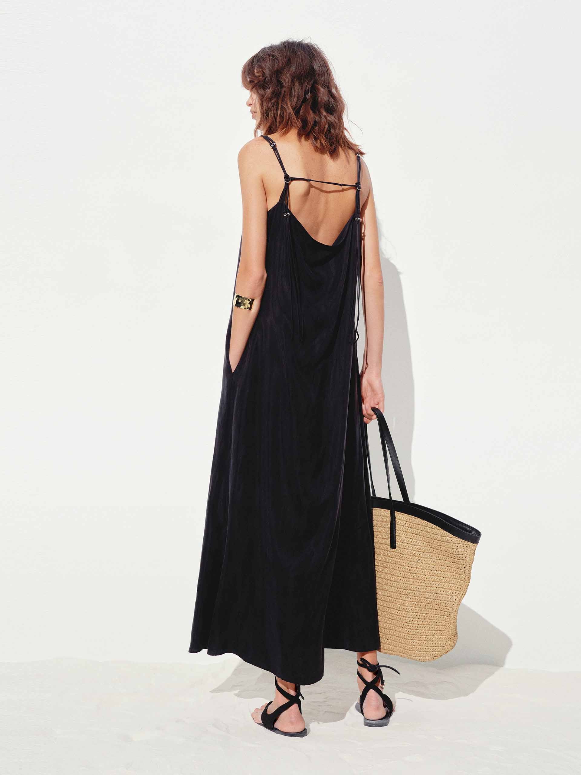 Fluid fabrics and delicate pleating bring a new softness to this dress. Delicate spaghetti straps and a daring backless design lend a touch of romantic allure, while the tonal back ties allow you to adjust the silhouette for a custom, figure-hugging fit.