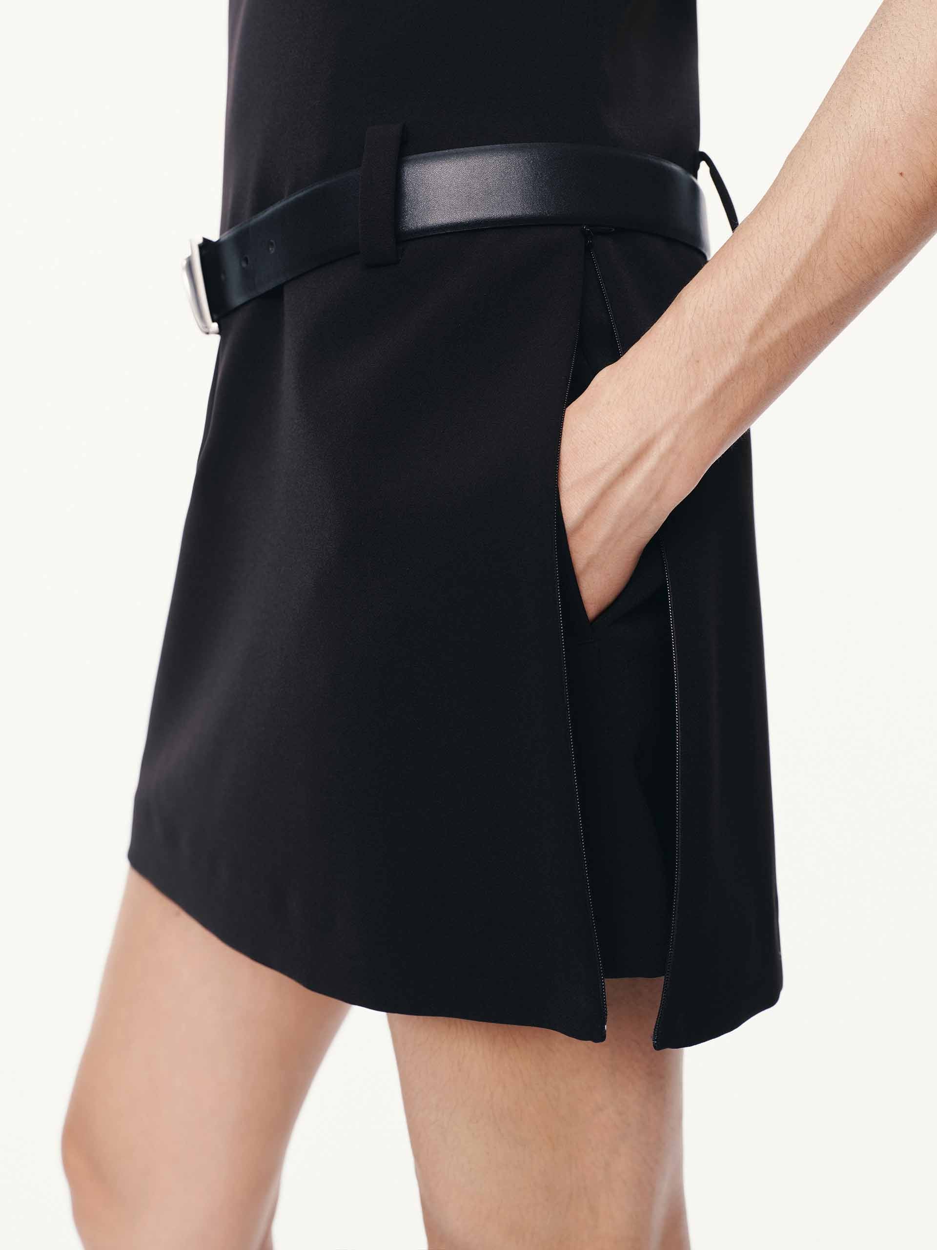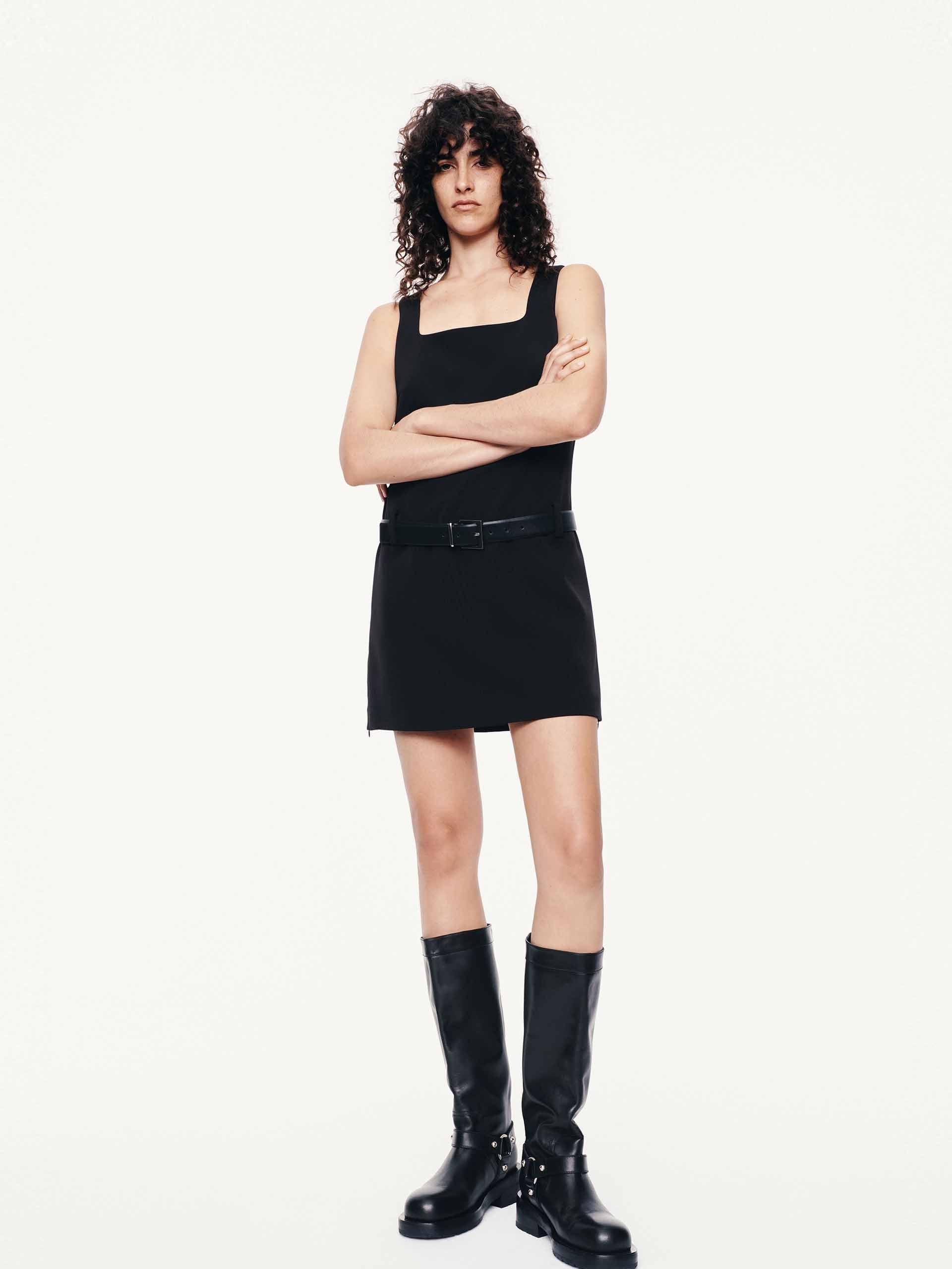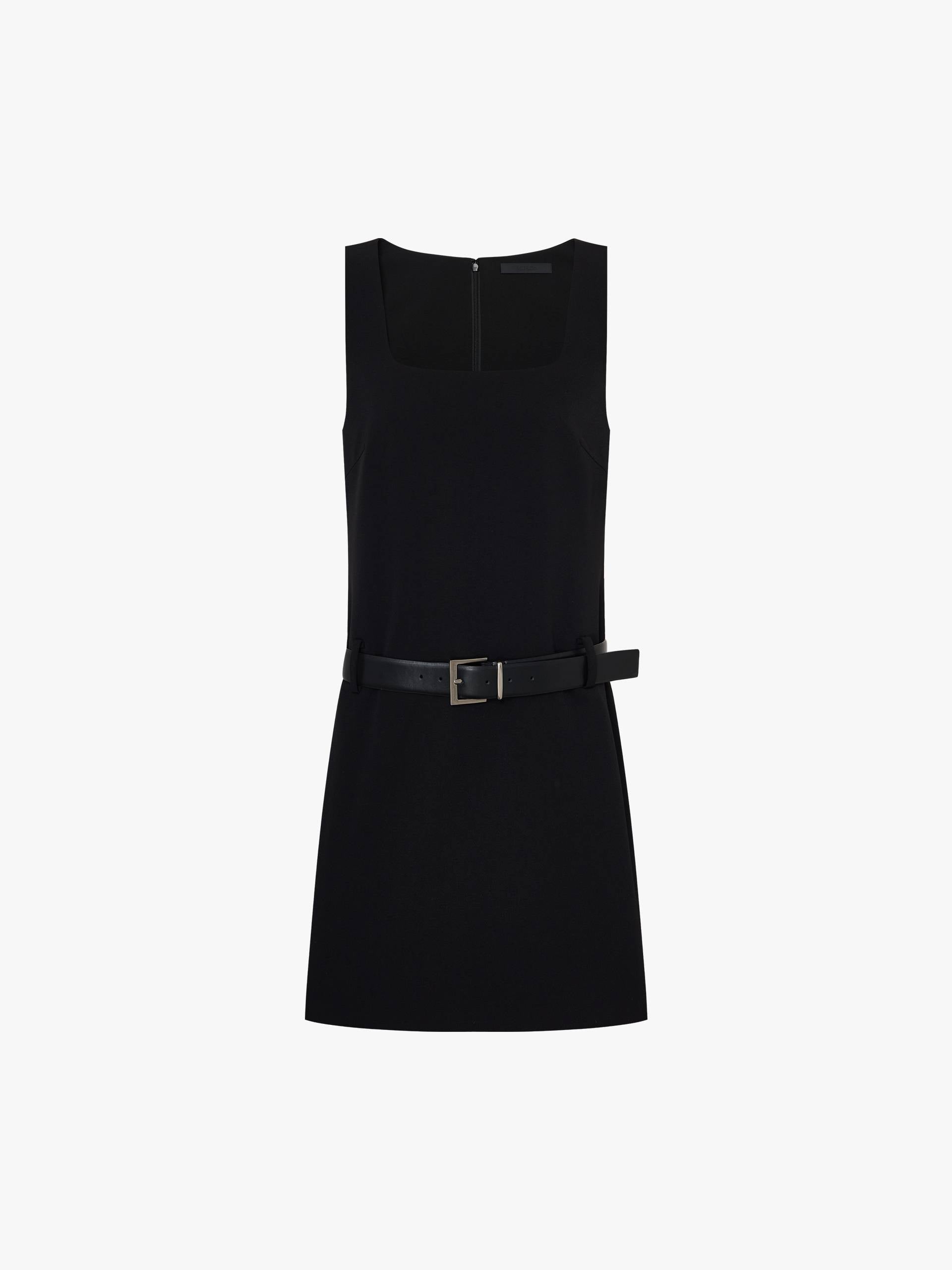 Make a statement with this mini dress, blending vintage-inspired elegance with contemporary practicality. The clean square neckline frames the décolletage beautifully, while the sleeveless design keeps the look fresh. Thoughtful details like the discreet zip pocket add unexpected functionality without compromising the dress's sleek lines. The waist belt is included.
