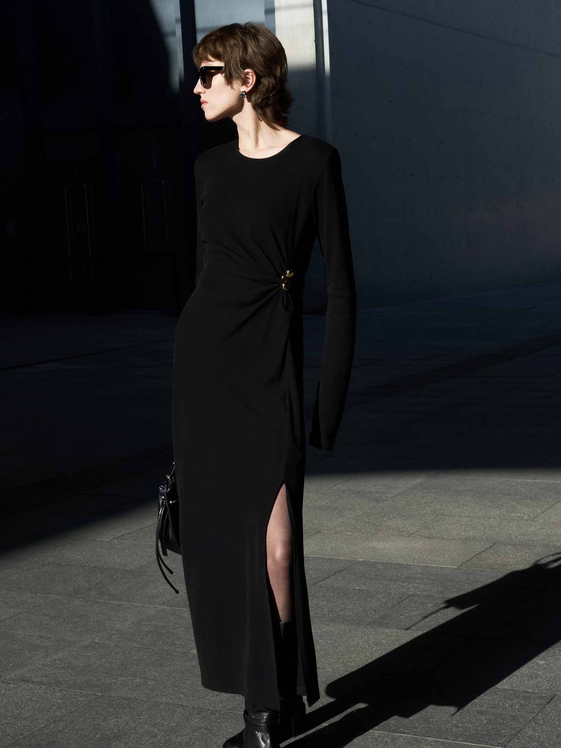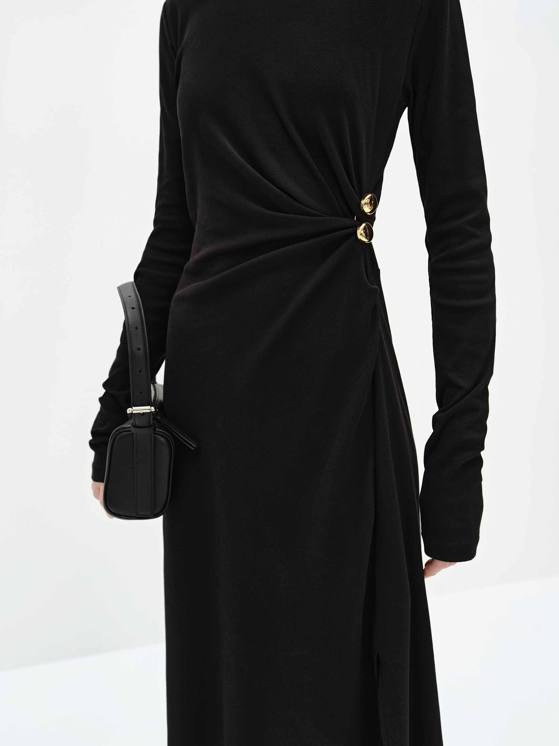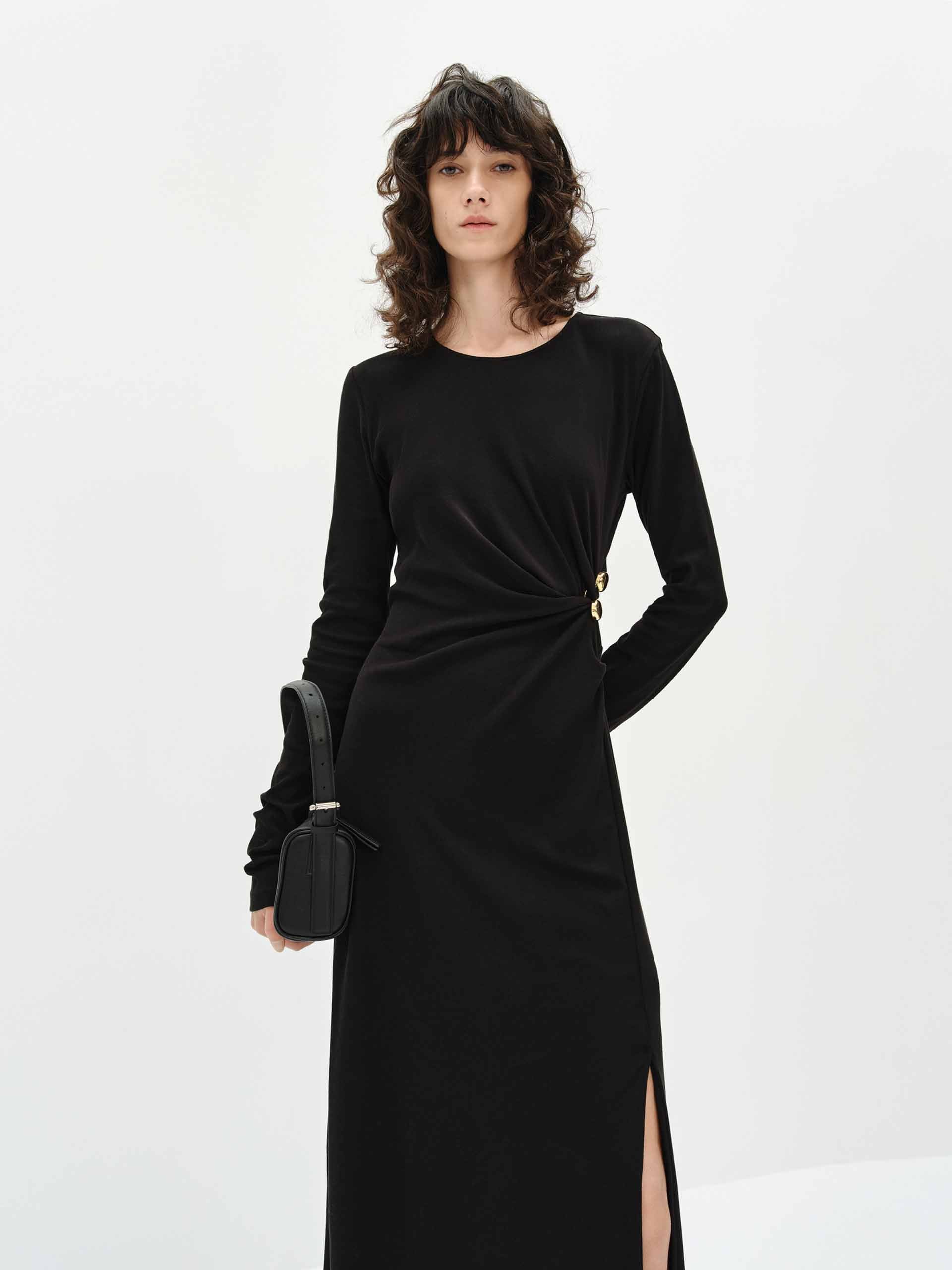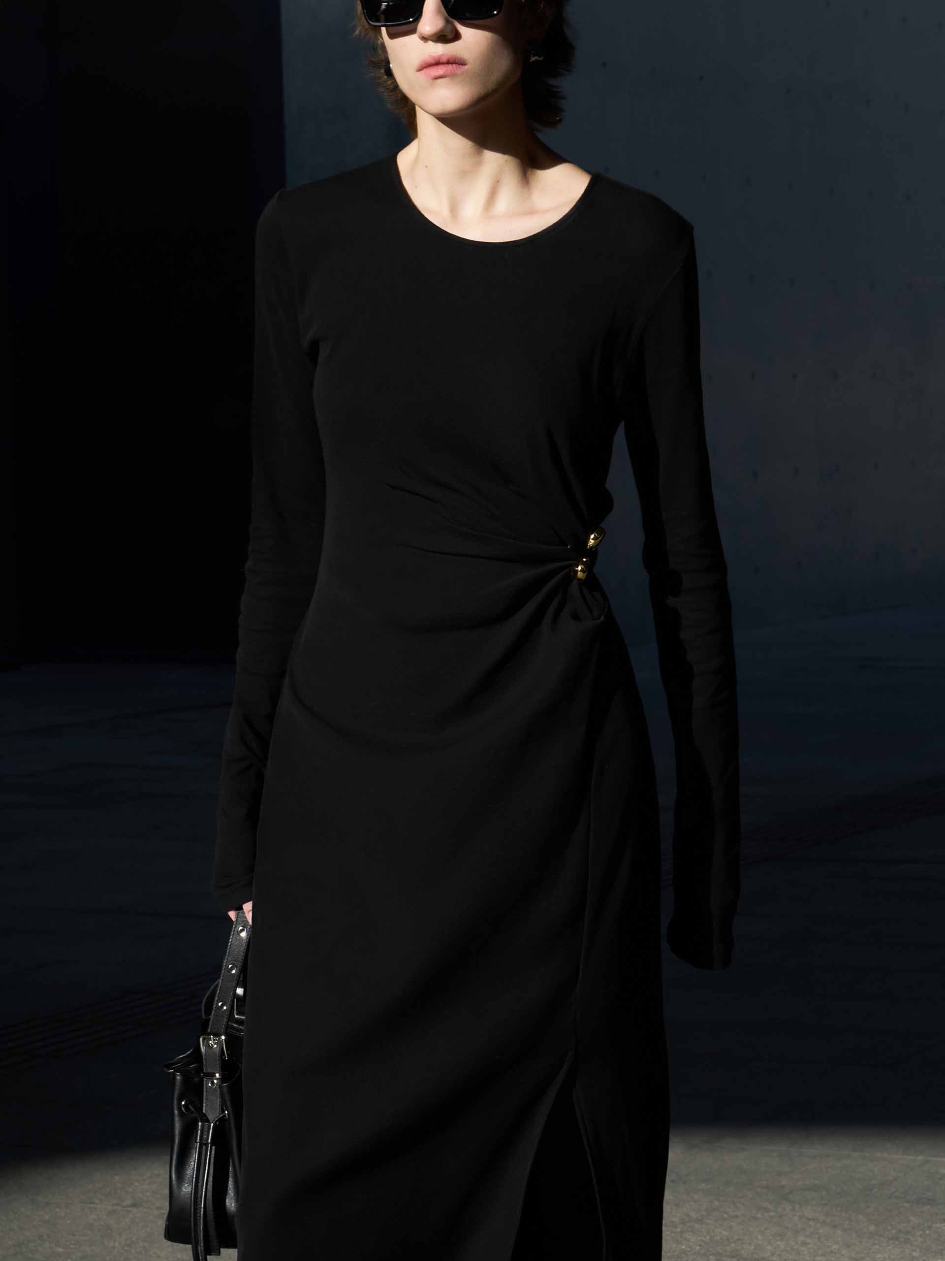 This dress is made from comfortable cotton fabric, it features a longline silhouette with a crew neck, side gathered and slit design, and unique metallic accents at the pleats. A statement dress that effortlessly combines comfort, style, and innovation.