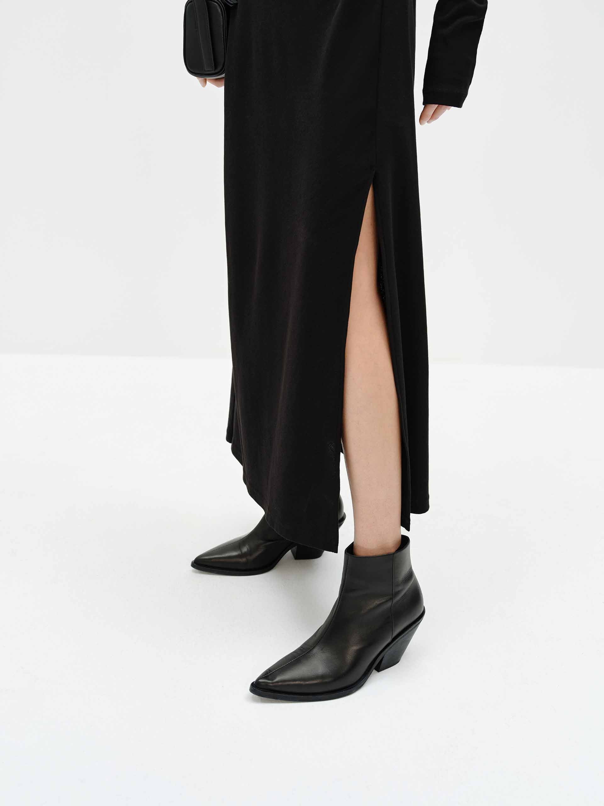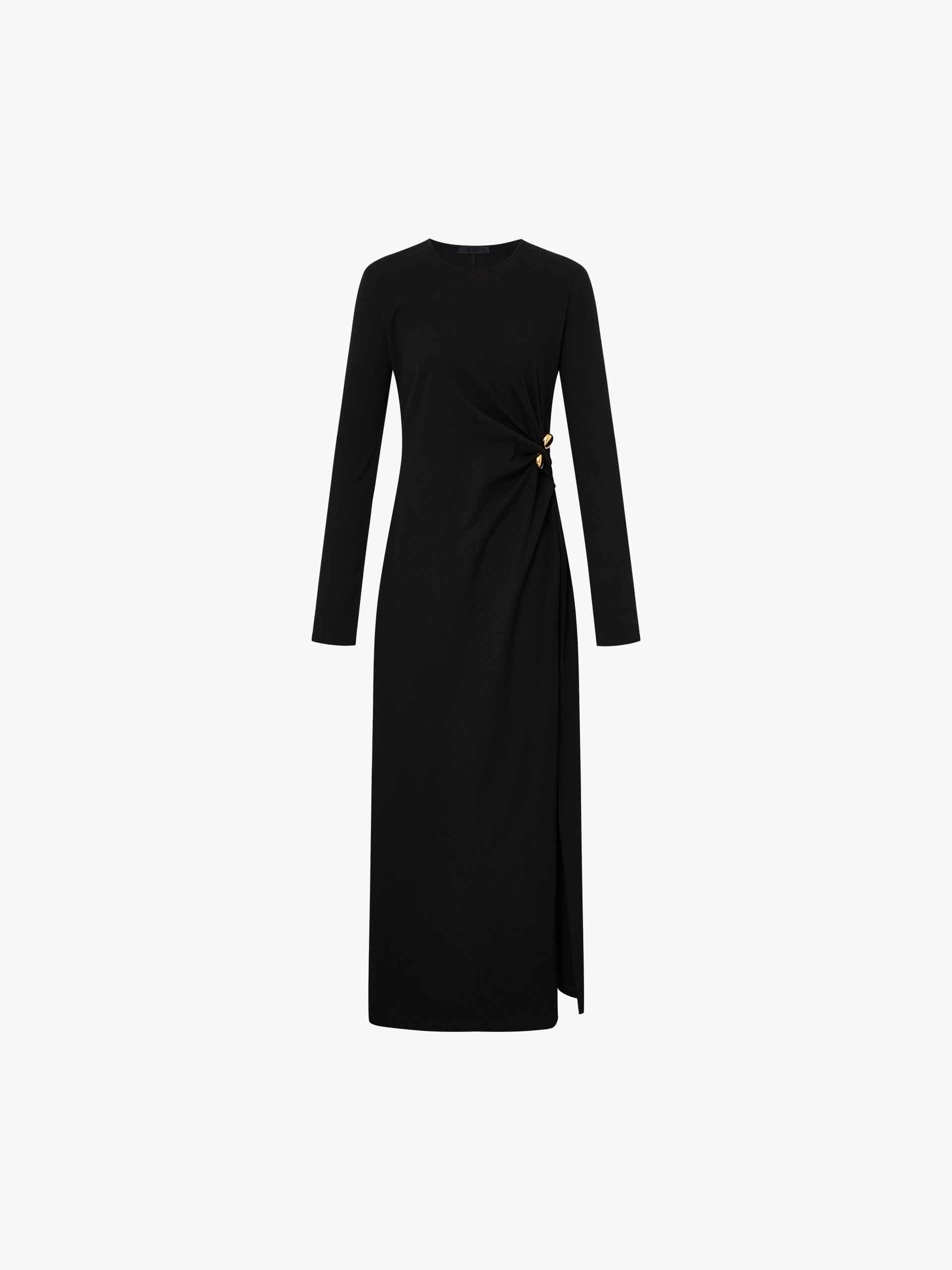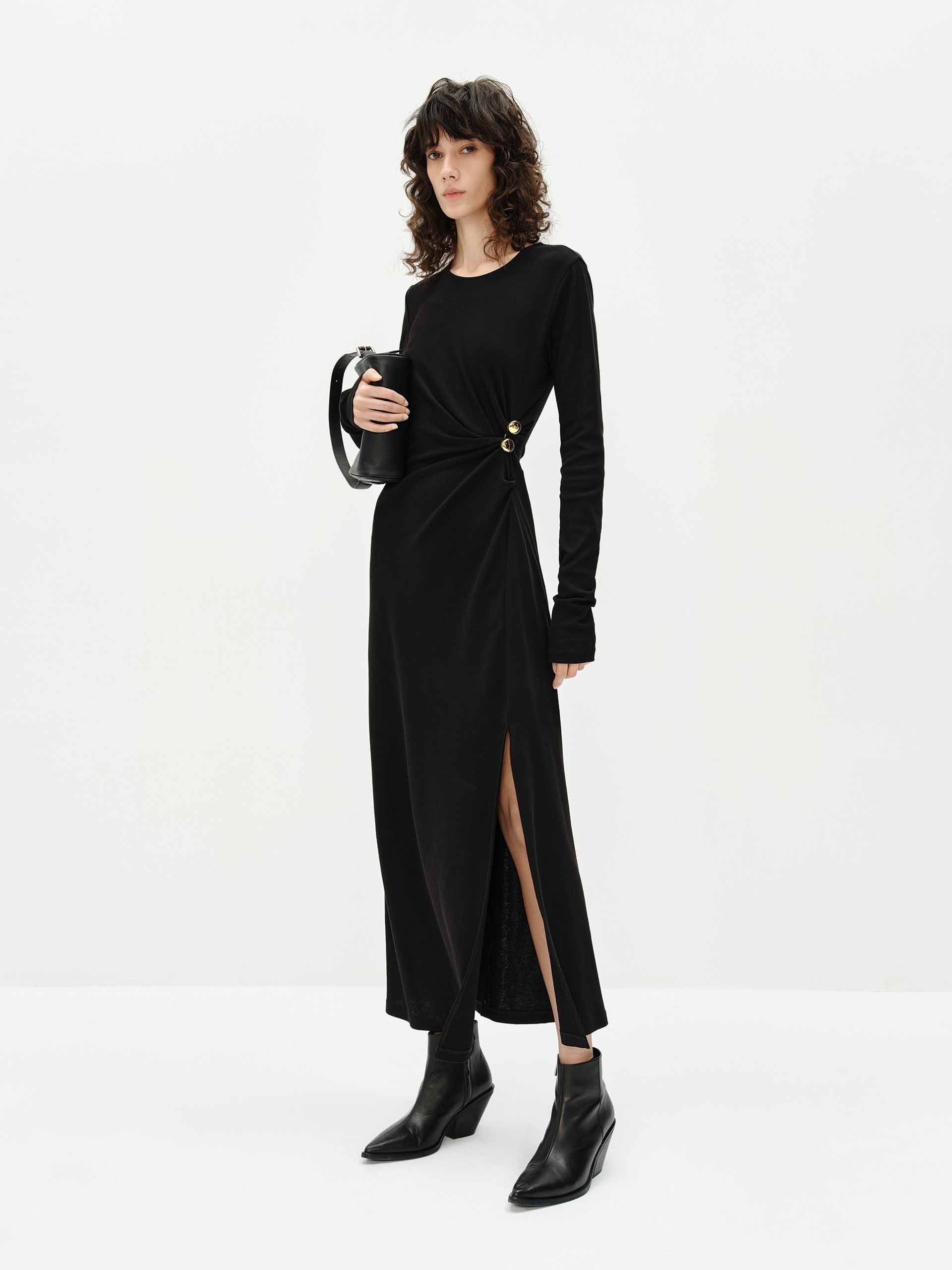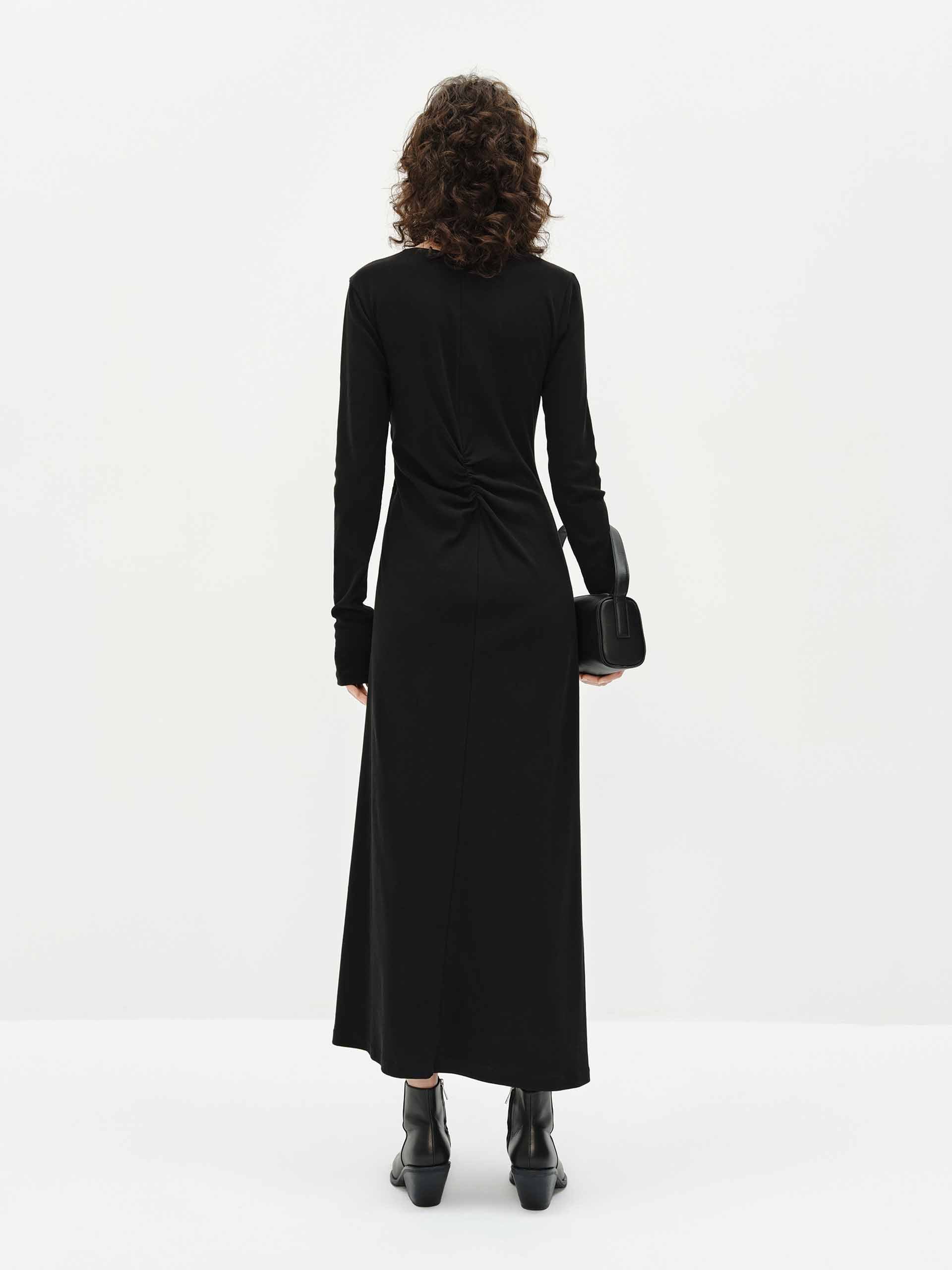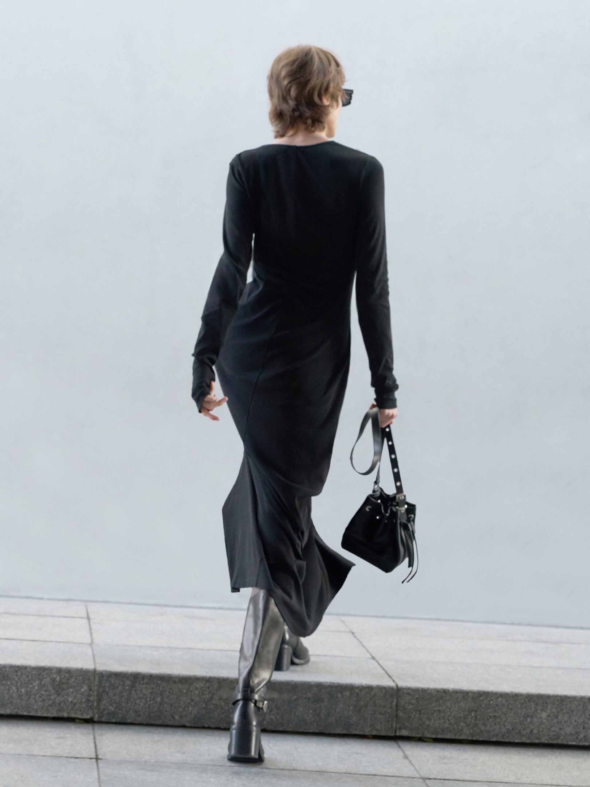 This dress is made from comfortable cotton fabric, it features a longline silhouette with a crew neck, side gathered and slit design, and unique metallic accents at the pleats. A statement dress that effortlessly combines comfort, style, and innovation.