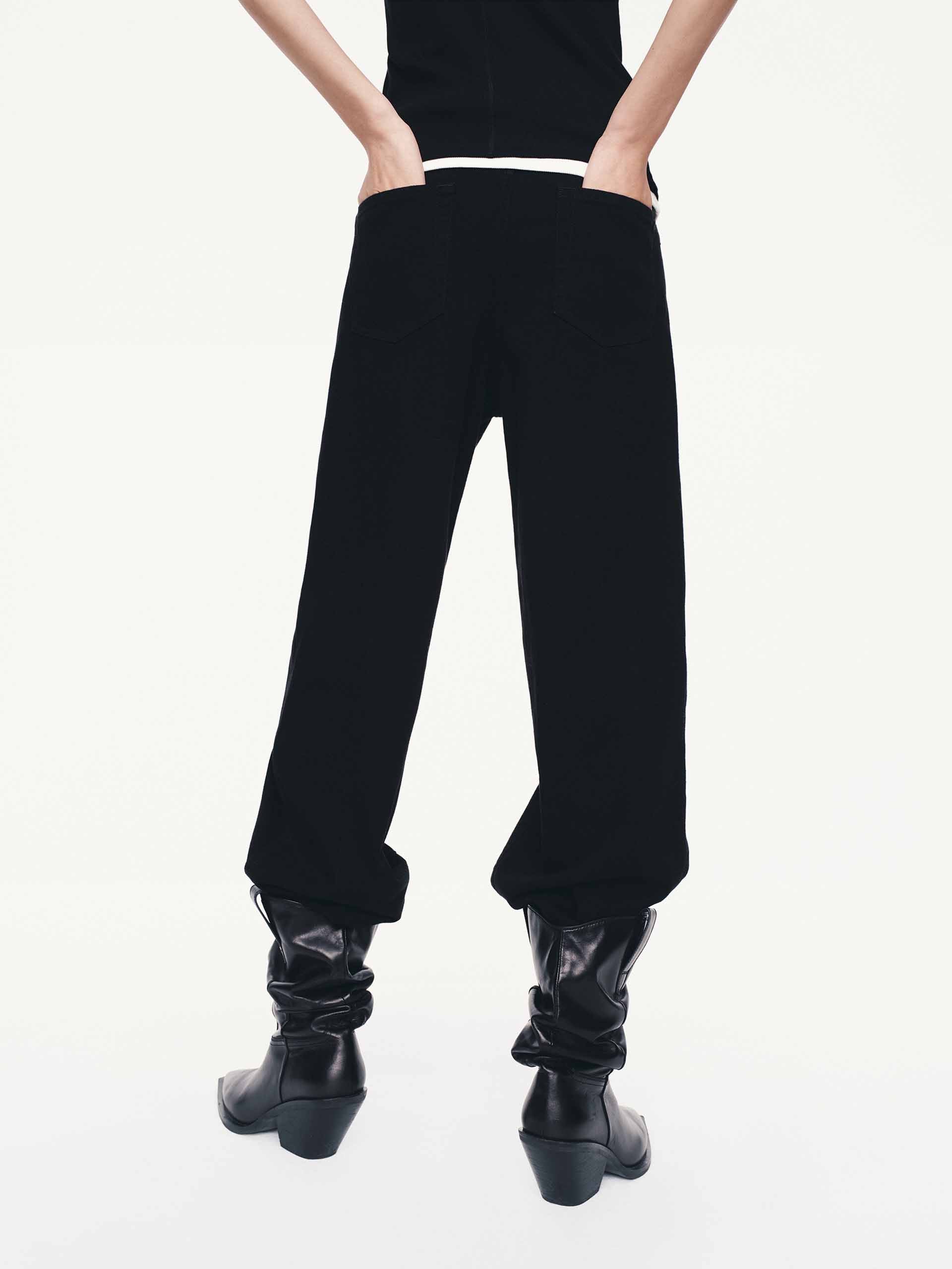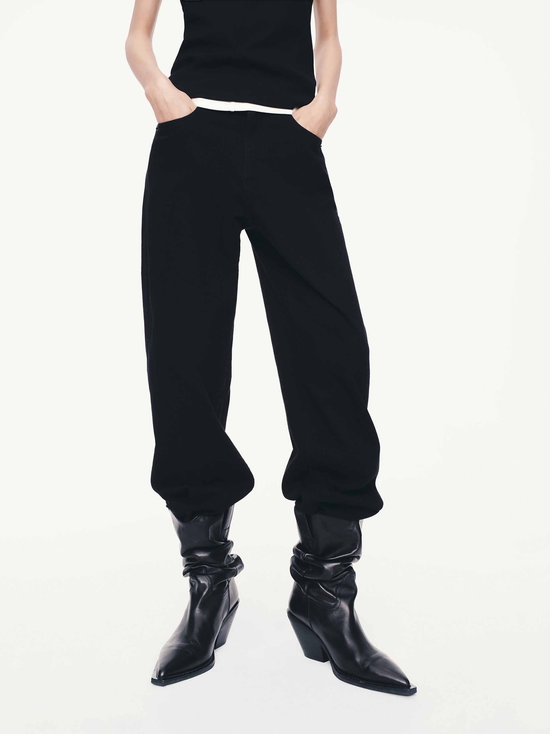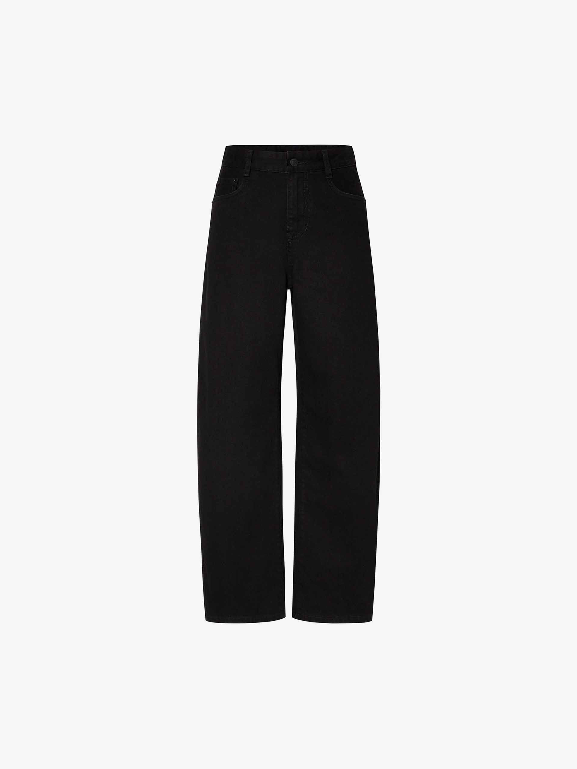 Step into sleek sophistication with these jeans, where bold silhouette meets modern minimalism for a look that’s both avant-garde and effortlessly wearable. The barrel leg creates an architectural shape that commands attention, while the deep black hue ensures versatility. A discreet leather logo patch at the back waistband adds a whisper of luxury.