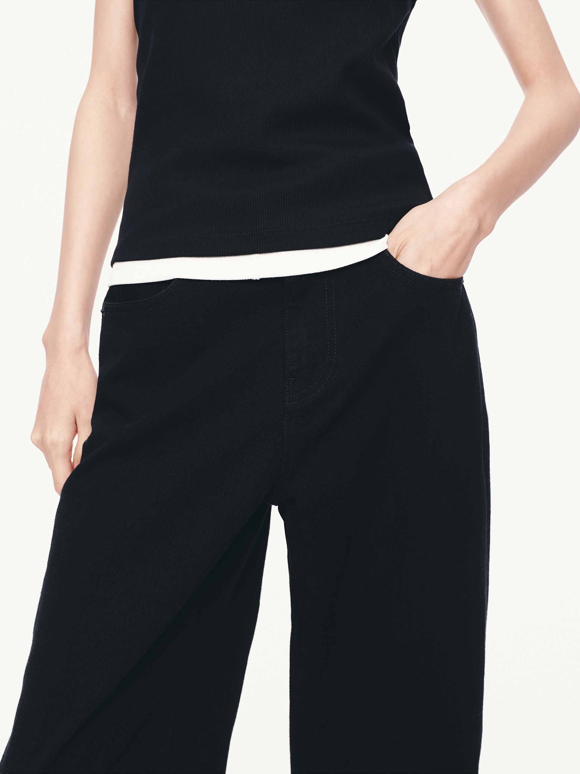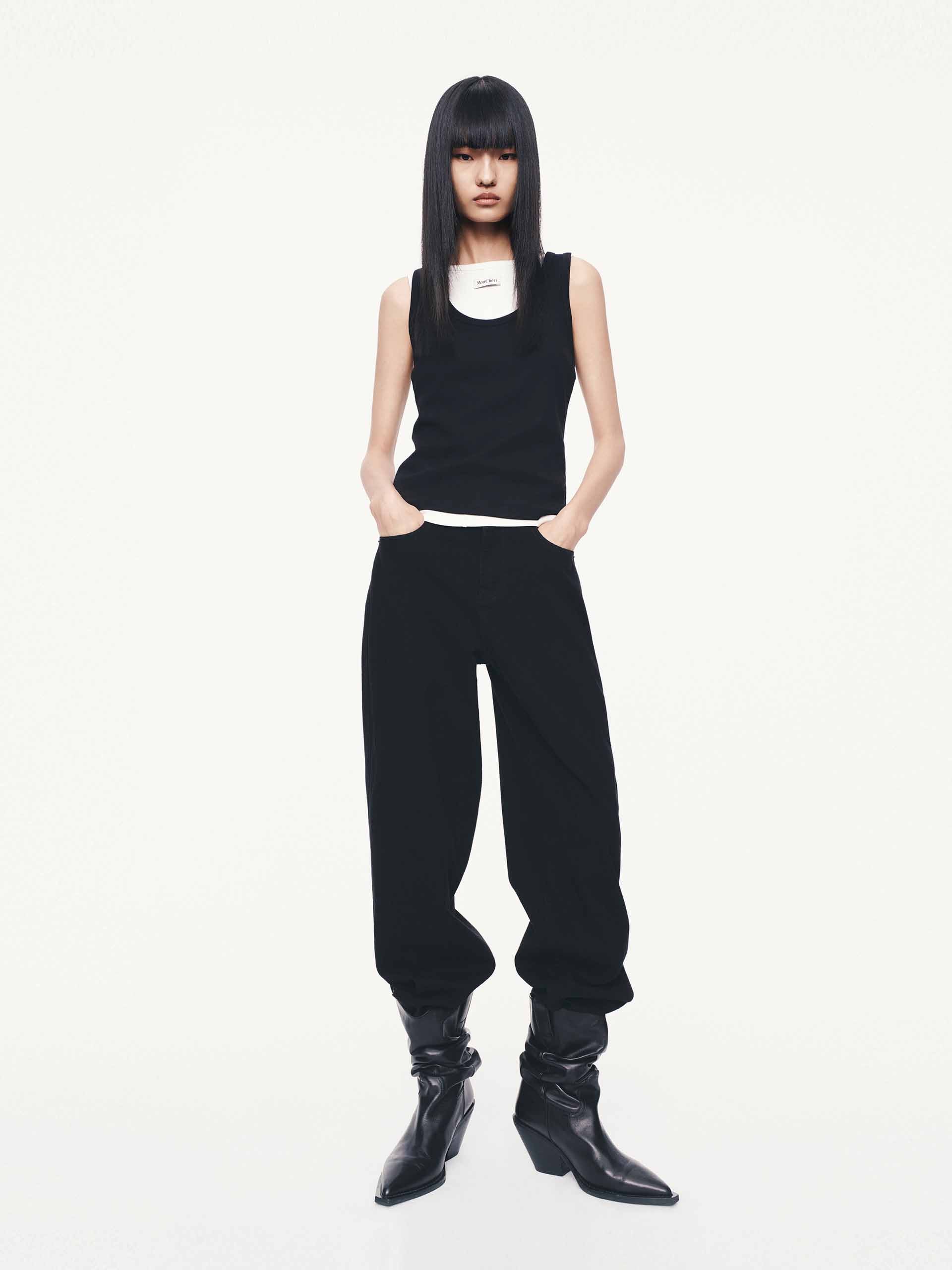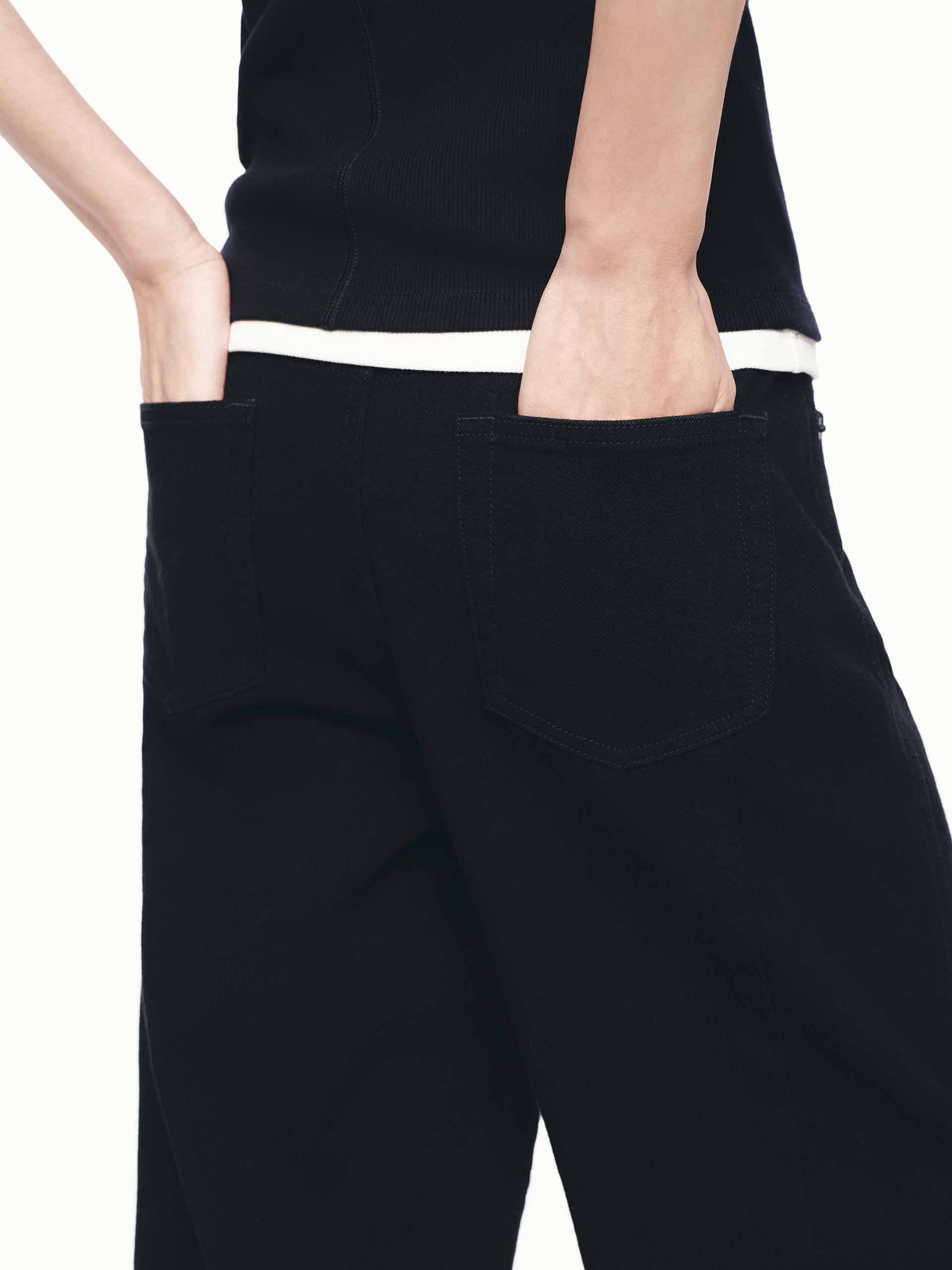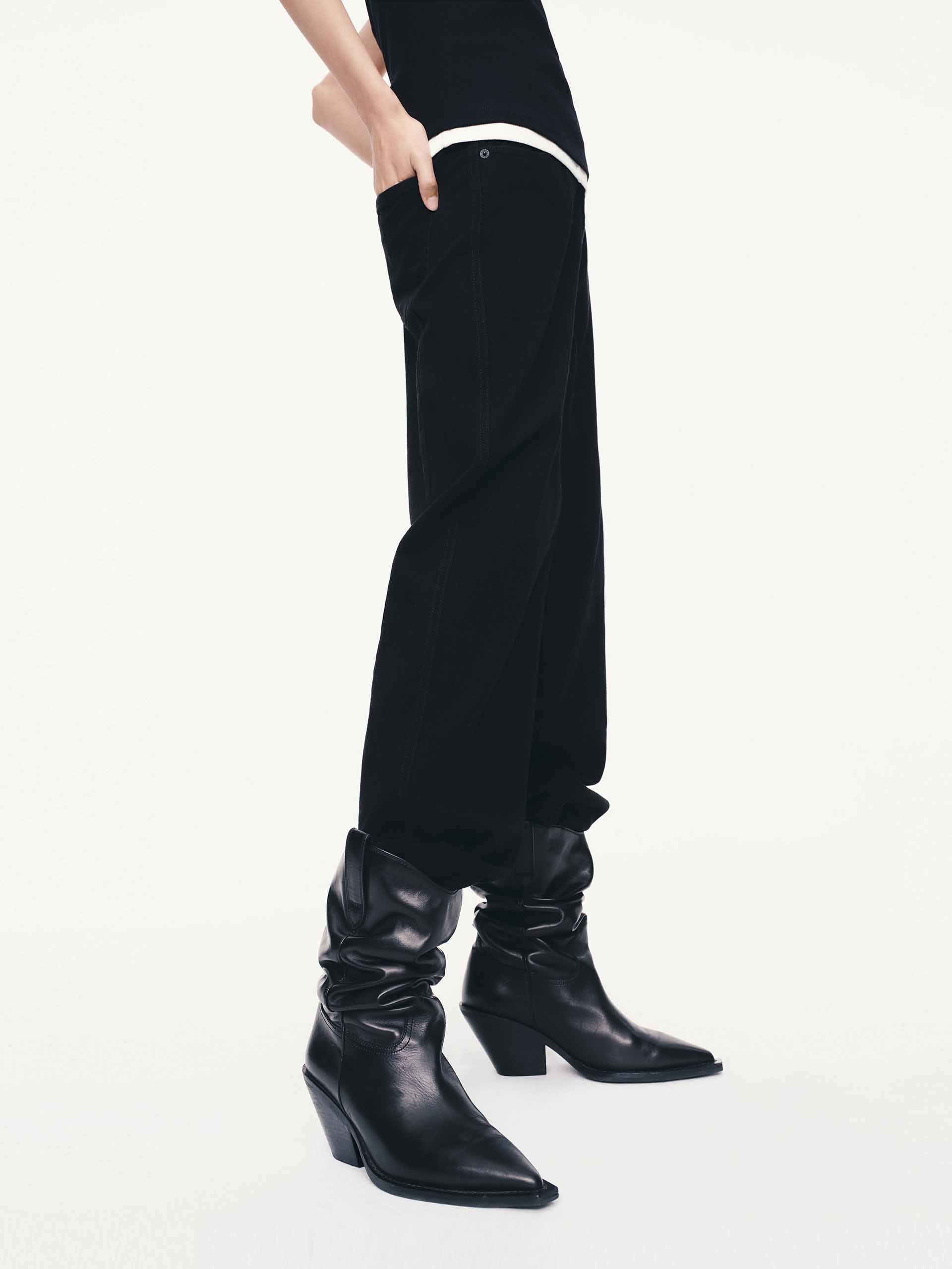 Step into sleek sophistication with these jeans, where bold silhouette meets modern minimalism for a look that’s both avant-garde and effortlessly wearable. The barrel leg creates an architectural shape that commands attention, while the deep black hue ensures versatility. A discreet leather logo patch at the back waistband adds a whisper of luxury.