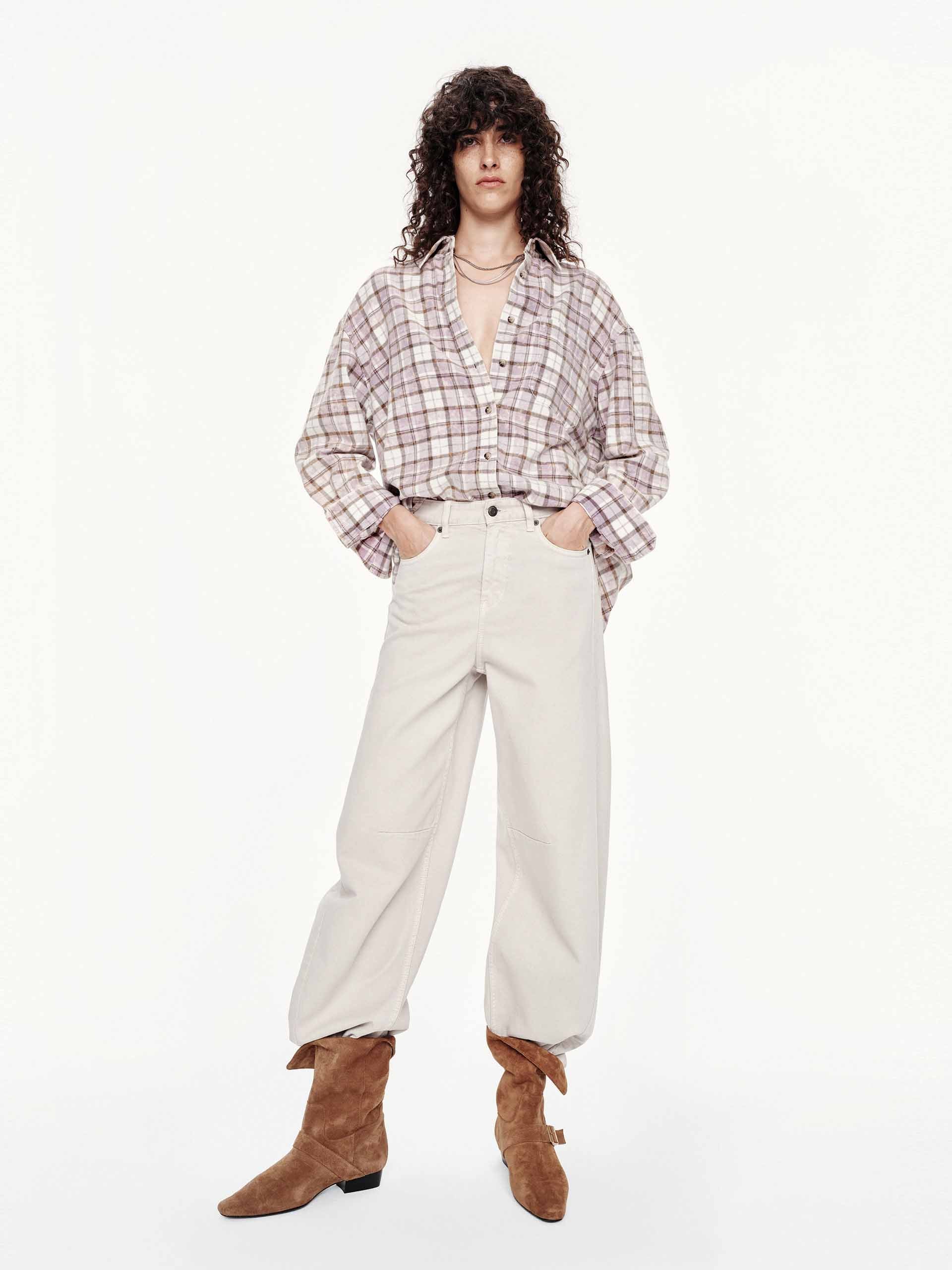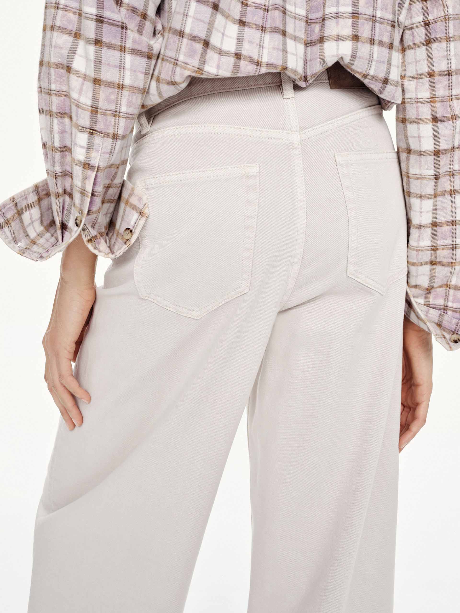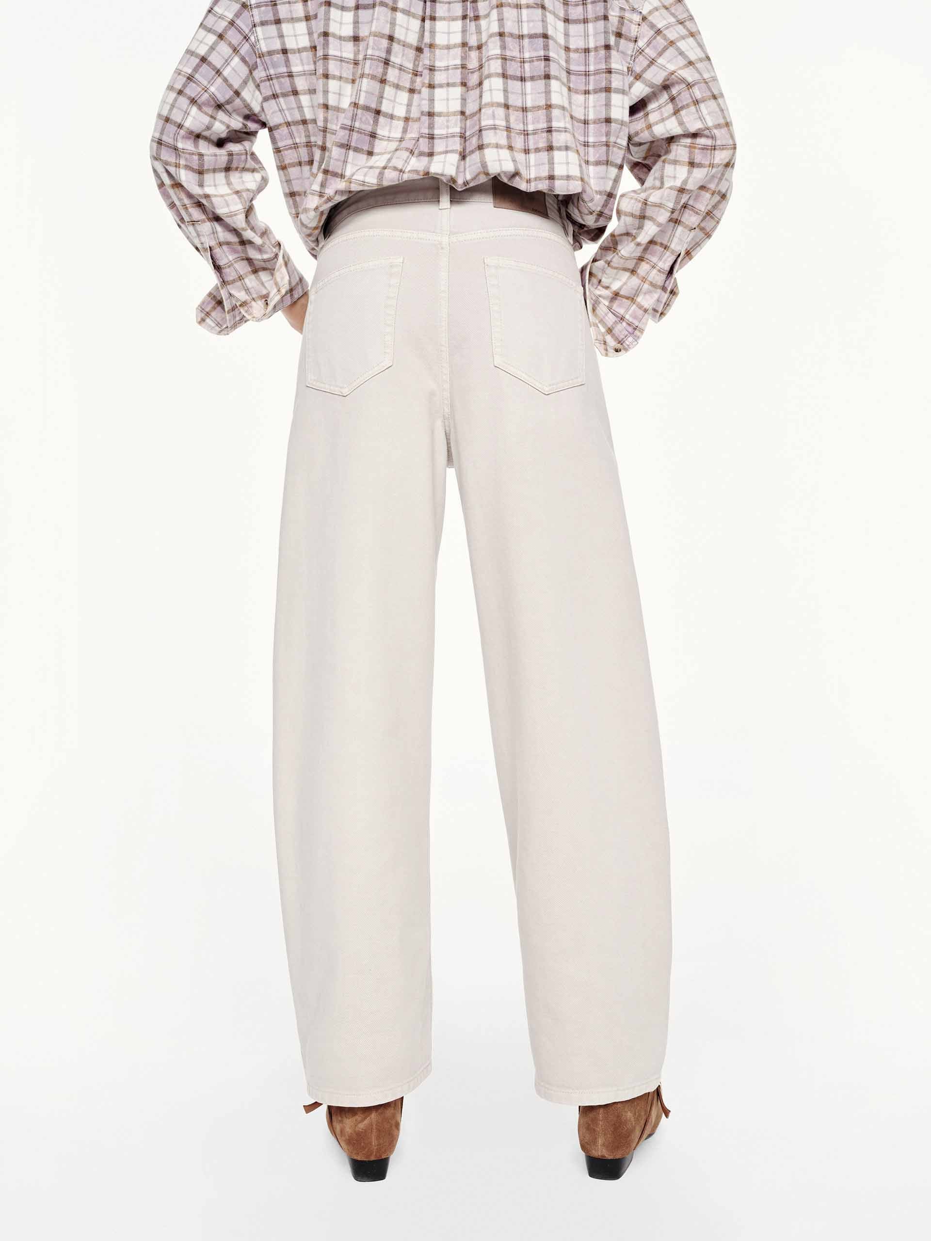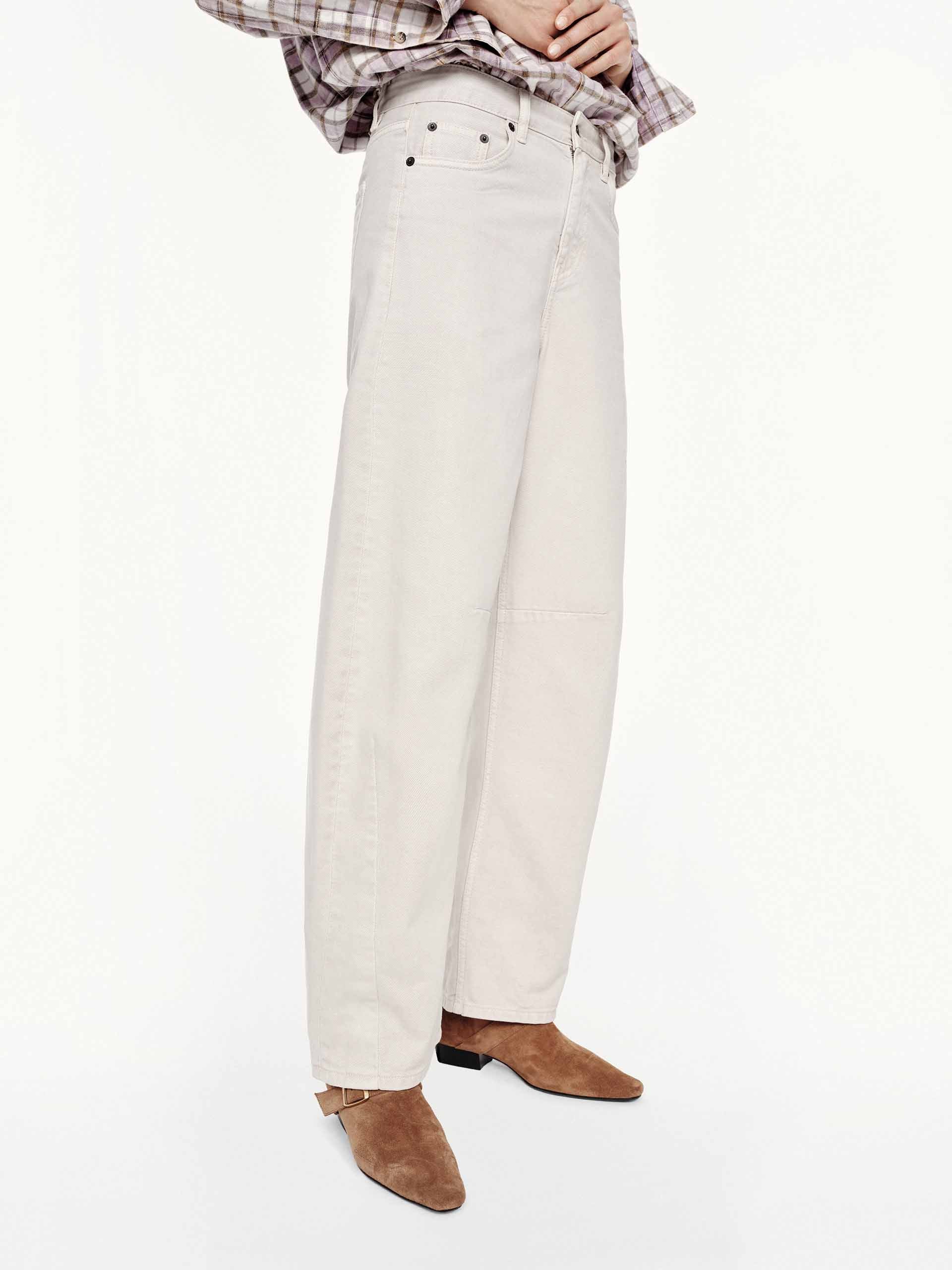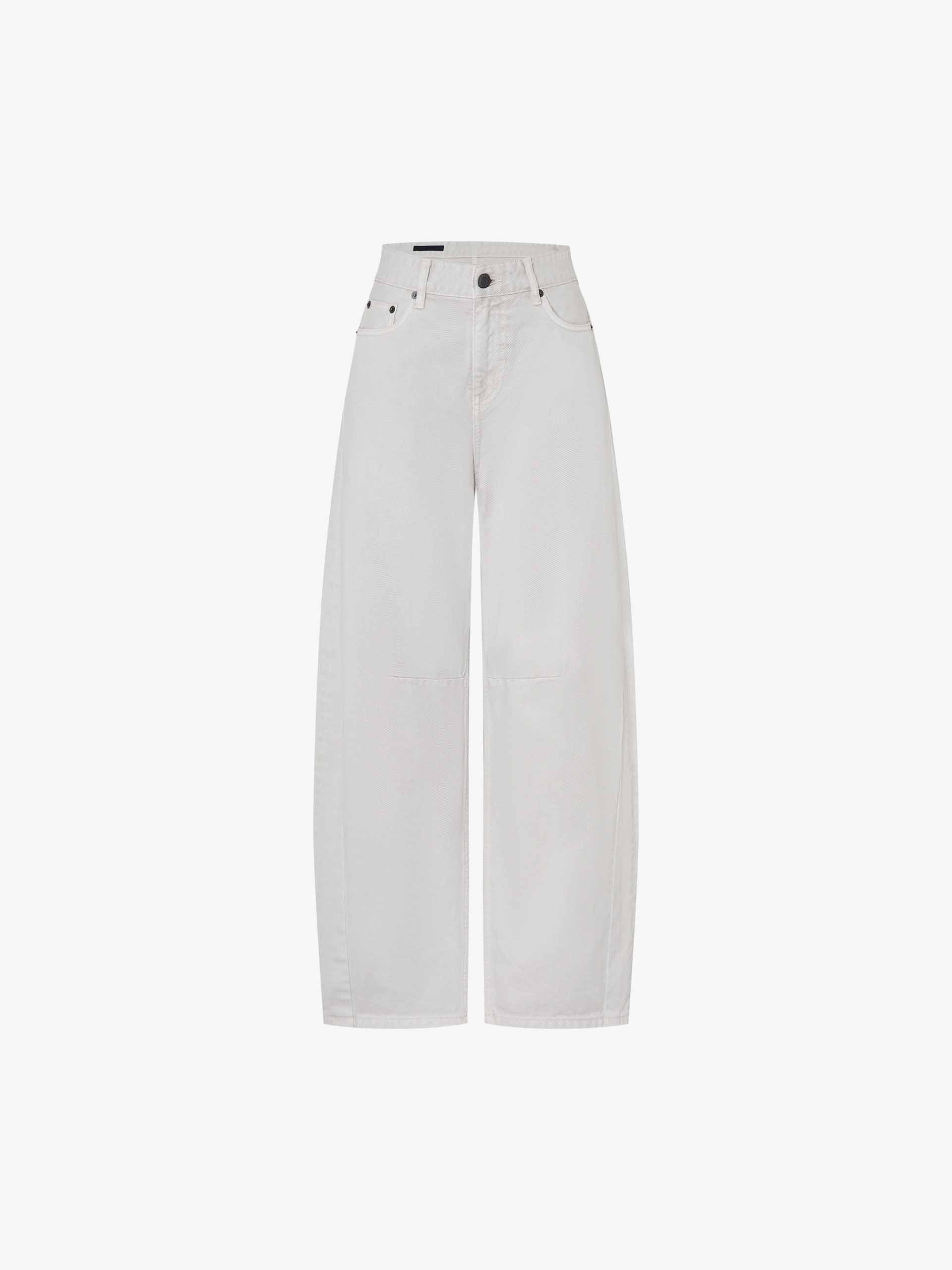 Embrace architectural elegance with these jeans, where bold silhouette meets precision tailoring for a truly statement-making look. The dramatic barrel leg curves away from the body with sculptural flair, creating a modern, fashion-forward shape that's both striking and wearable. The strategic darts at the knees enhance the rounded leg shape, while wrap-around seams add subtle texture and dimension.