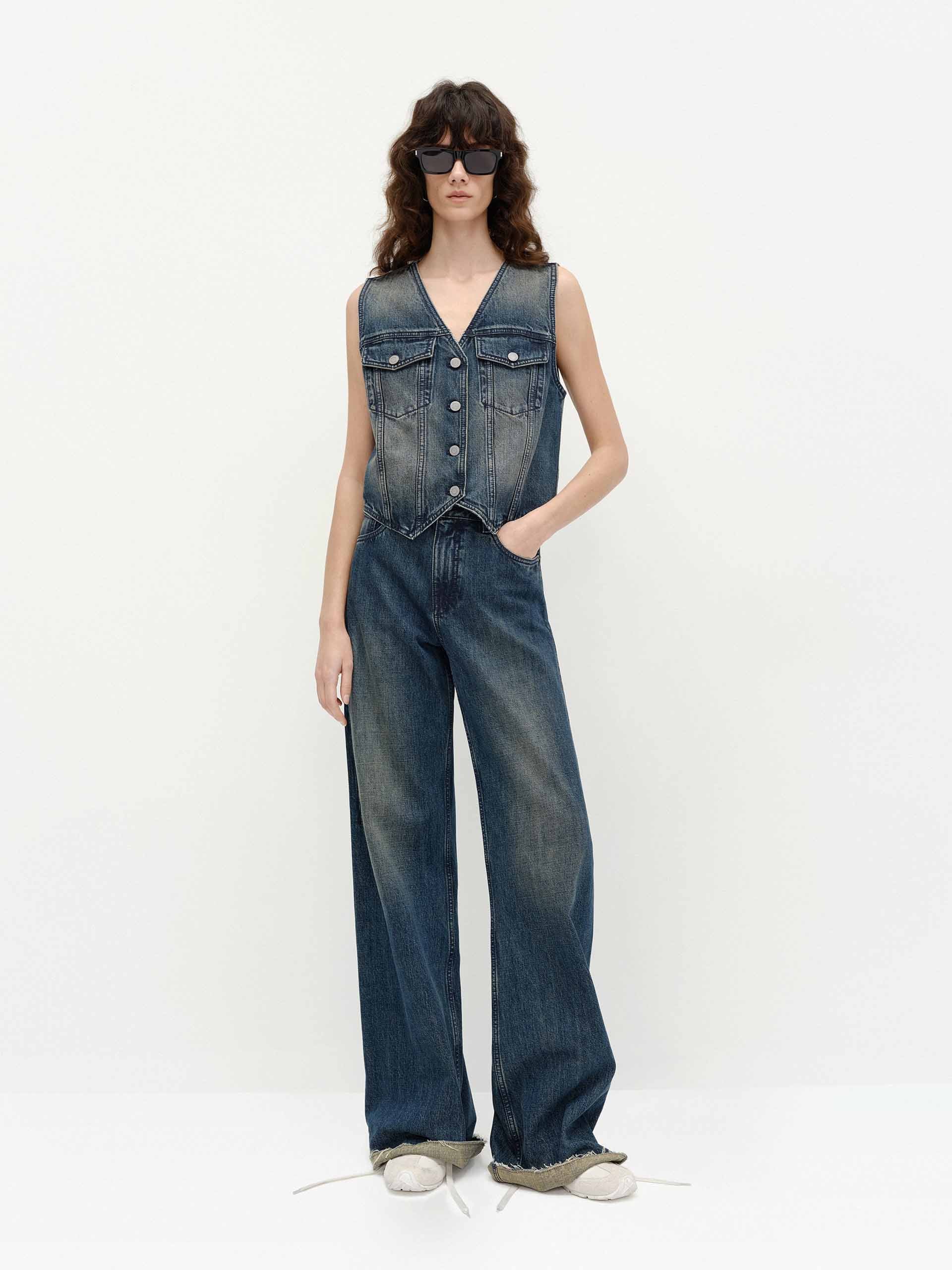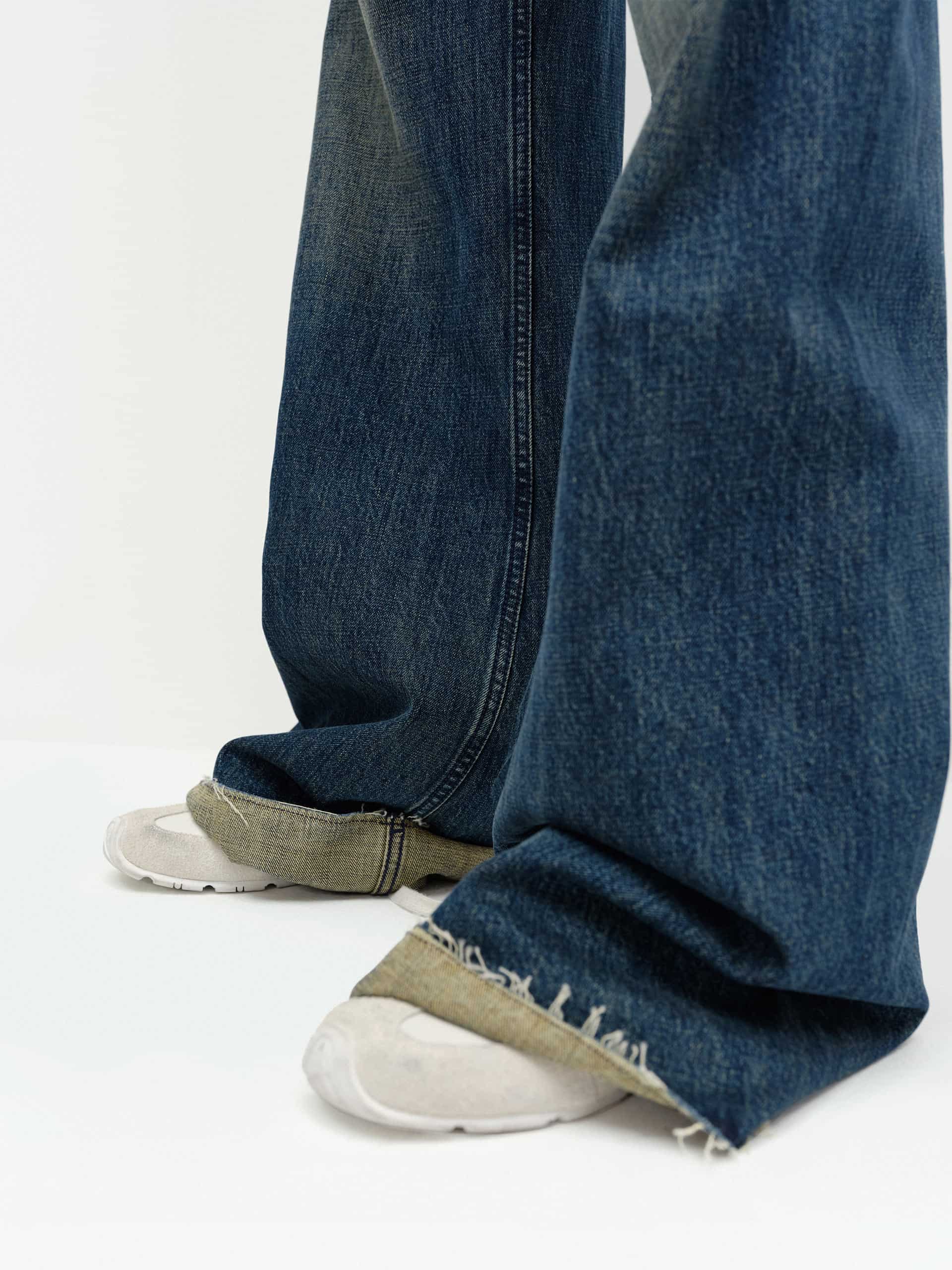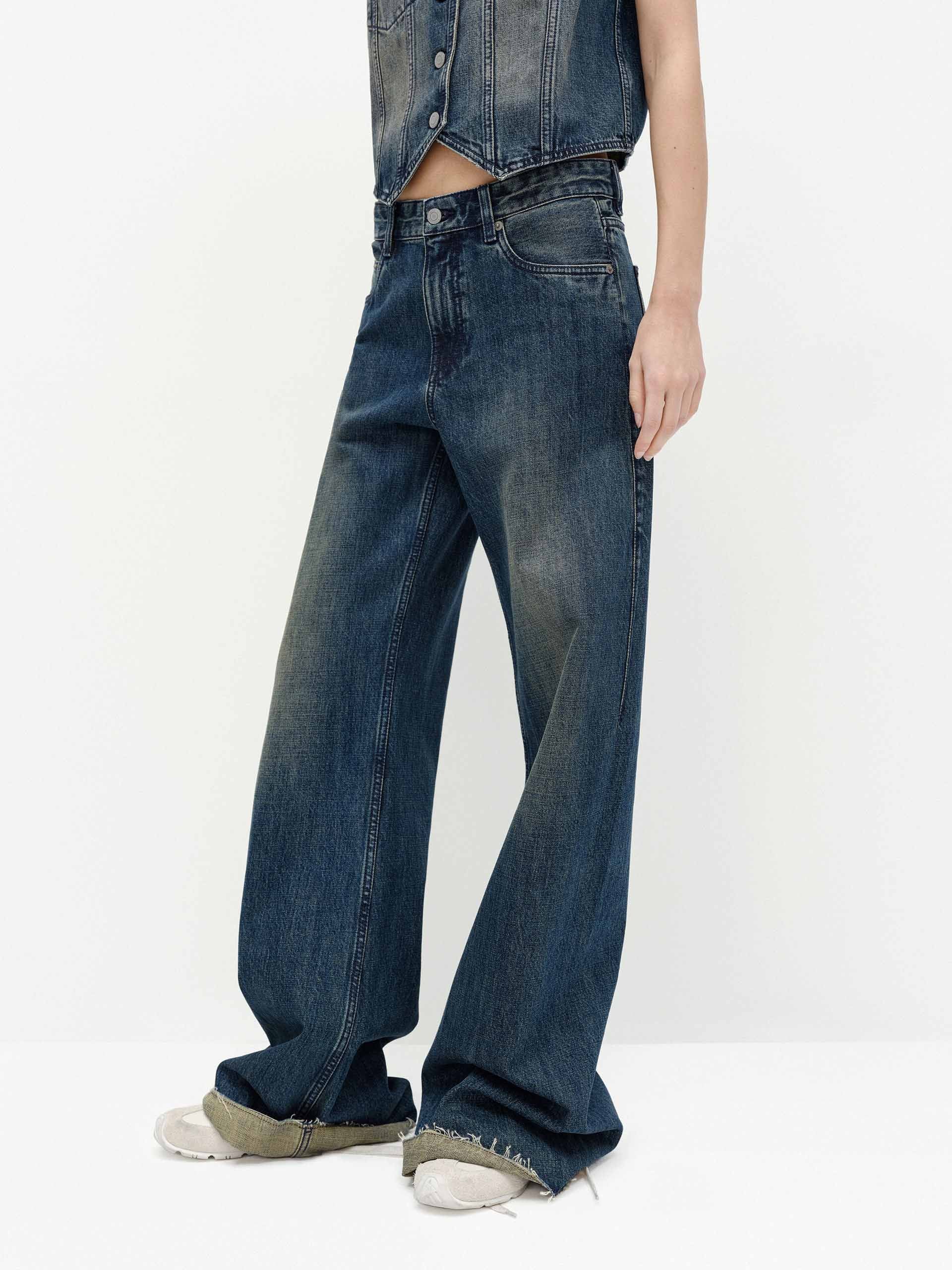 These jeans are made from 100% cotton, ensuring maximum comfort and durability. Featuring vintage wash details with a straight leg and full-length cut, they include raw hem details for a modern edge and classic five-pocket styling for functionality and a traditional denim aesthetic. Wear it with a coordinating waistcoat.
