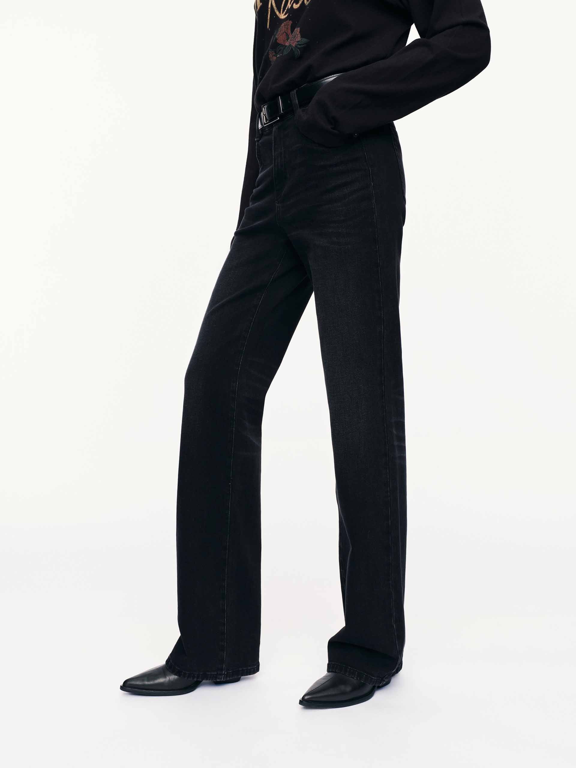 - Mid waist, full length, straight leg