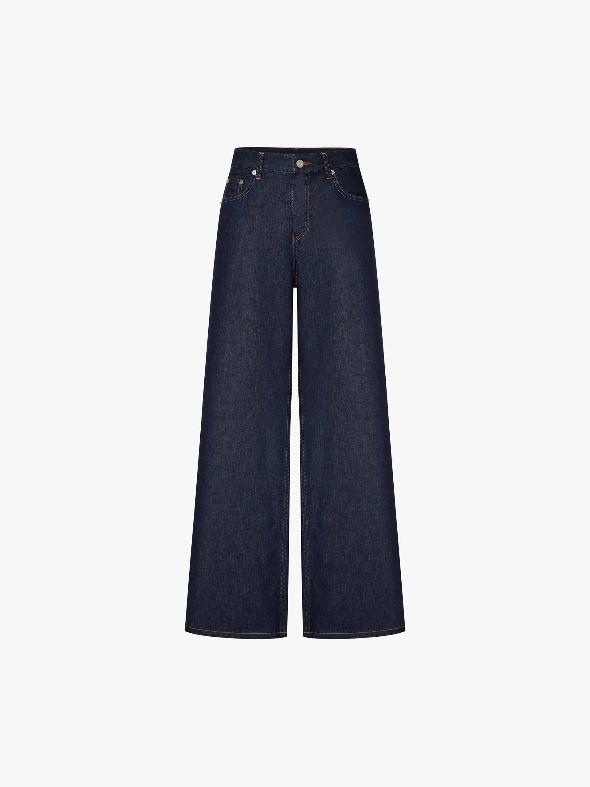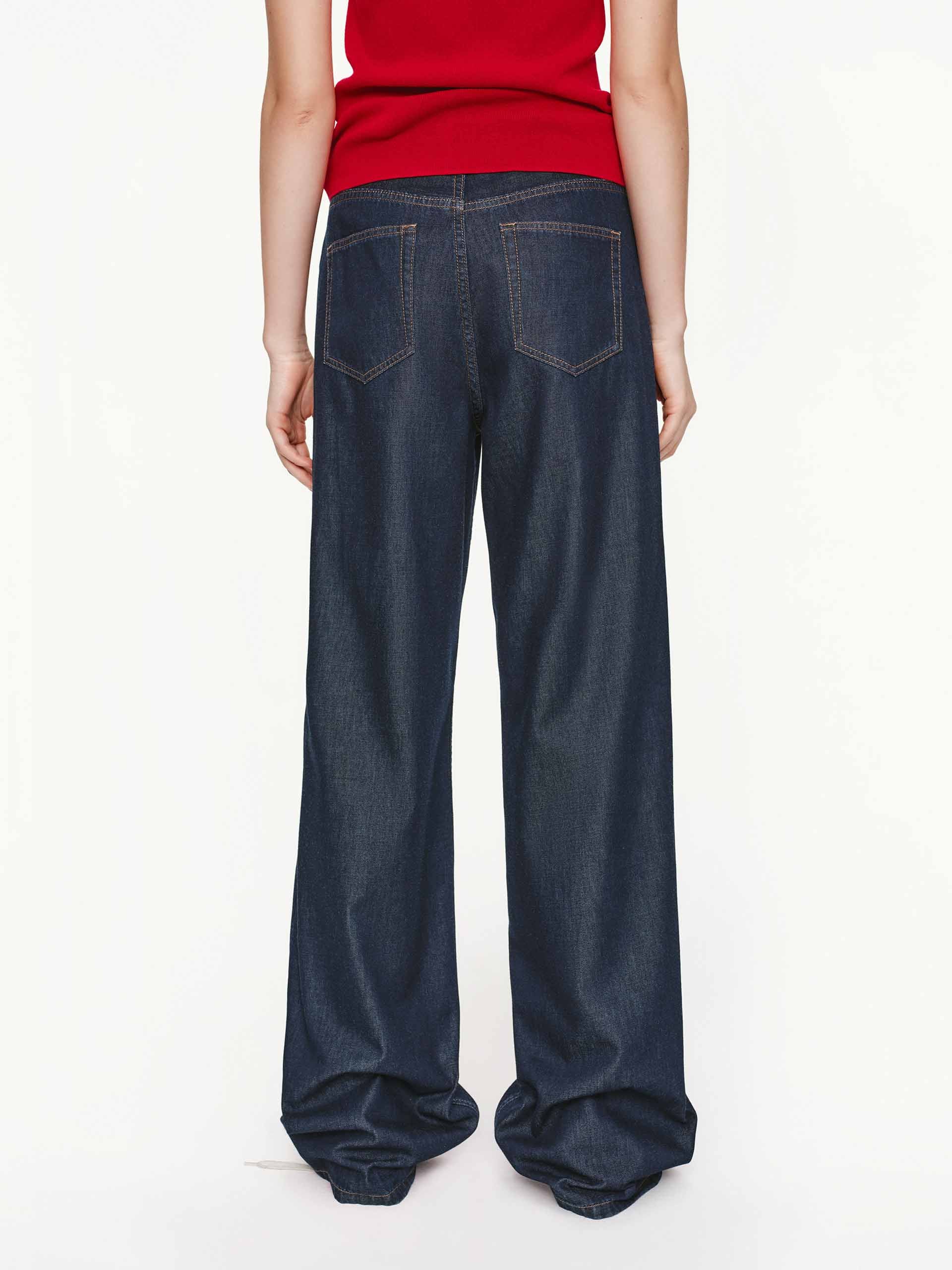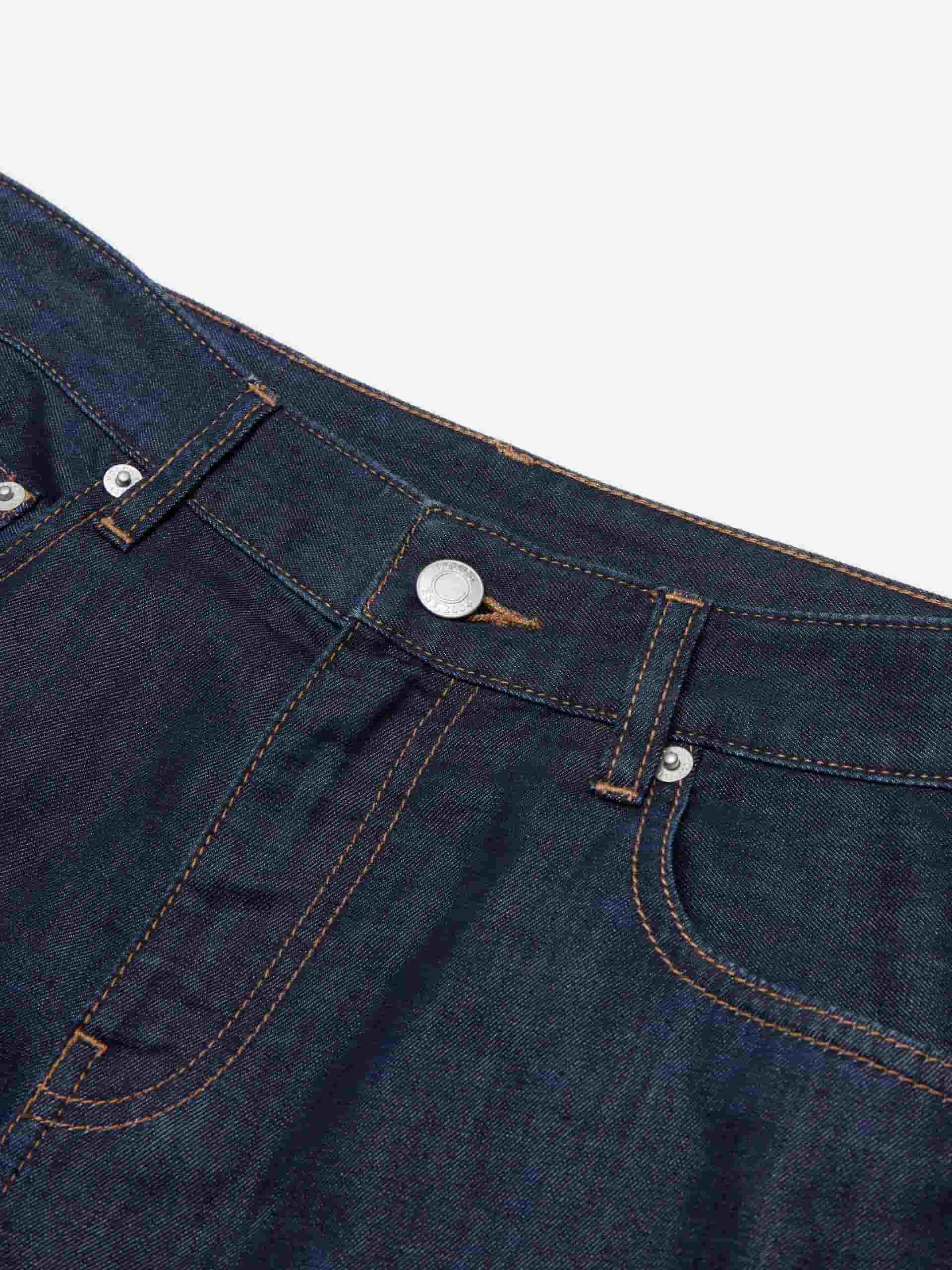 A wardrobe essential reimagined, these jeans deliver classic denim appeal with modern wearability. Designed for both style and function, they feature a traditional five-pocket layout and secure zip-button closure, complete with a premium leather logo patch at the back waistband for a subtle branded touch. The deep-indigo hue is offset by tobacco topstitching.