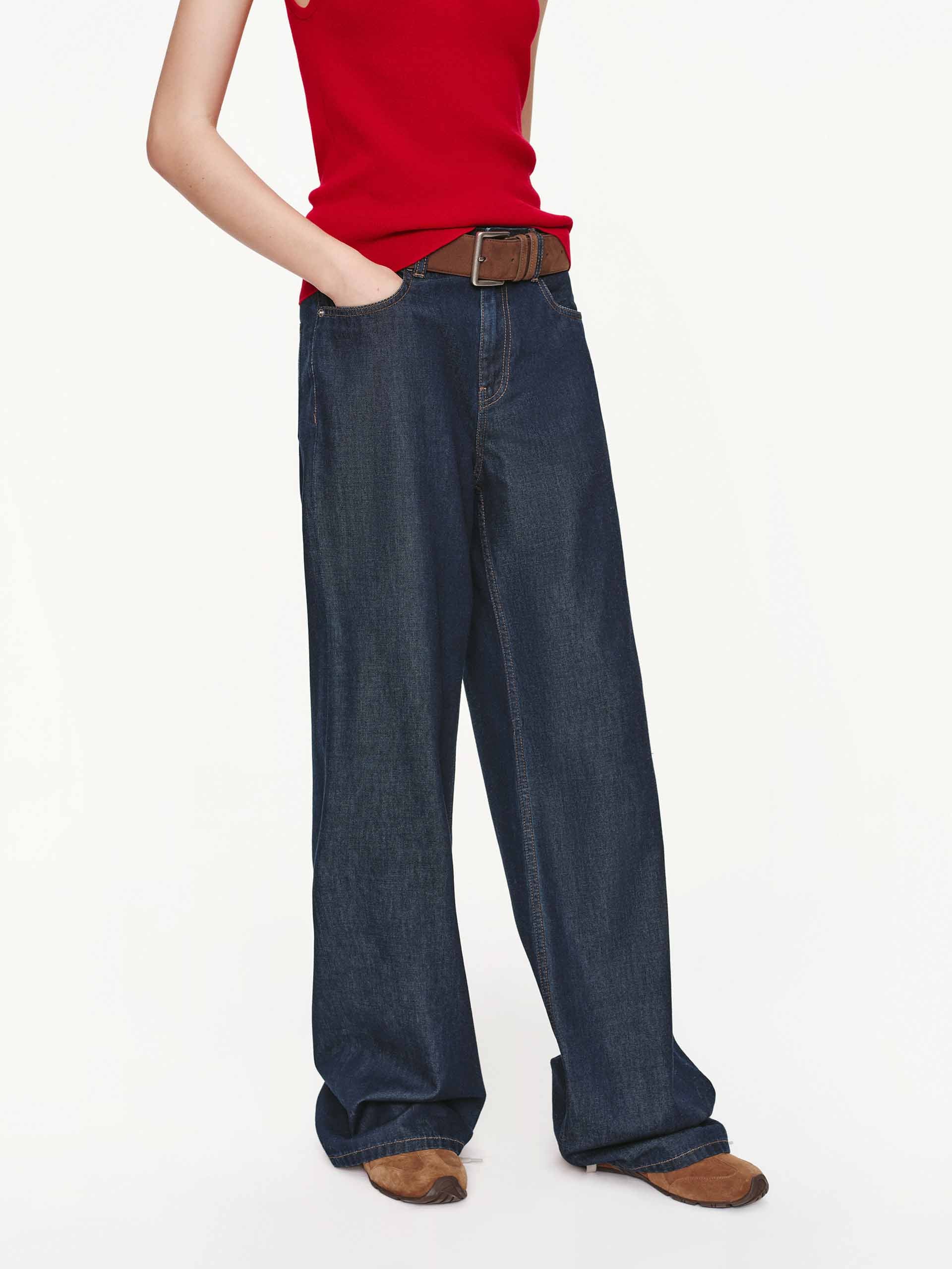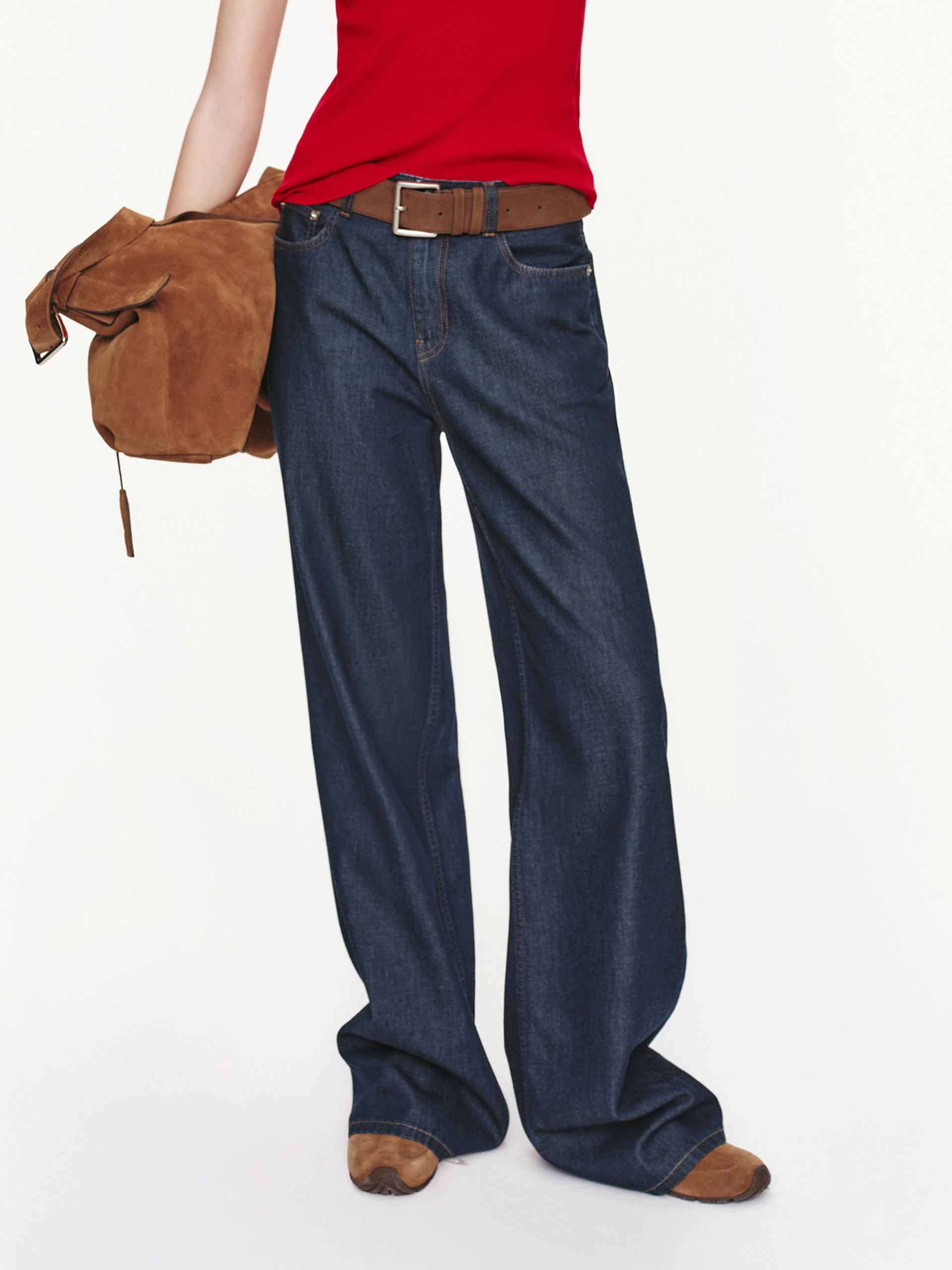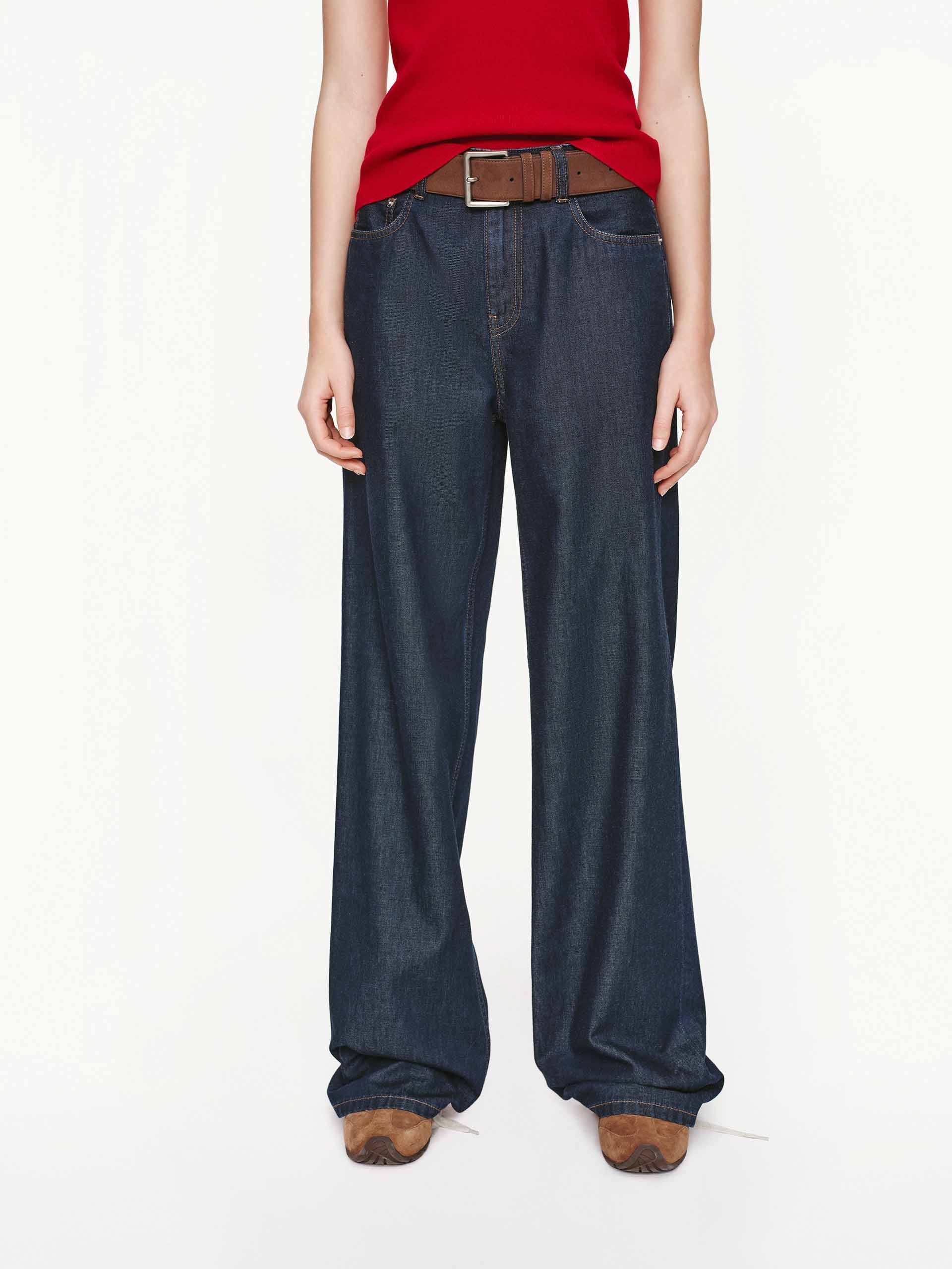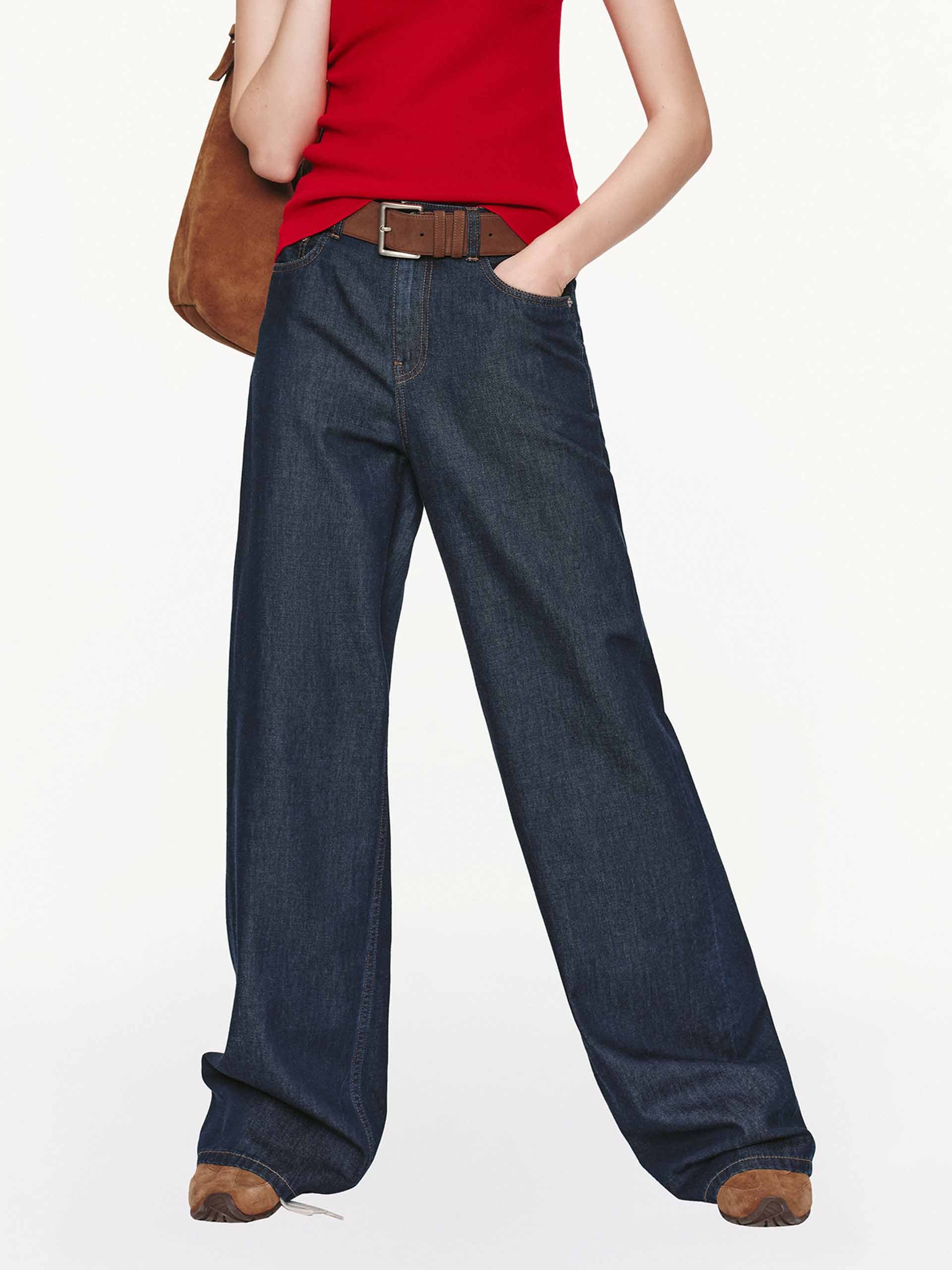 A wardrobe essential reimagined, these jeans deliver classic denim appeal with modern wearability. Designed for both style and function, they feature a traditional five-pocket layout and secure zip-button closure, complete with a premium leather logo patch at the back waistband for a subtle branded touch. The deep-indigo hue is offset by tobacco topstitching.