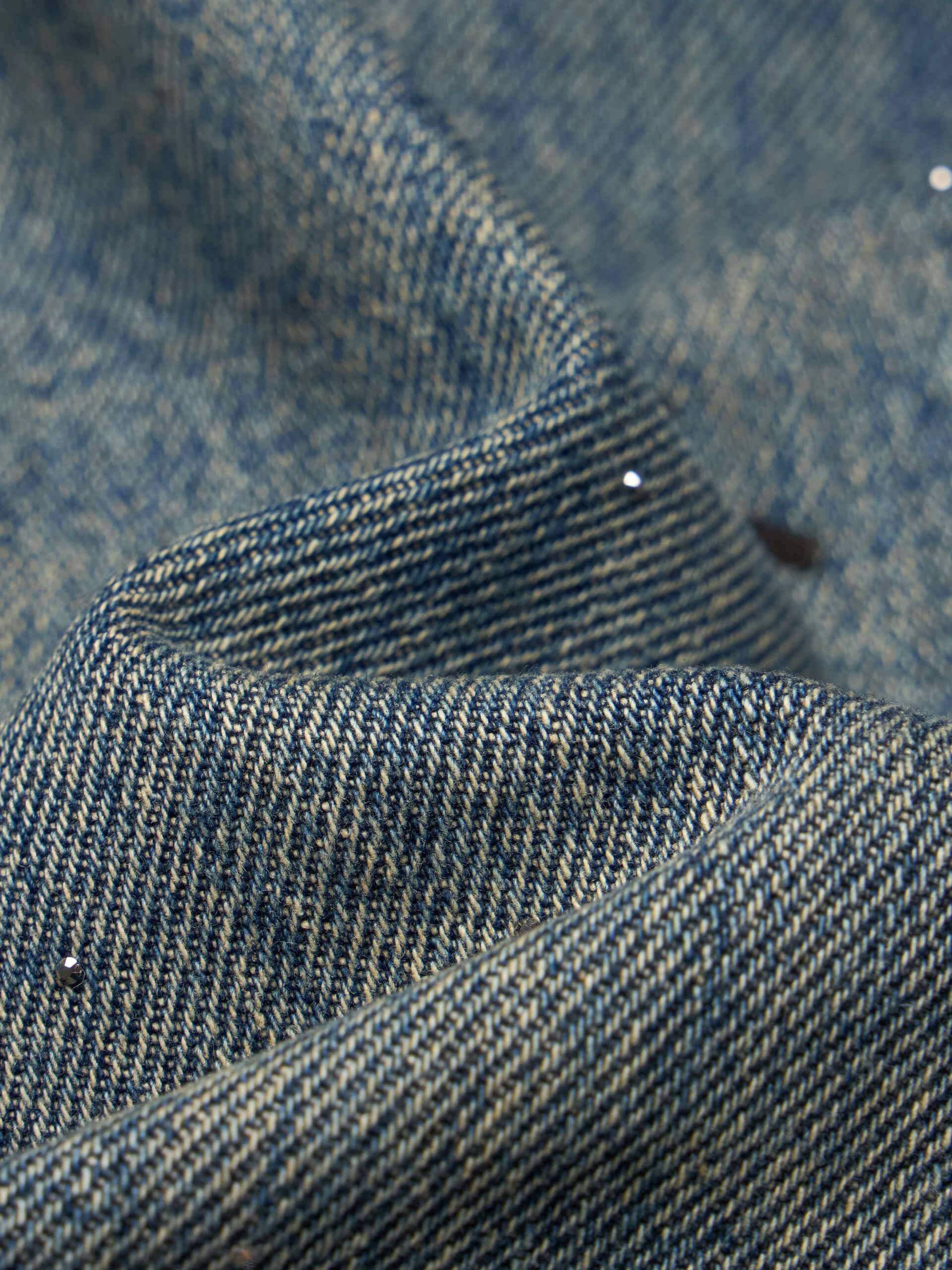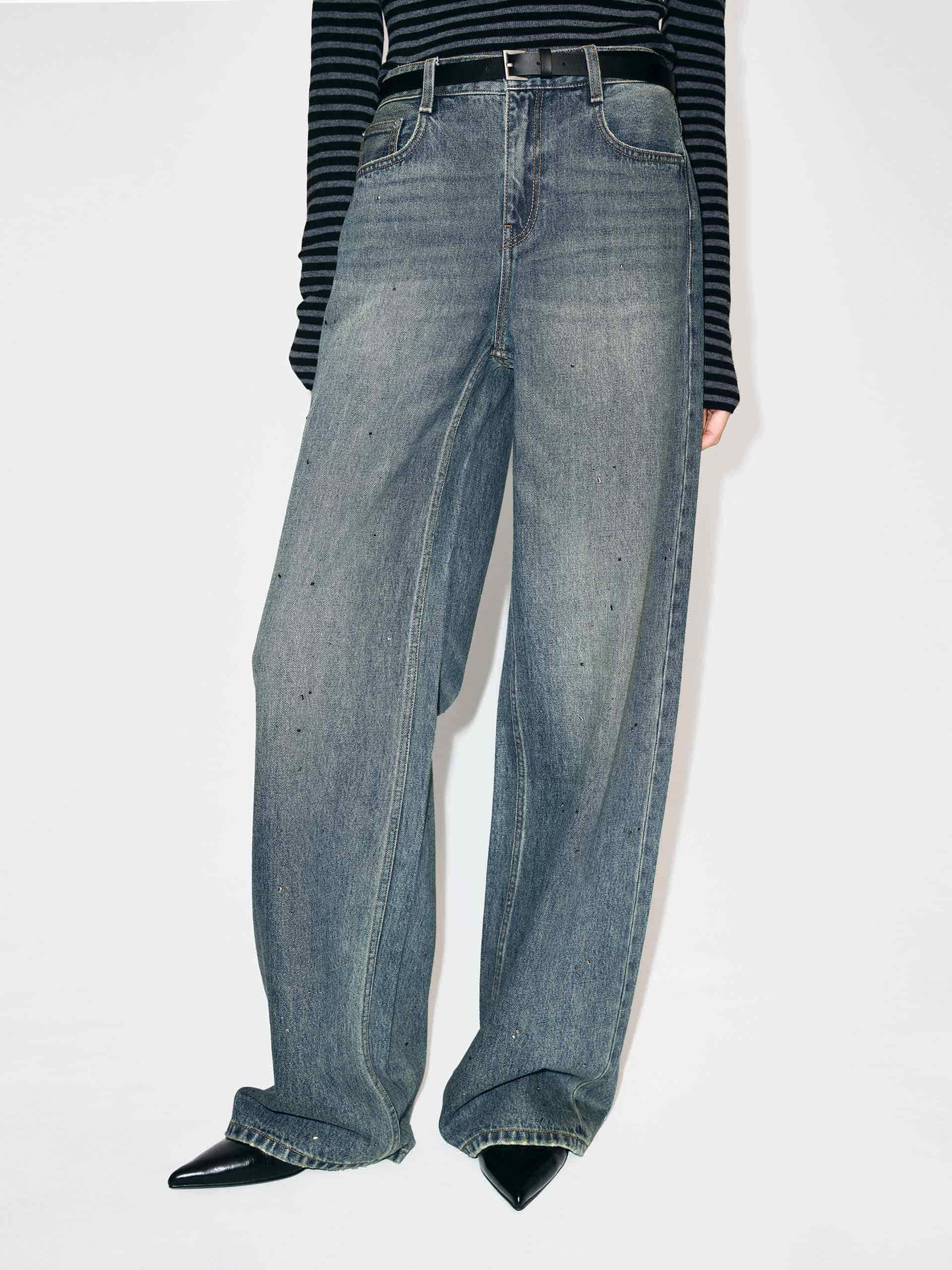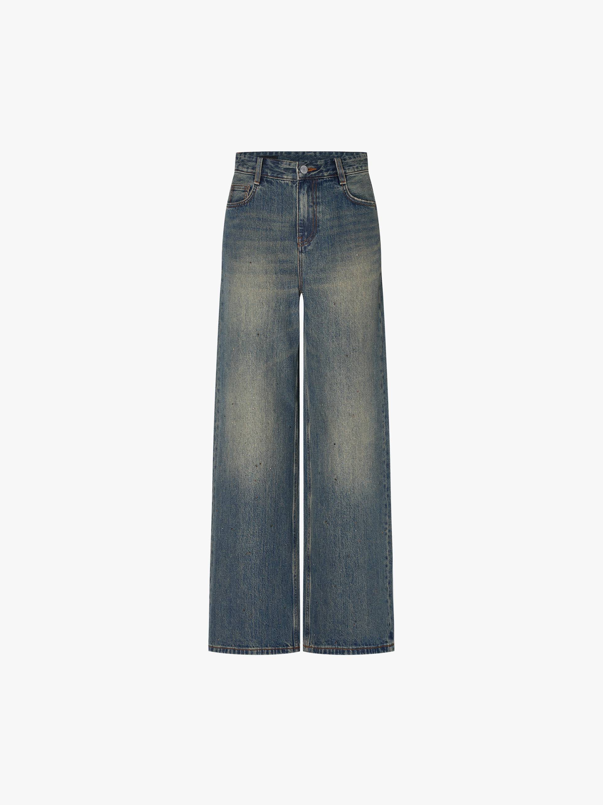 Combine classic denim appeal with dazzling detail in these jeans. The timeless straight-leg silhouette and faded wash offer a versatile, lived-in look that pairs effortlessly with any style. The standout feature is the meticulously applied hotfix rhinestone detailing, which adds a touch of glamour and individuality to each pair.