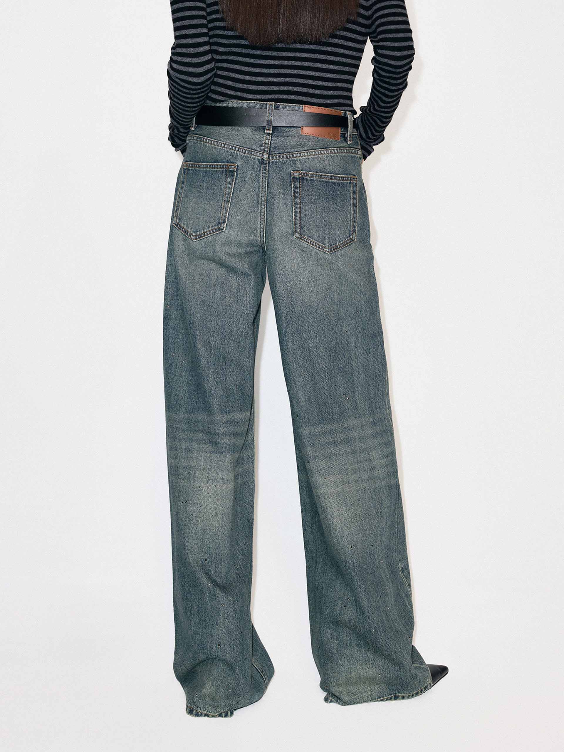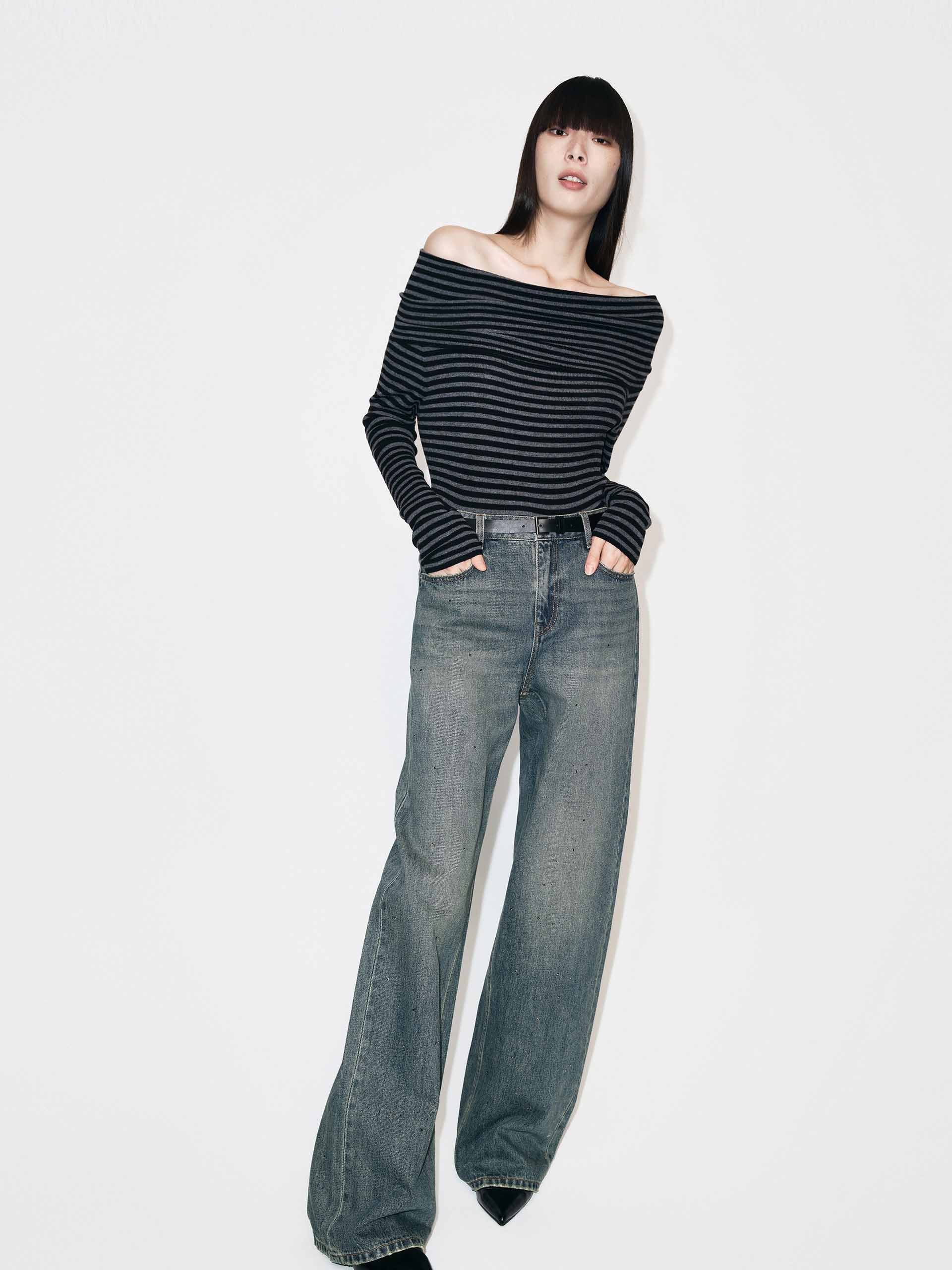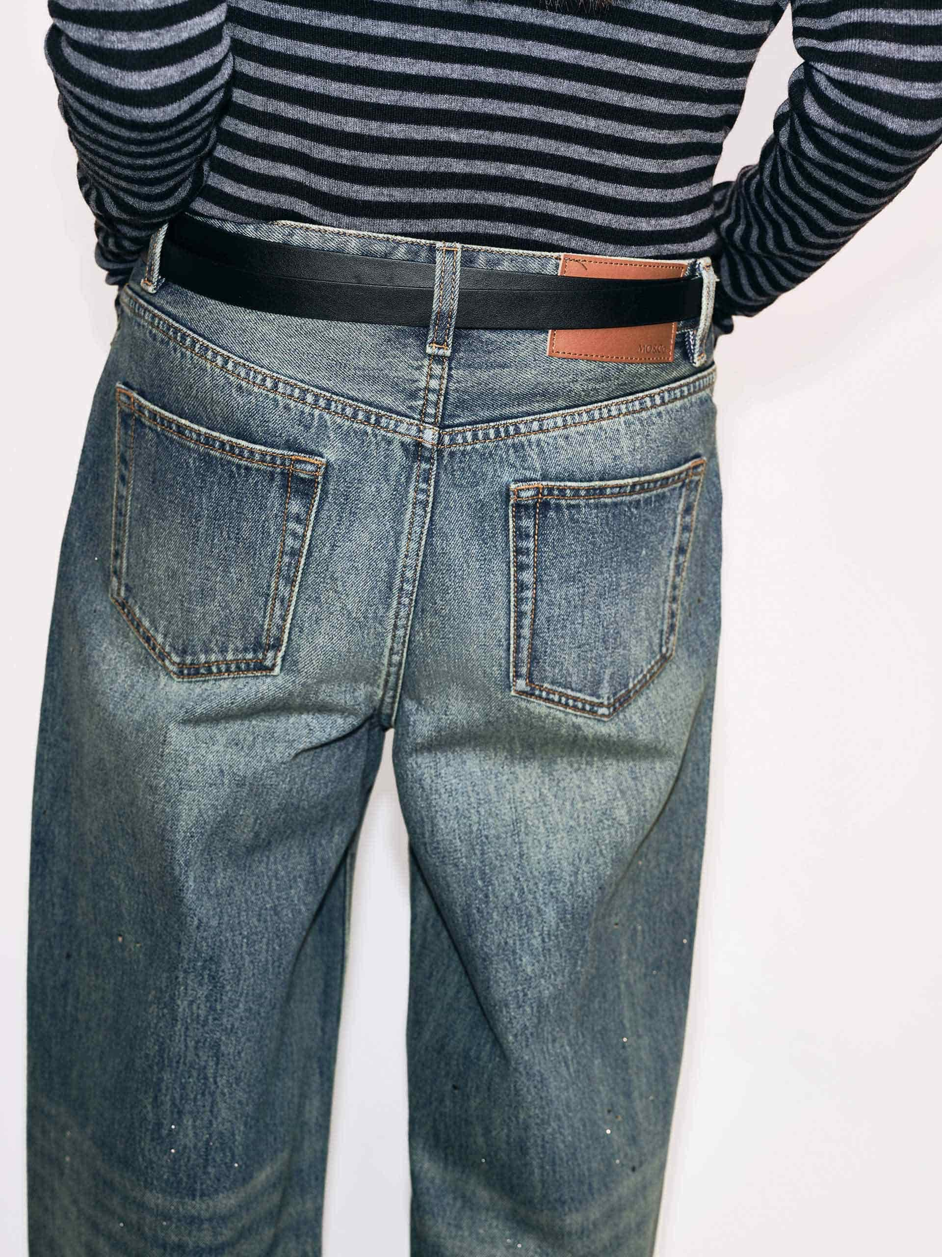 Combine classic denim appeal with dazzling detail in these jeans. The timeless straight-leg silhouette and faded wash offer a versatile, lived-in look that pairs effortlessly with any style. The standout feature is the meticulously applied hotfix rhinestone detailing, which adds a touch of glamour and individuality to each pair.