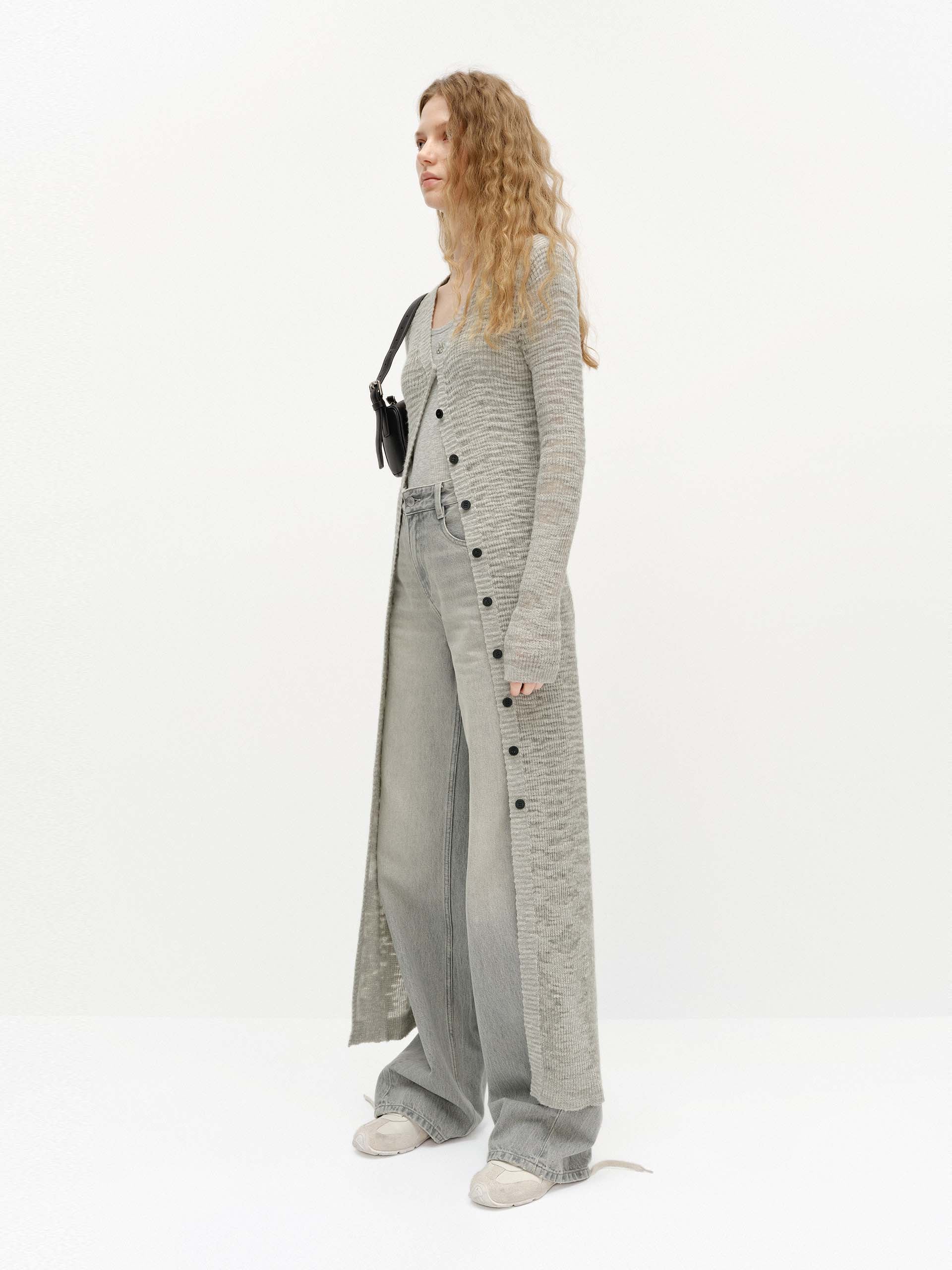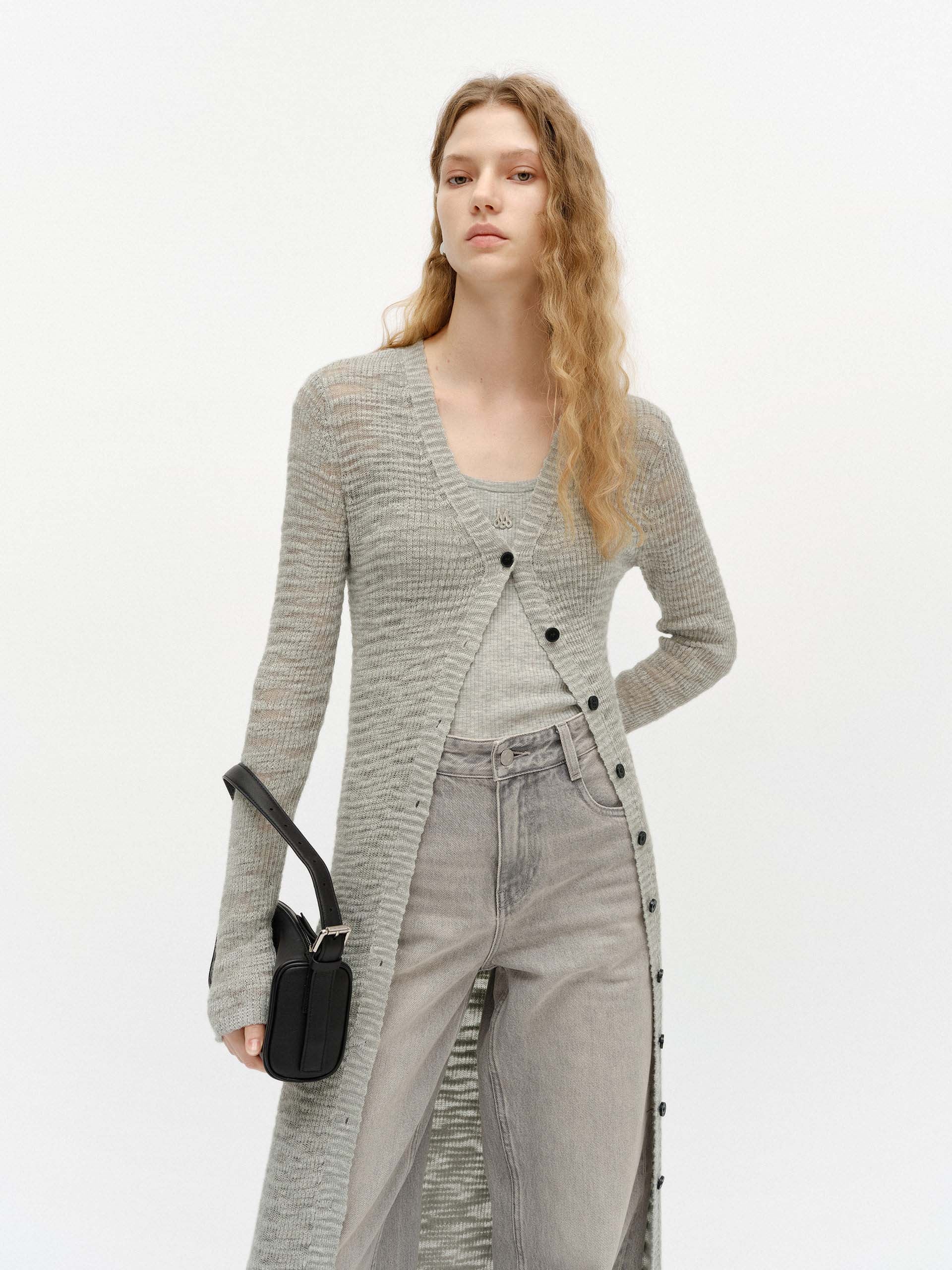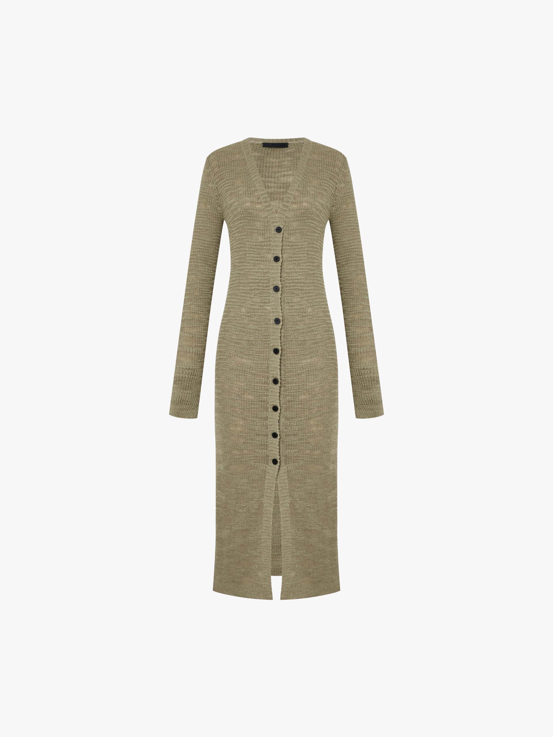 This cardigan is perfect for spring styling and seasonal transitions. It is crafted from a comfortable linen blend, offering a soft and cozy feel. Designed with a longline silhouette, it features a round neck and a button closure for a classic and chic look.