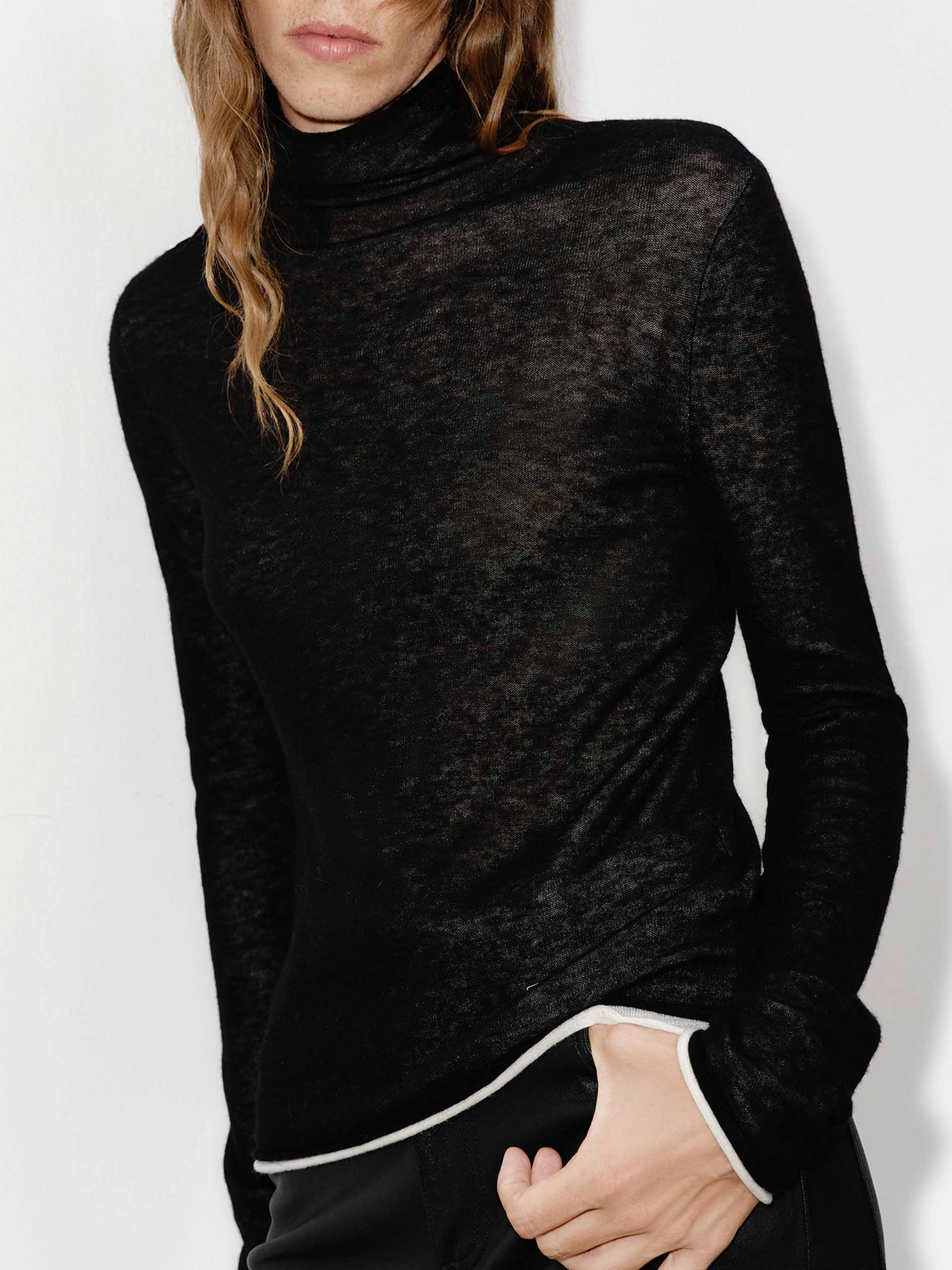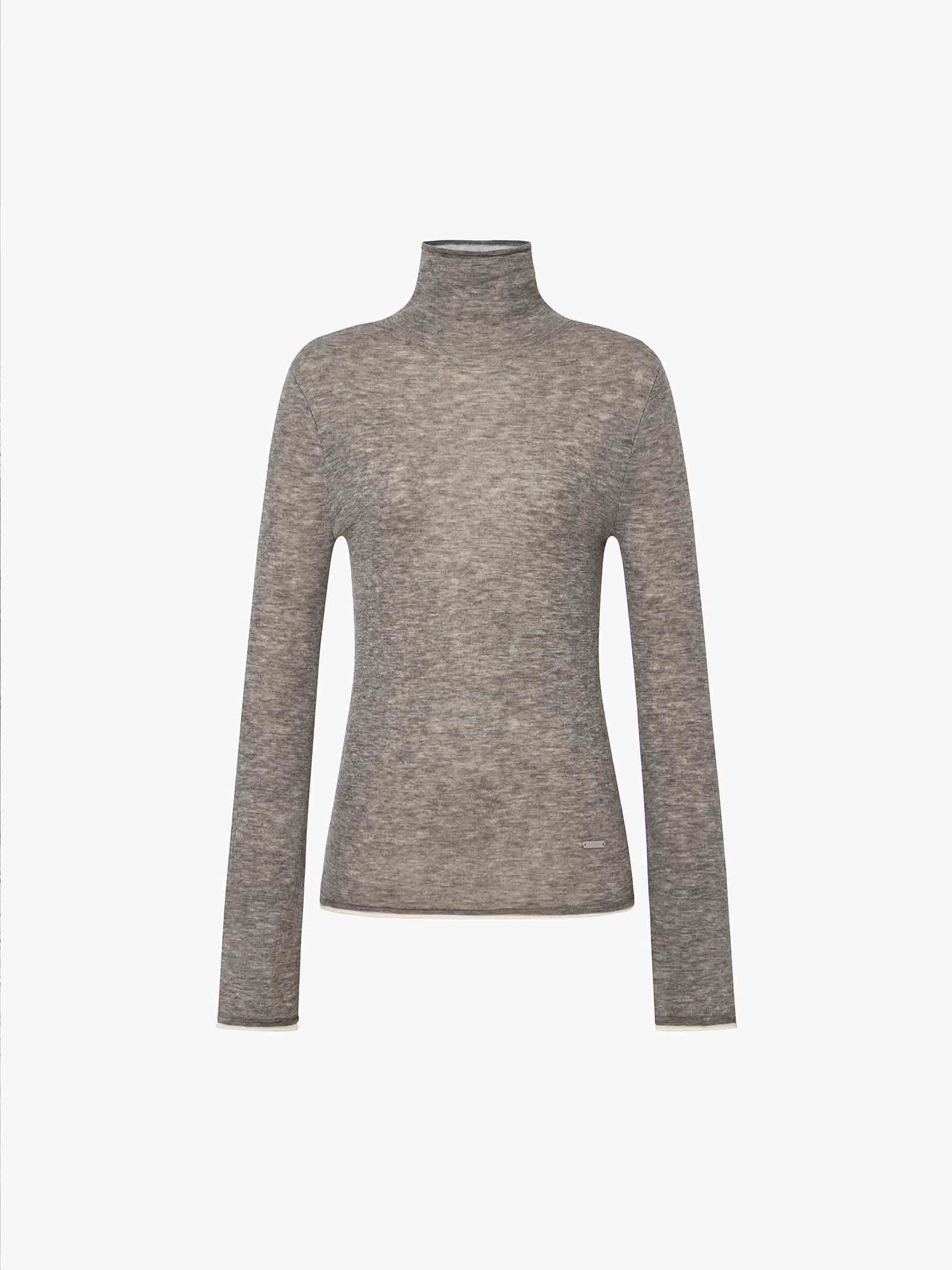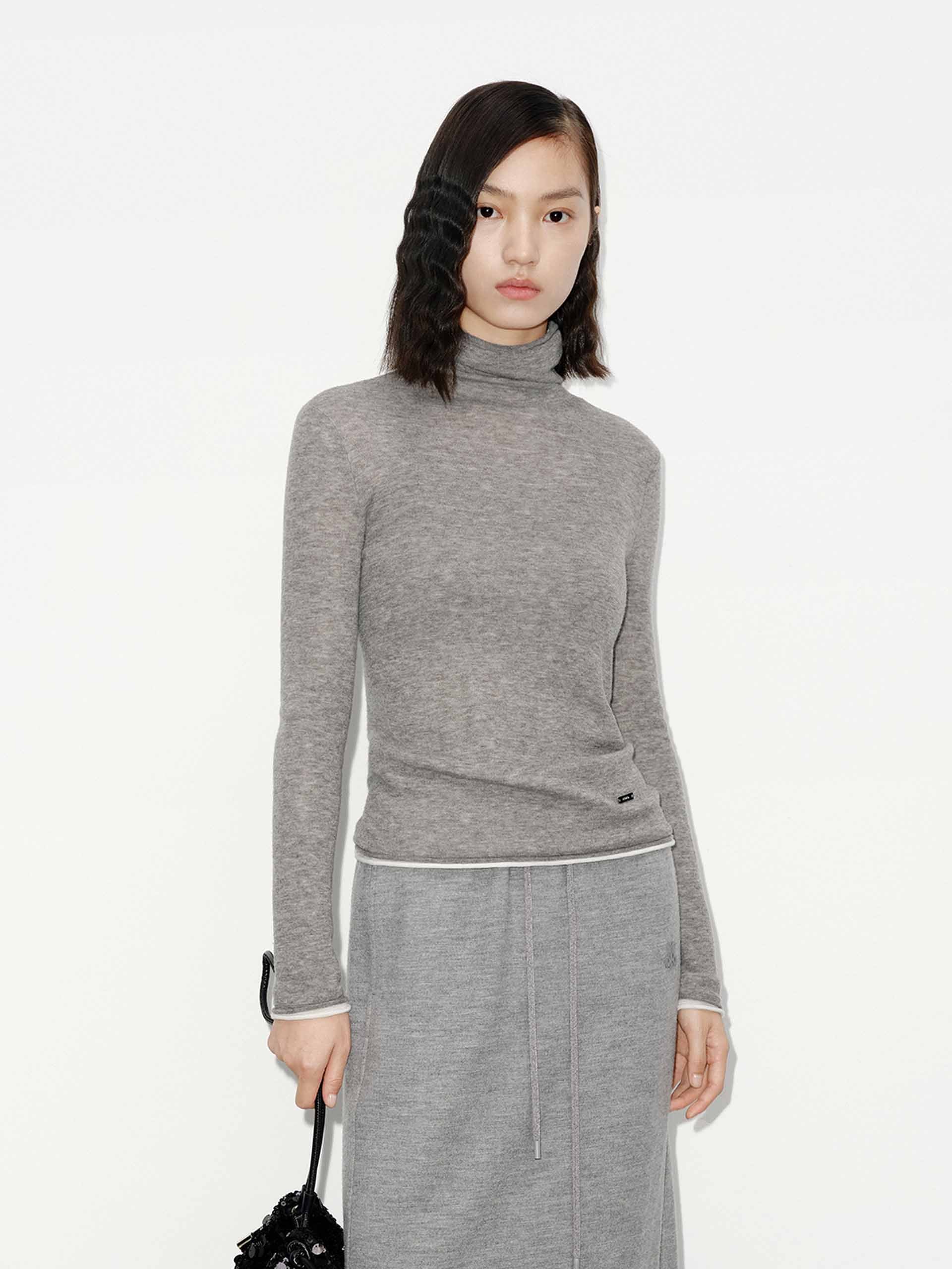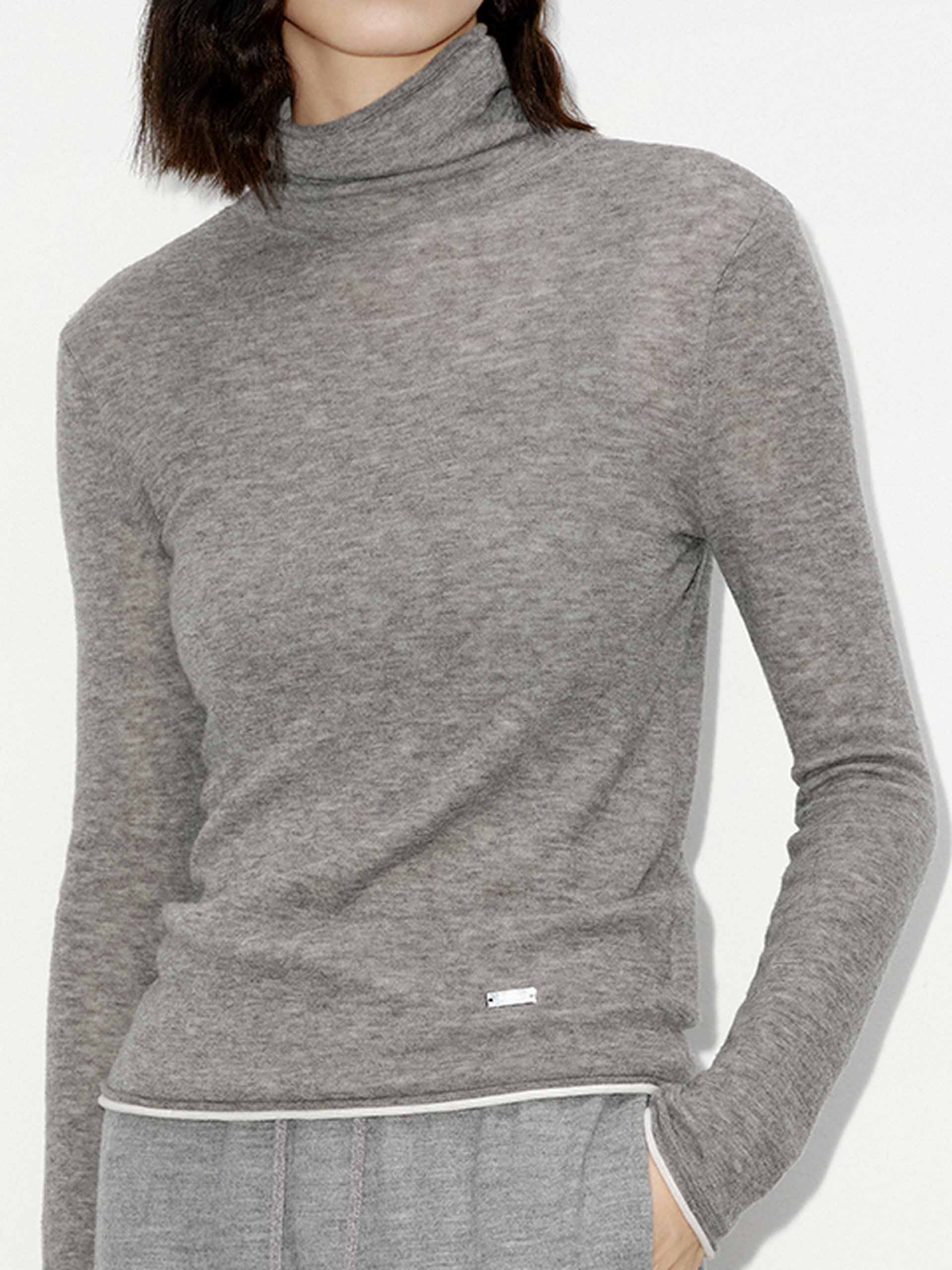 Crafted from pure wool, this knit top offers both style and functionality. The contrast trim at the hem and cuffs adds a touch of sophistication to the turtleneck design. With its slim fit, this top is the ideal layering piece for transitioning between seasons.