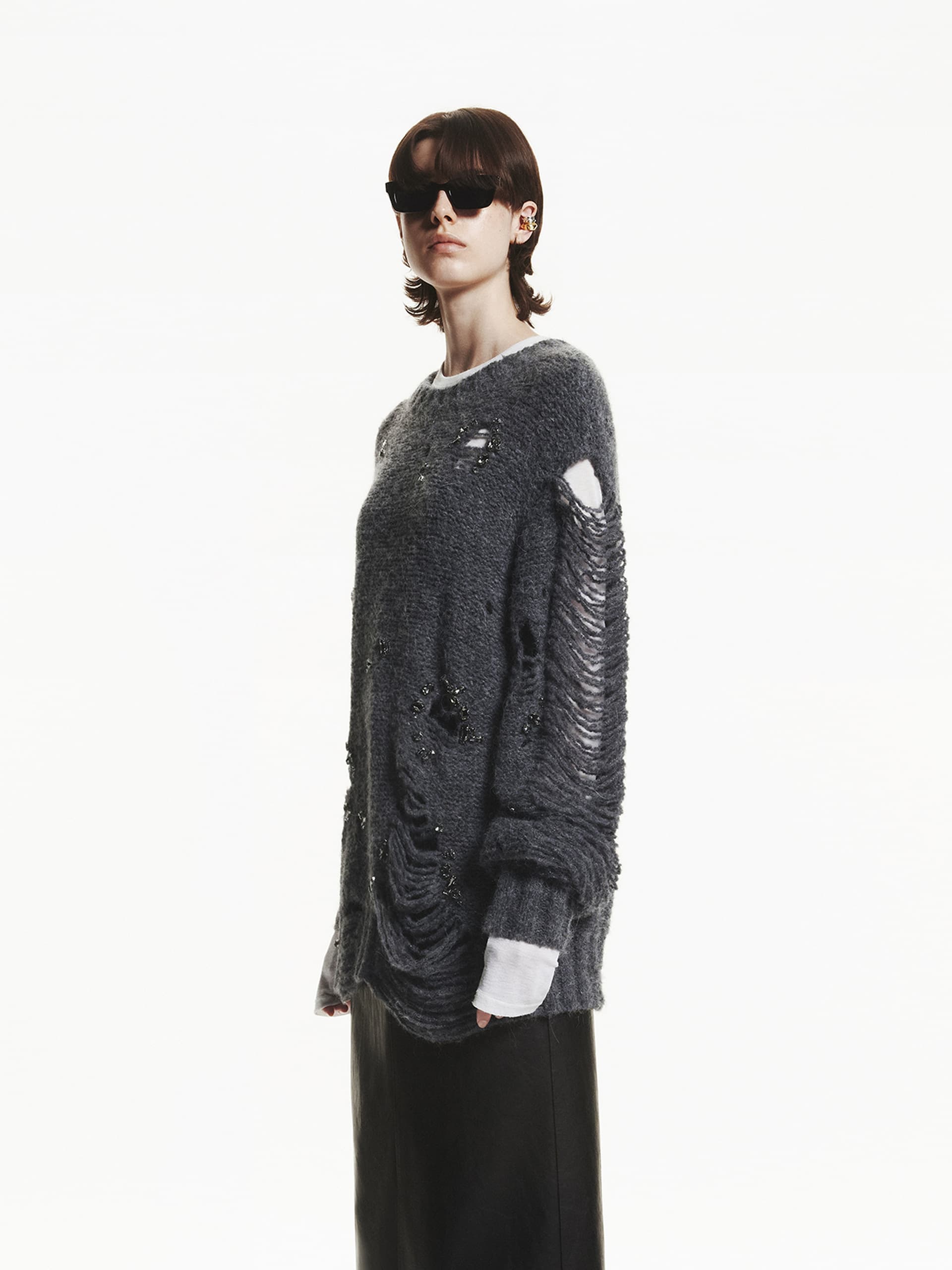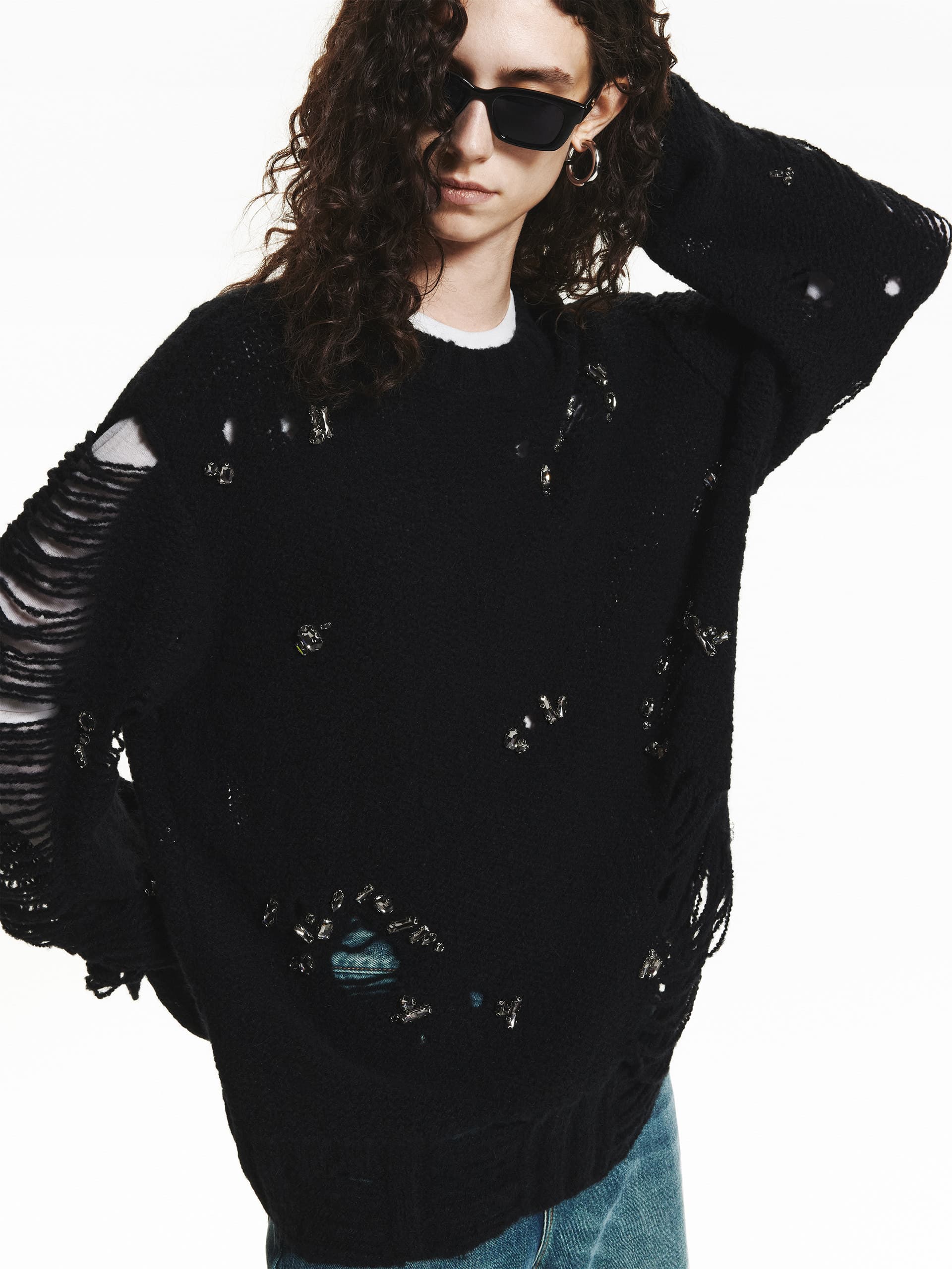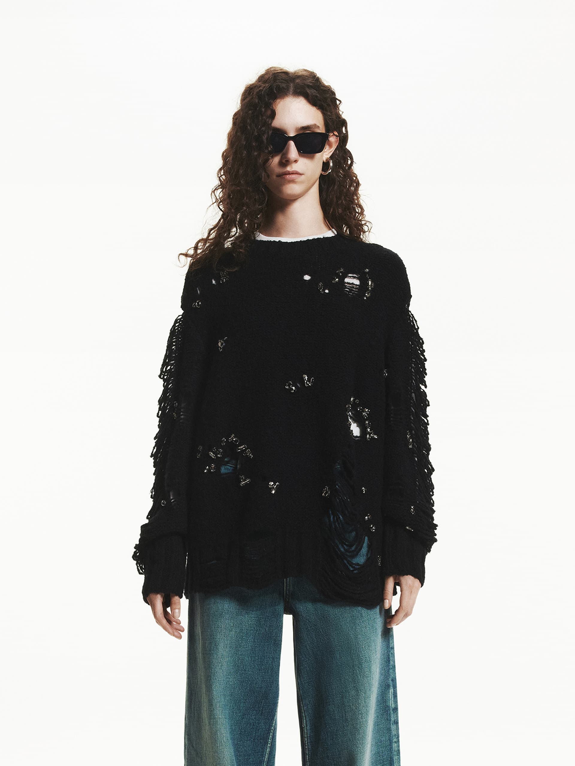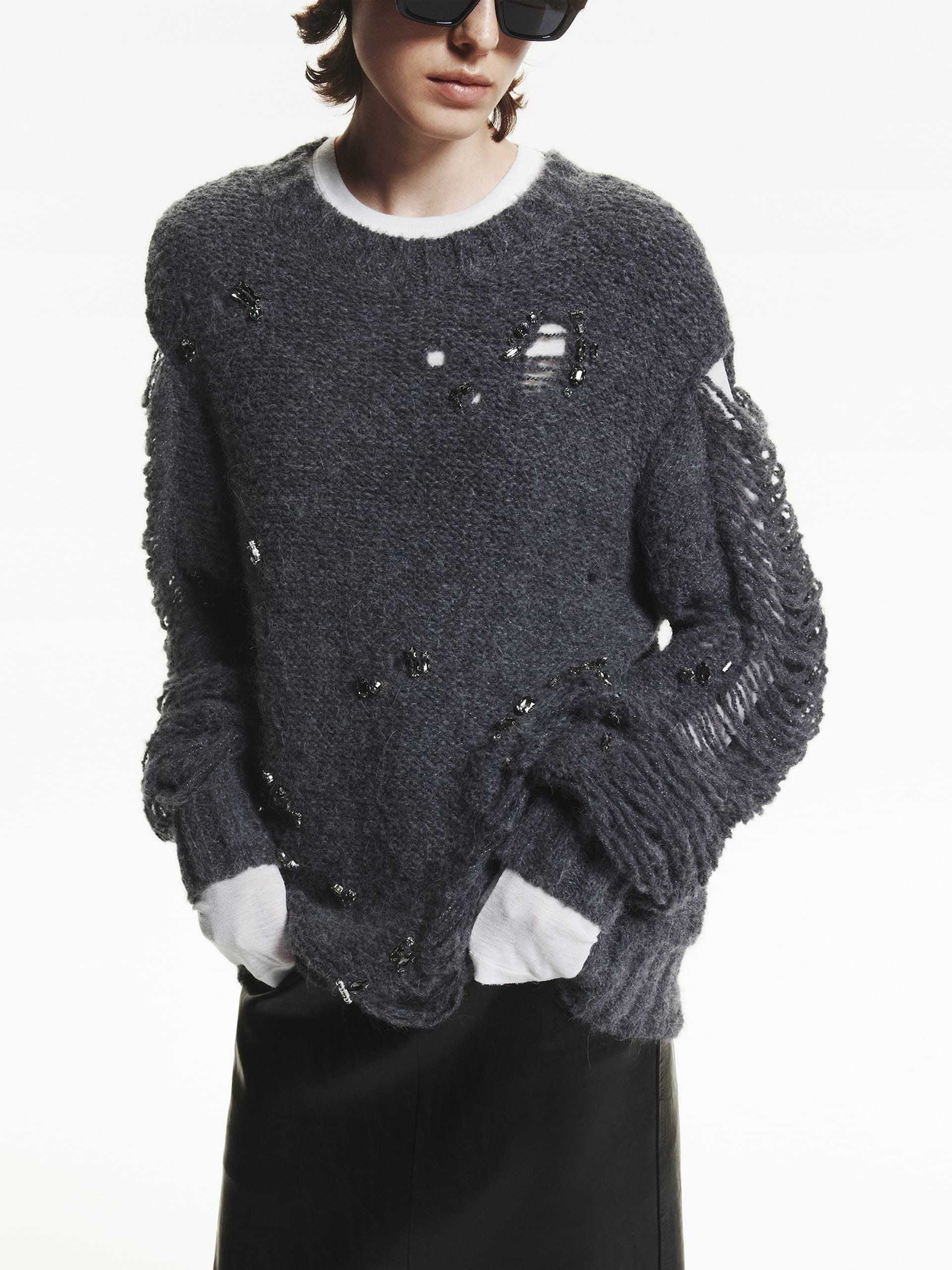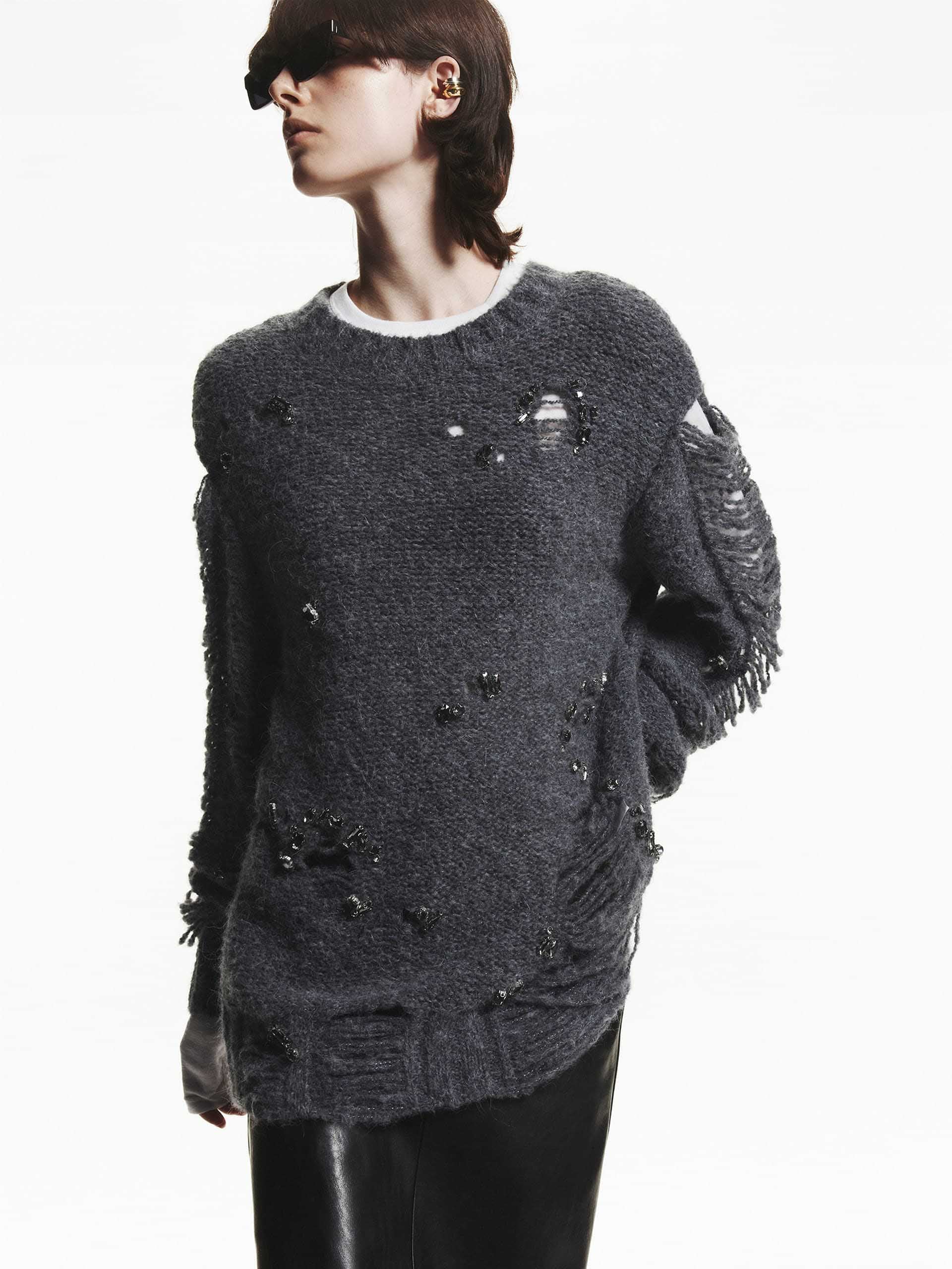 Crafted from a luxurious wool and alpaca blend, this sweater boasts a fluffy touch for ultimate comfort. The irregular distressed design and crystal embellishment add a unique touch, while the loose fit allows for easy wear.