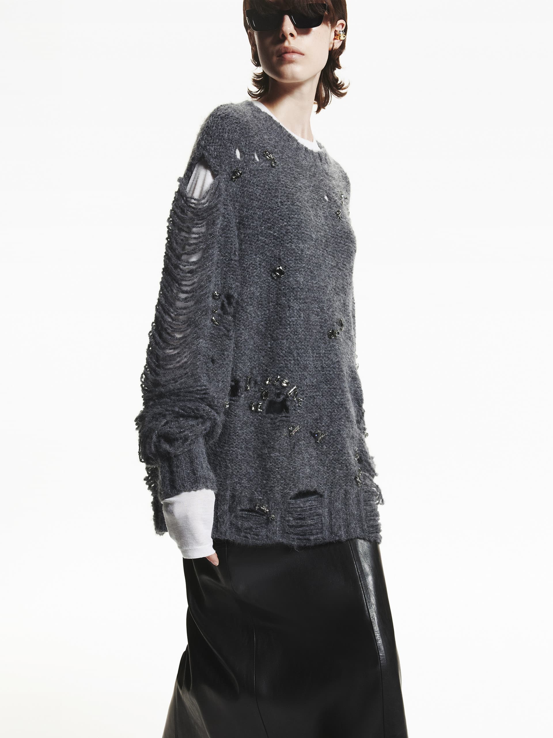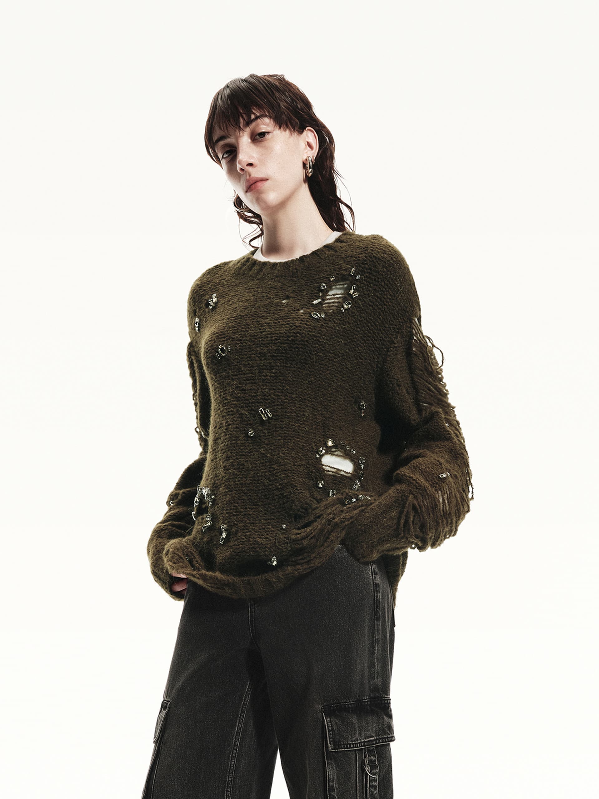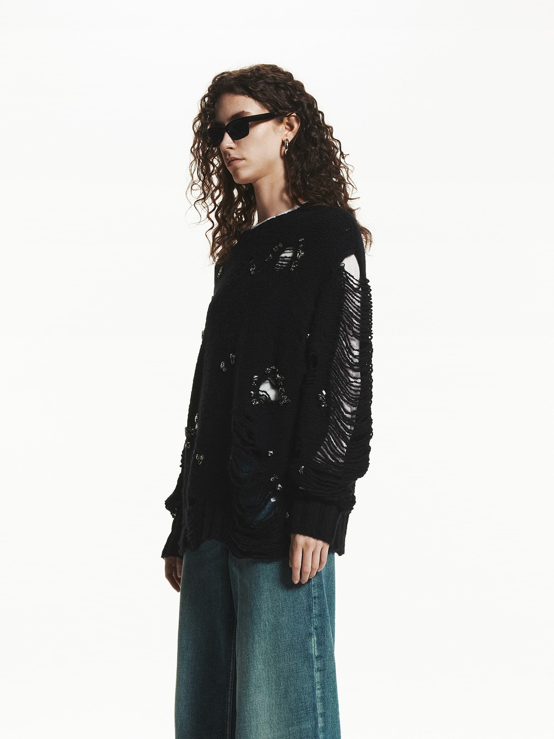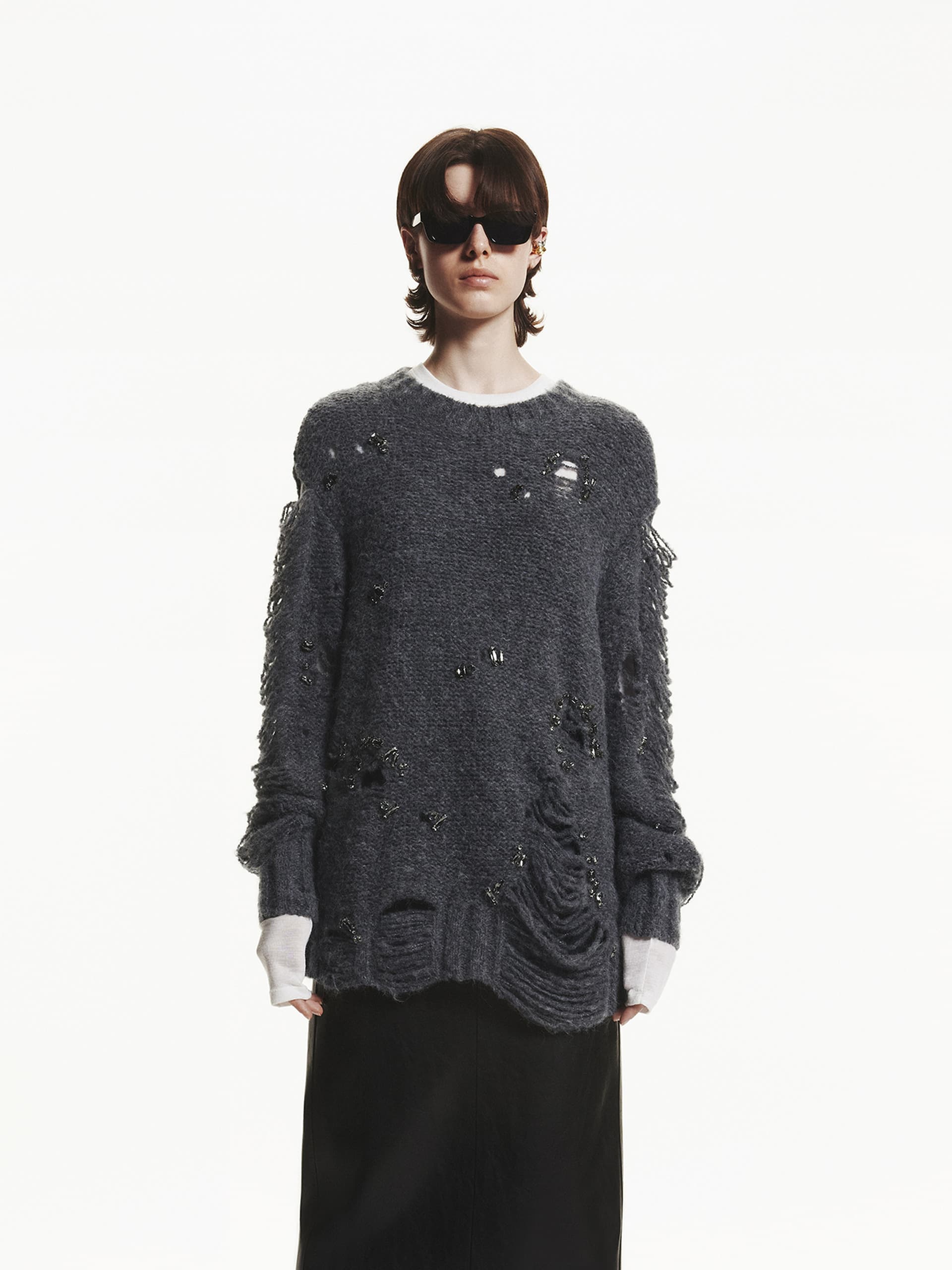 Crafted from a luxurious wool and alpaca blend, this sweater boasts a fluffy touch for ultimate comfort. The irregular distressed design and crystal embellishment add a unique touch, while the loose fit allows for easy wear.