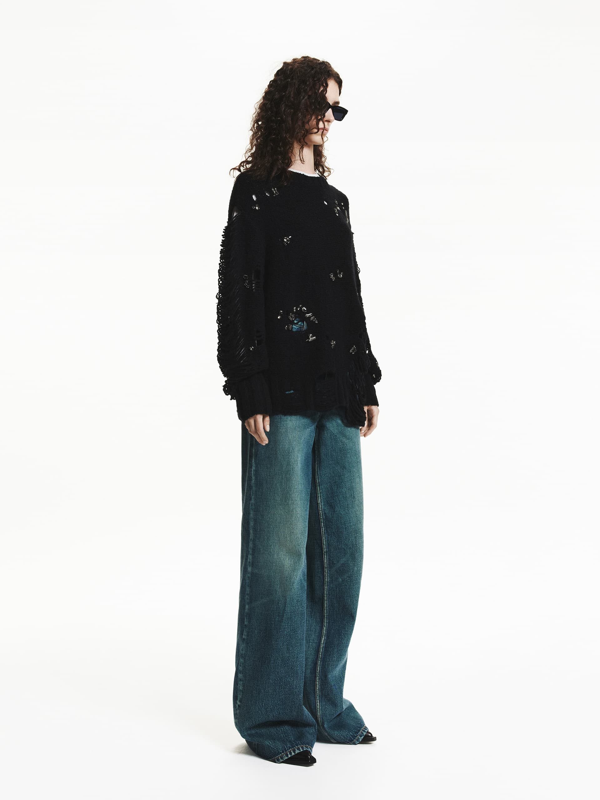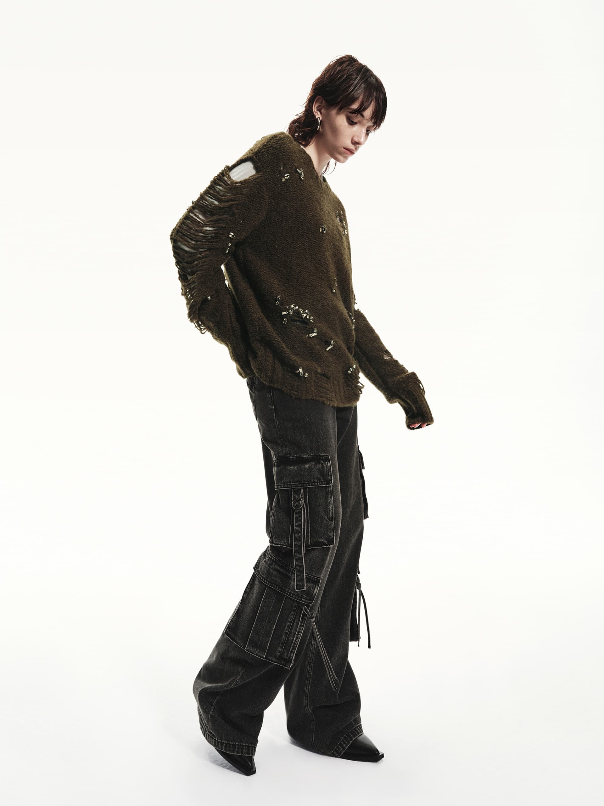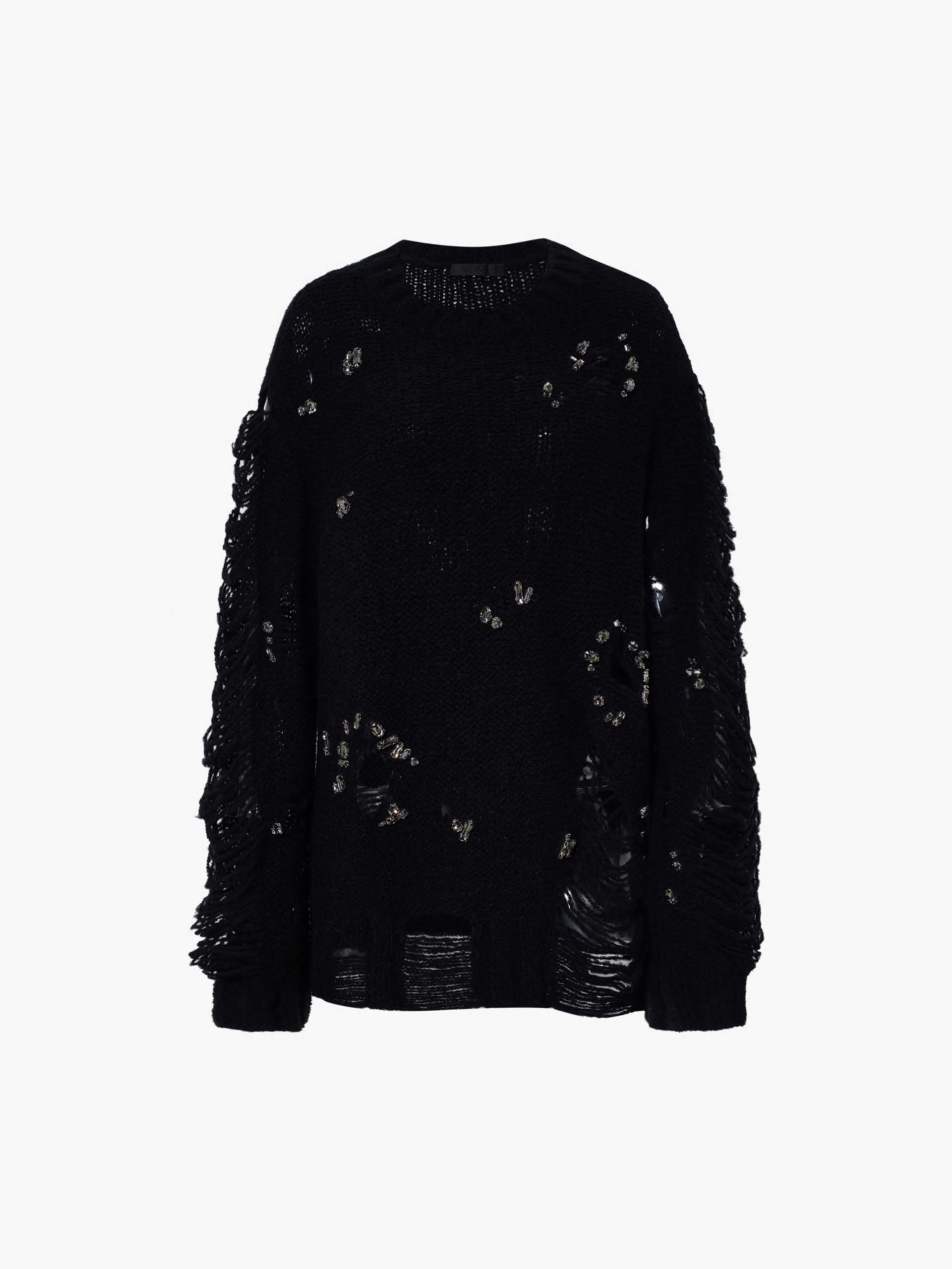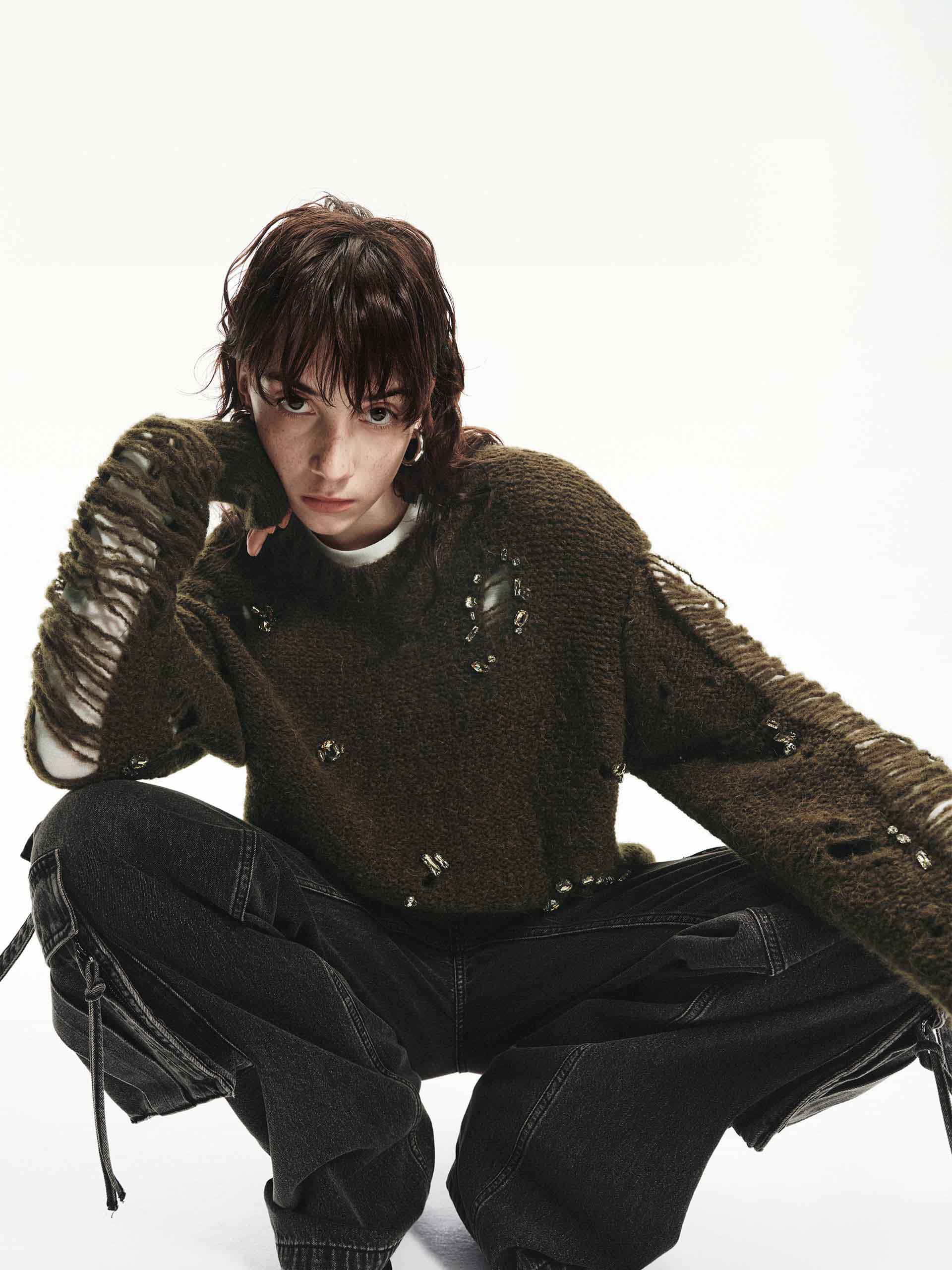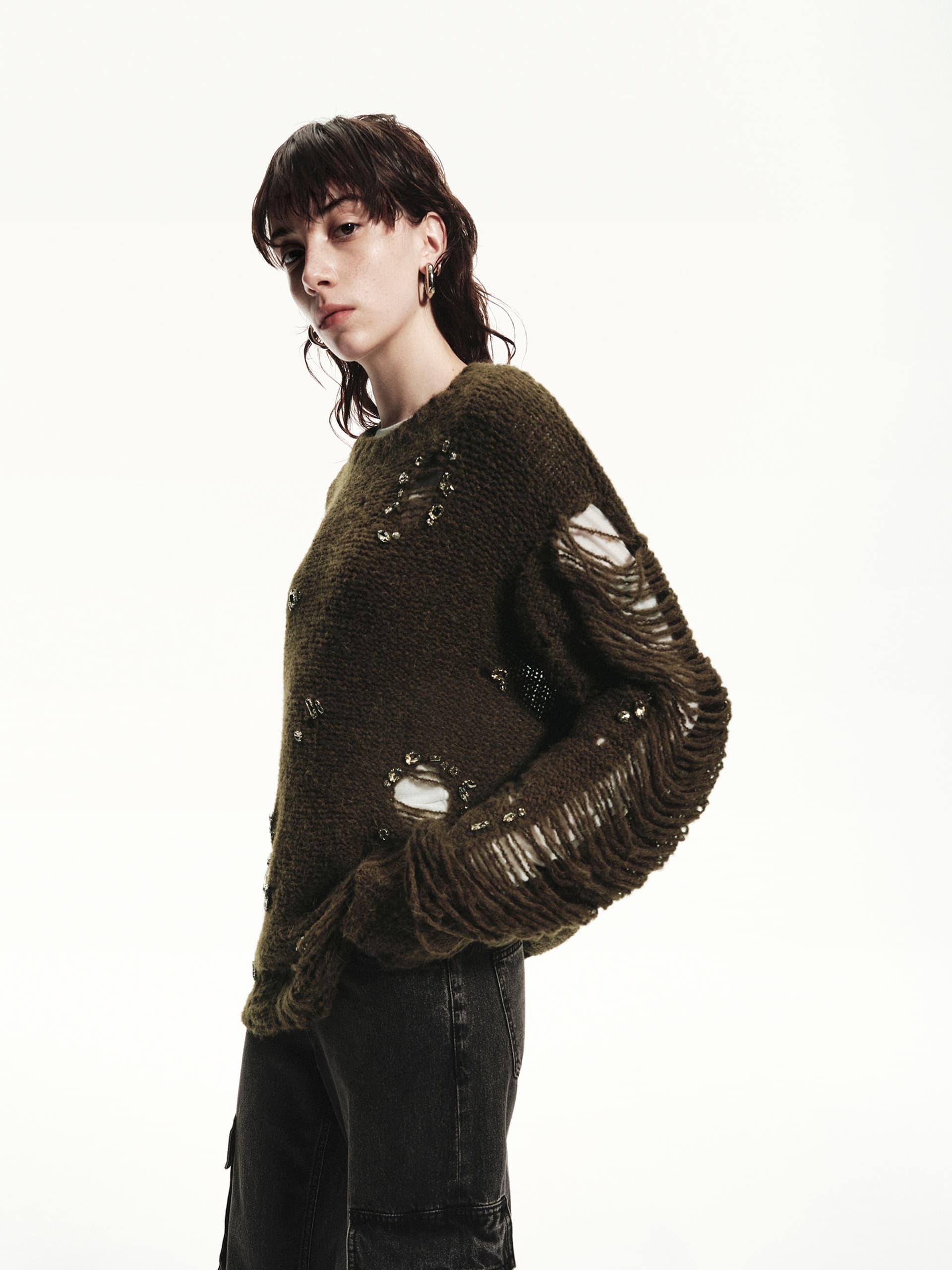 Crafted from a luxurious wool and alpaca blend, this sweater boasts a fluffy touch for ultimate comfort. The irregular distressed design and crystal embellishment add a unique touch, while the loose fit allows for easy wear.